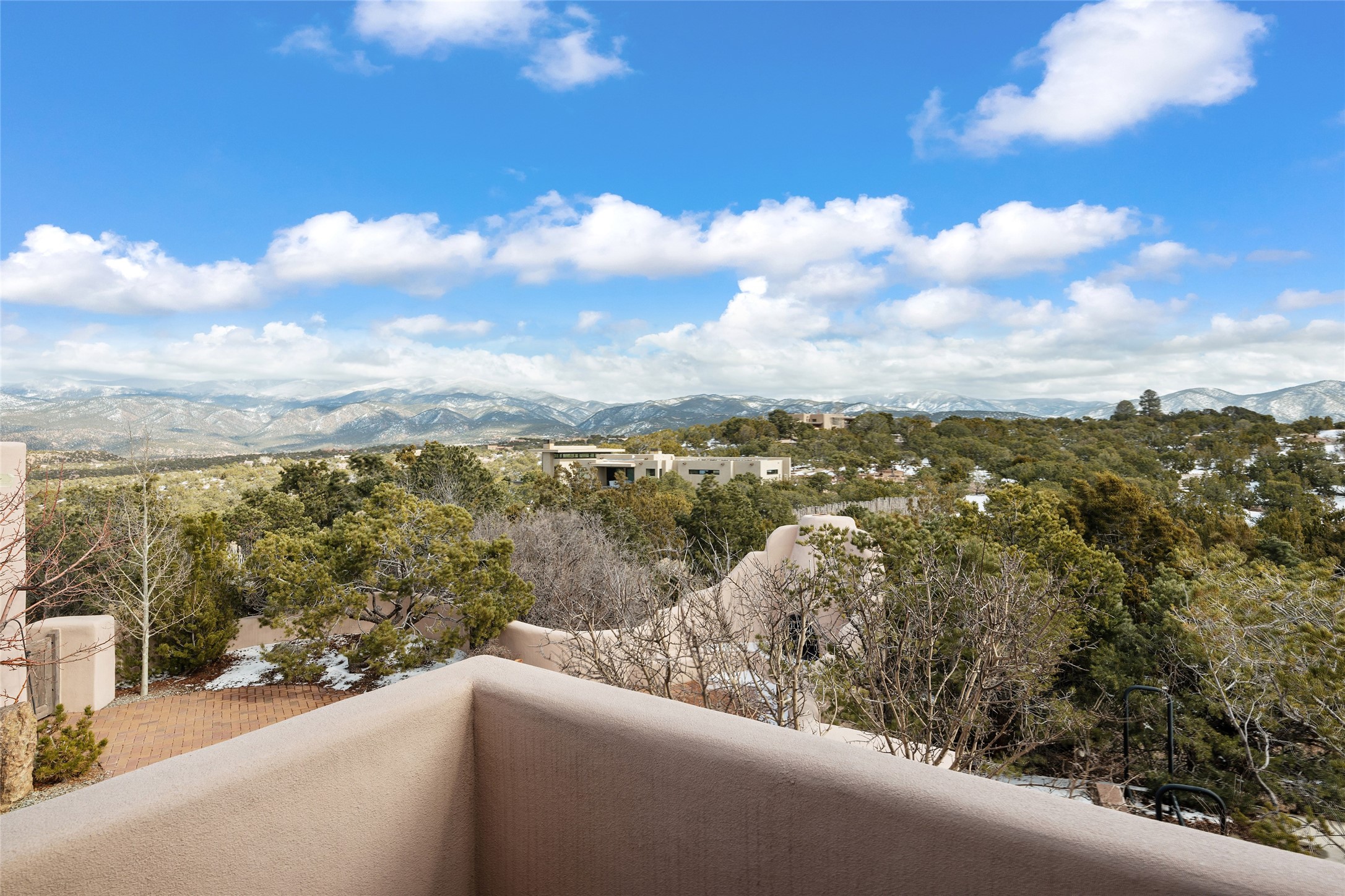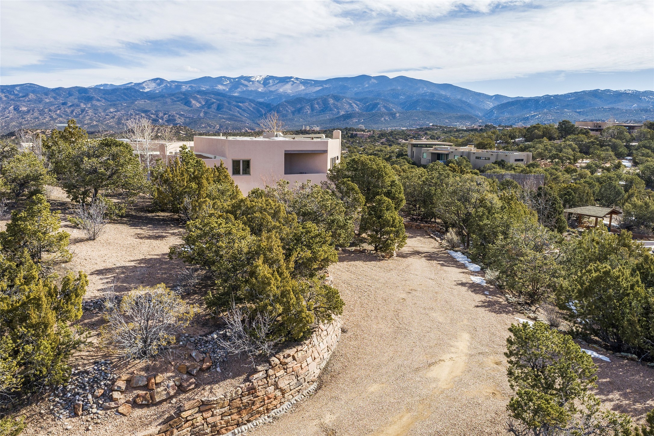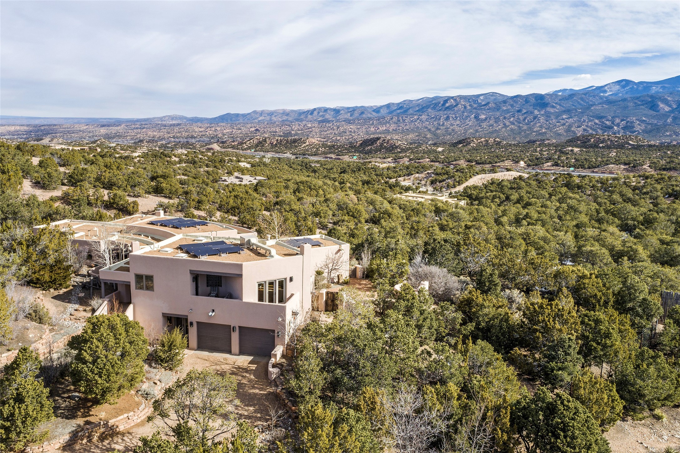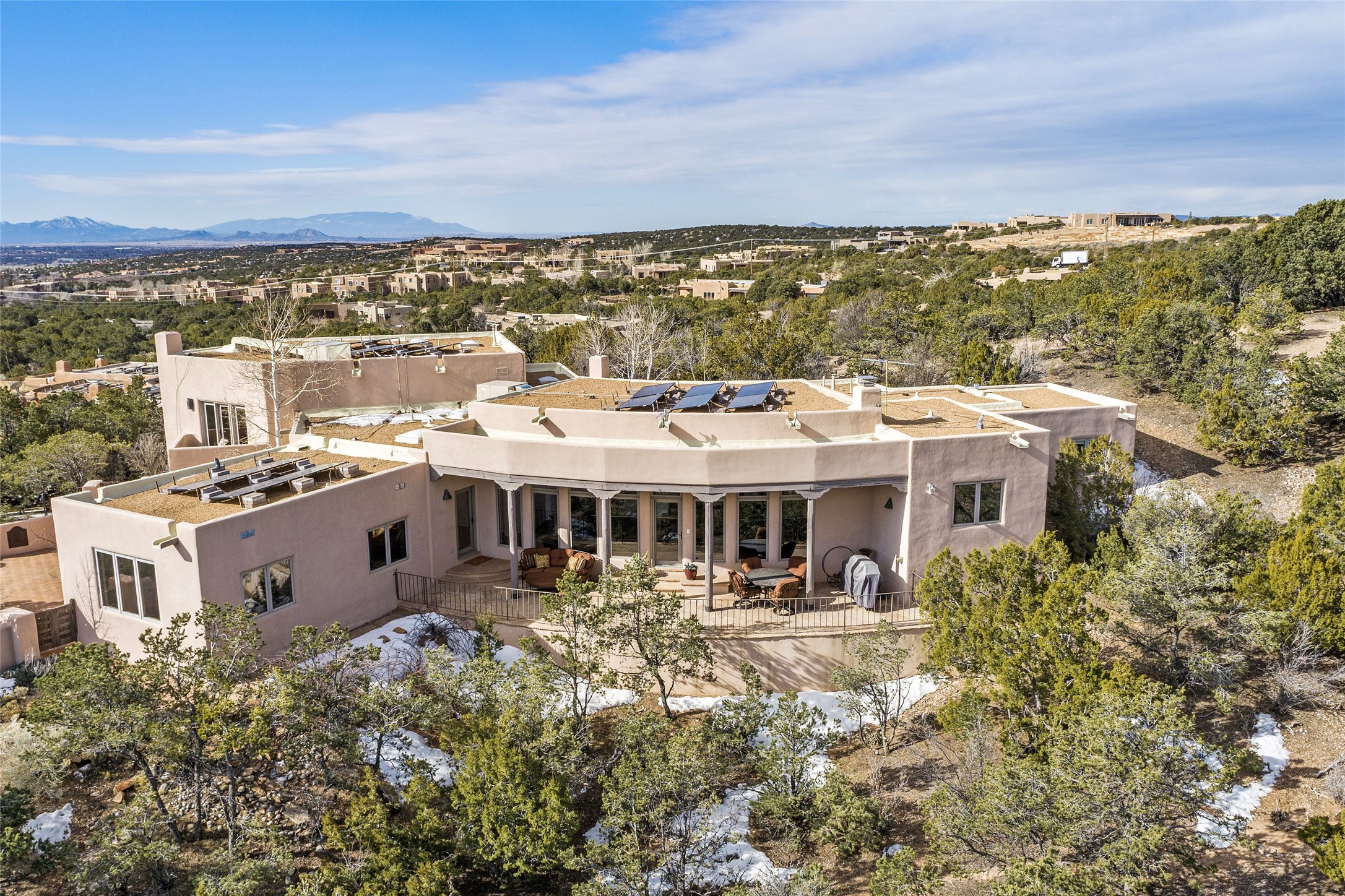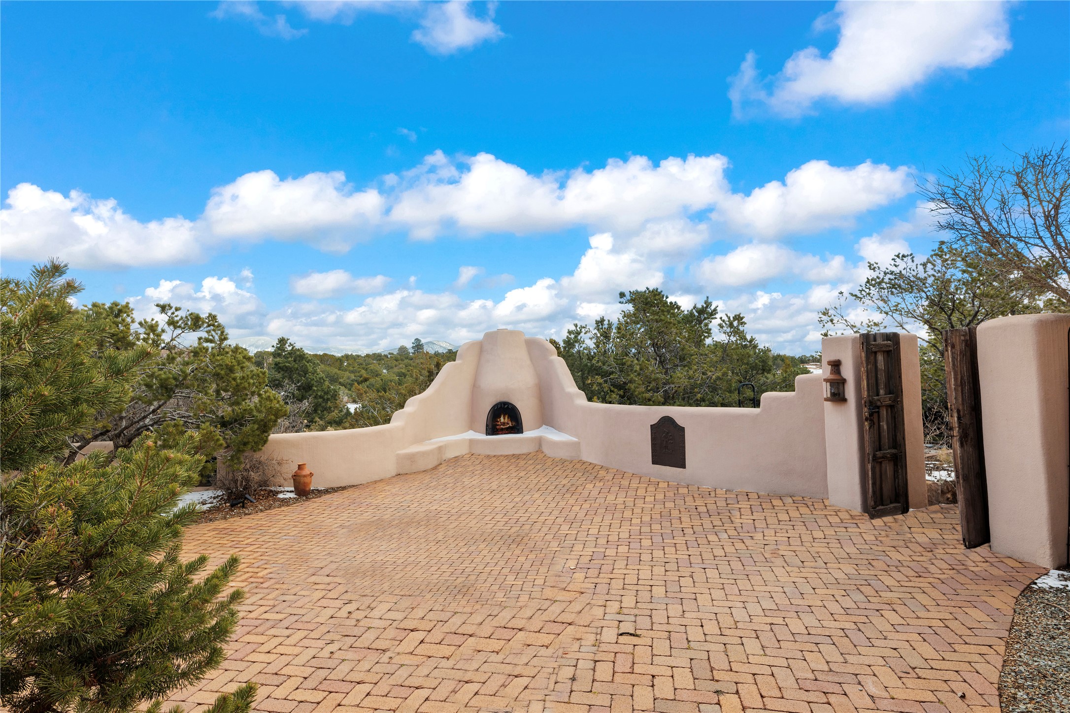 SANGRE DE CHRISTO MOUNTAIN VIEWS SPLAYED OUT IN ALL THEIR REVALRY FROM THIS 1.7 ACRE TANO ROAD HOME LOCATED ON COVETED CUL-DU-SAC LOCATION. Classical Santa Fe architecture meets modern day requirements including flexible space for bedrooms + office, city water and high-speed internet, excellent proximity to town and a Positive Energy solar system with battery back-up. Prull Builders built this extraordinary home which has been lovingly updated and maintained by the current owners. Designed by Paula Baker Laporte - the tranquil "arc" of the design allows one to "discover" the home - a new inspiration around each gentle bend. Fantastic floor plan allows for multiple outdoor spaces for entertaining and relaxing around the residence including a long portal maximizing the Sangre views, a large private walled courtyard with outdoor kiva fireplace off the den/kitchen area, balconies off corners of the primary suite and other bedrooms. Finally, an outdoor portal with a hot tub is in the perfect nook for privacy and views! Each bath has unique Talavera tile designs including a dazzling powder room. This home is the ultimate in Santa Fe living - honoring the integrity of Santa Fe style with today's modern amenities/energy savings.