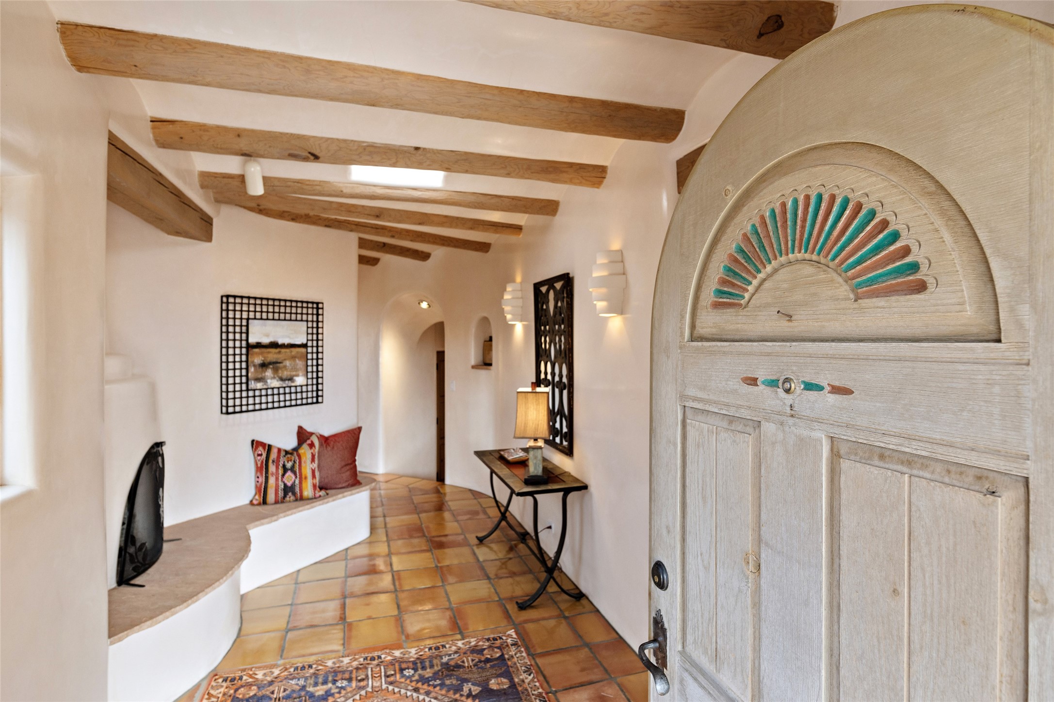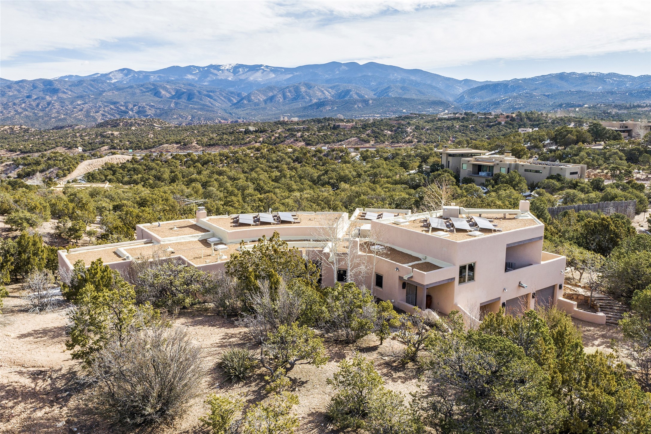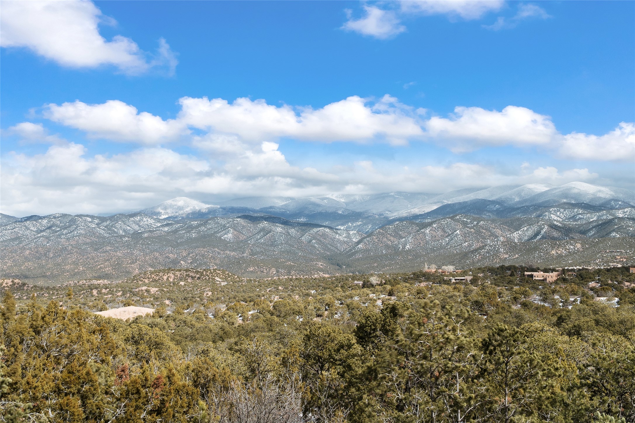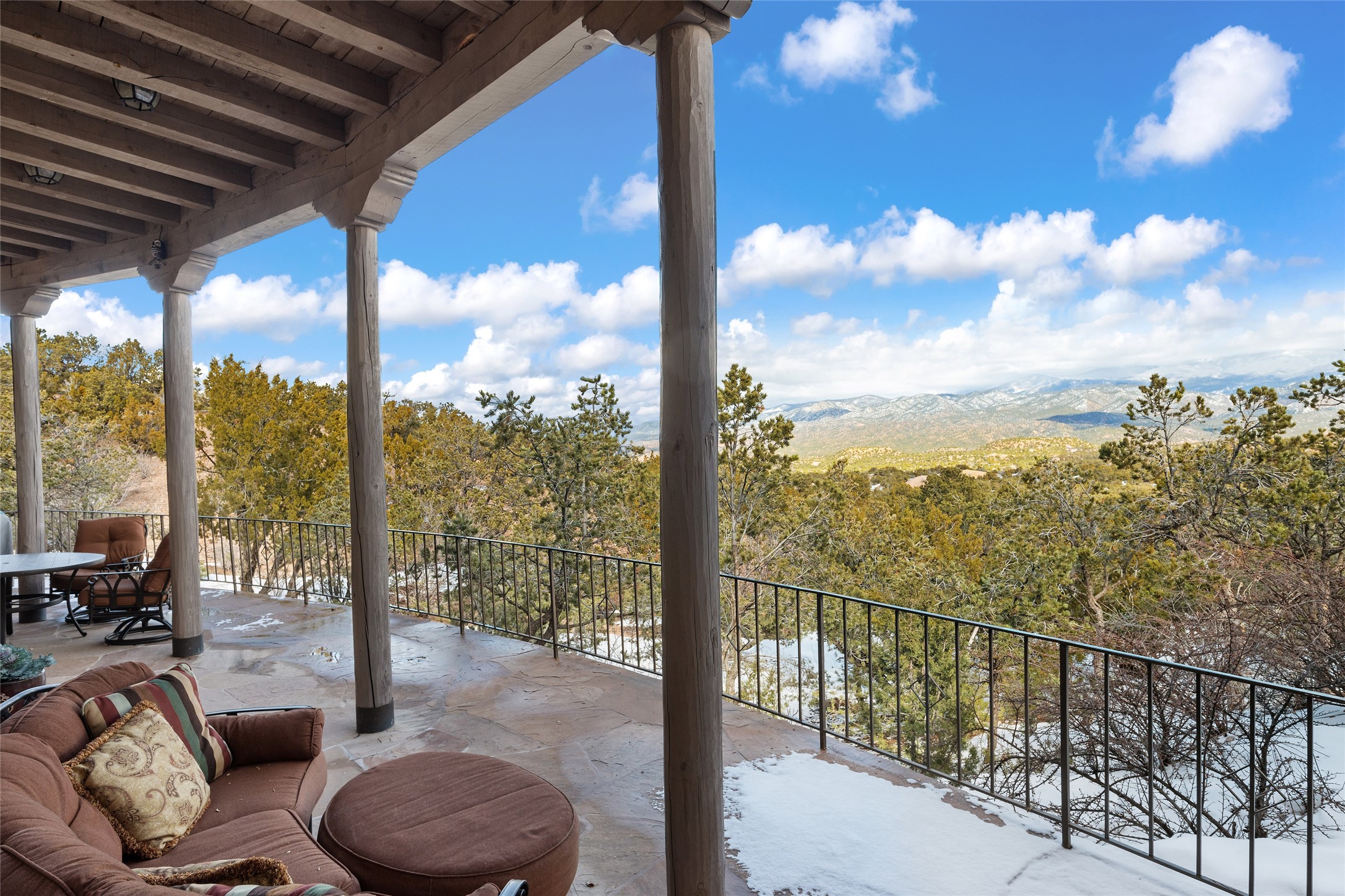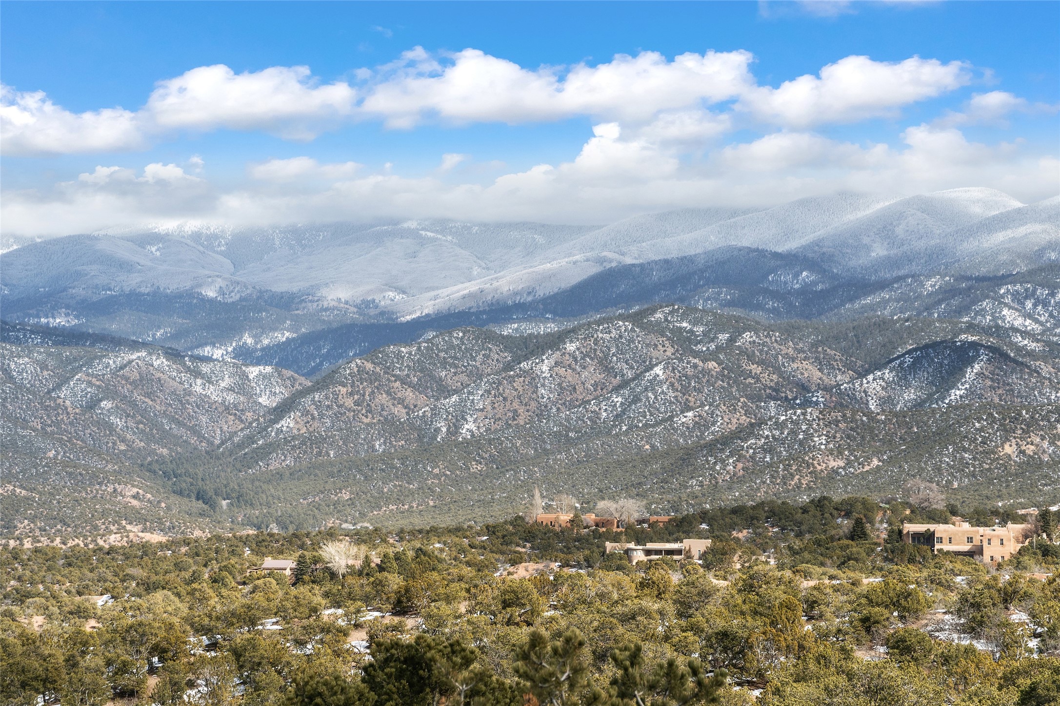 SANGRE DE CHRISTO MOUNTAIN VIEWS SPLAYED OUT IN ALL THEIR REVALRY FROM THIS 1.7 ACRE TANO ROAD HOME LOCATED ON COVETED CUL-DU-SAC LOCATION. Classical Santa Fe architecture meets modern day requirements including flexible space for bedrooms + office, city water and high-speed internet, excellent proximity to town and a Positive Energy solar system with battery back-up. Prull Builders built this extraordinary home which has been lovingly updated and maintained by the current owners. Designed by Paula Baker Laporte - the tranquil "arc" of the design allows one to "discover" the home - a new inspiration around each gentle bend. Fantastic floor plan allows for multiple outdoor spaces for entertaining and relaxing around the residence including a long portal maximizing the Sangre views, a large private walled courtyard with outdoor kiva fireplace off the den/kitchen area, balconies off corners of the primary suite and other bedrooms. Finally, an outdoor portal with a hot tub is in the perfect nook for privacy and views! Each bath has unique Talavera tile designs including a dazzling powder room. This home is the ultimate in Santa Fe living - honoring the integrity of Santa Fe style with today's modern amenities/energy savings.