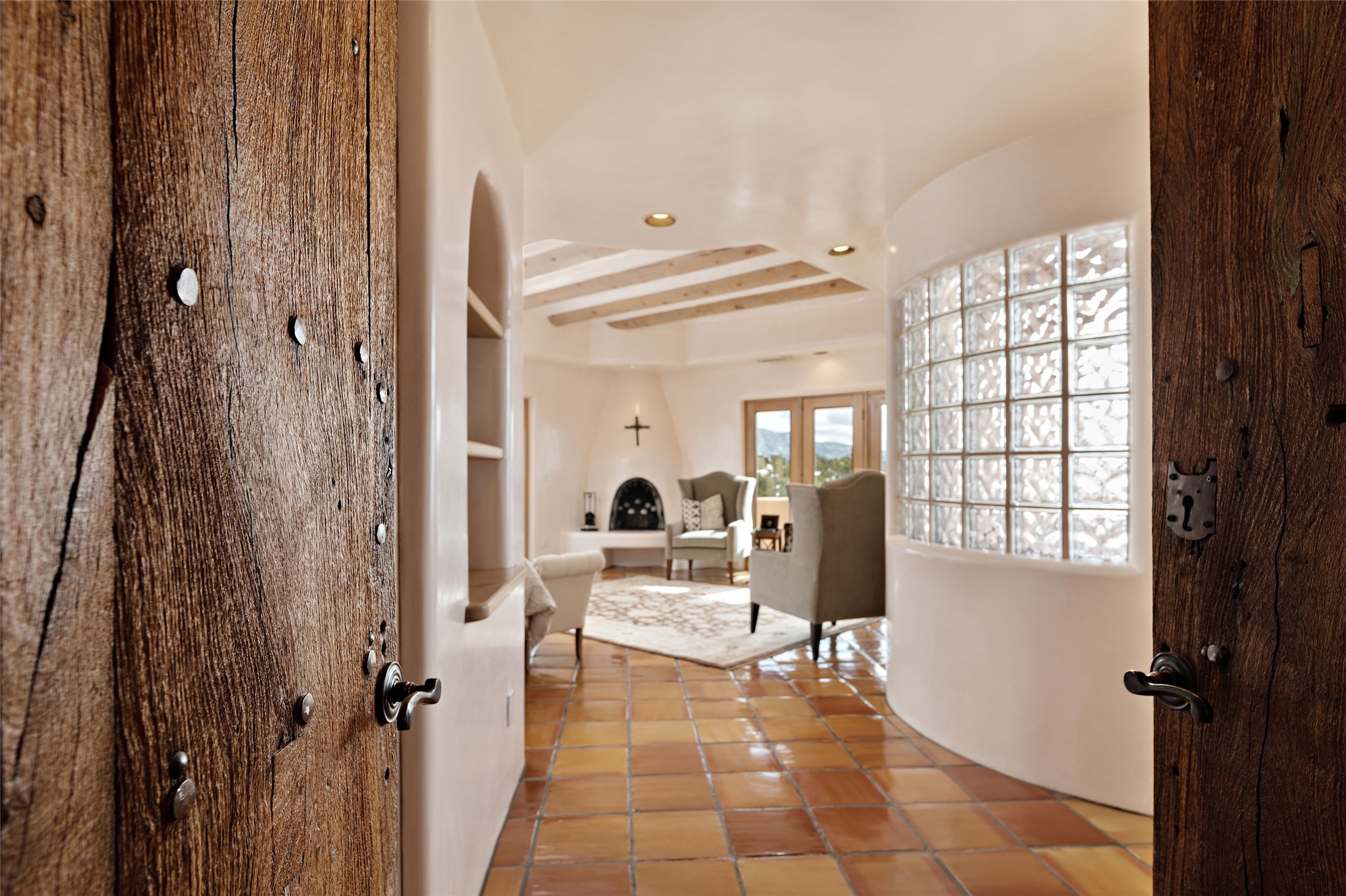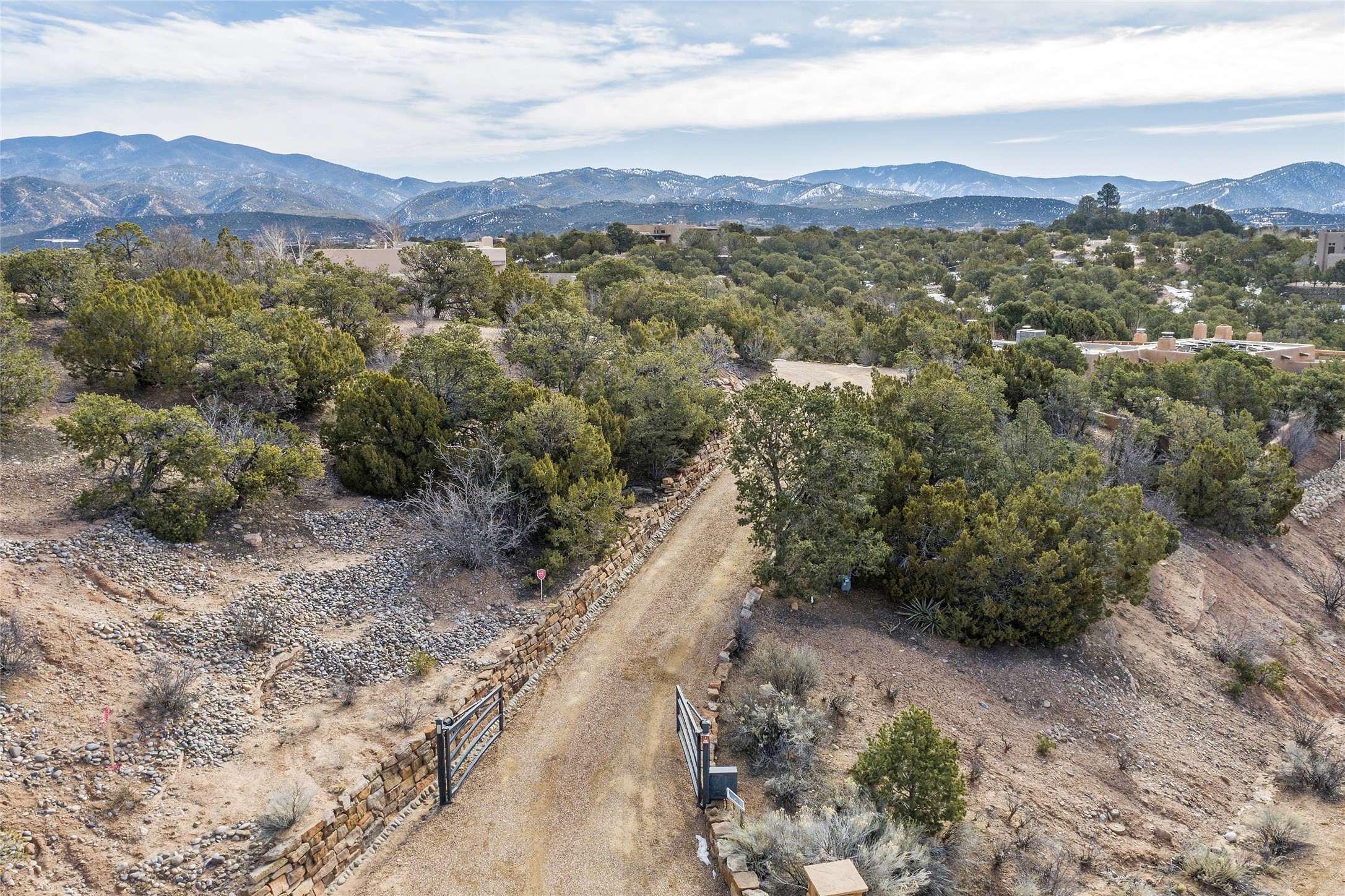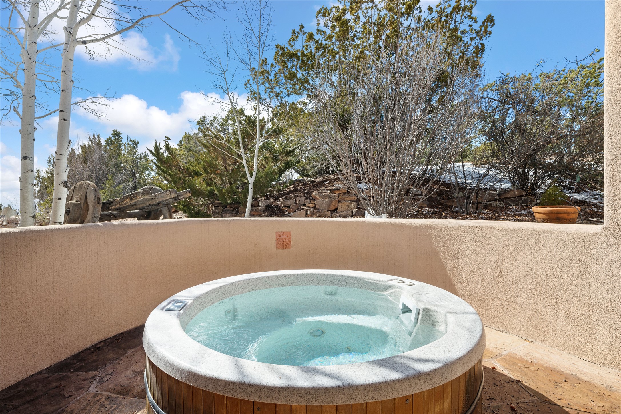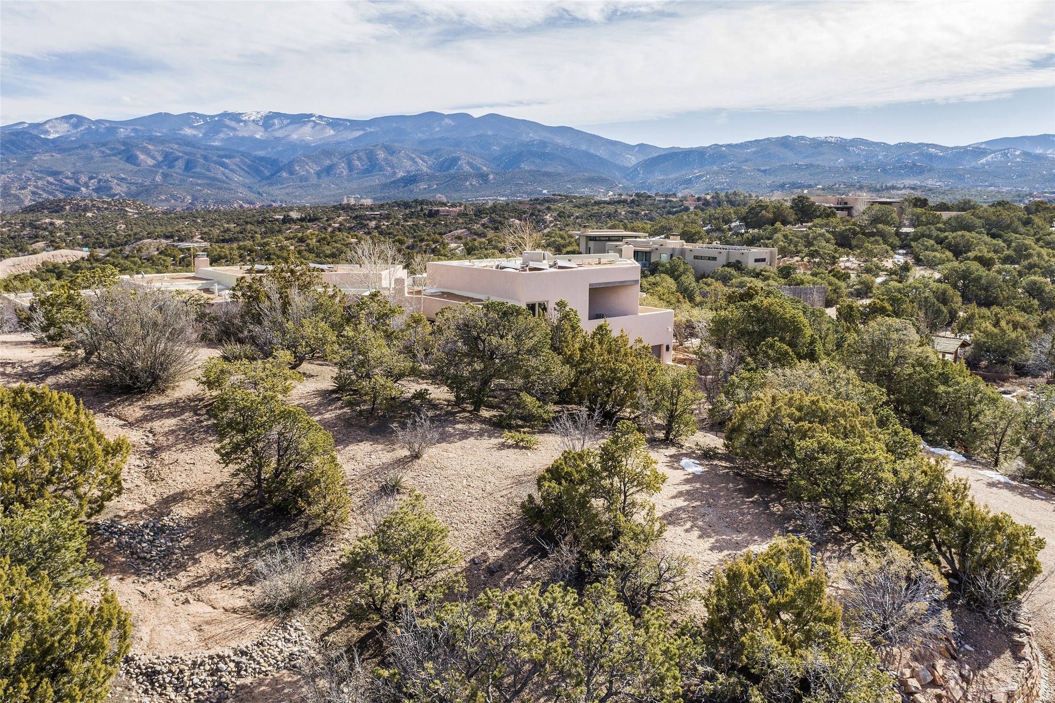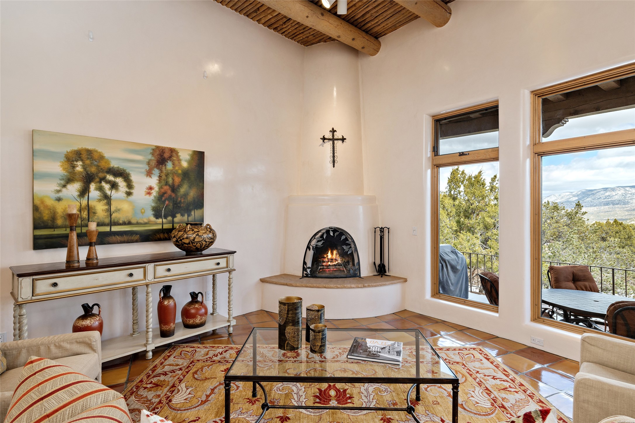 SANGRE DE CHRISTO MOUNTAIN VIEWS SPLAYED OUT IN ALL THEIR REVALRY FROM THIS 1.7 ACRE TANO ROAD HOME LOCATED ON COVETED CUL-DU-SAC LOCATION. Classical Santa Fe architecture meets modern day requirements including flexible space for bedrooms + office, city water and high-speed internet, excellent proximity to town and a Positive Energy solar system with battery back-up. Prull Builders built this extraordinary home which has been lovingly updated and maintained by the current owners. Designed by Paula Baker Laporte - the tranquil "arc" of the design allows one to "discover" the home - a new inspiration around each gentle bend. Fantastic floor plan allows for multiple outdoor spaces for entertaining and relaxing around the residence including a long portal maximizing the Sangre views, a large private walled courtyard with outdoor kiva fireplace off the den/kitchen area, balconies off corners of the primary suite and other bedrooms. Finally, an outdoor portal with a hot tub is in the perfect nook for privacy and views! Each bath has unique Talavera tile designs including a dazzling powder room. This home is the ultimate in Santa Fe living - honoring the integrity of Santa Fe style with today's modern amenities/energy savings.