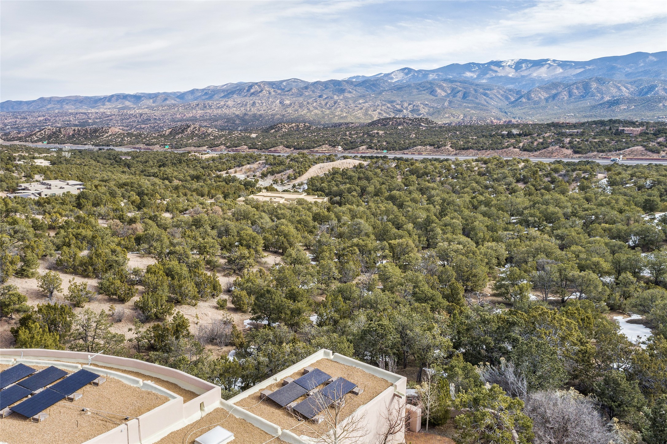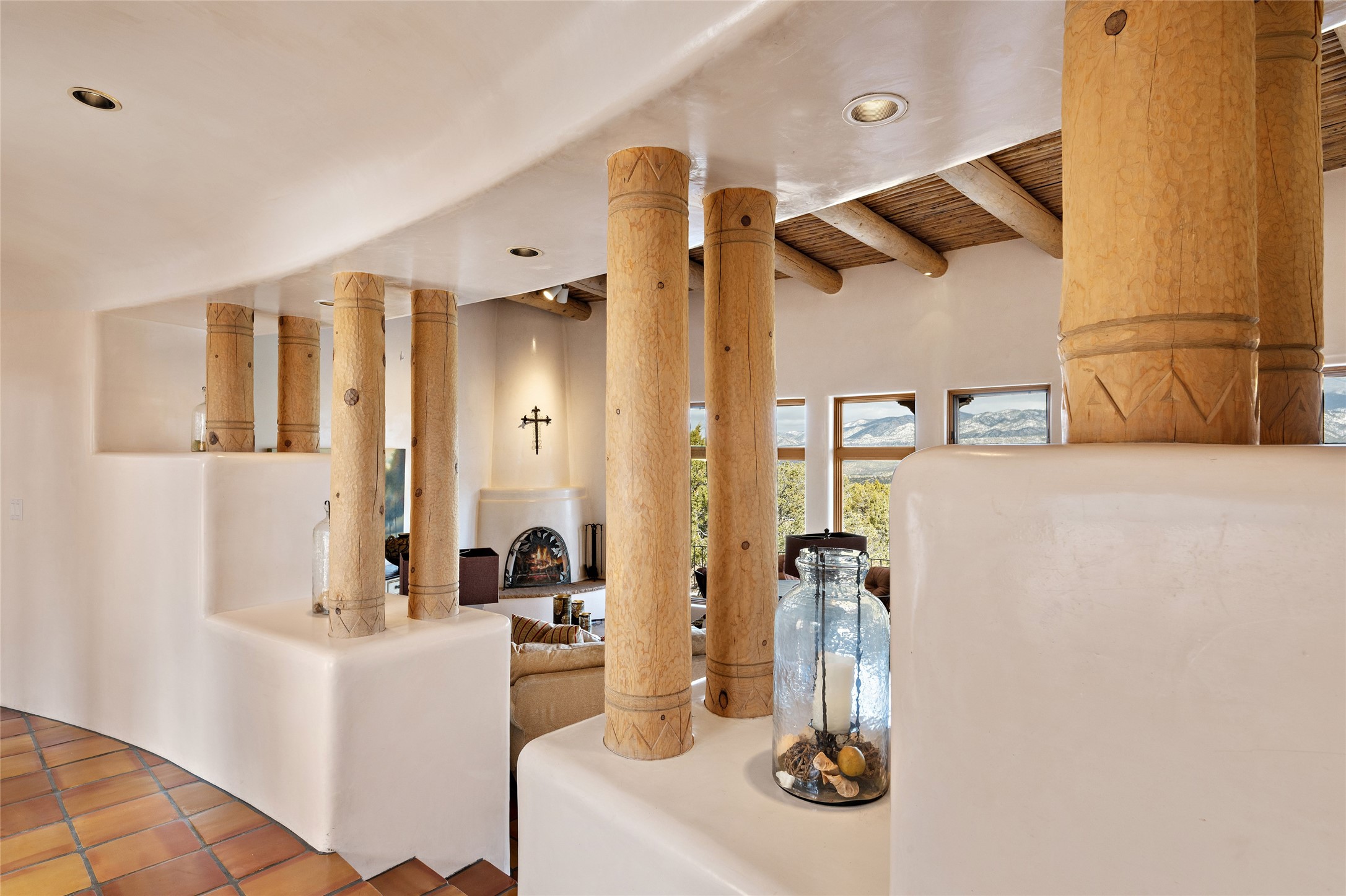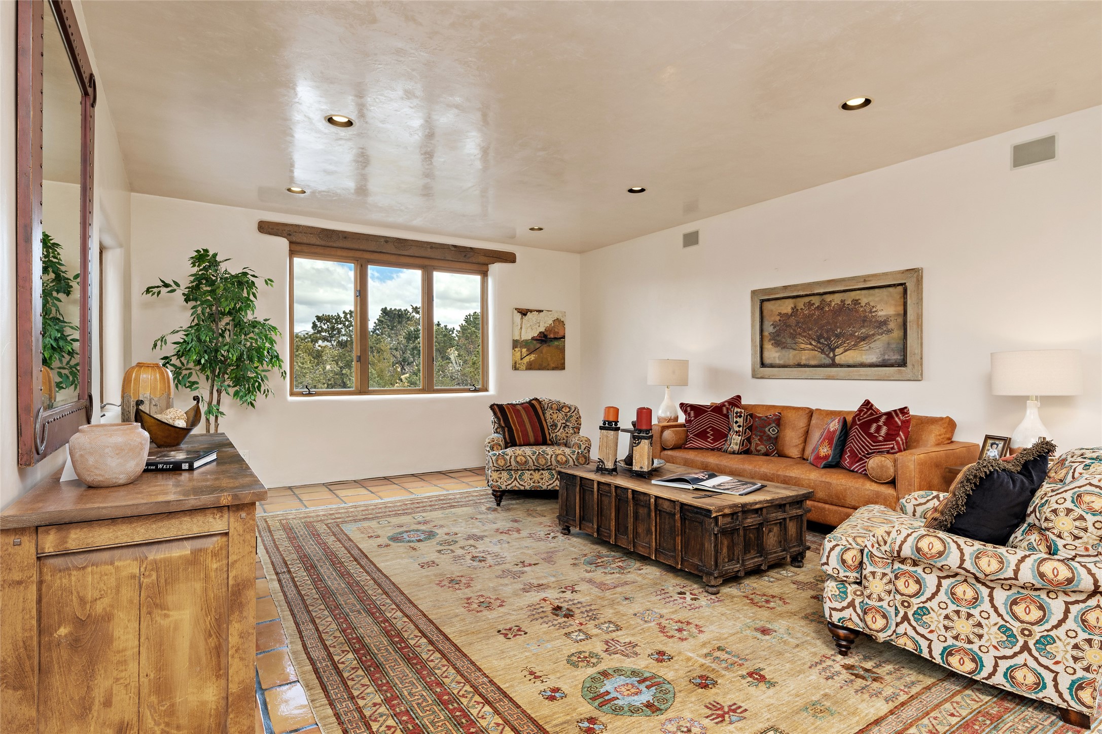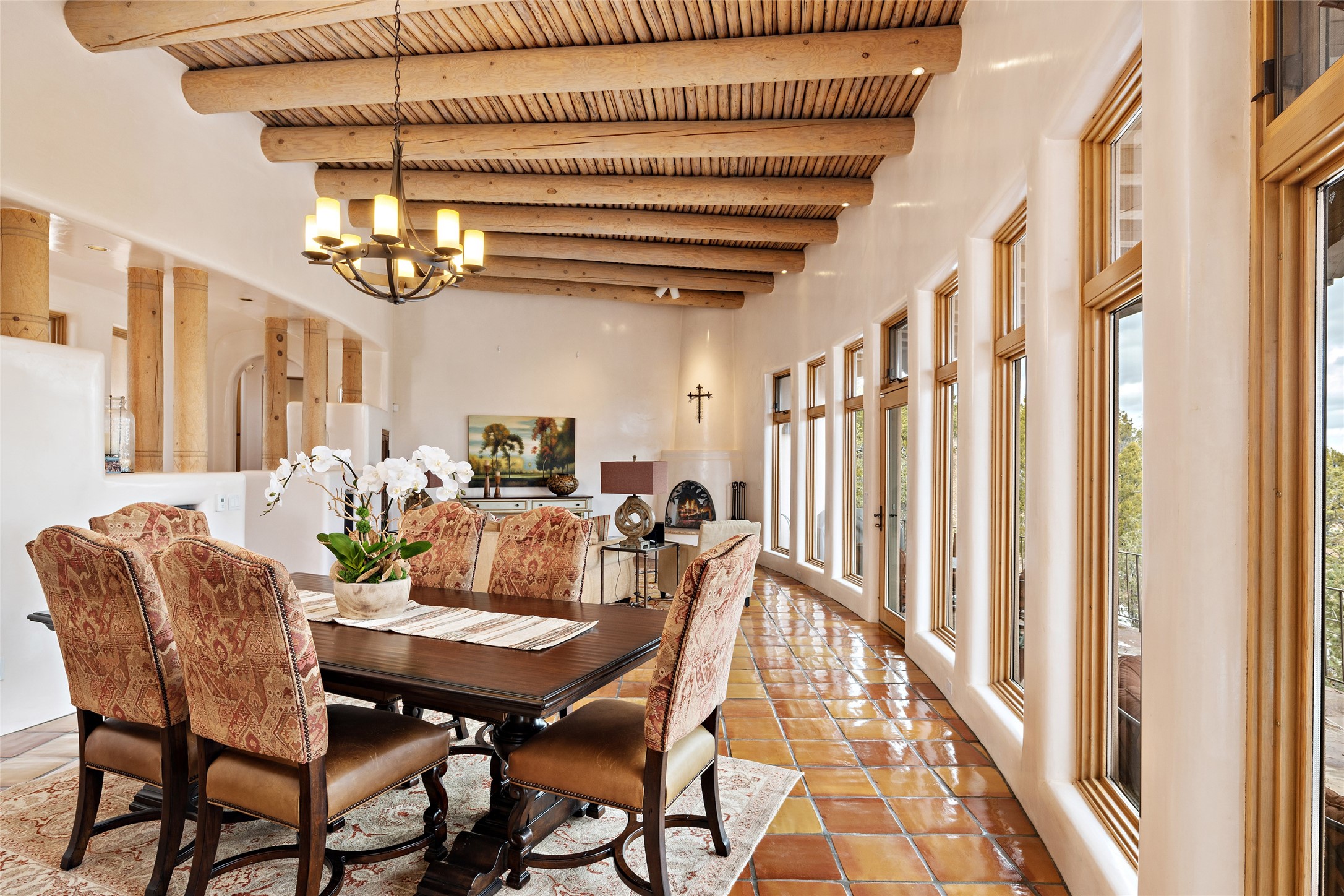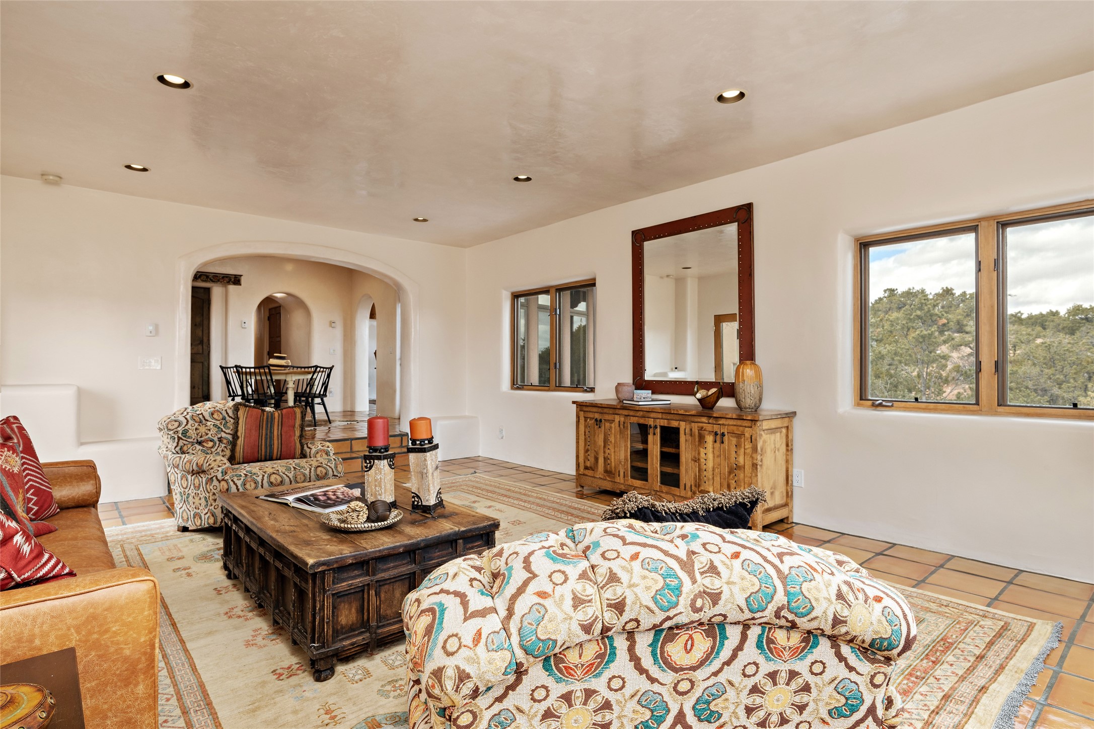SANGRE DE CHRISTO MOUNTAIN VIEWS SPLAYED OUT IN ALL THEIR REVALRY FROM THIS 1.7 ACRE TANO ROAD HOME LOCATED ON COVETED CUL-DU-SAC LOCATION. Classical Santa Fe architecture meets modern day requirements including flexible space for bedrooms + office, city water and high-speed internet, excellent proximity to town and a Positive Energy solar system with battery back-up. Prull Builders built this extraordinary home which has been lovingly updated and maintained by the current owners. Designed by Paula Baker Laporte - the tranquil "arc" of the design allows one to "discover" the home - a new inspiration around each gentle bend. Fantastic floor plan allows for multiple outdoor spaces for entertaining and relaxing around the residence including a long portal maximizing the Sangre views, a large private walled courtyard with outdoor kiva fireplace off the den/kitchen area, balconies off corners of the primary suite and other bedrooms. Finally, an outdoor portal with a hot tub is in the perfect nook for privacy and views! Each bath has unique Talavera tile designs including a dazzling powder room. This home is the ultimate in Santa Fe living - honoring the integrity of Santa Fe style with today's modern amenities/energy savings.