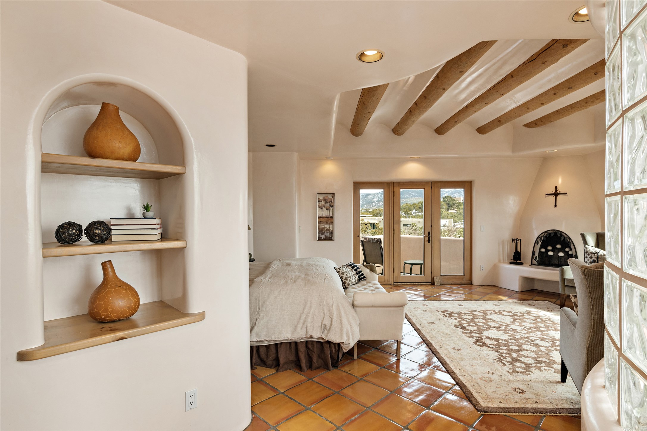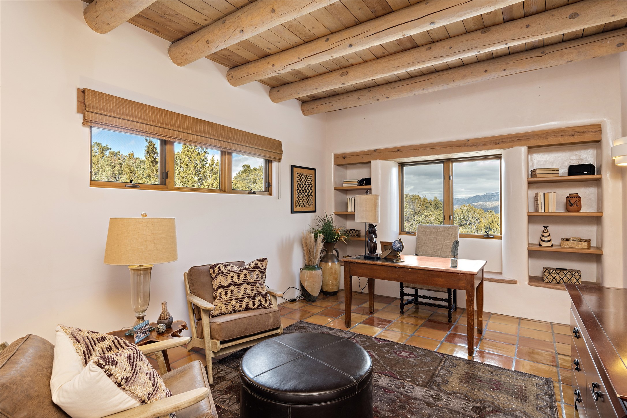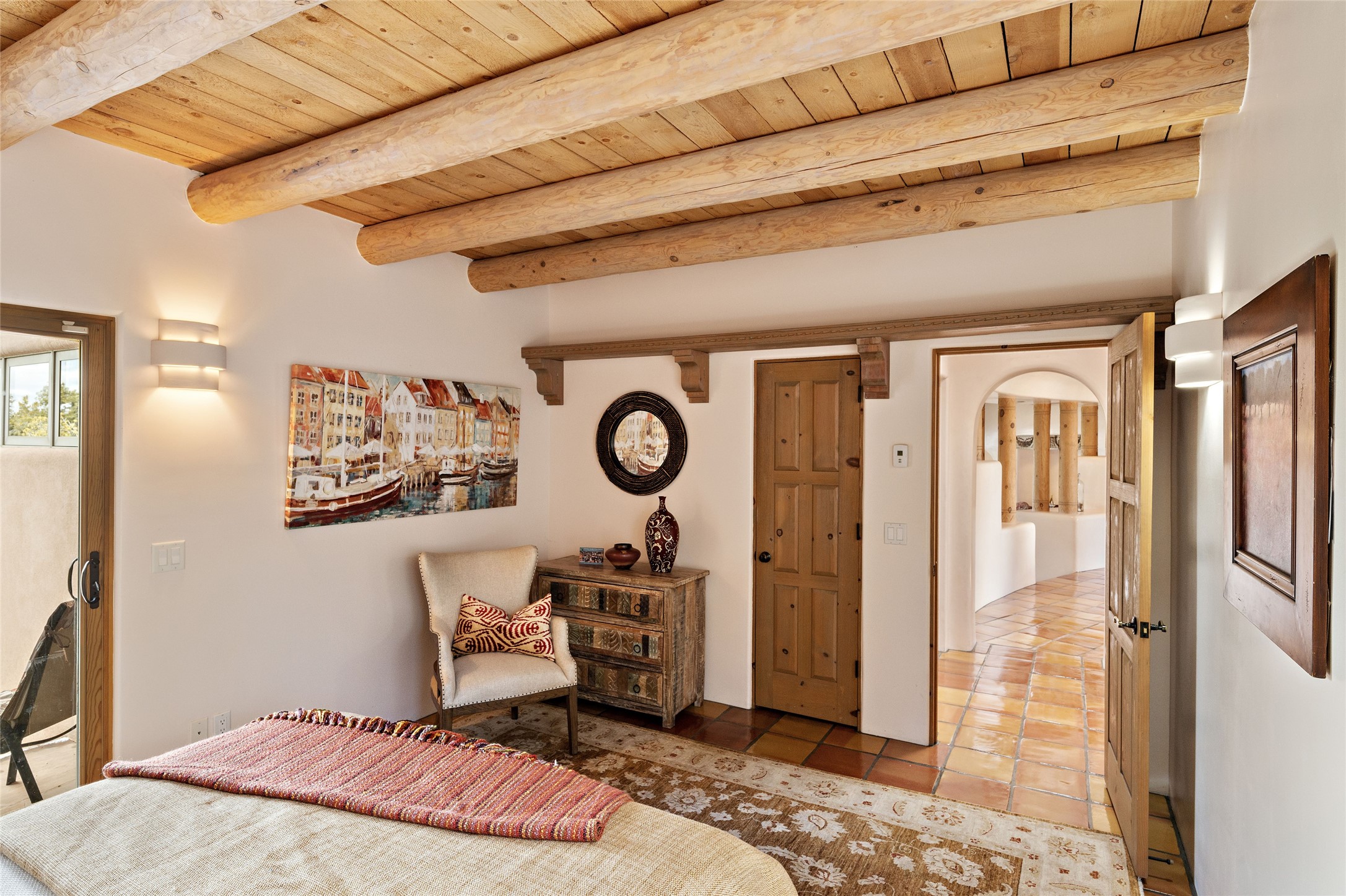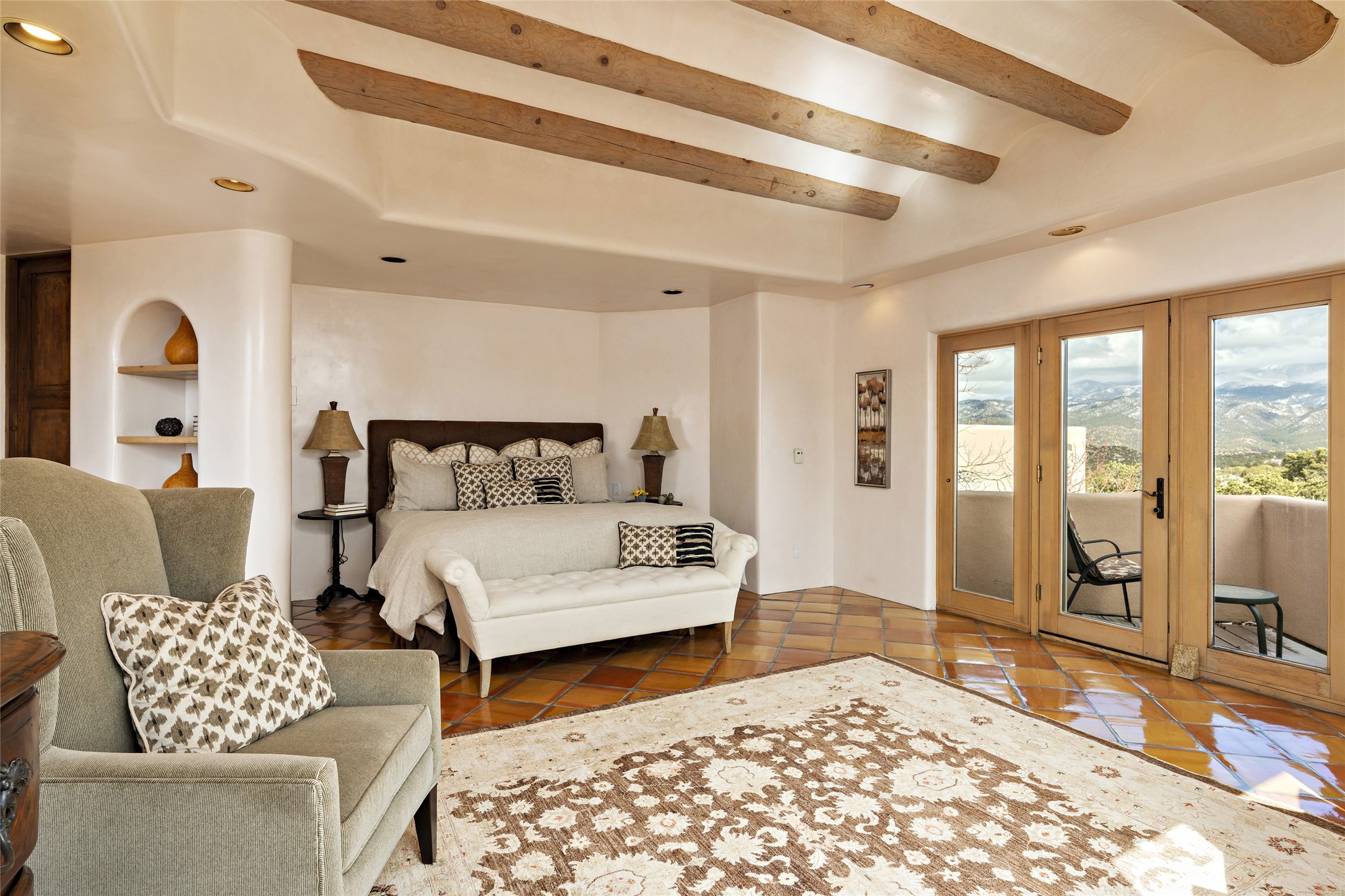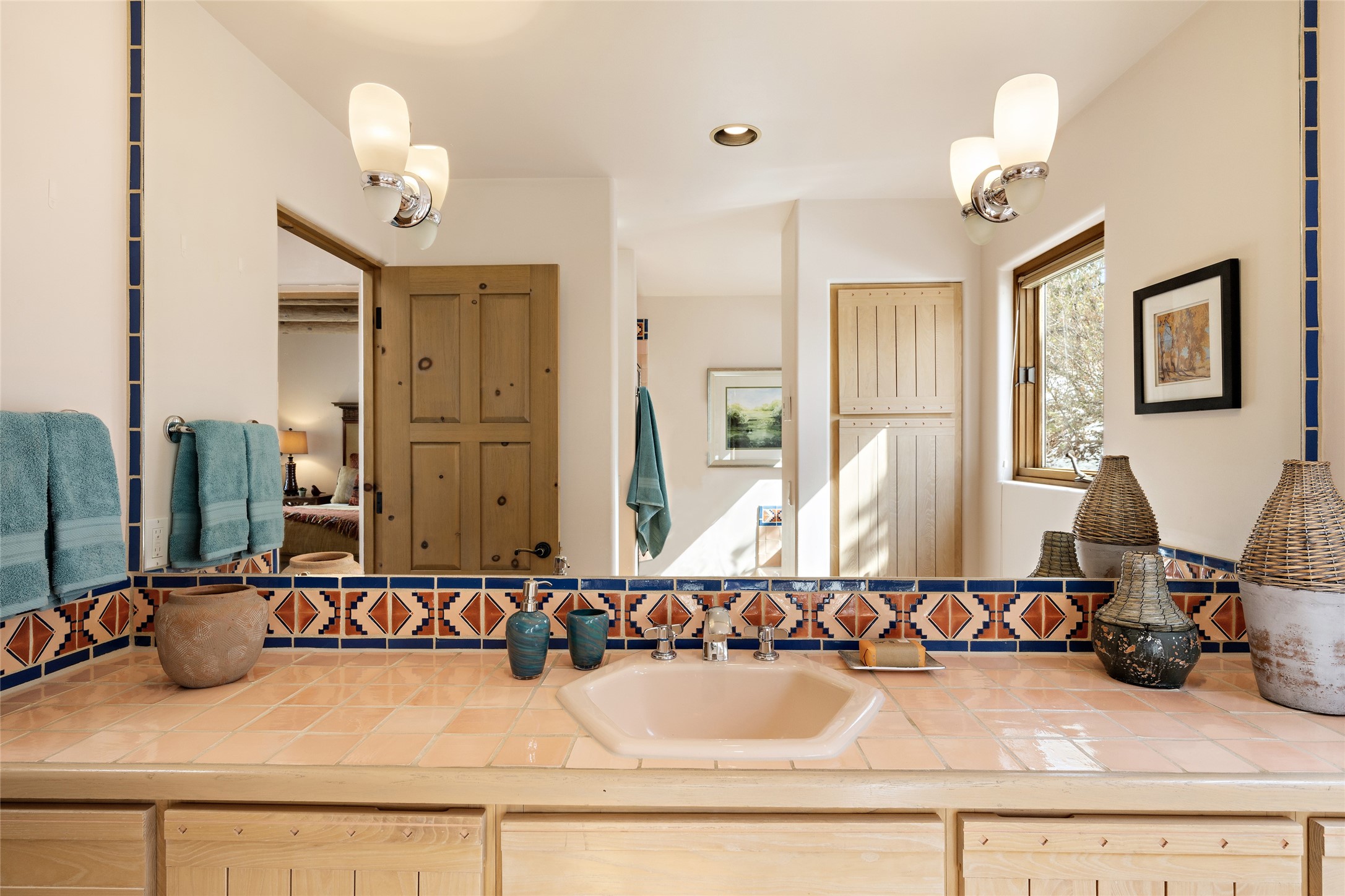 SANGRE DE CHRISTO MOUNTAIN VIEWS SPLAYED OUT IN ALL THEIR REVALRY FROM THIS 1.7 ACRE TANO ROAD HOME LOCATED ON COVETED CUL-DU-SAC LOCATION. Classical Santa Fe architecture meets modern day requirements including flexible space for bedrooms + office, city water and high-speed internet, excellent proximity to town and a Positive Energy solar system with battery back-up. Prull Builders built this extraordinary home which has been lovingly updated and maintained by the current owners. Designed by Paula Baker Laporte - the tranquil "arc" of the design allows one to "discover" the home - a new inspiration around each gentle bend. Fantastic floor plan allows for multiple outdoor spaces for entertaining and relaxing around the residence including a long portal maximizing the Sangre views, a large private walled courtyard with outdoor kiva fireplace off the den/kitchen area, balconies off corners of the primary suite and other bedrooms. Finally, an outdoor portal with a hot tub is in the perfect nook for privacy and views! Each bath has unique Talavera tile designs including a dazzling powder room. This home is the ultimate in Santa Fe living - honoring the integrity of Santa Fe style with today's modern amenities/energy savings.