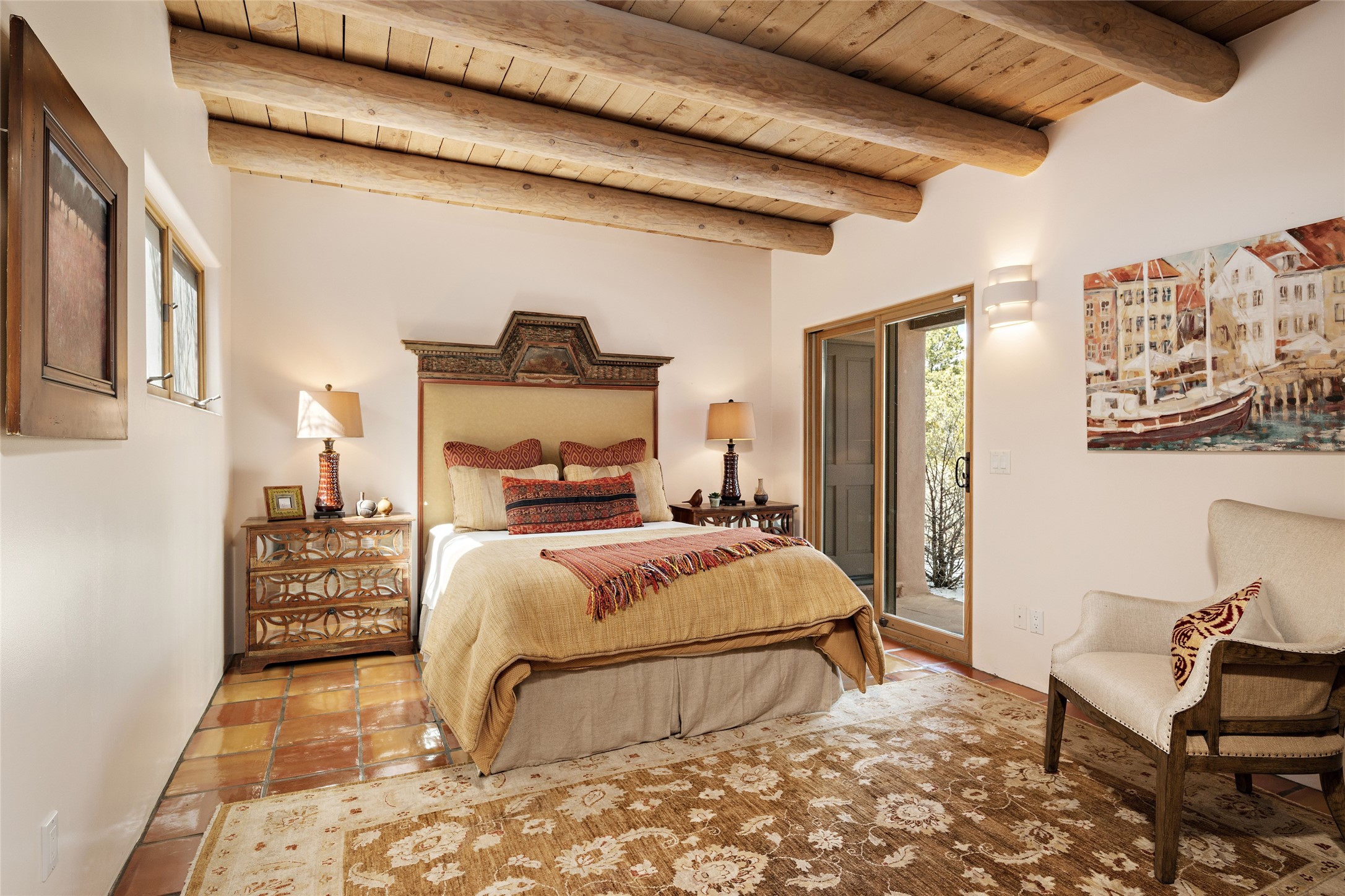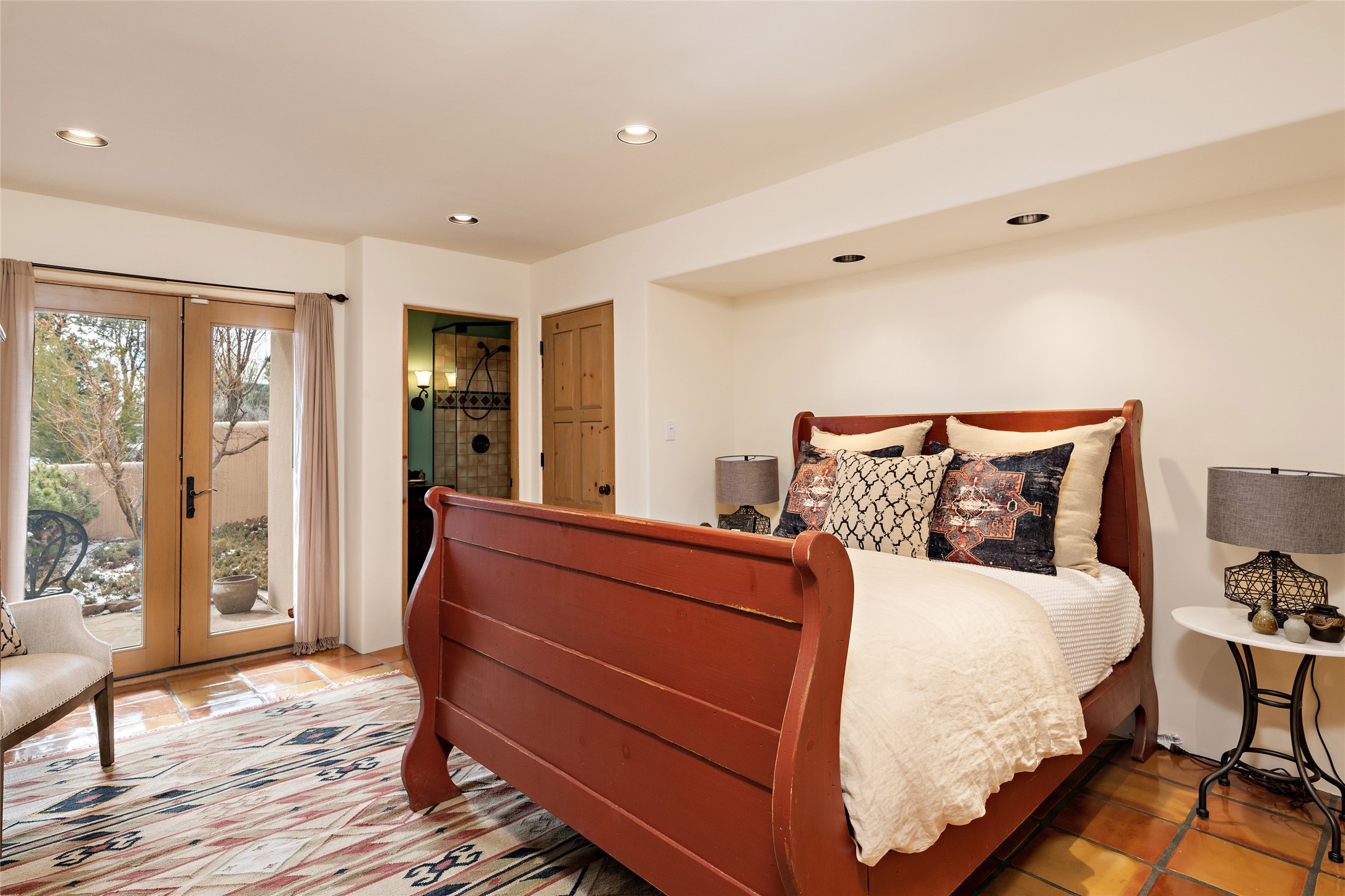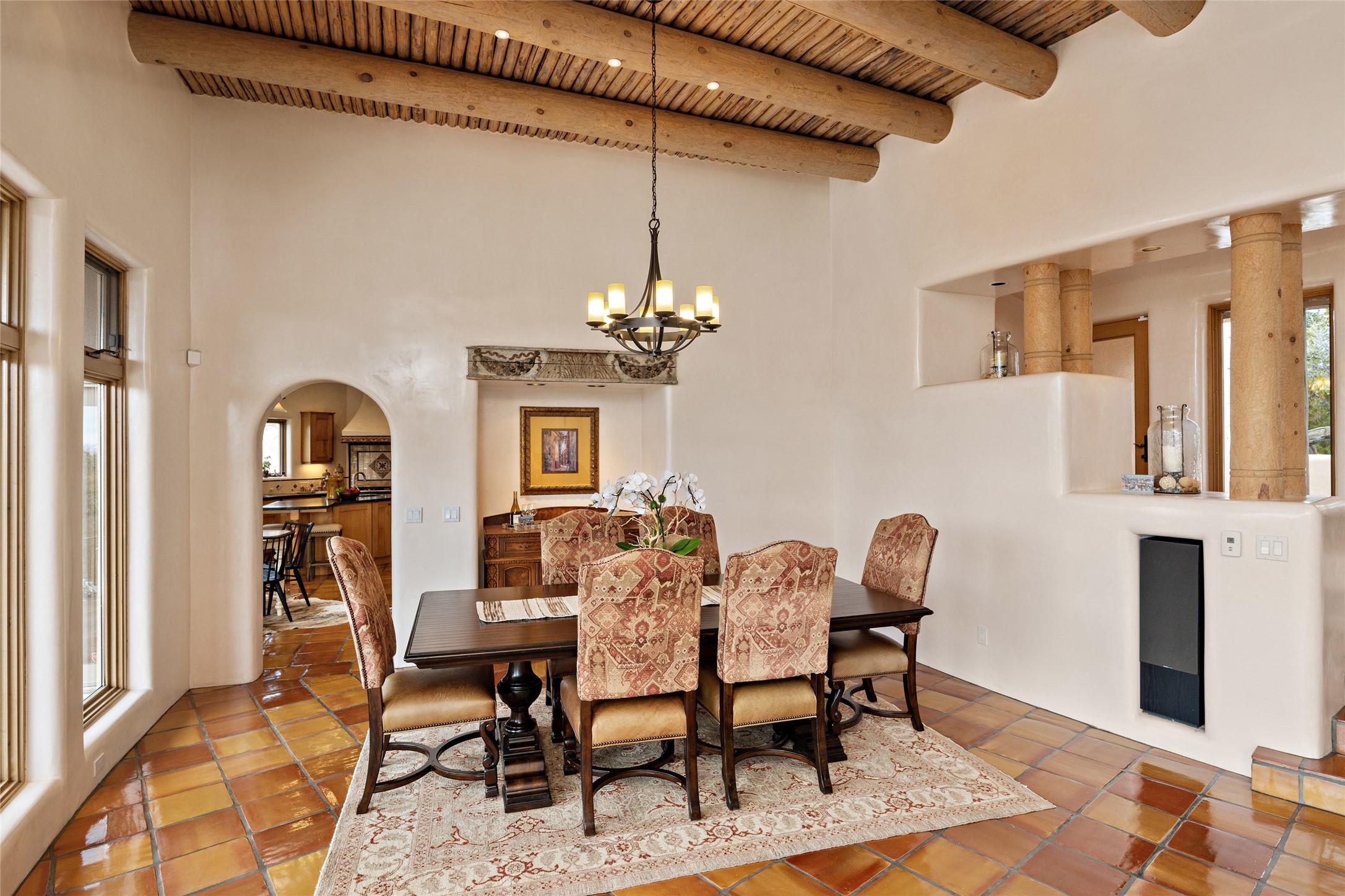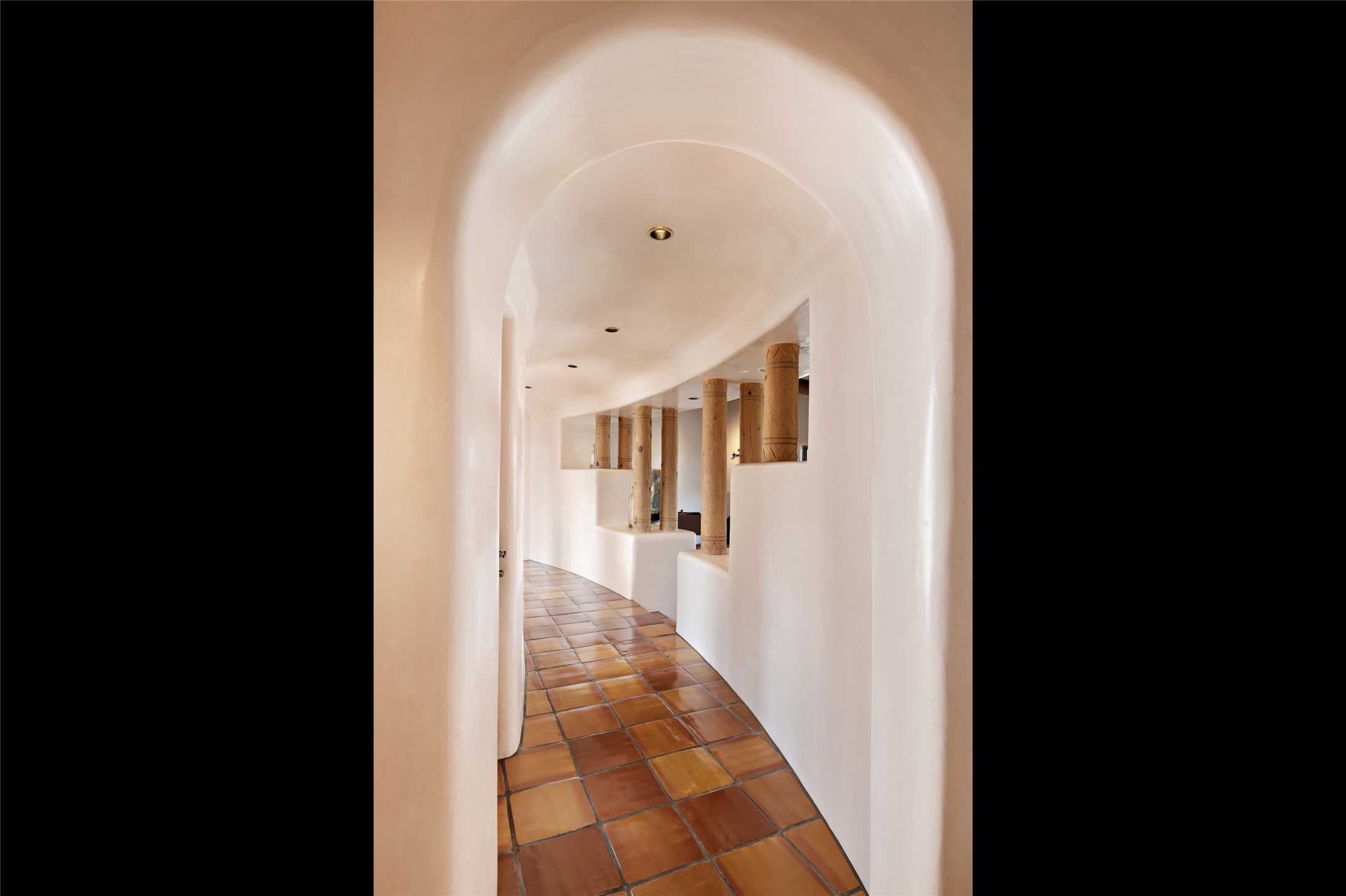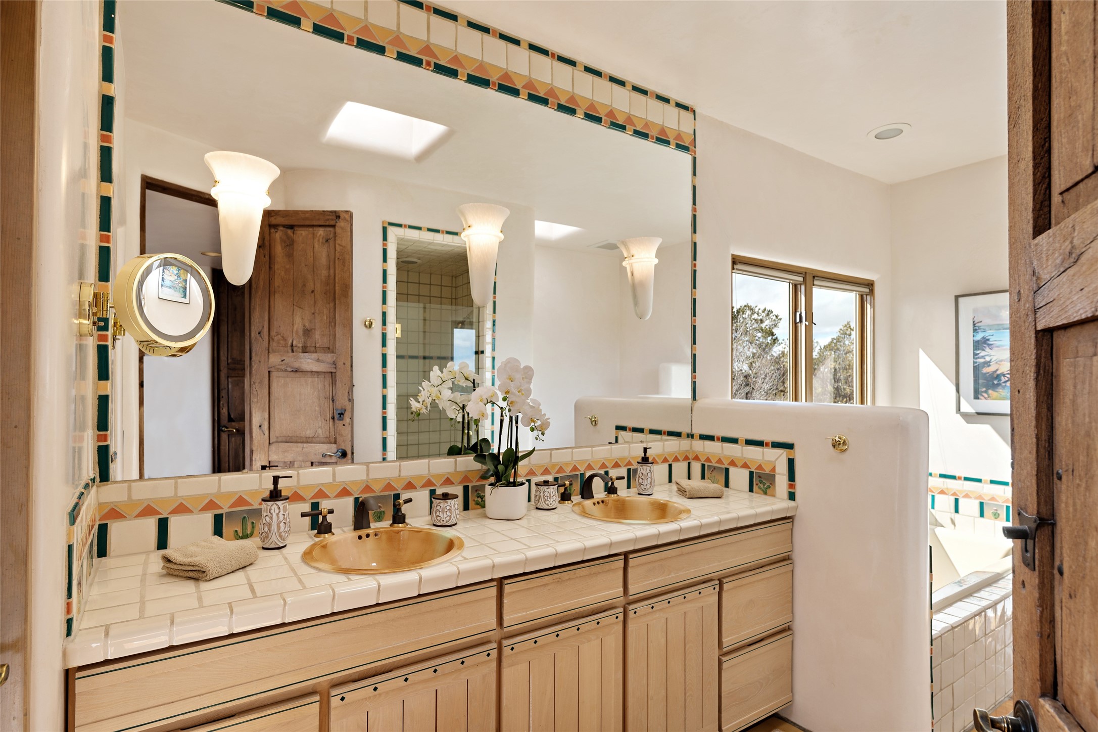 SANGRE DE CHRISTO MOUNTAIN VIEWS SPLAYED OUT IN ALL THEIR REVALRY FROM THIS 1.7 ACRE TANO ROAD HOME LOCATED ON COVETED CUL-DU-SAC LOCATION. Classical Santa Fe architecture meets modern day requirements including flexible space for bedrooms + office, city water and high-speed internet, excellent proximity to town and a Positive Energy solar system with battery back-up. Prull Builders built this extraordinary home which has been lovingly updated and maintained by the current owners. Designed by Paula Baker Laporte - the tranquil "arc" of the design allows one to "discover" the home - a new inspiration around each gentle bend. Fantastic floor plan allows for multiple outdoor spaces for entertaining and relaxing around the residence including a long portal maximizing the Sangre views, a large private walled courtyard with outdoor kiva fireplace off the den/kitchen area, balconies off corners of the primary suite and other bedrooms. Finally, an outdoor portal with a hot tub is in the perfect nook for privacy and views! Each bath has unique Talavera tile designs including a dazzling powder room. This home is the ultimate in Santa Fe living - honoring the integrity of Santa Fe style with today's modern amenities/energy savings.