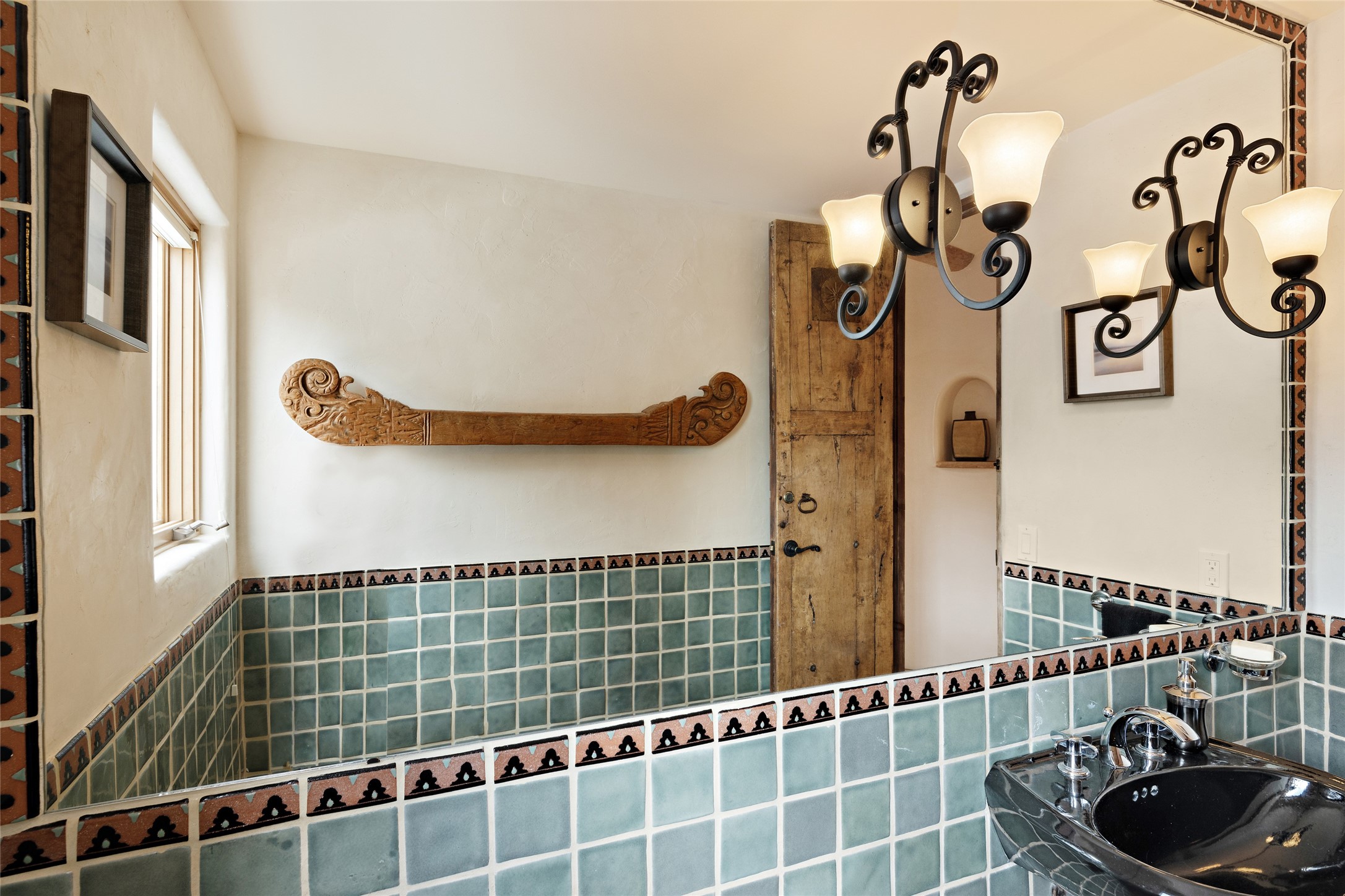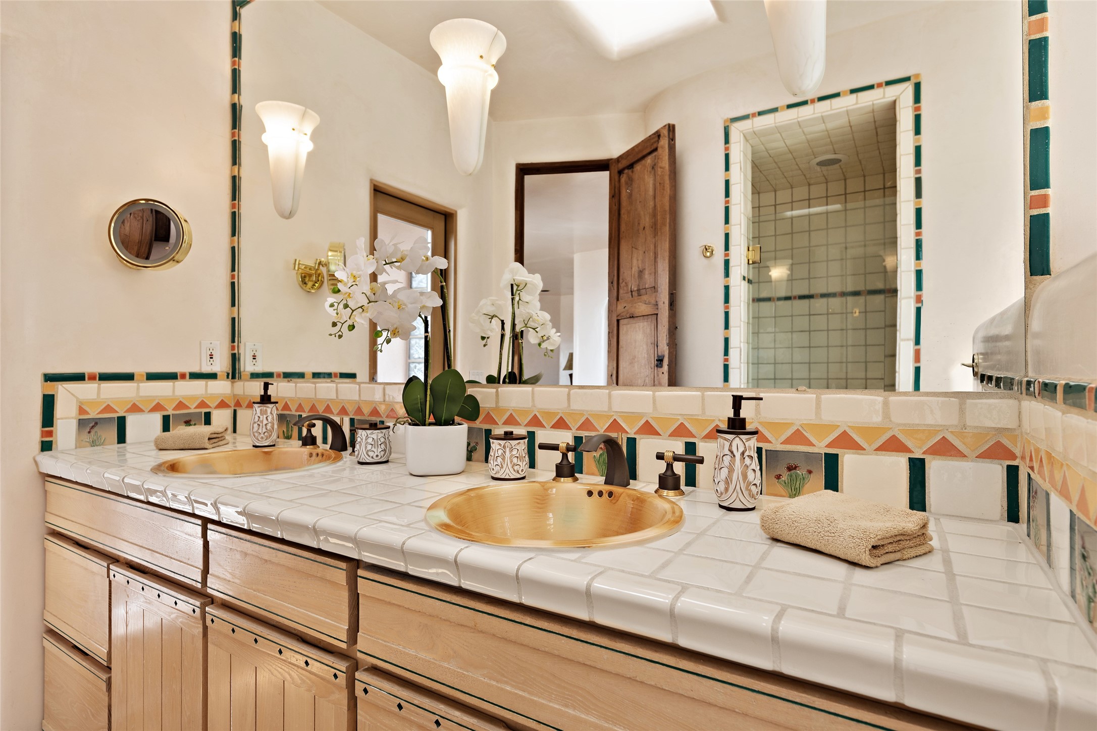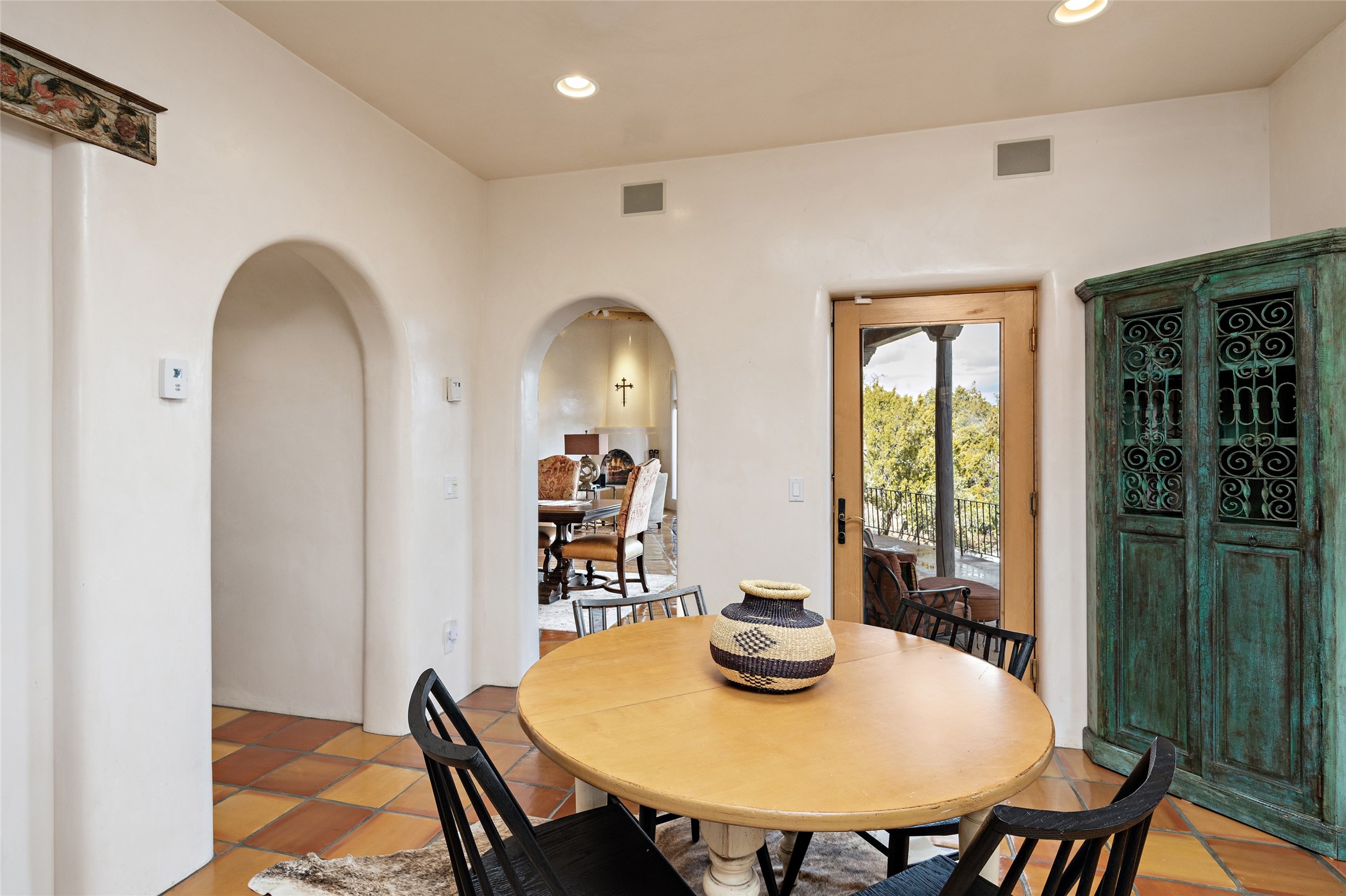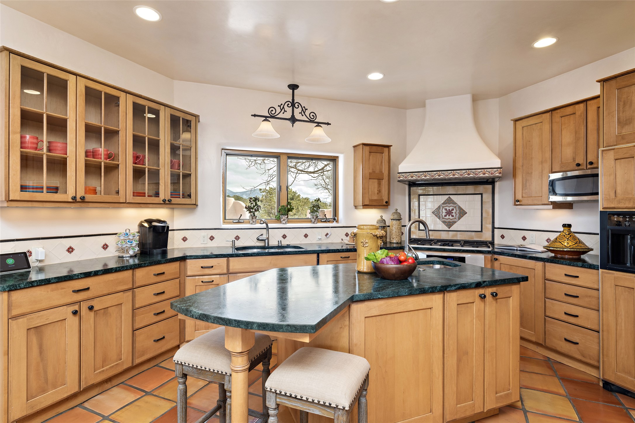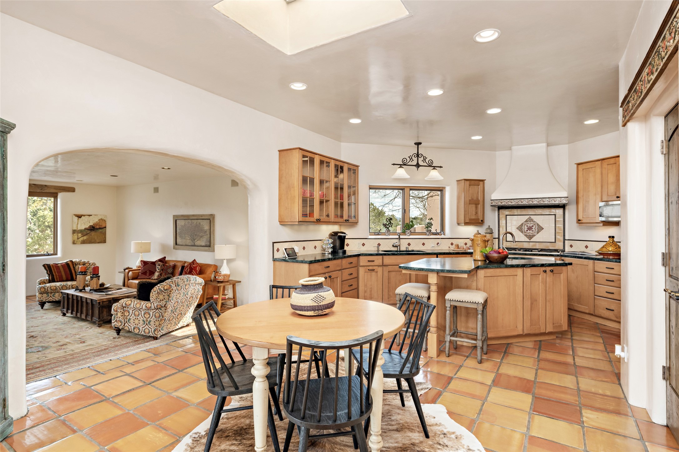 SANGRE DE CHRISTO MOUNTAIN VIEWS SPLAYED OUT IN ALL THEIR REVALRY FROM THIS 1.7 ACRE TANO ROAD HOME LOCATED ON COVETED CUL-DU-SAC LOCATION. Classical Santa Fe architecture meets modern day requirements including flexible space for bedrooms + office, city water and high-speed internet, excellent proximity to town and a Positive Energy solar system with battery back-up. Prull Builders built this extraordinary home which has been lovingly updated and maintained by the current owners. Designed by Paula Baker Laporte - the tranquil "arc" of the design allows one to "discover" the home - a new inspiration around each gentle bend. Fantastic floor plan allows for multiple outdoor spaces for entertaining and relaxing around the residence including a long portal maximizing the Sangre views, a large private walled courtyard with outdoor kiva fireplace off the den/kitchen area, balconies off corners of the primary suite and other bedrooms. Finally, an outdoor portal with a hot tub is in the perfect nook for privacy and views! Each bath has unique Talavera tile designs including a dazzling powder room. This home is the ultimate in Santa Fe living - honoring the integrity of Santa Fe style with today's modern amenities/energy savings.