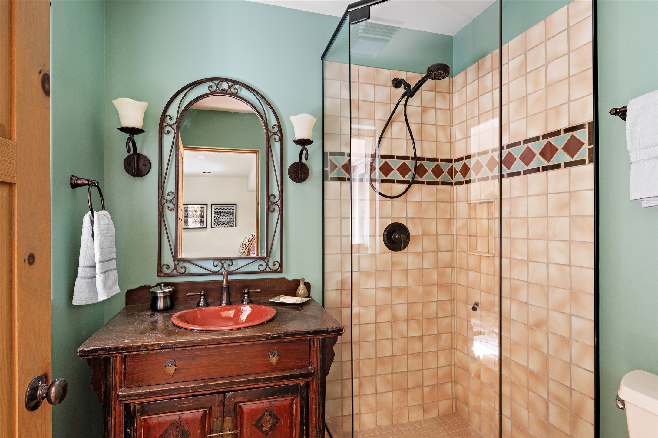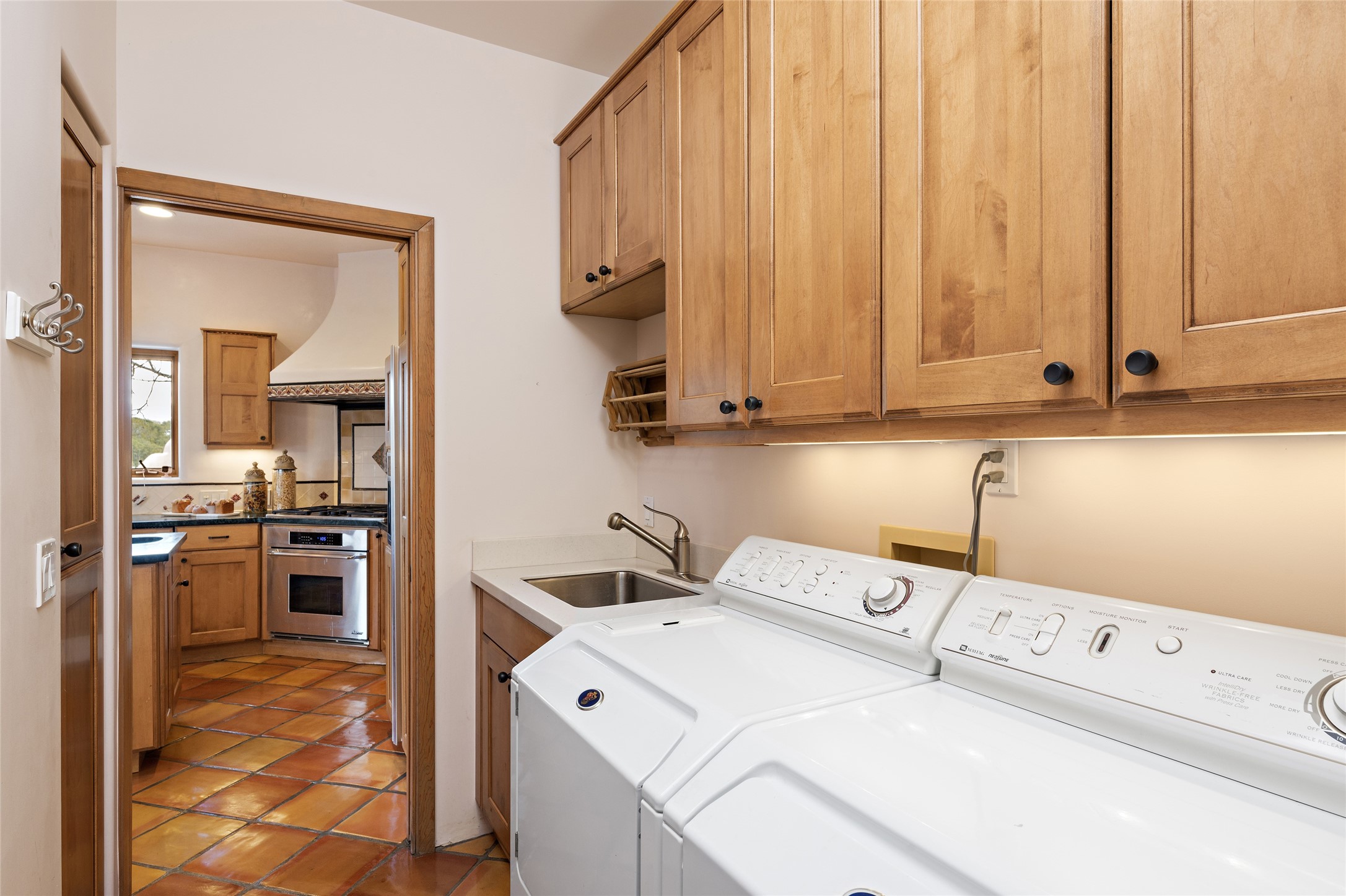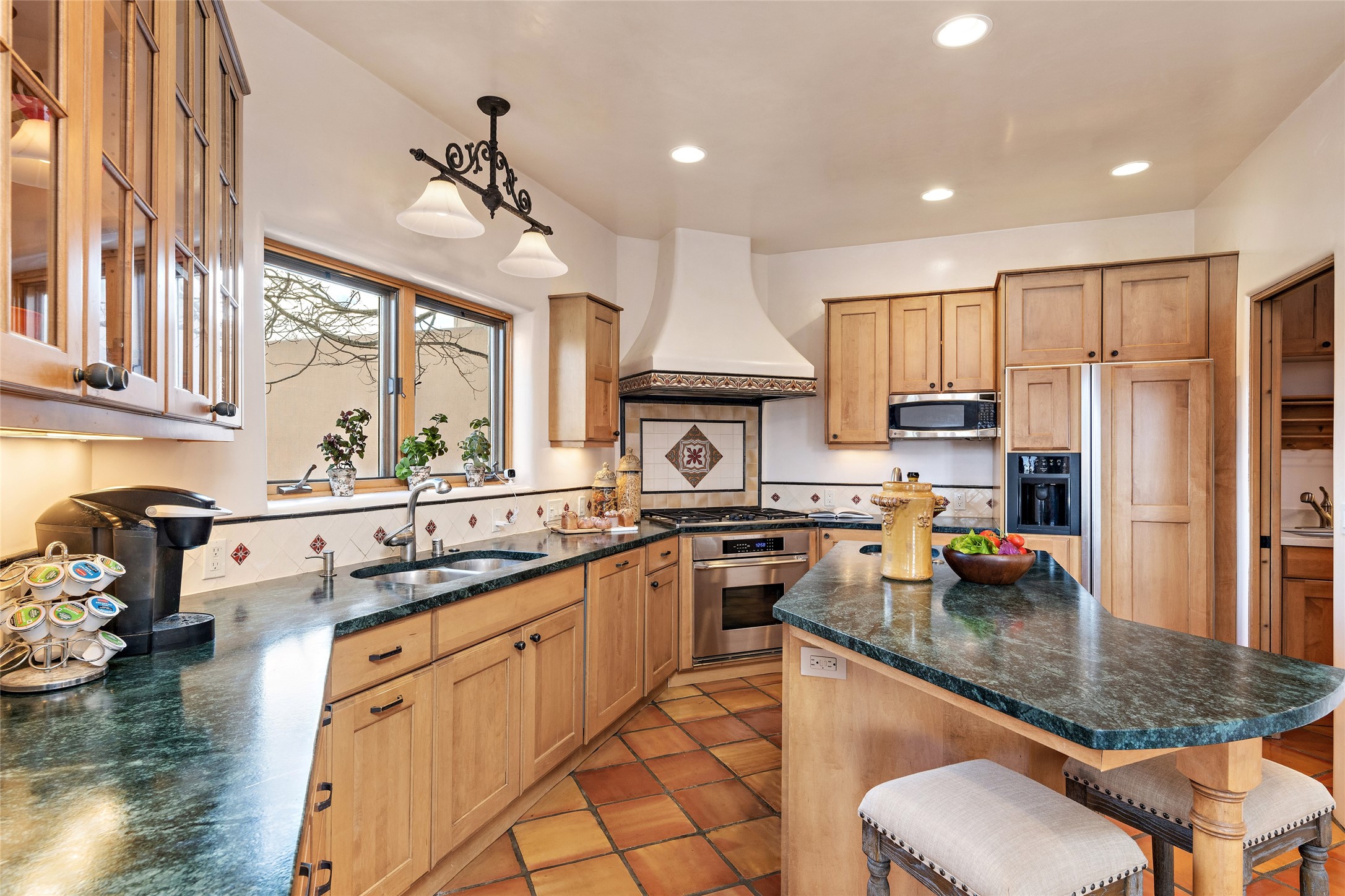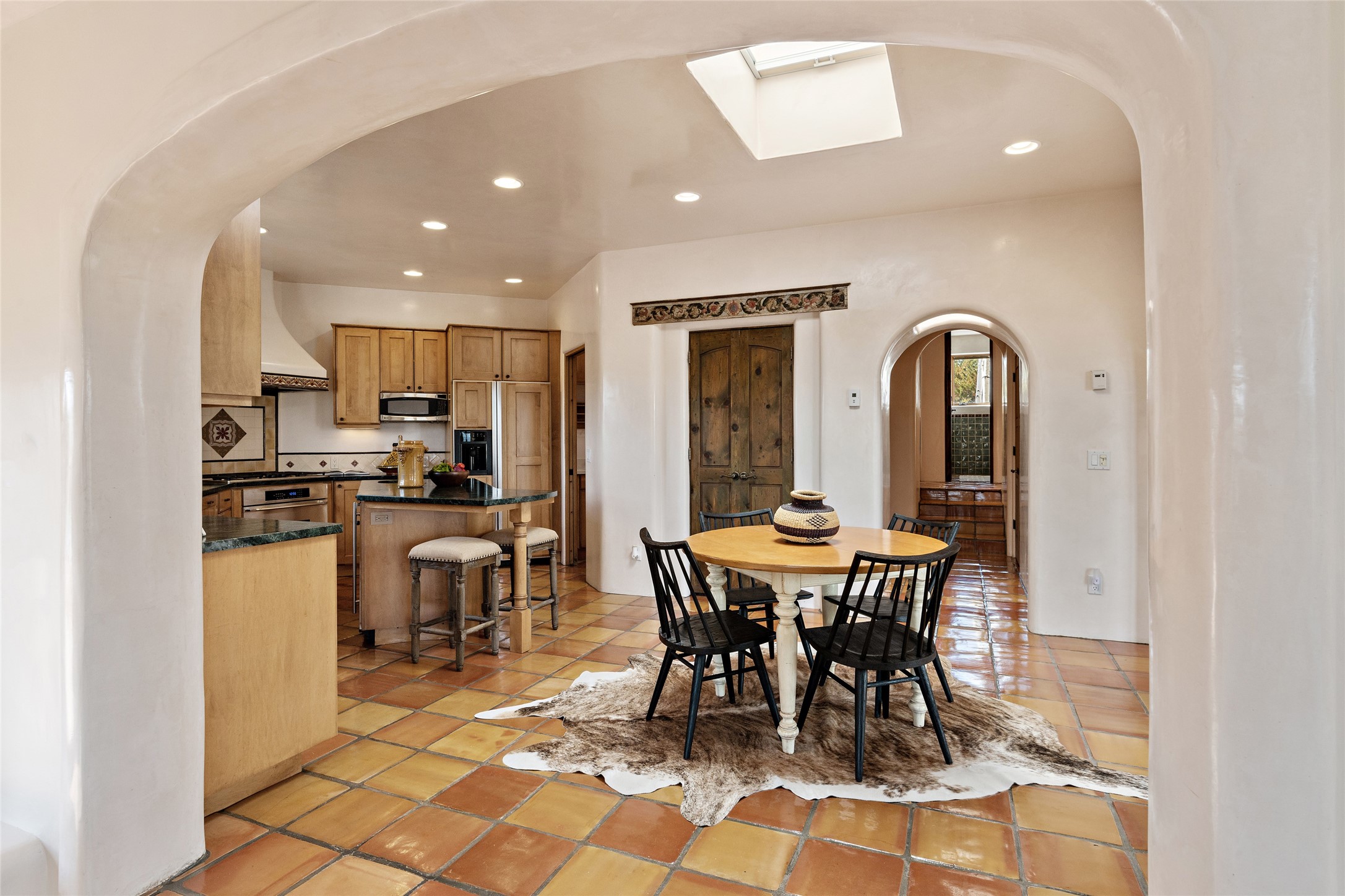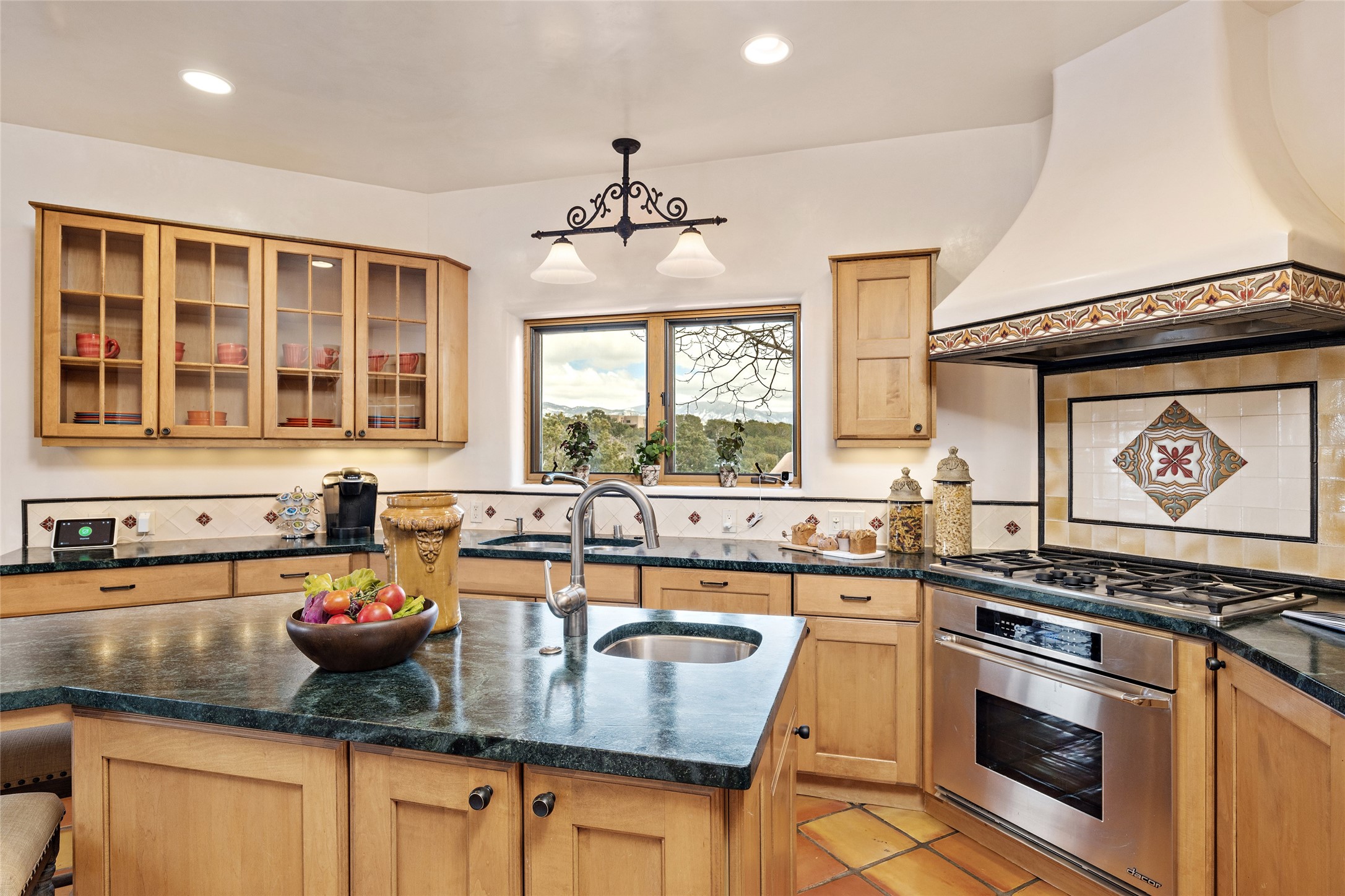 SANGRE DE CHRISTO MOUNTAIN VIEWS SPLAYED OUT IN ALL THEIR REVALRY FROM THIS 1.7 ACRE TANO ROAD HOME LOCATED ON COVETED CUL-DU-SAC LOCATION. Classical Santa Fe architecture meets modern day requirements including flexible space for bedrooms + office, city water and high-speed internet, excellent proximity to town and a Positive Energy solar system with battery back-up. Prull Builders built this extraordinary home which has been lovingly updated and maintained by the current owners. Designed by Paula Baker Laporte - the tranquil "arc" of the design allows one to "discover" the home - a new inspiration around each gentle bend. Fantastic floor plan allows for multiple outdoor spaces for entertaining and relaxing around the residence including a long portal maximizing the Sangre views, a large private walled courtyard with outdoor kiva fireplace off the den/kitchen area, balconies off corners of the primary suite and other bedrooms. Finally, an outdoor portal with a hot tub is in the perfect nook for privacy and views! Each bath has unique Talavera tile designs including a dazzling powder room. This home is the ultimate in Santa Fe living - honoring the integrity of Santa Fe style with today's modern amenities/energy savings.