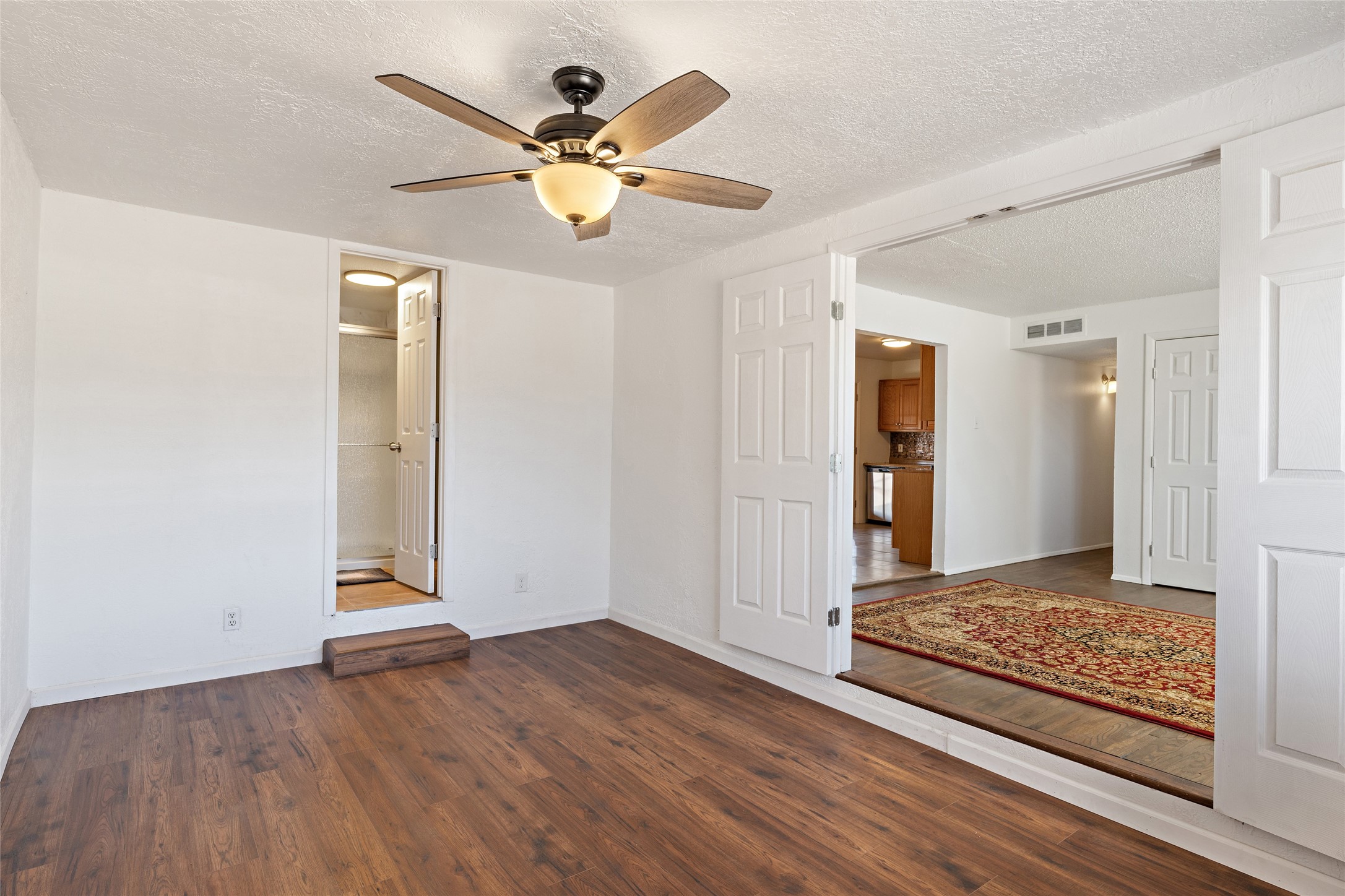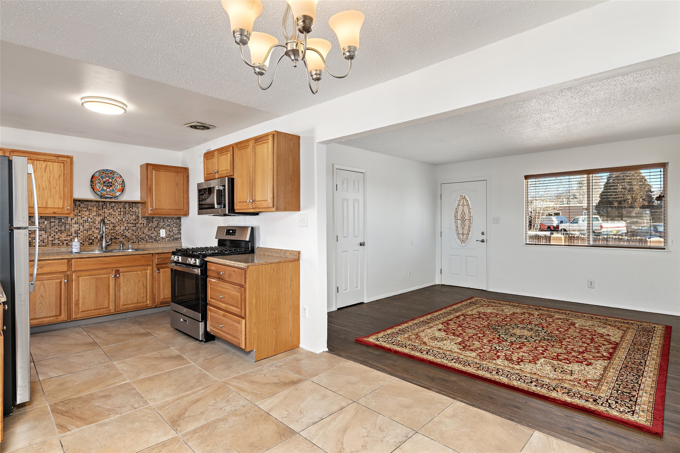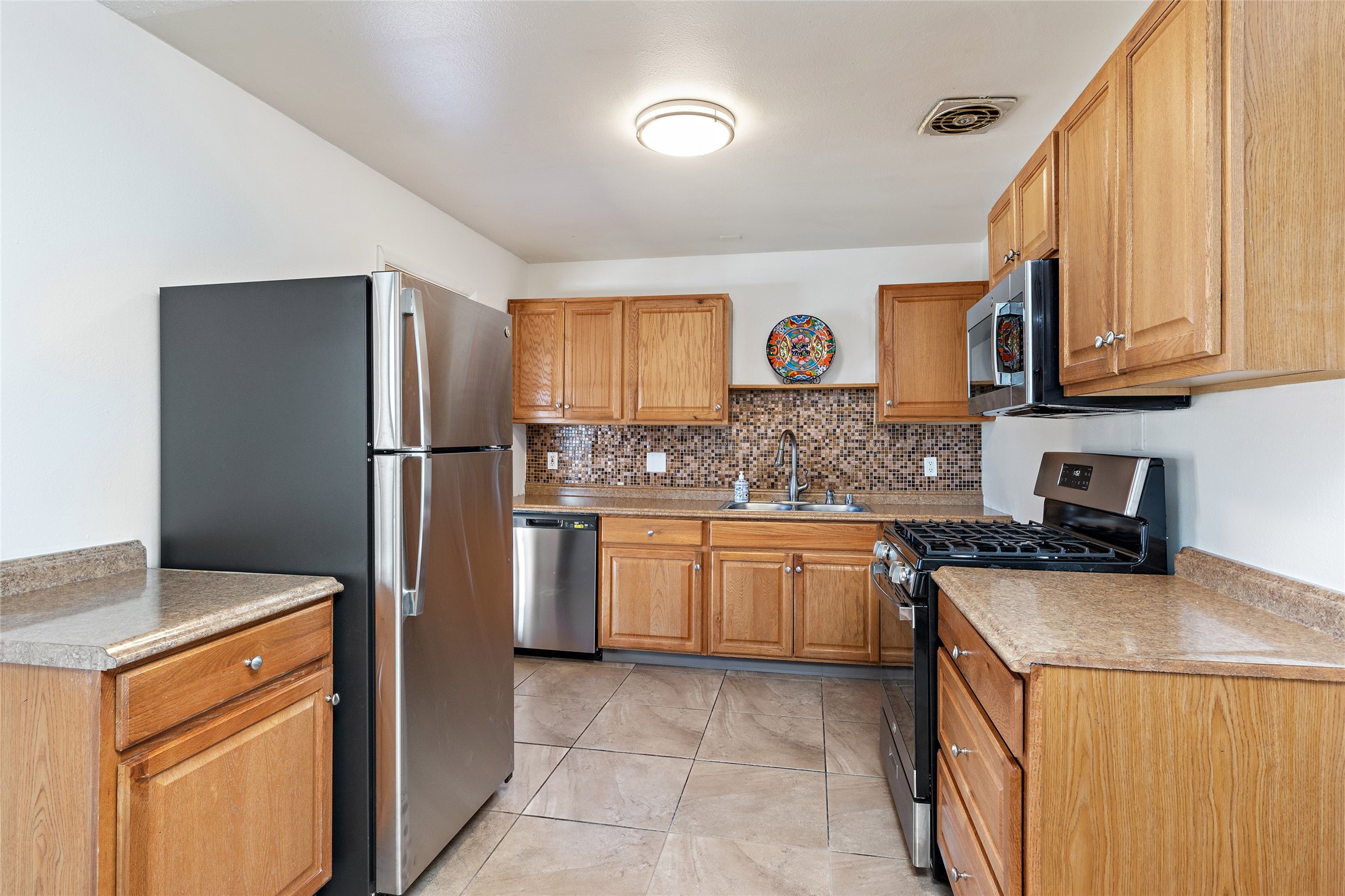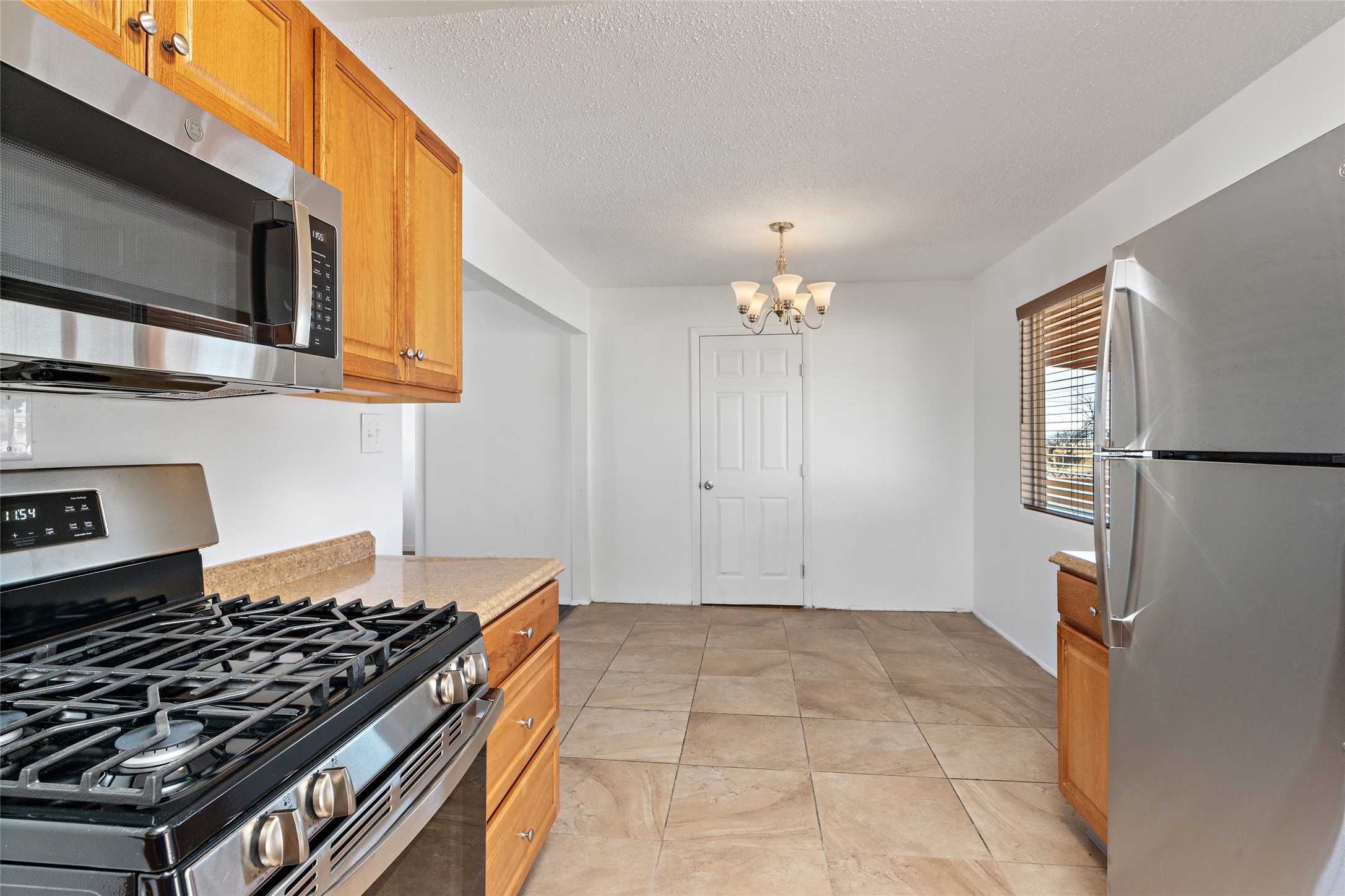 This lovely single family residence is on a quiet street in the middle of Santa Fe. Its convenient location in the Bellamah neighborhood allows for easy access to all parts on the City Different. Recently updated the home features gorgeous hardwood flooring and new appliances including a W/D, gas range, dishwasher and refrigerator. There are 3 bedrooms plus a flex room with access to the second bath which could be used as a fourth bedroom or office / den. The large backyard is a clean slate ready for your creatively but it does feature an oversized wood portal off of the kitchen with some sunset views. Clean and move-in ready make this affordable property yours!