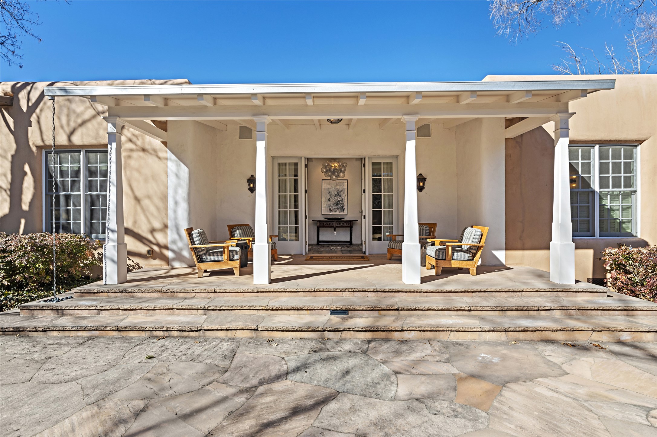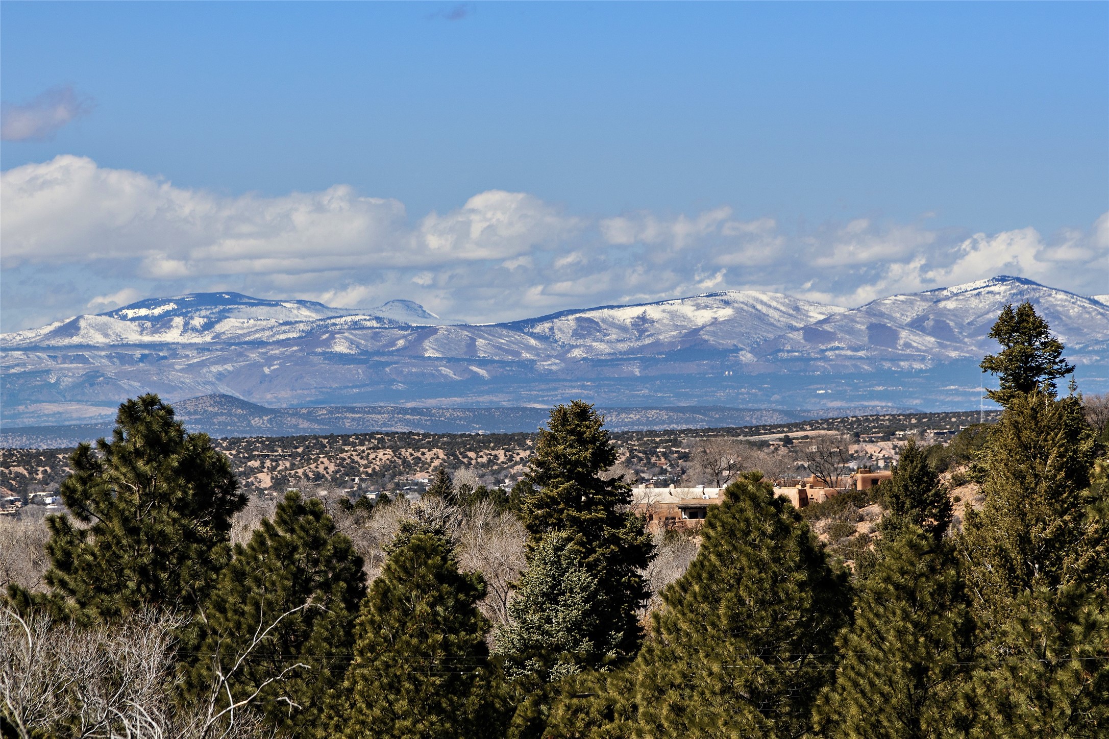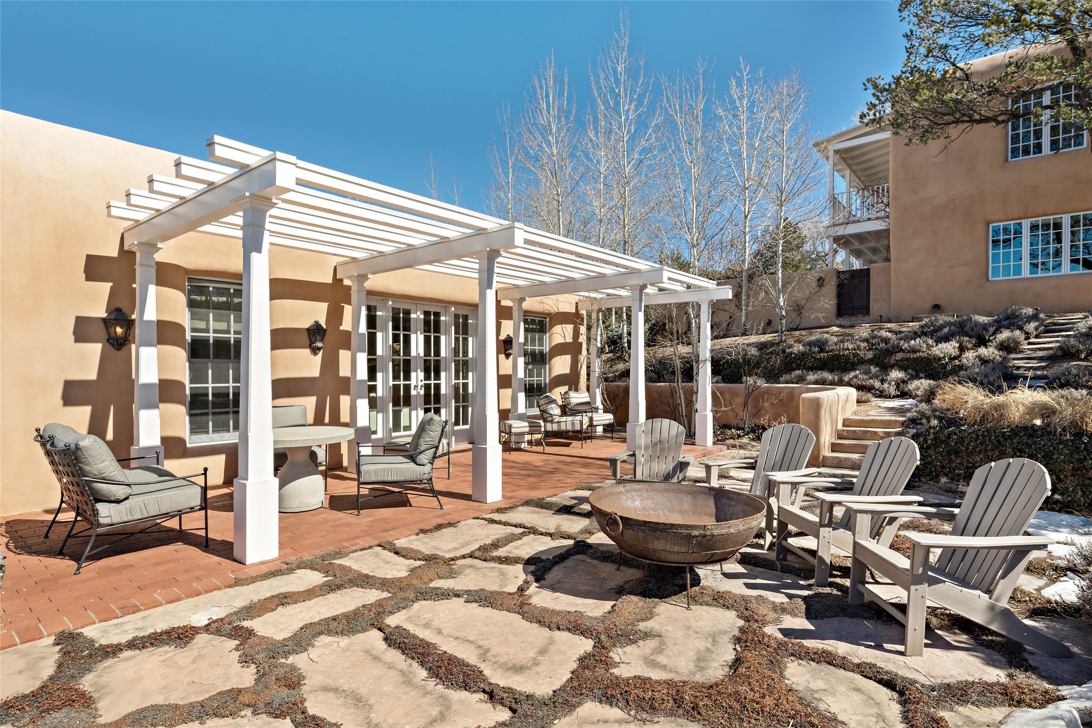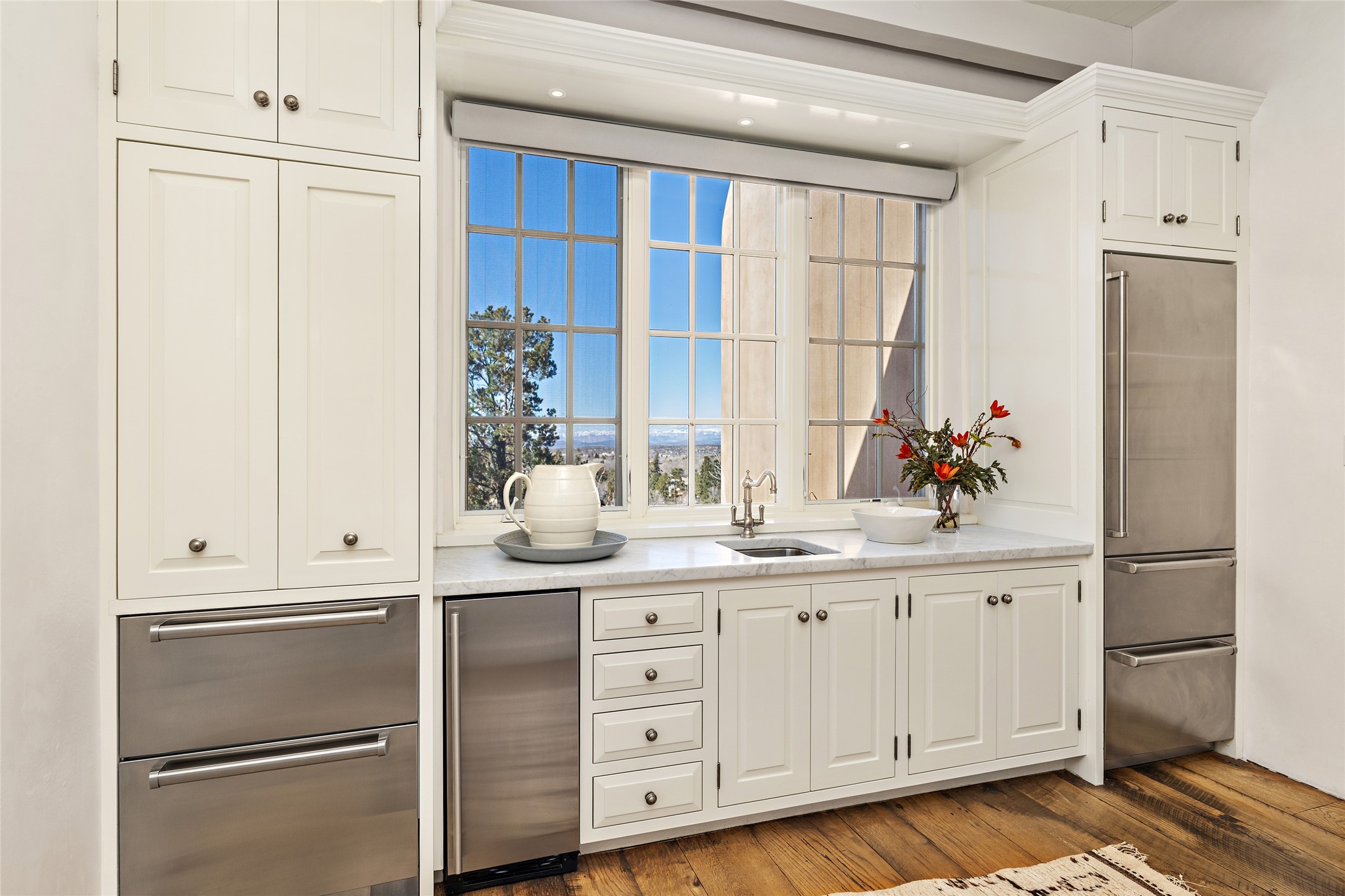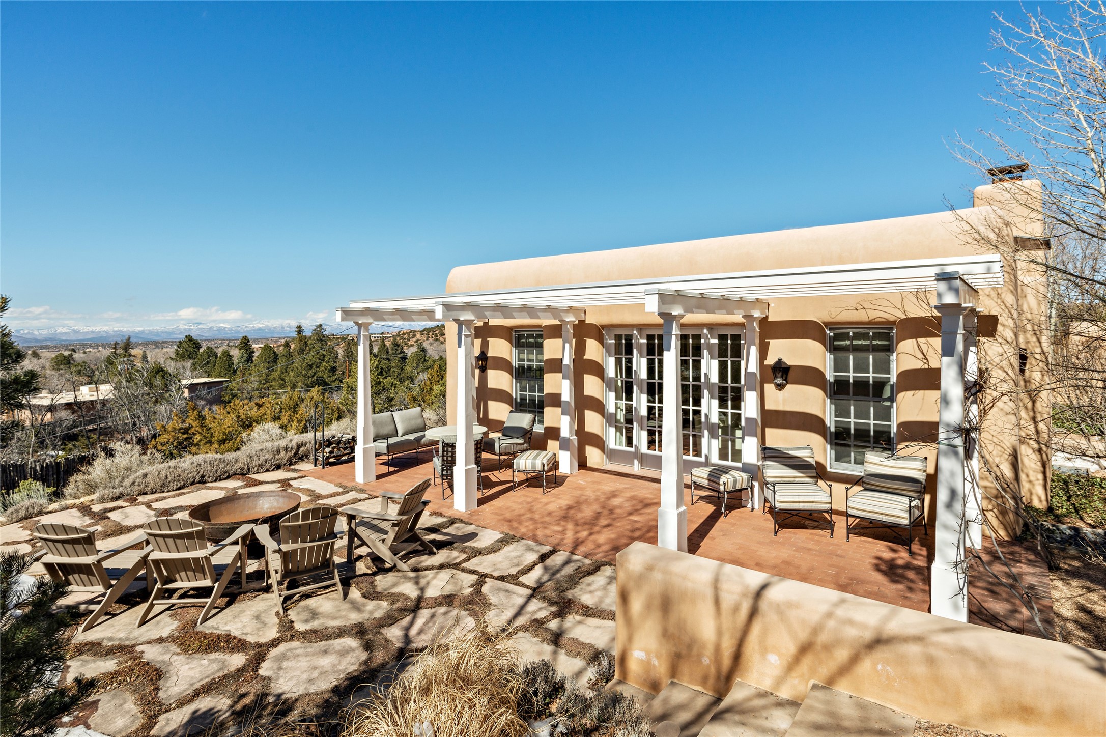 This elegant, hilltop estate, located on the Historic Eastside, offers glorious views of the Jemez and Sangre de Cristo mountains. The pueblo style home and guest house are appointed with territorial-style influences of clean lines, high ceilings, and classic features. The private, gated retreat provides a sophisticated, park-like environment to enjoy the understated beauty of quality luxury finishes throughout. The main residence offers an inviting living room with large cast stone fireplace and adjoining sitting room; and a well-appointed chef's kitchen with access to outside entertaining spaces, including a wood-burning kiva fireplace and grill. The romantic primary suite has a beautiful fireplace, two sets of French doors to a balcony to take in the beautiful surroundings, and a spa-inspired bath. Generously proportioned rooms feature diamond plaster walls and varying widths of handsome reclaimed oak plank floors. The guest house will delight with finishes consistent with the main residence: a cozy living area with fireplace, open to the beautiful chef's kitchen; its own primary and guest bedrooms; and lovely outdoor spaces to take in big views of the Jemez mountains and sunsets. The completely enclosed compound has mature gardens, gorgeous hardscape, Aspen groves, and numerous outside spaces to enjoy. This is an exceptional property in a premier location that includes a 3-car garage.