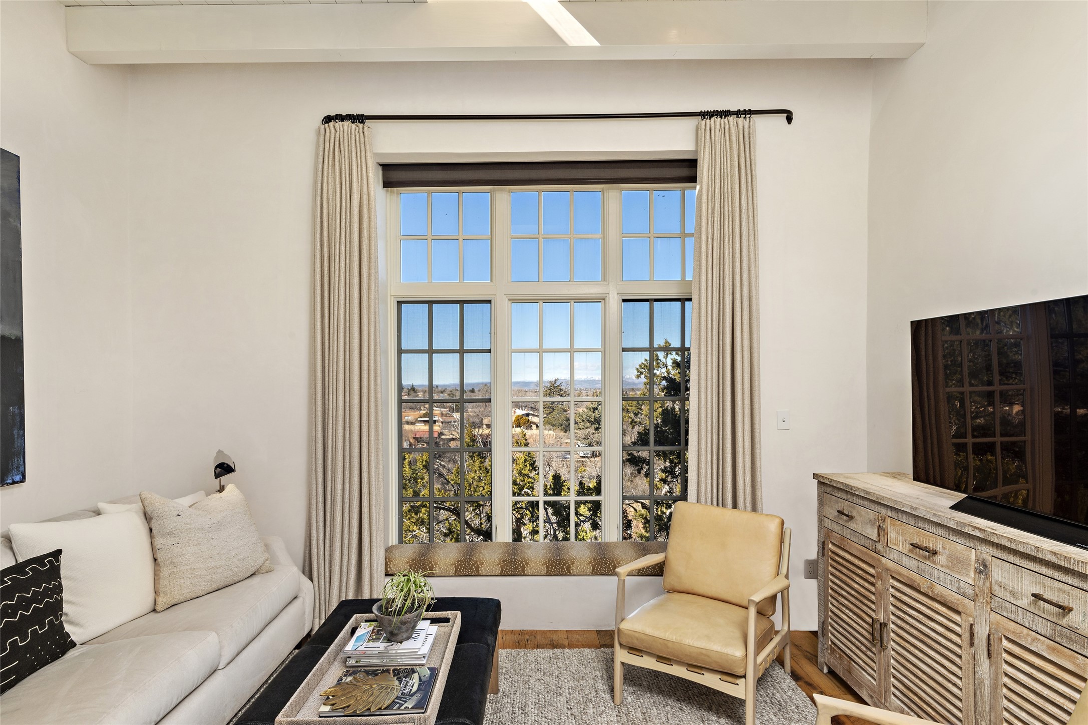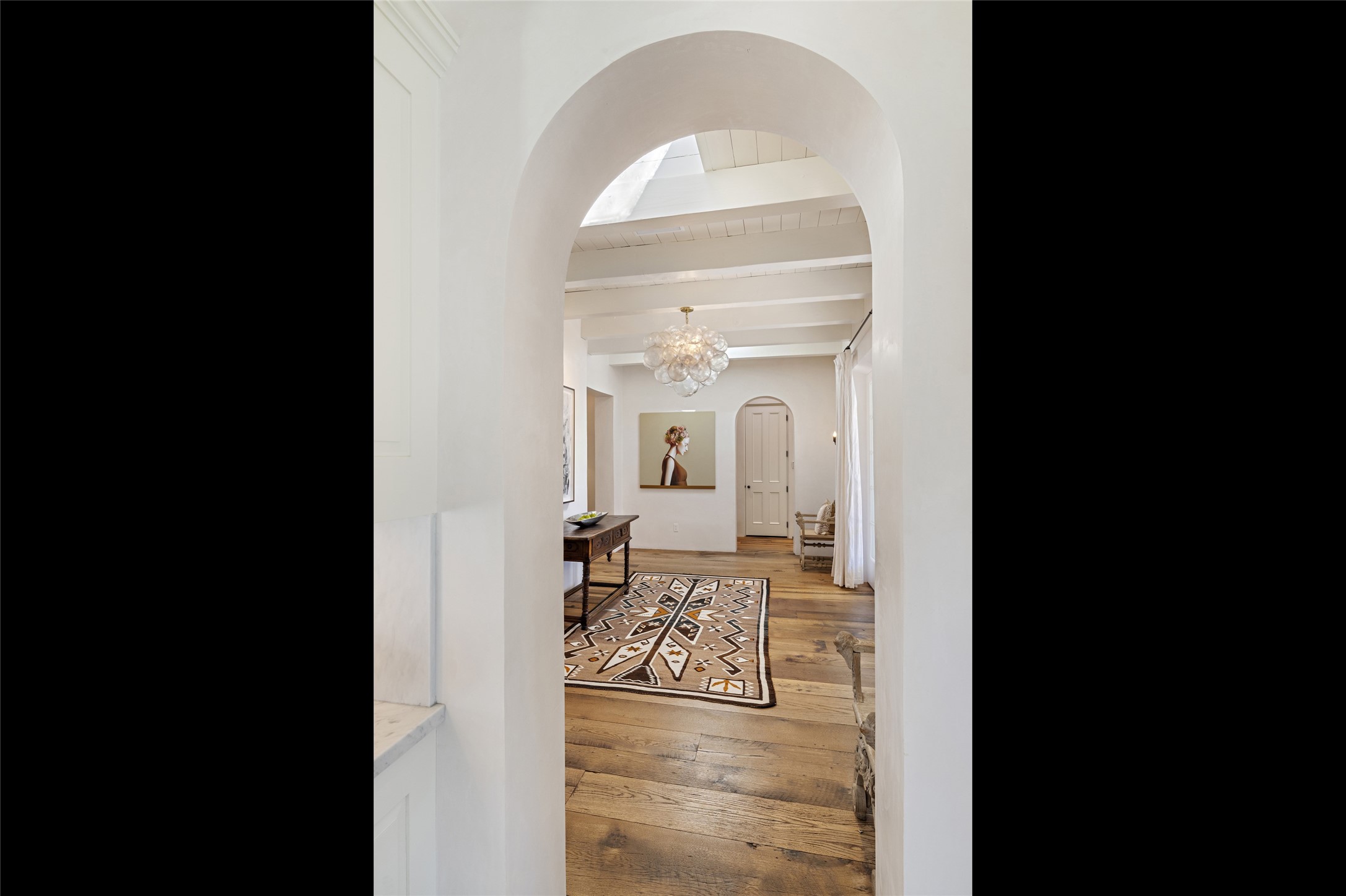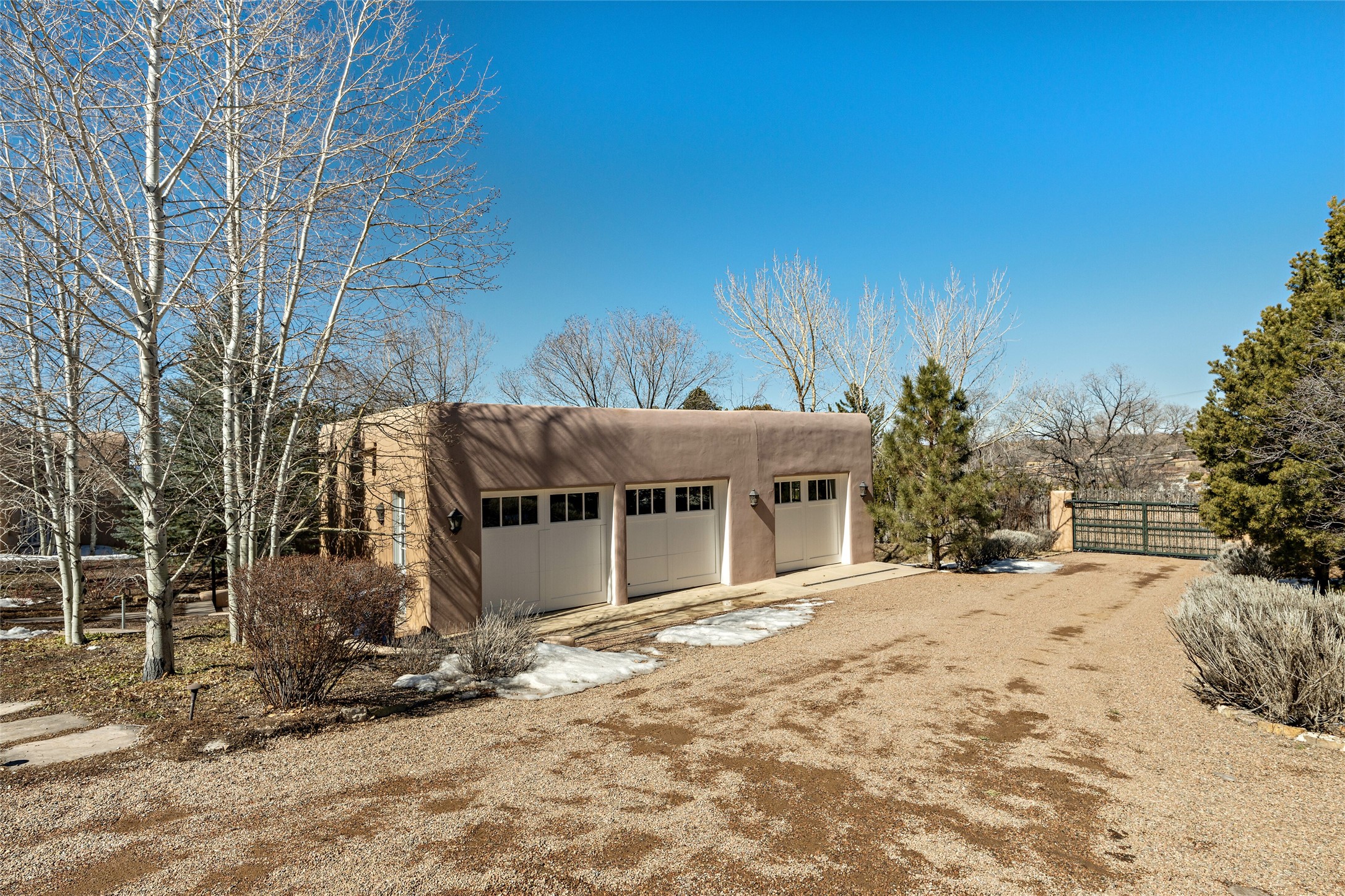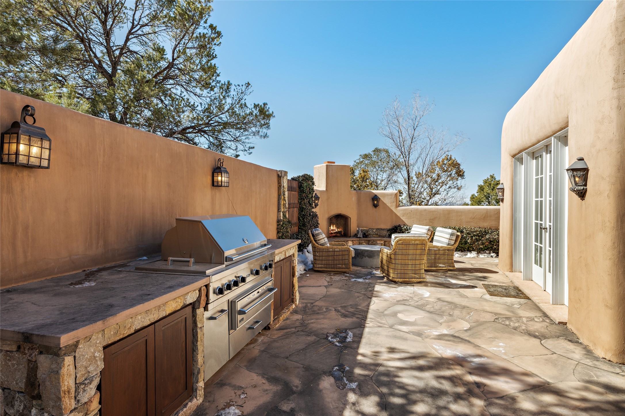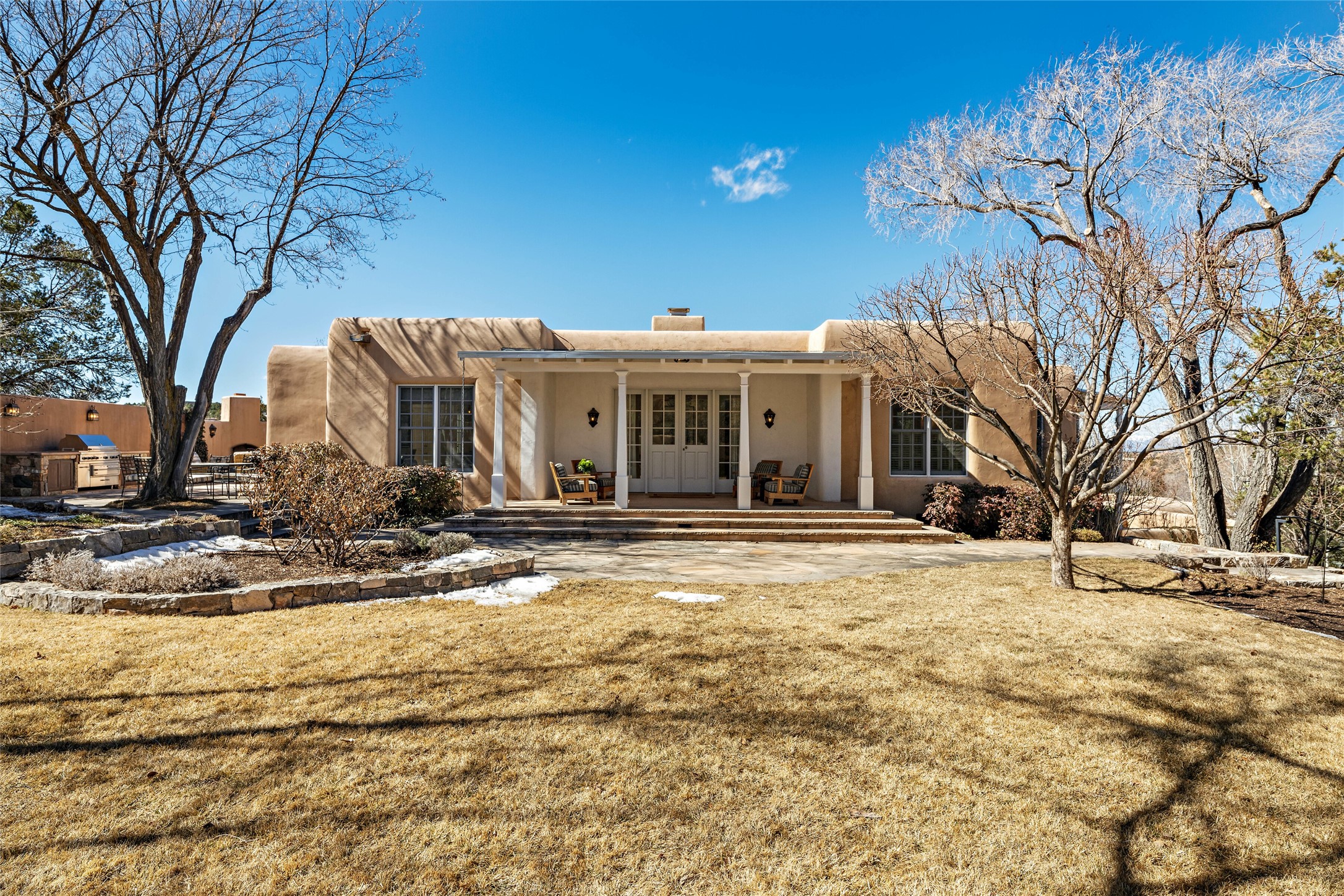This elegant, hilltop estate, located on the Historic Eastside, offers glorious views of the Jemez and Sangre de Cristo mountains. The pueblo style home and guest house are appointed with territorial-style influences of clean lines, high ceilings, and classic features. The private, gated retreat provides a sophisticated, park-like environment to enjoy the understated beauty of quality luxury finishes throughout. The main residence offers an inviting living room with large cast stone fireplace and adjoining sitting room; and a well-appointed chef's kitchen with access to outside entertaining spaces, including a wood-burning kiva fireplace and grill. The romantic primary suite has a beautiful fireplace, two sets of French doors to a balcony to take in the beautiful surroundings, and a spa-inspired bath. Generously proportioned rooms feature diamond plaster walls and varying widths of handsome reclaimed oak plank floors. The guest house will delight with finishes consistent with the main residence: a cozy living area with fireplace, open to the beautiful chef's kitchen; its own primary and guest bedrooms; and lovely outdoor spaces to take in big views of the Jemez mountains and sunsets. The completely enclosed compound has mature gardens, gorgeous hardscape, Aspen groves, and numerous outside spaces to enjoy. This is an exceptional property in a premier location that includes a 3-car garage.