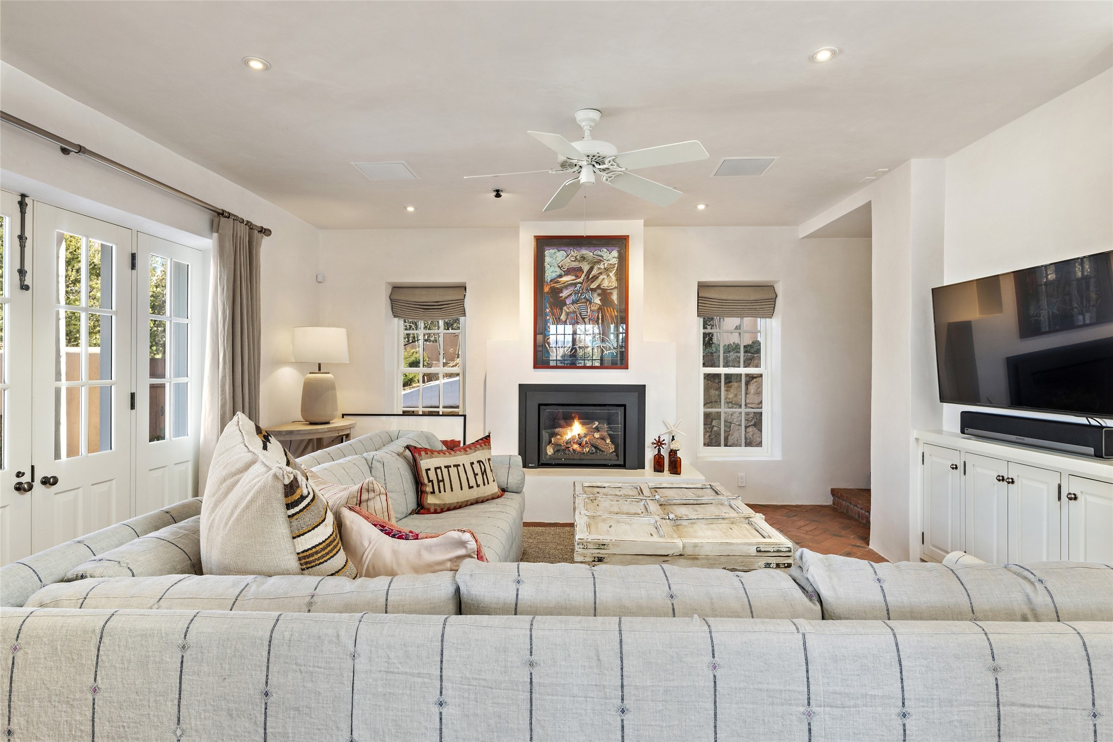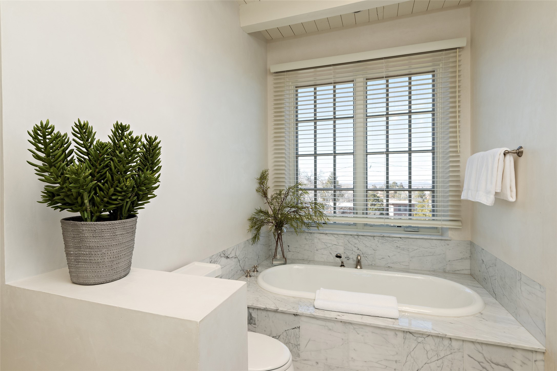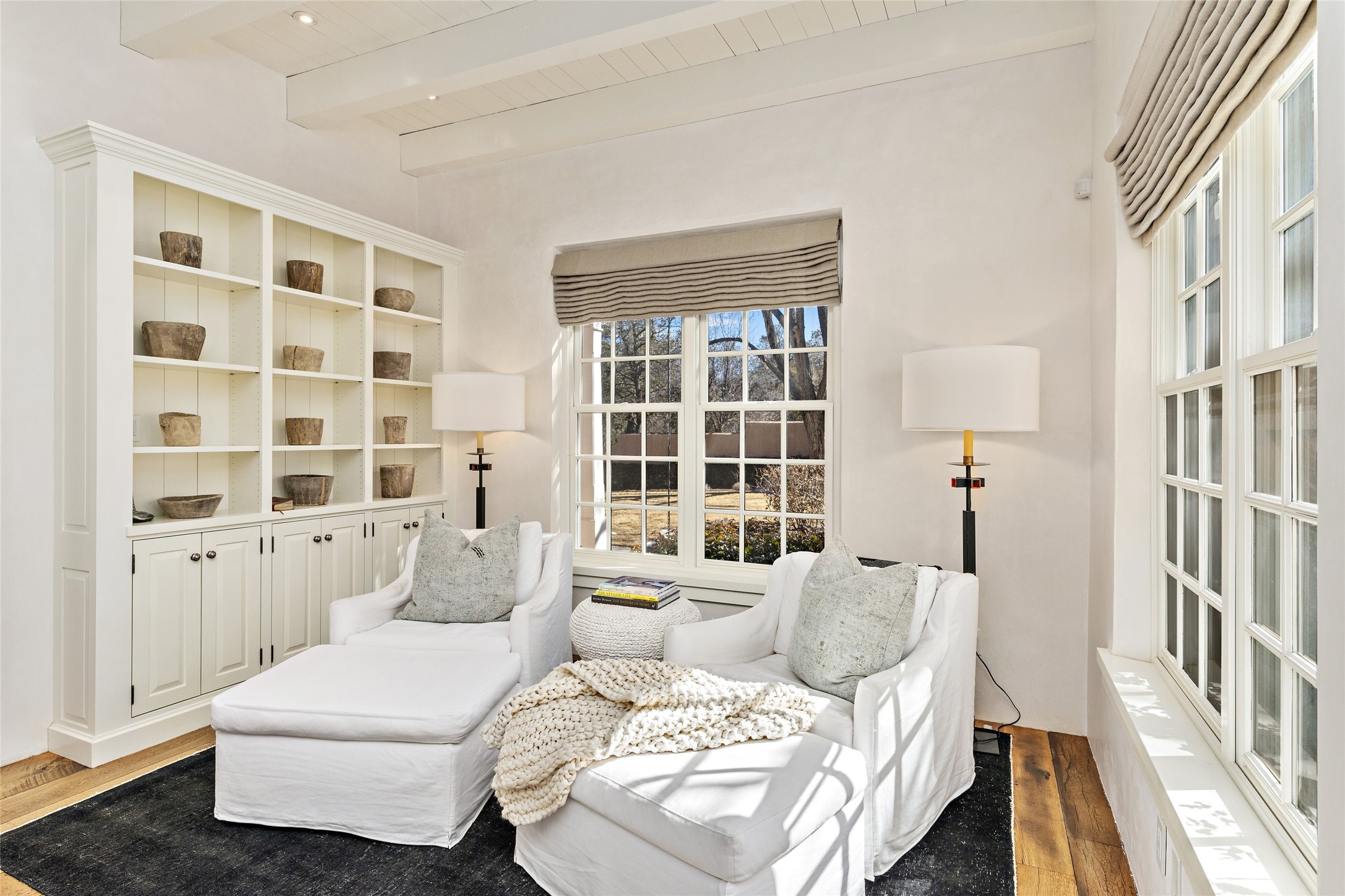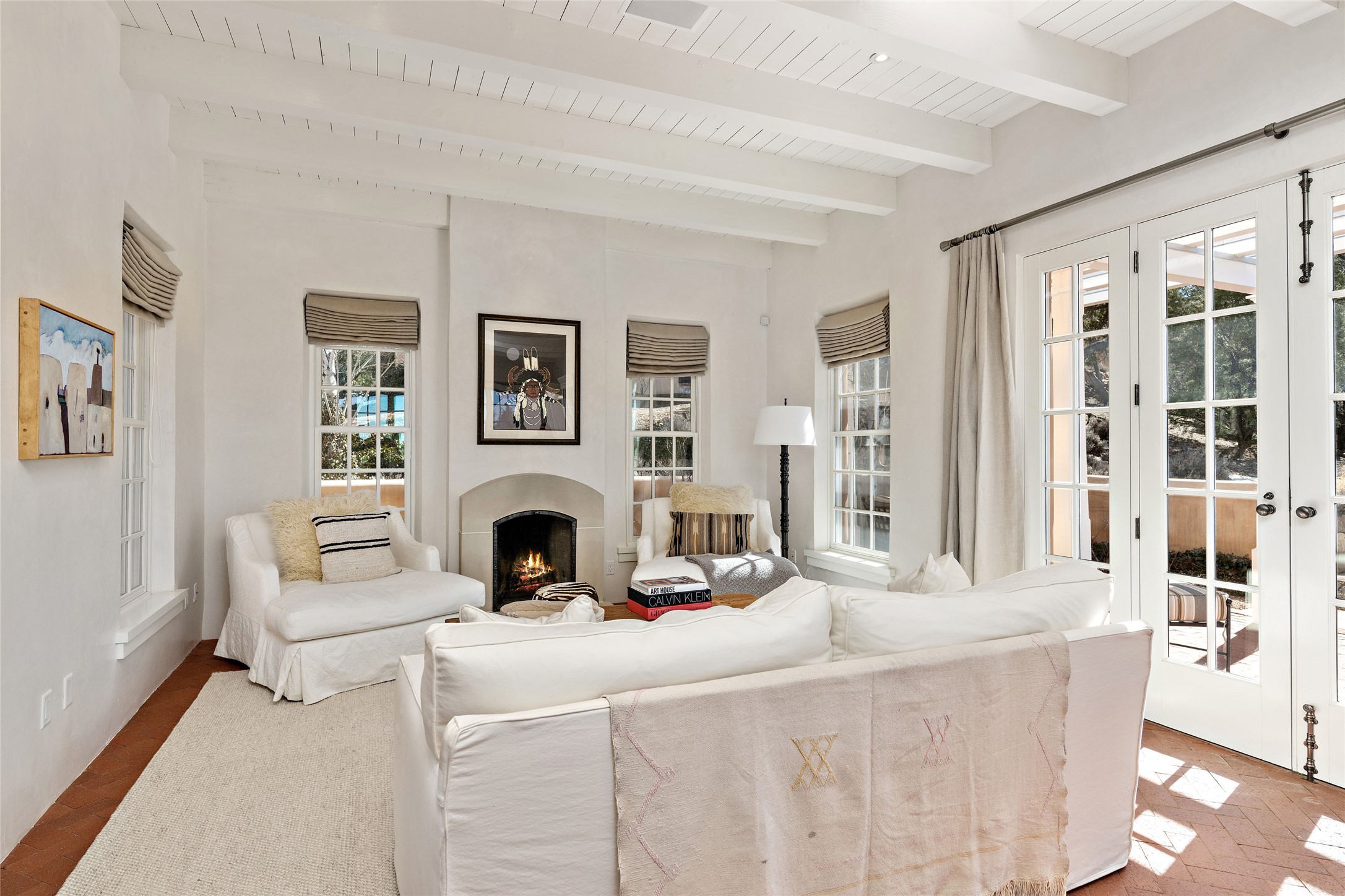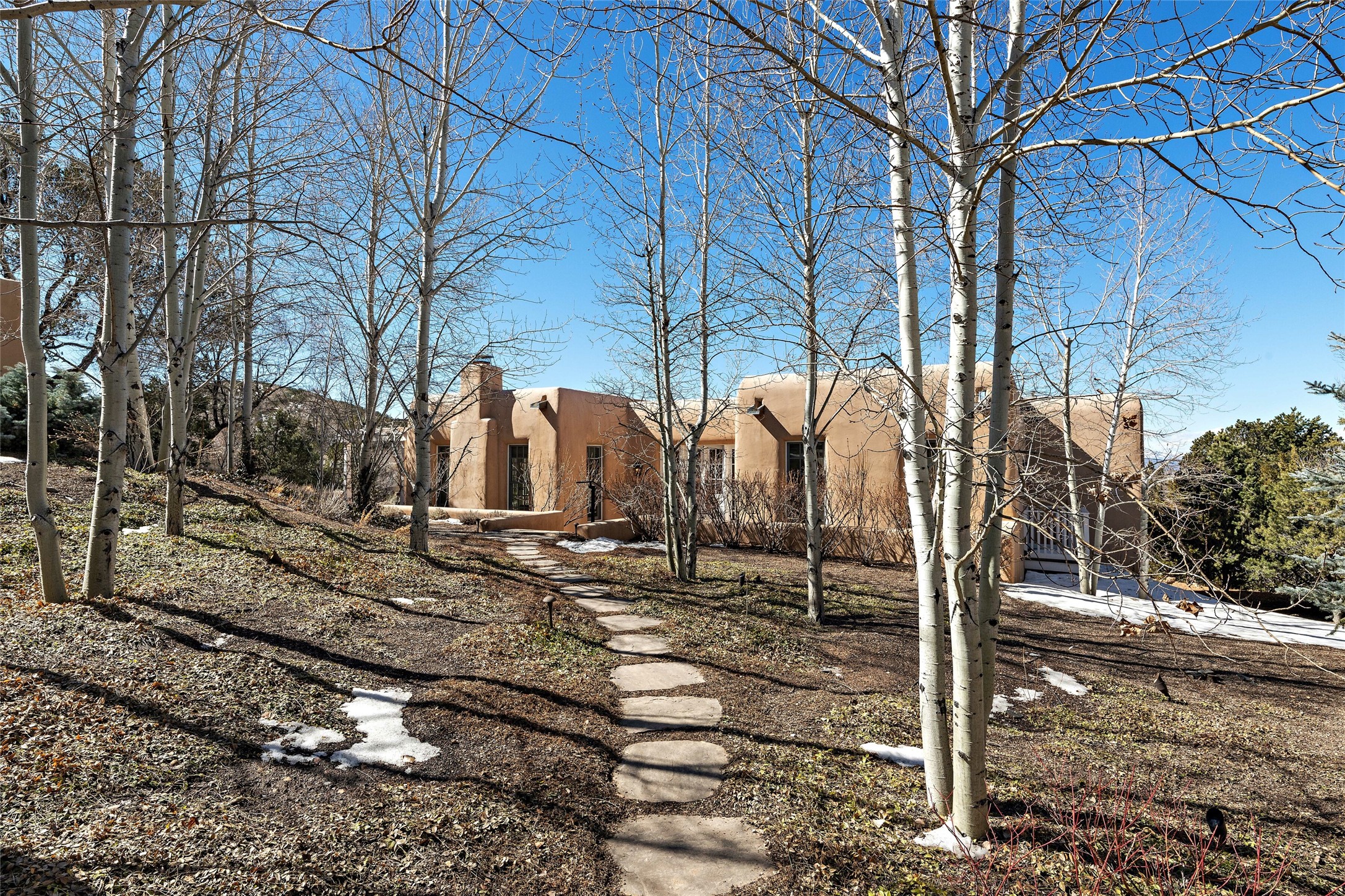 This elegant, hilltop estate, located on the Historic Eastside, offers glorious views of the Jemez and Sangre de Cristo mountains. The pueblo style home and guest house are appointed with territorial-style influences of clean lines, high ceilings, and classic features. The private, gated retreat provides a sophisticated, park-like environment to enjoy the understated beauty of quality luxury finishes throughout. The main residence offers an inviting living room with large cast stone fireplace and adjoining sitting room; and a well-appointed chef's kitchen with access to outside entertaining spaces, including a wood-burning kiva fireplace and grill. The romantic primary suite has a beautiful fireplace, two sets of French doors to a balcony to take in the beautiful surroundings, and a spa-inspired bath. Generously proportioned rooms feature diamond plaster walls and varying widths of handsome reclaimed oak plank floors. The guest house will delight with finishes consistent with the main residence: a cozy living area with fireplace, open to the beautiful chef's kitchen; its own primary and guest bedrooms; and lovely outdoor spaces to take in big views of the Jemez mountains and sunsets. The completely enclosed compound has mature gardens, gorgeous hardscape, Aspen groves, and numerous outside spaces to enjoy. This is an exceptional property in a premier location that includes a 3-car garage.