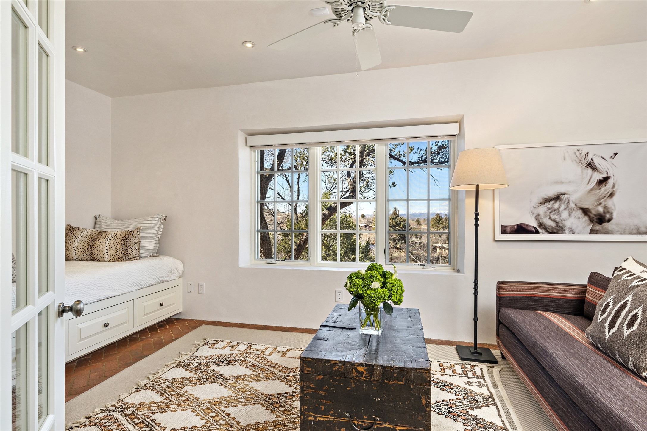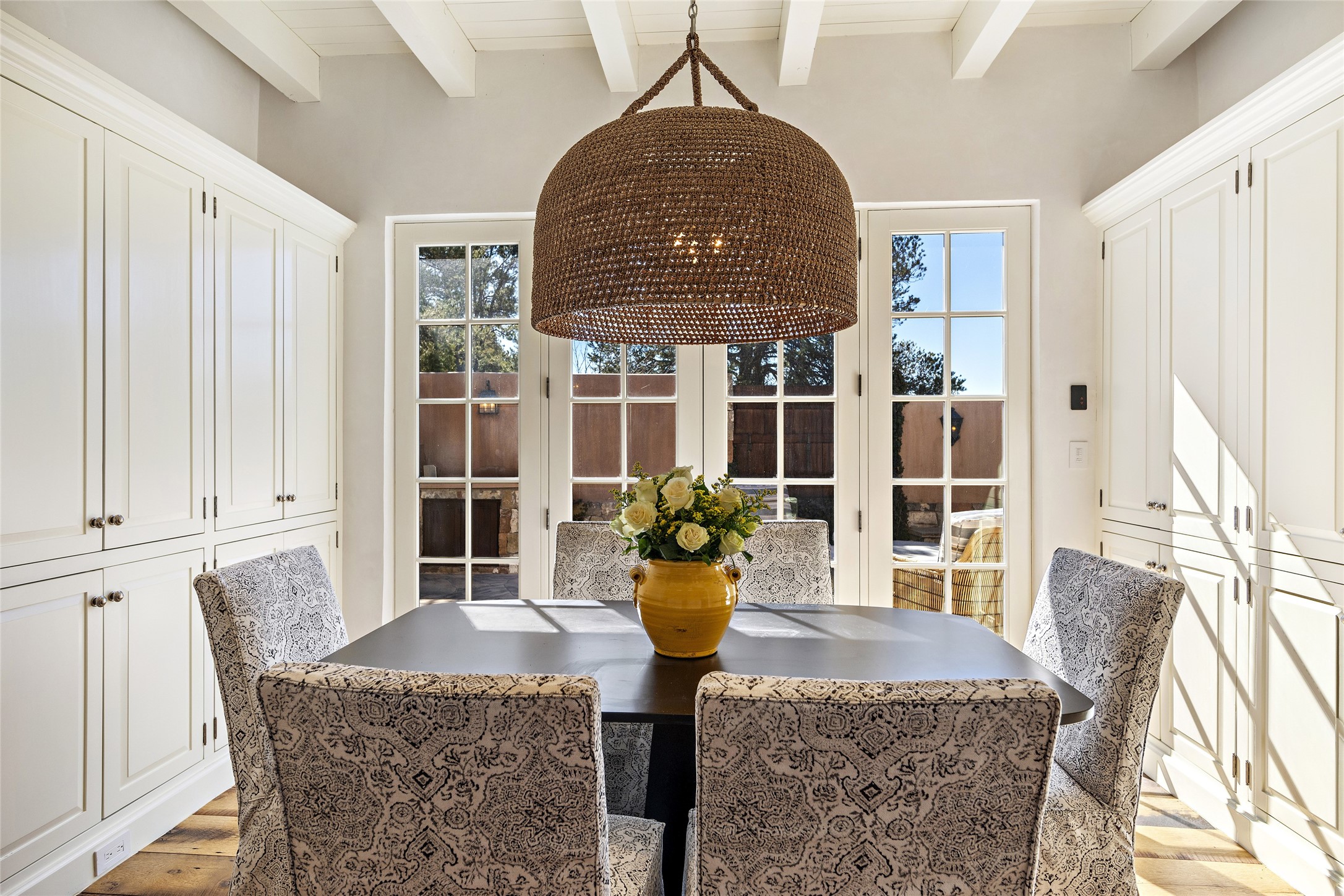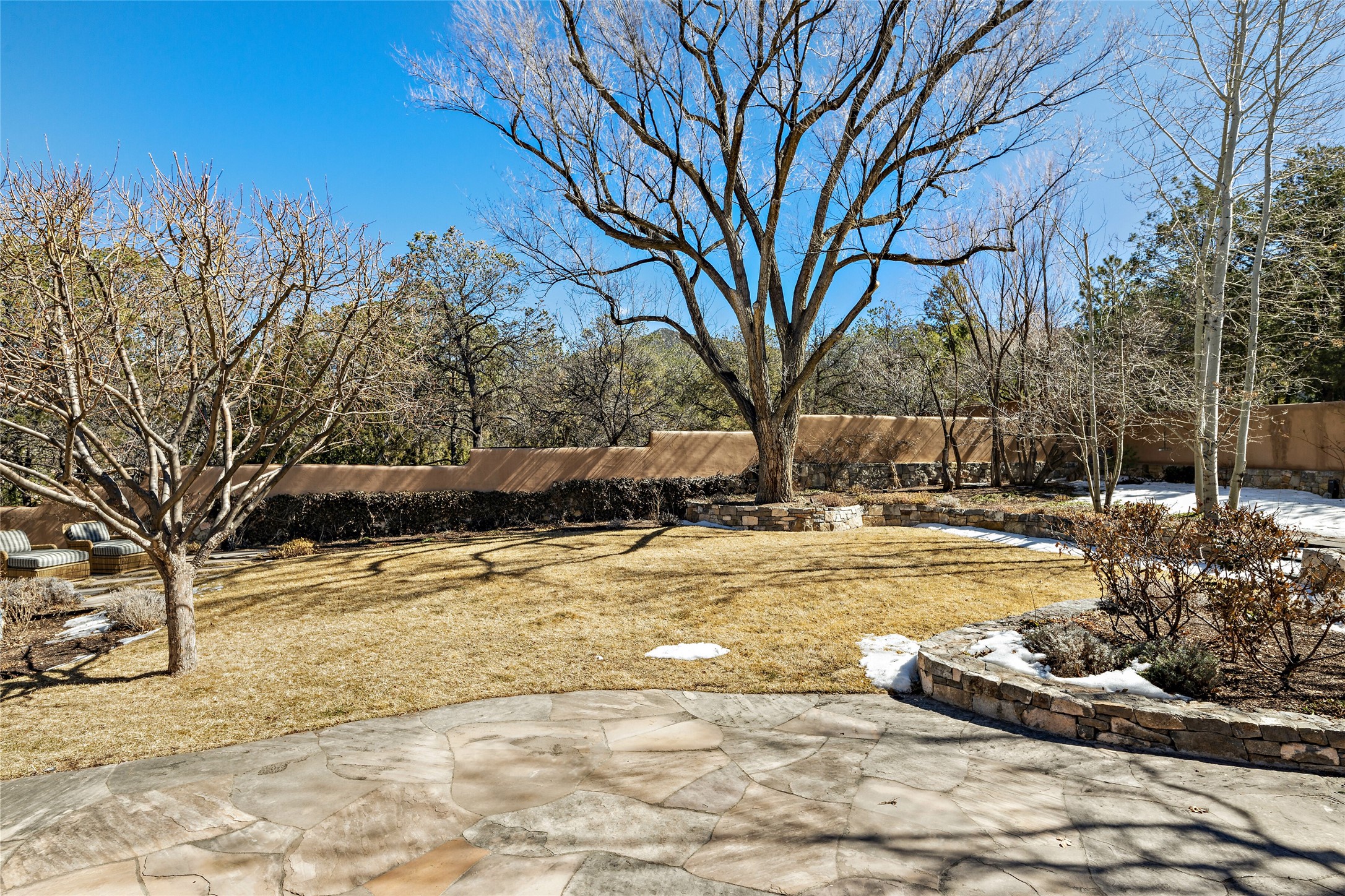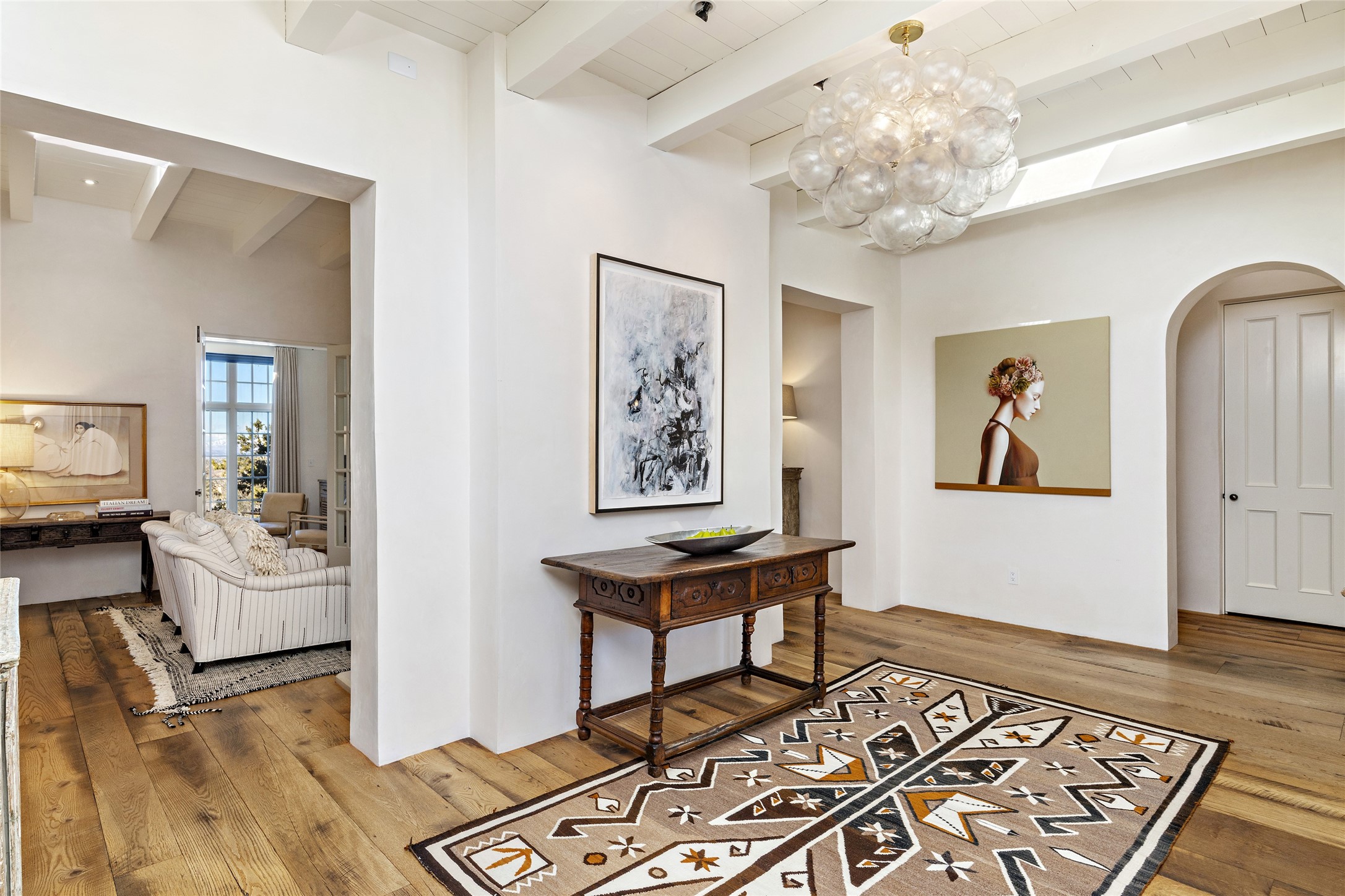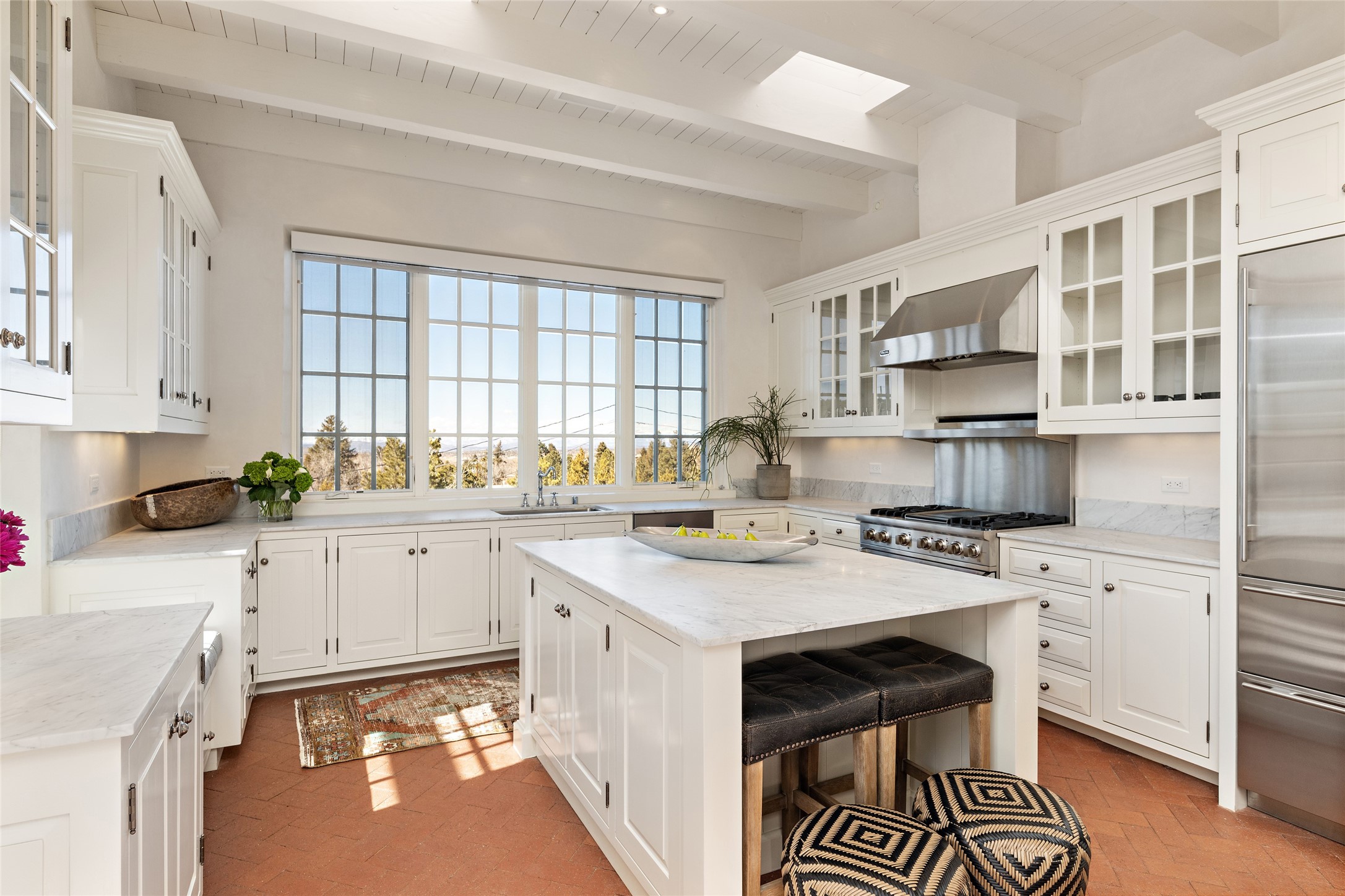 This elegant, hilltop estate, located on the Historic Eastside, offers glorious views of the Jemez and Sangre de Cristo mountains. The pueblo style home and guest house are appointed with territorial-style influences of clean lines, high ceilings, and classic features. The private, gated retreat provides a sophisticated, park-like environment to enjoy the understated beauty of quality luxury finishes throughout. The main residence offers an inviting living room with large cast stone fireplace and adjoining sitting room; and a well-appointed chef's kitchen with access to outside entertaining spaces, including a wood-burning kiva fireplace and grill. The romantic primary suite has a beautiful fireplace, two sets of French doors to a balcony to take in the beautiful surroundings, and a spa-inspired bath. Generously proportioned rooms feature diamond plaster walls and varying widths of handsome reclaimed oak plank floors. The guest house will delight with finishes consistent with the main residence: a cozy living area with fireplace, open to the beautiful chef's kitchen; its own primary and guest bedrooms; and lovely outdoor spaces to take in big views of the Jemez mountains and sunsets. The completely enclosed compound has mature gardens, gorgeous hardscape, Aspen groves, and numerous outside spaces to enjoy. This is an exceptional property in a premier location that includes a 3-car garage.