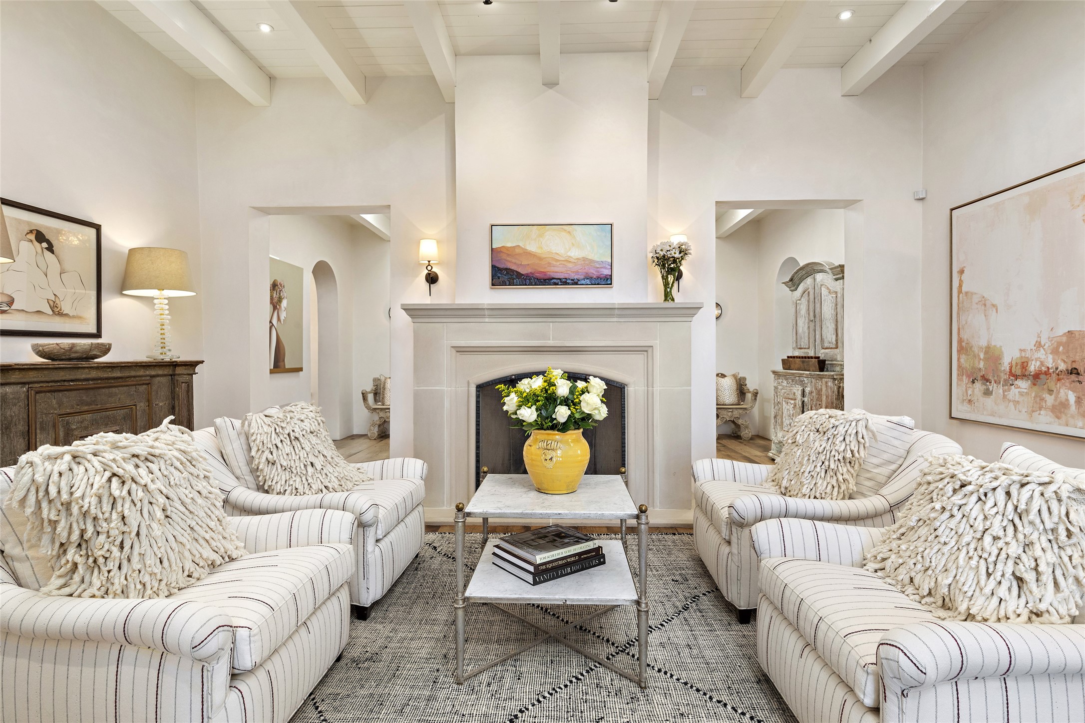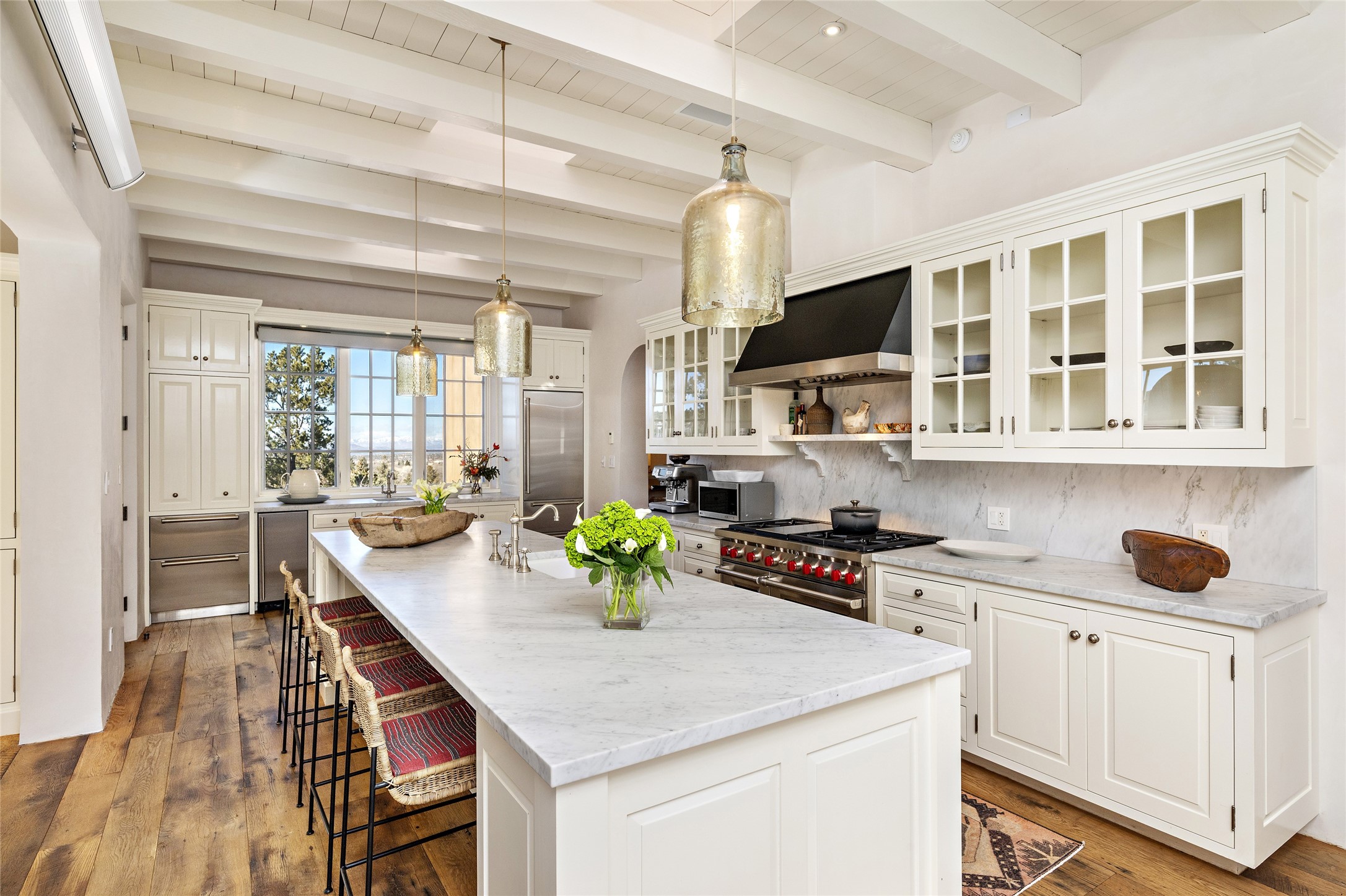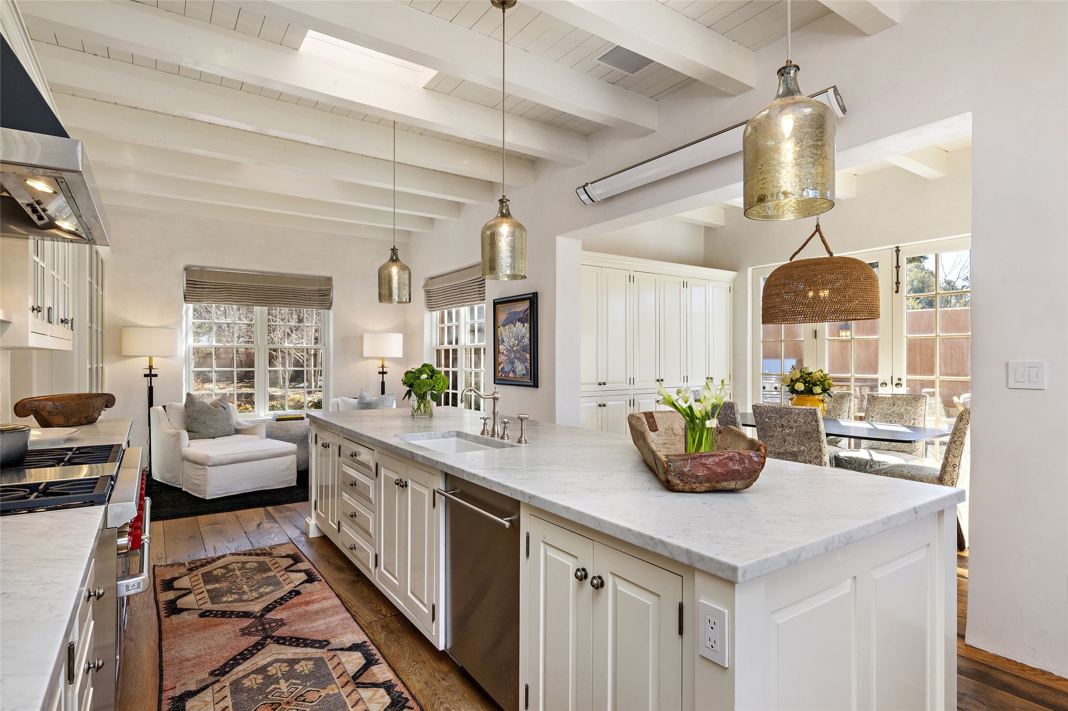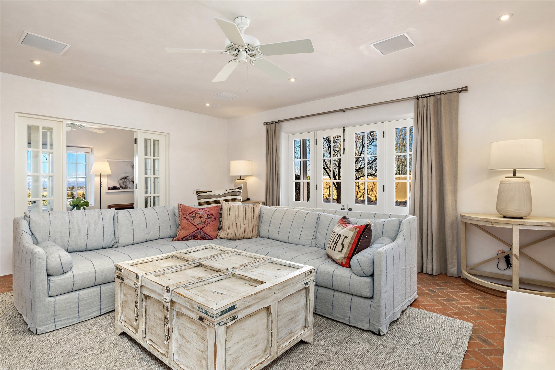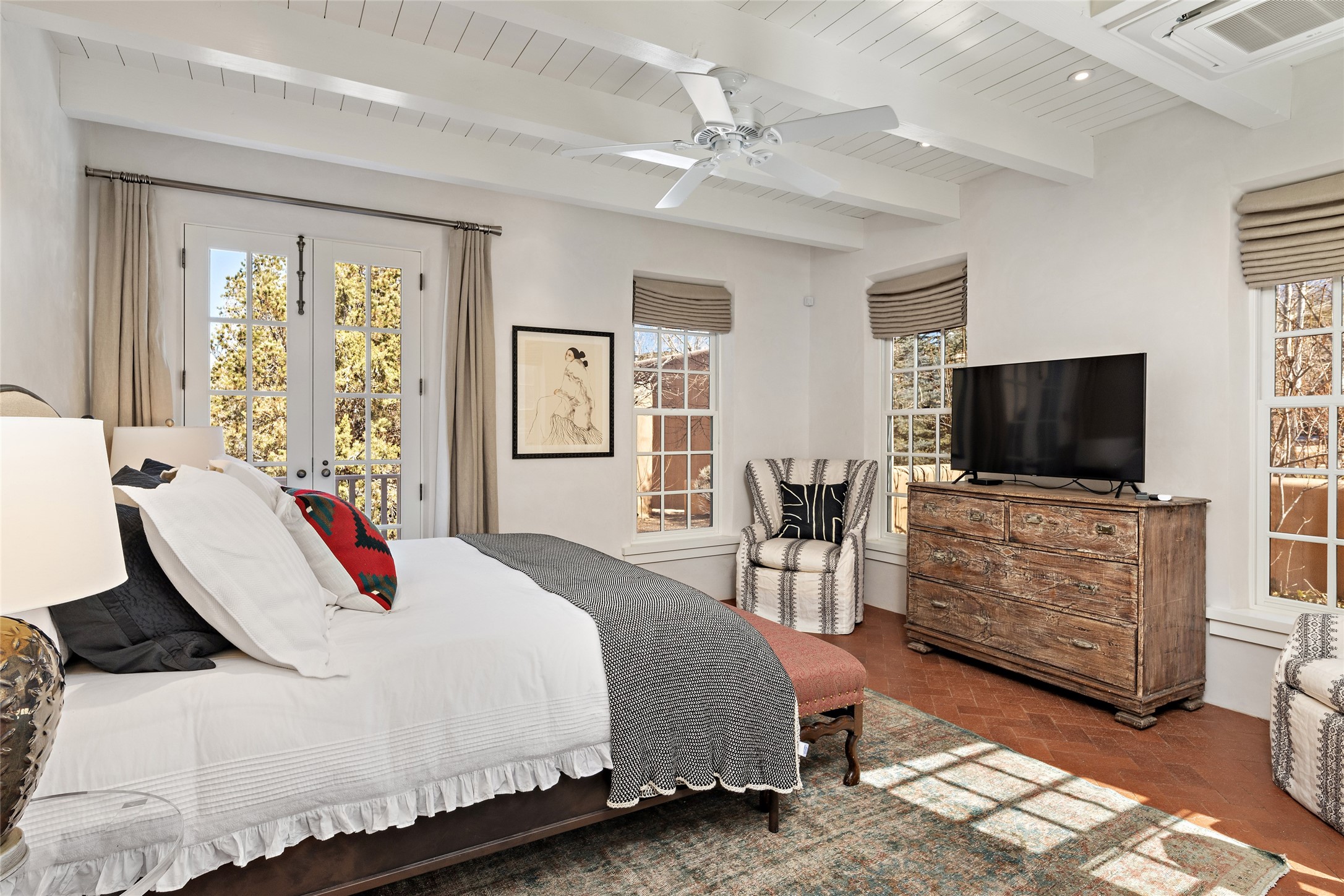 This elegant, hilltop estate, located on the Historic Eastside, offers glorious views of the Jemez and Sangre de Cristo mountains. The pueblo style home and guest house are appointed with territorial-style influences of clean lines, high ceilings, and classic features. The private, gated retreat provides a sophisticated, park-like environment to enjoy the understated beauty of quality luxury finishes throughout. The main residence offers an inviting living room with large cast stone fireplace and adjoining sitting room; and a well-appointed chef's kitchen with access to outside entertaining spaces, including a wood-burning kiva fireplace and grill. The romantic primary suite has a beautiful fireplace, two sets of French doors to a balcony to take in the beautiful surroundings, and a spa-inspired bath. Generously proportioned rooms feature diamond plaster walls and varying widths of handsome reclaimed oak plank floors. The guest house will delight with finishes consistent with the main residence: a cozy living area with fireplace, open to the beautiful chef's kitchen; its own primary and guest bedrooms; and lovely outdoor spaces to take in big views of the Jemez mountains and sunsets. The completely enclosed compound has mature gardens, gorgeous hardscape, Aspen groves, and numerous outside spaces to enjoy. This is an exceptional property in a premier location that includes a 3-car garage.
