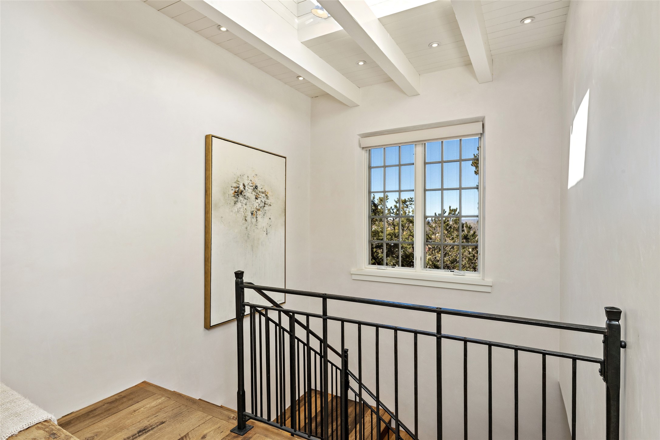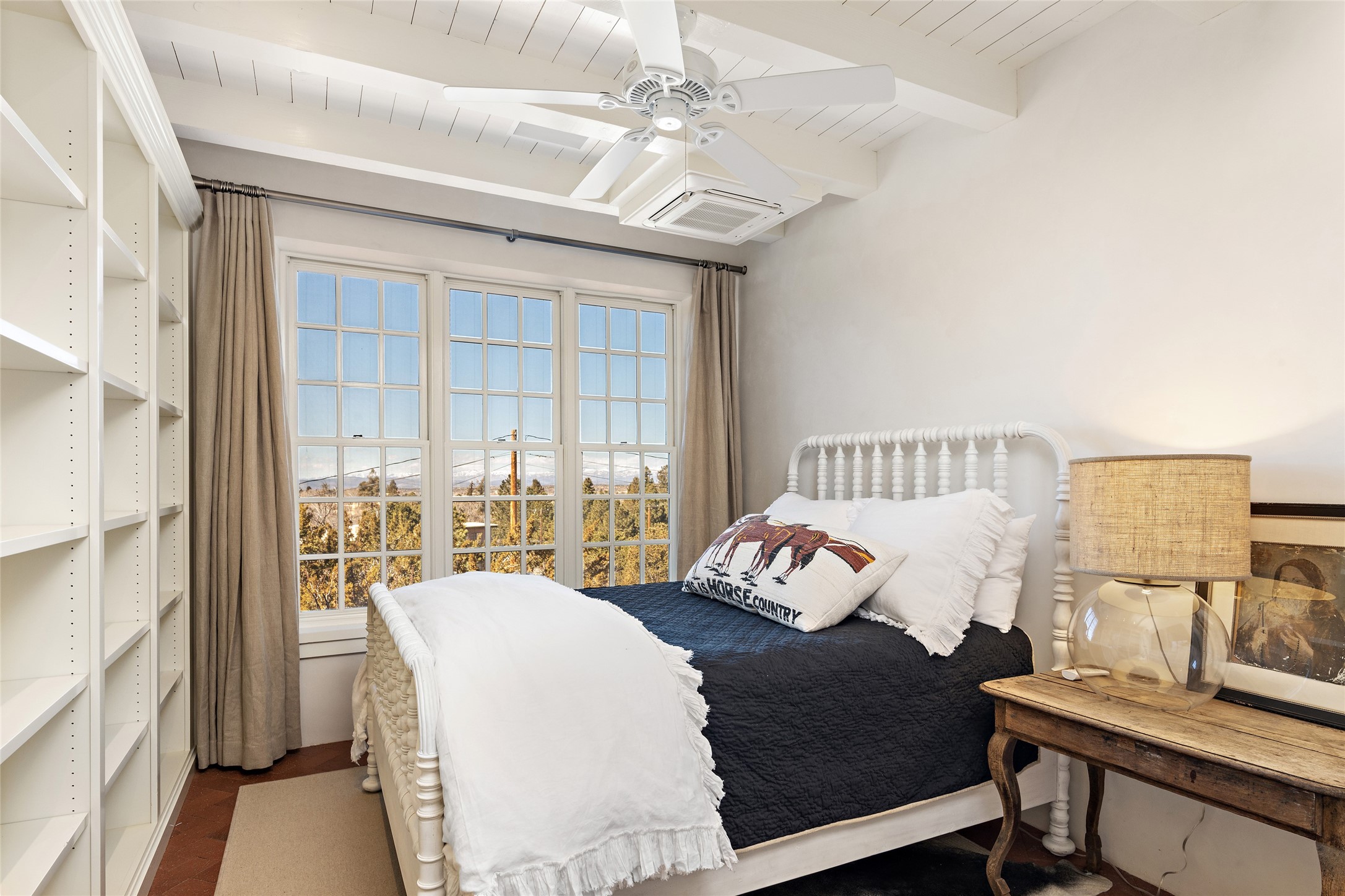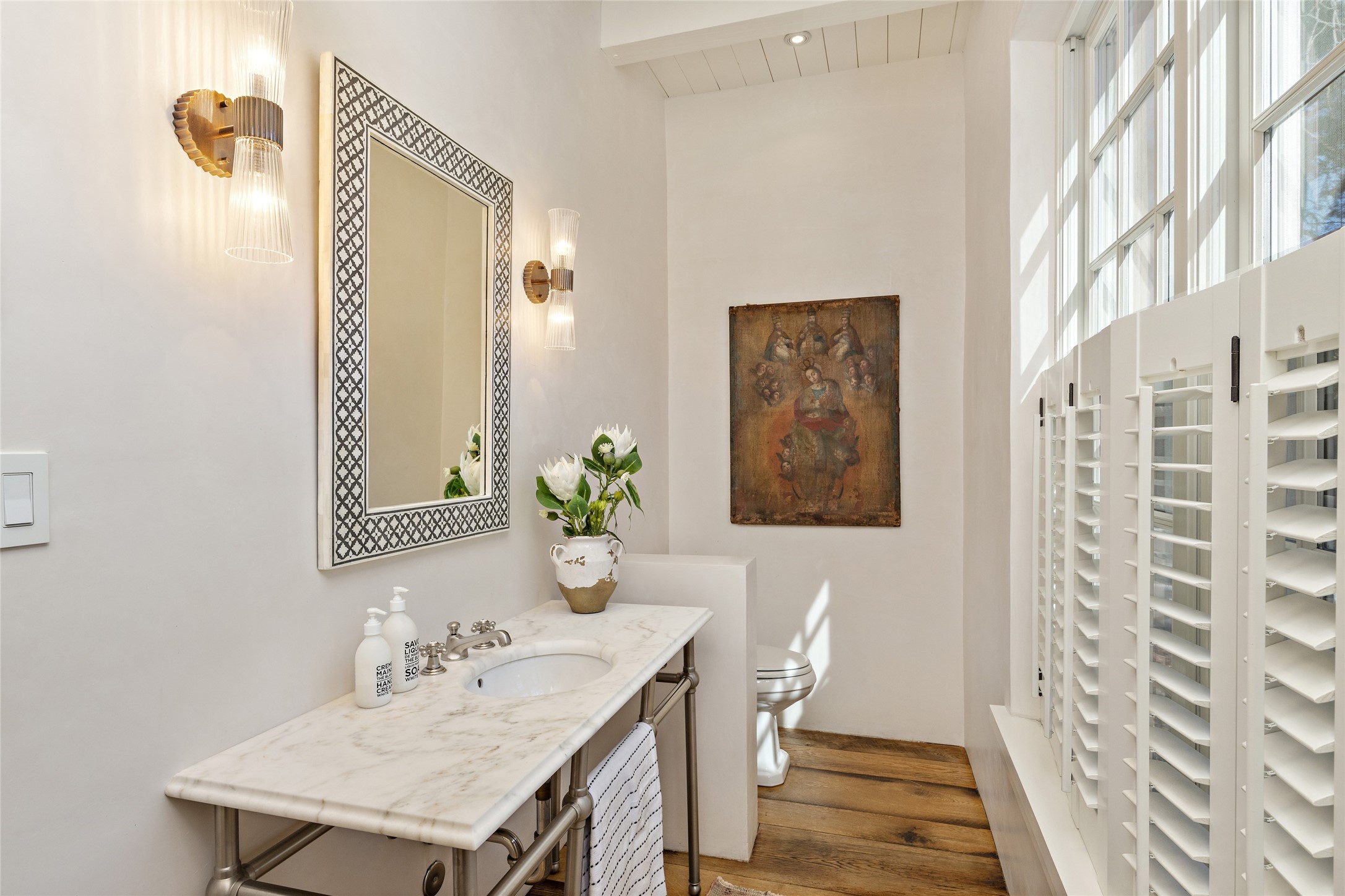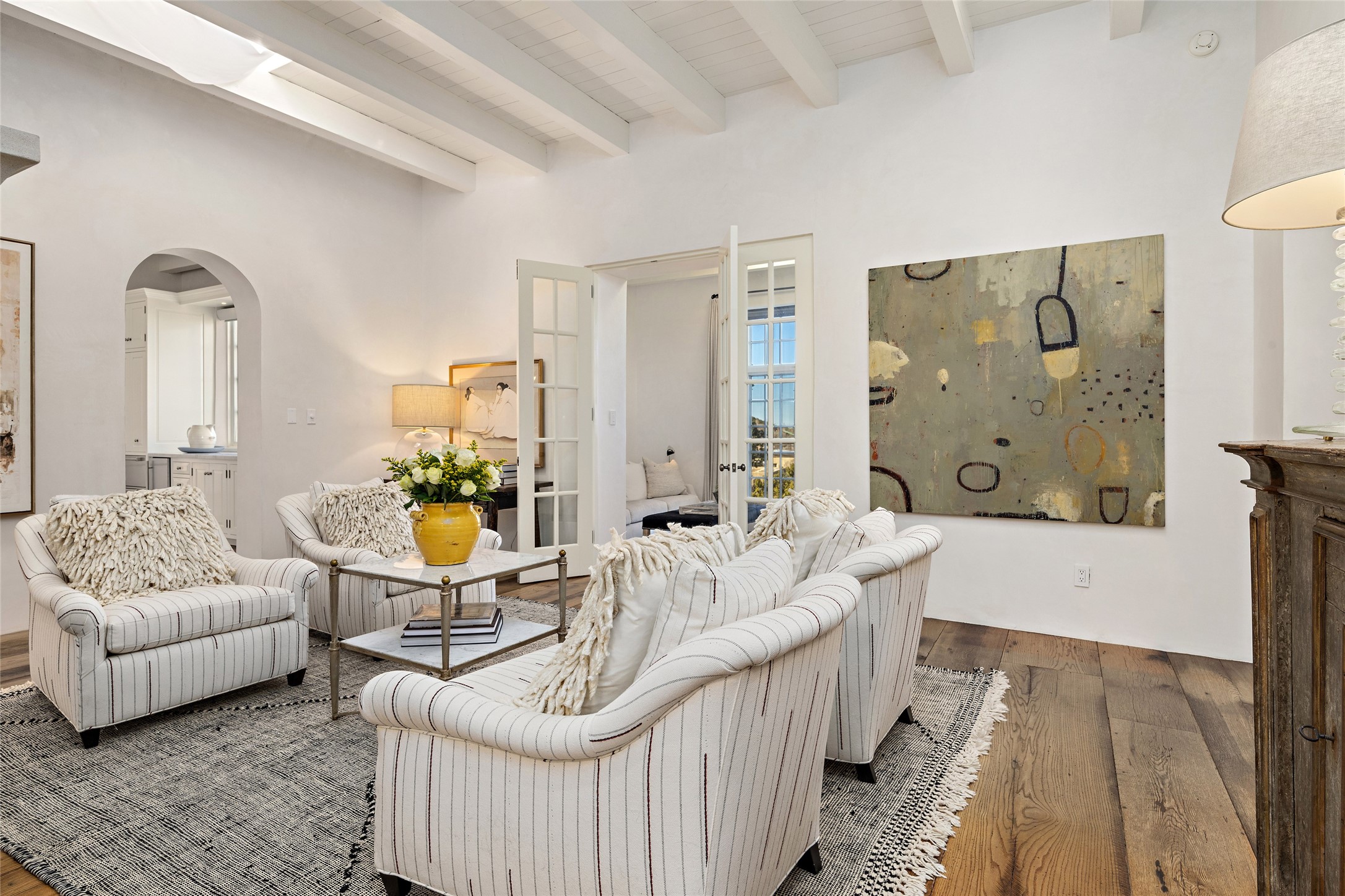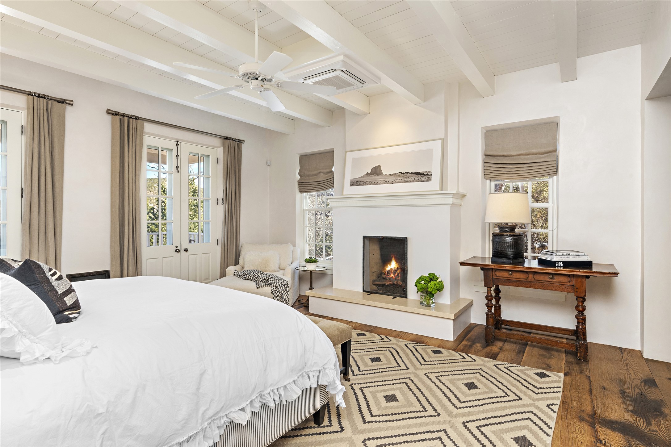 This elegant, hilltop estate, located on the Historic Eastside, offers glorious views of the Jemez and Sangre de Cristo mountains. The pueblo style home and guest house are appointed with territorial-style influences of clean lines, high ceilings, and classic features. The private, gated retreat provides a sophisticated, park-like environment to enjoy the understated beauty of quality luxury finishes throughout. The main residence offers an inviting living room with large cast stone fireplace and adjoining sitting room; and a well-appointed chef's kitchen with access to outside entertaining spaces, including a wood-burning kiva fireplace and grill. The romantic primary suite has a beautiful fireplace, two sets of French doors to a balcony to take in the beautiful surroundings, and a spa-inspired bath. Generously proportioned rooms feature diamond plaster walls and varying widths of handsome reclaimed oak plank floors. The guest house will delight with finishes consistent with the main residence: a cozy living area with fireplace, open to the beautiful chef's kitchen; its own primary and guest bedrooms; and lovely outdoor spaces to take in big views of the Jemez mountains and sunsets. The completely enclosed compound has mature gardens, gorgeous hardscape, Aspen groves, and numerous outside spaces to enjoy. This is an exceptional property in a premier location that includes a 3-car garage.