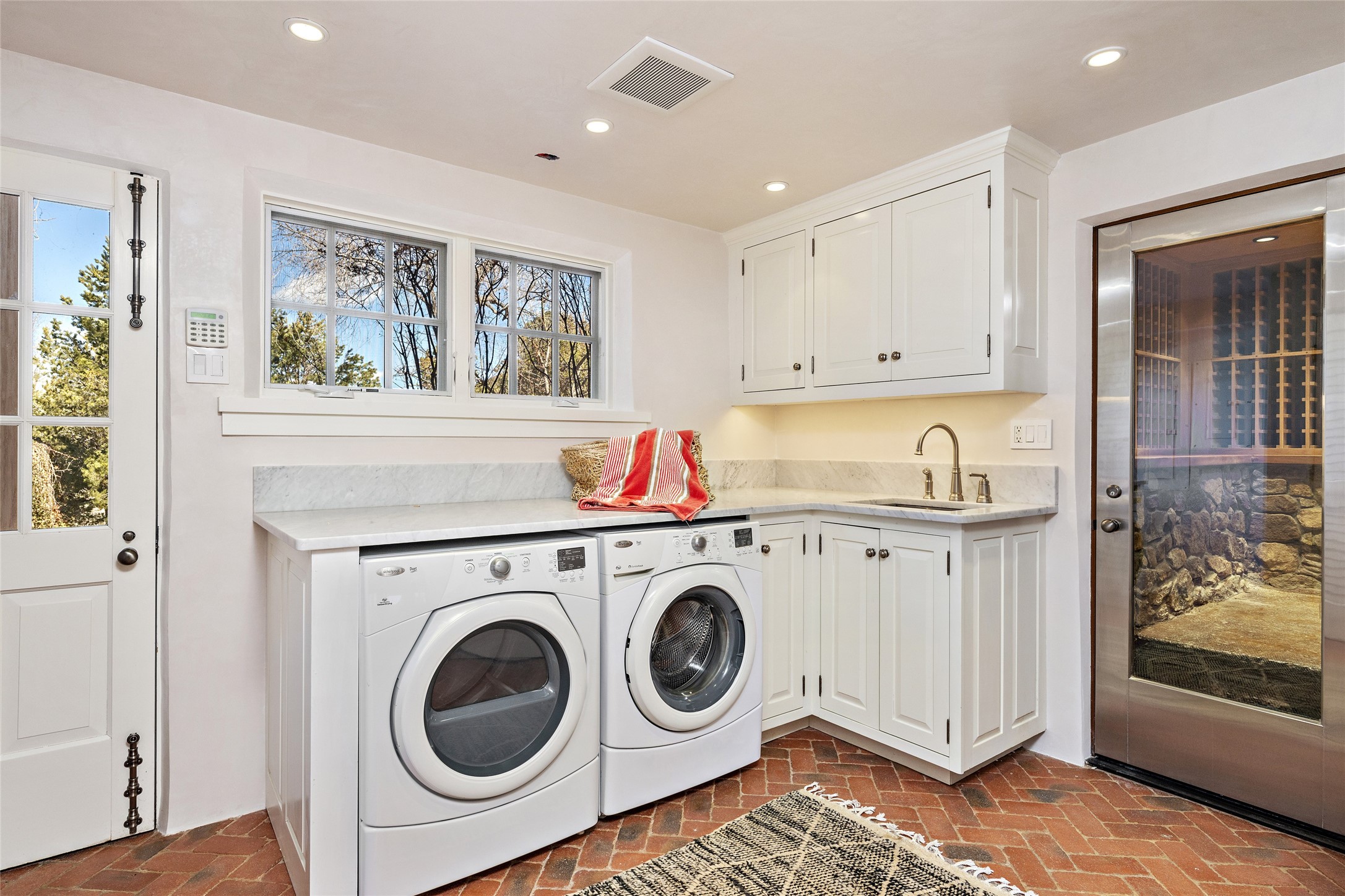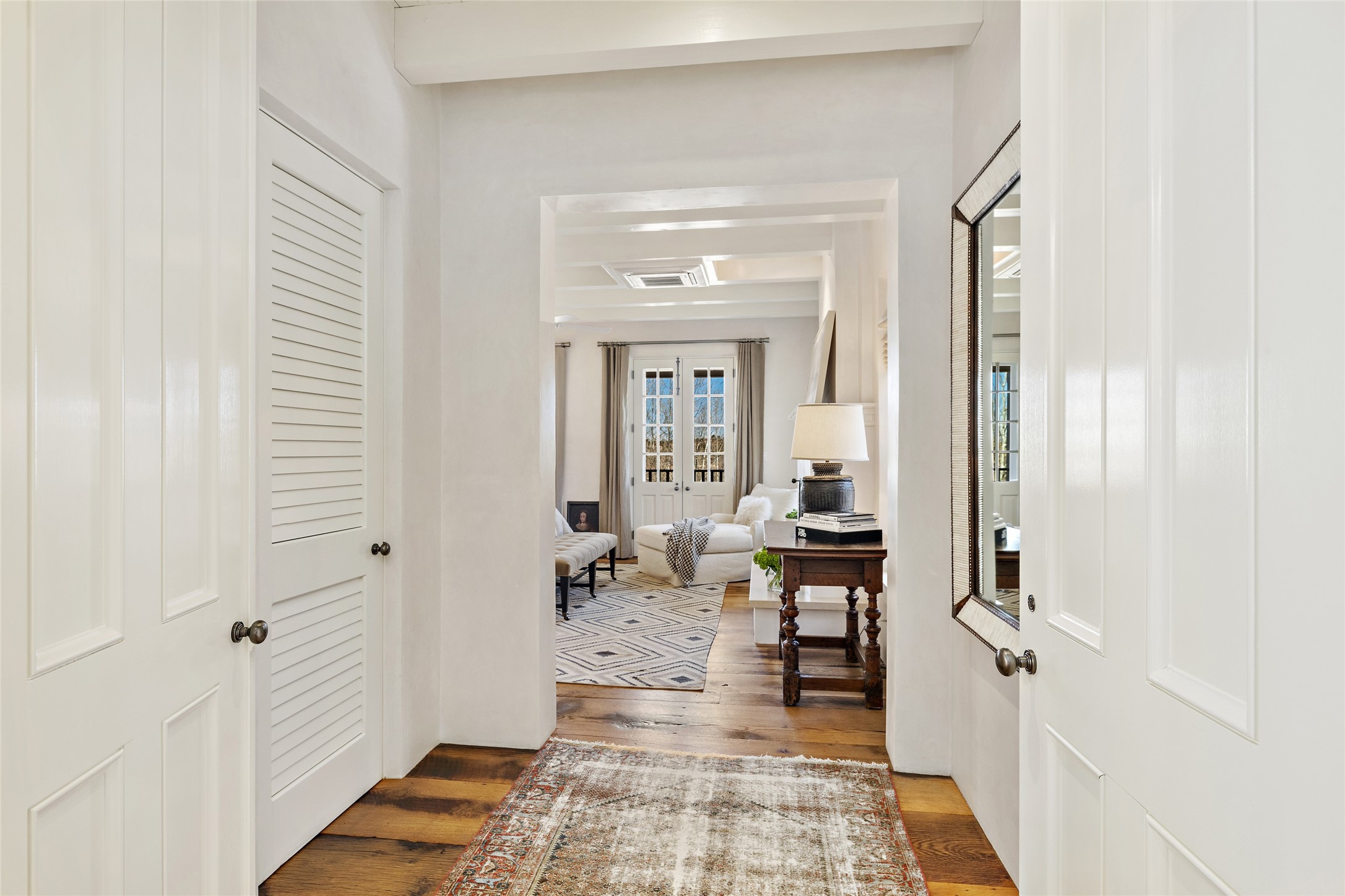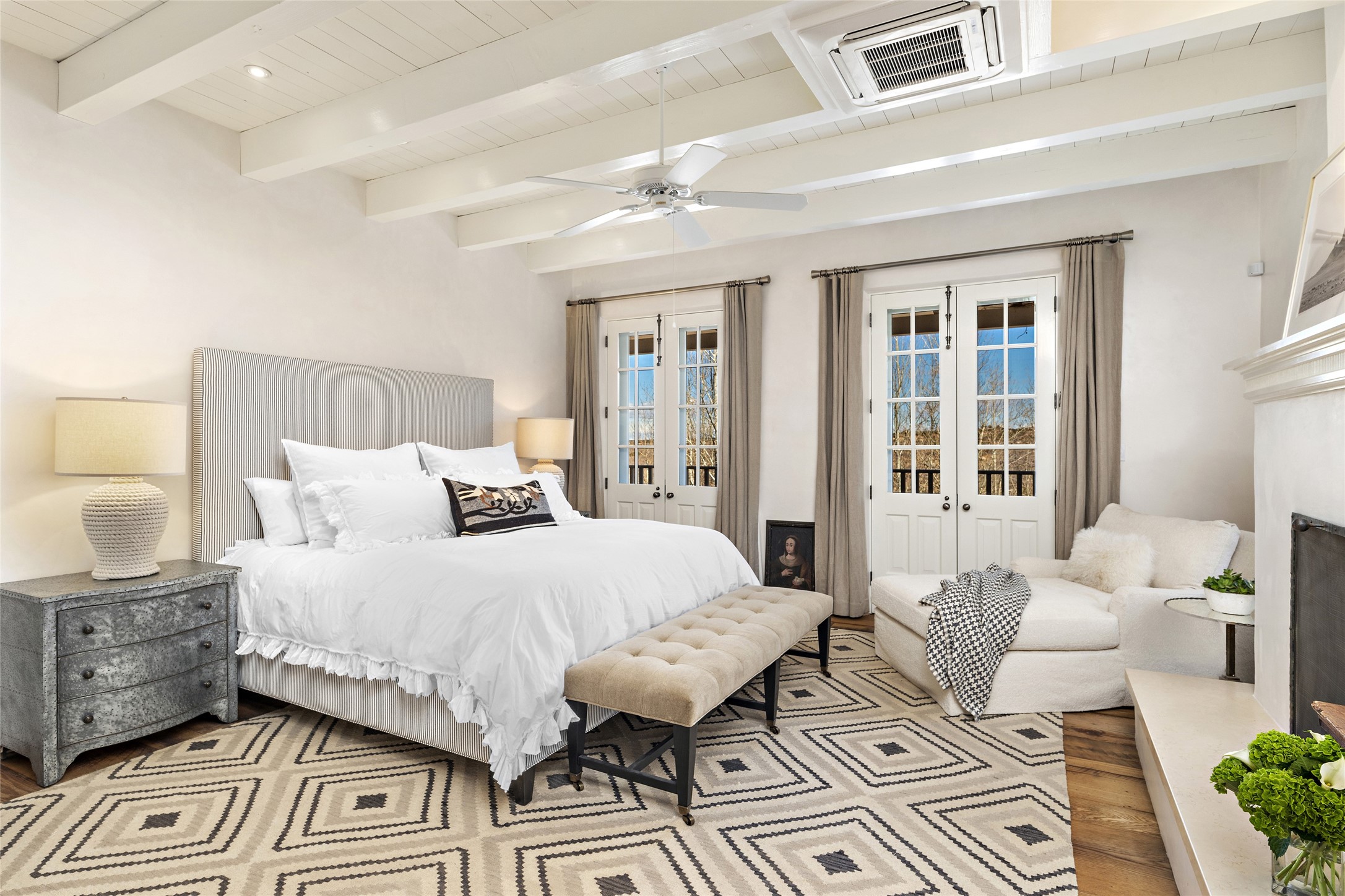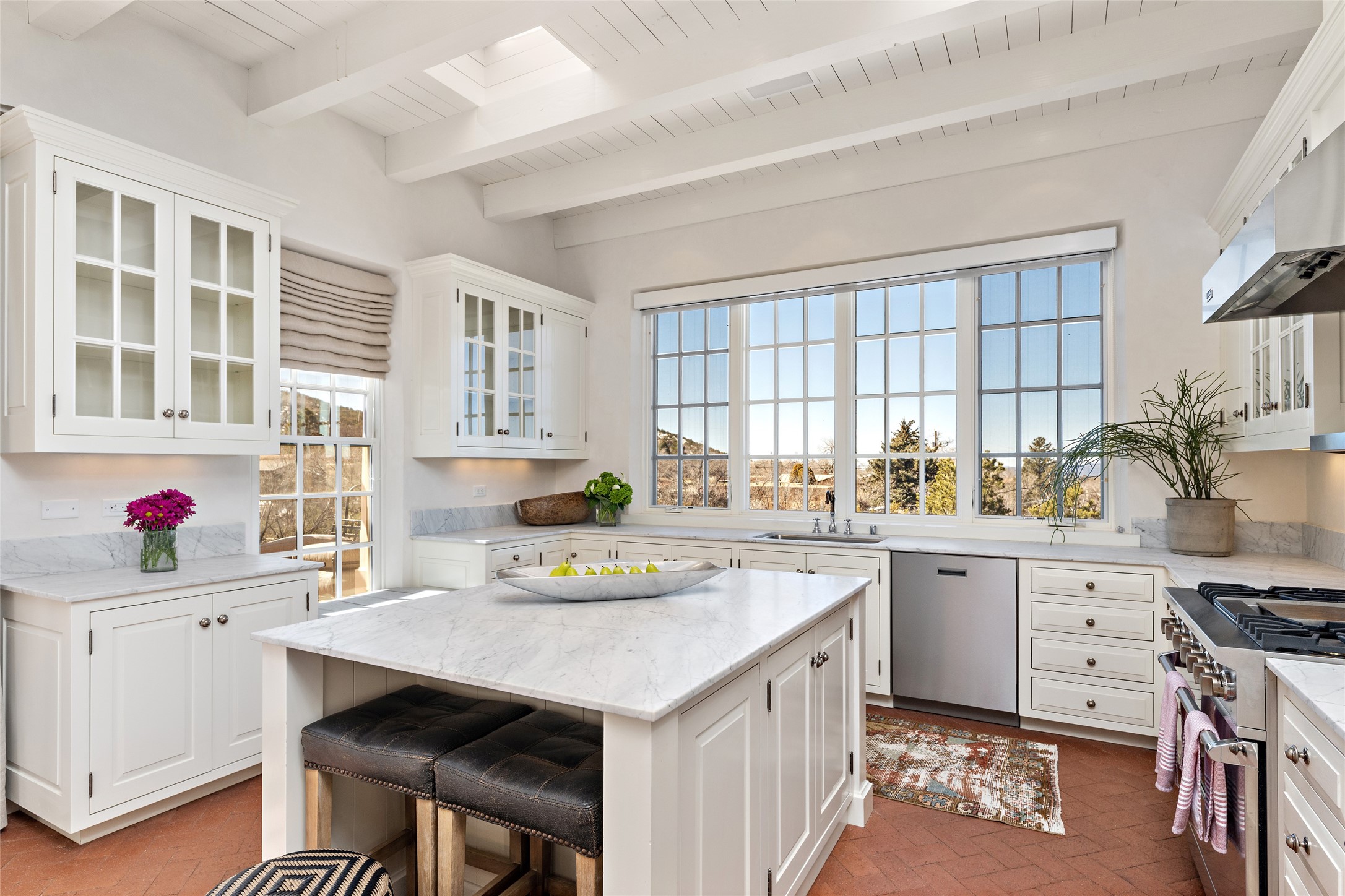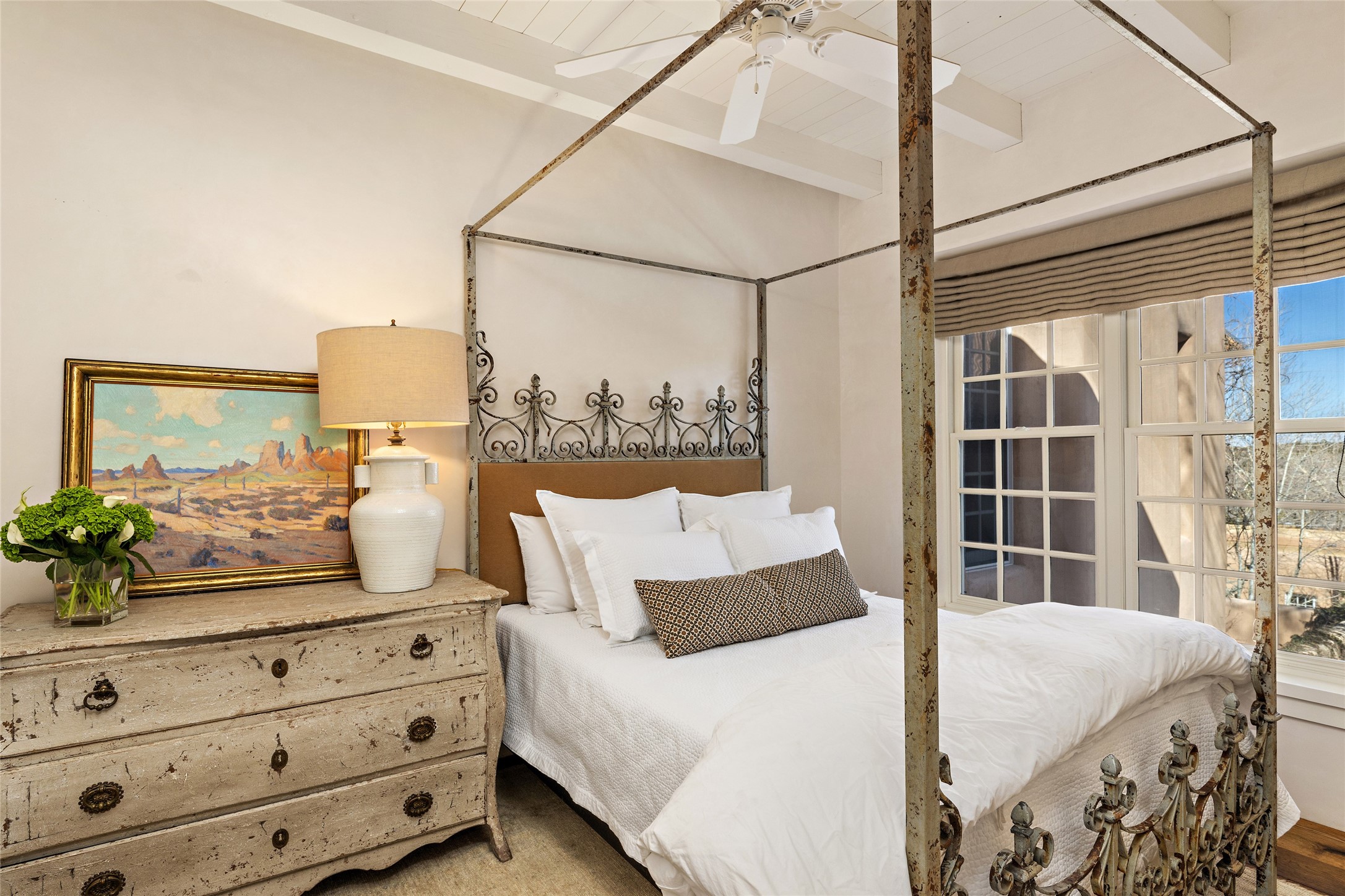 This elegant, hilltop estate, located on the Historic Eastside, offers glorious views of the Jemez and Sangre de Cristo mountains. The pueblo style home and guest house are appointed with territorial-style influences of clean lines, high ceilings, and classic features. The private, gated retreat provides a sophisticated, park-like environment to enjoy the understated beauty of quality luxury finishes throughout. The main residence offers an inviting living room with large cast stone fireplace and adjoining sitting room; and a well-appointed chef's kitchen with access to outside entertaining spaces, including a wood-burning kiva fireplace and grill. The romantic primary suite has a beautiful fireplace, two sets of French doors to a balcony to take in the beautiful surroundings, and a spa-inspired bath. Generously proportioned rooms feature diamond plaster walls and varying widths of handsome reclaimed oak plank floors. The guest house will delight with finishes consistent with the main residence: a cozy living area with fireplace, open to the beautiful chef's kitchen; its own primary and guest bedrooms; and lovely outdoor spaces to take in big views of the Jemez mountains and sunsets. The completely enclosed compound has mature gardens, gorgeous hardscape, Aspen groves, and numerous outside spaces to enjoy. This is an exceptional property in a premier location that includes a 3-car garage.