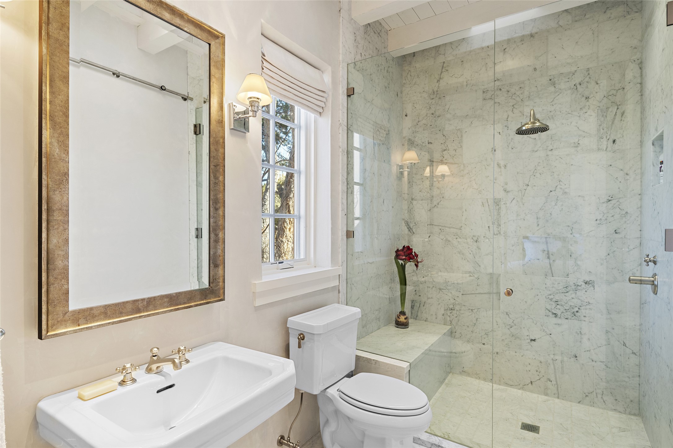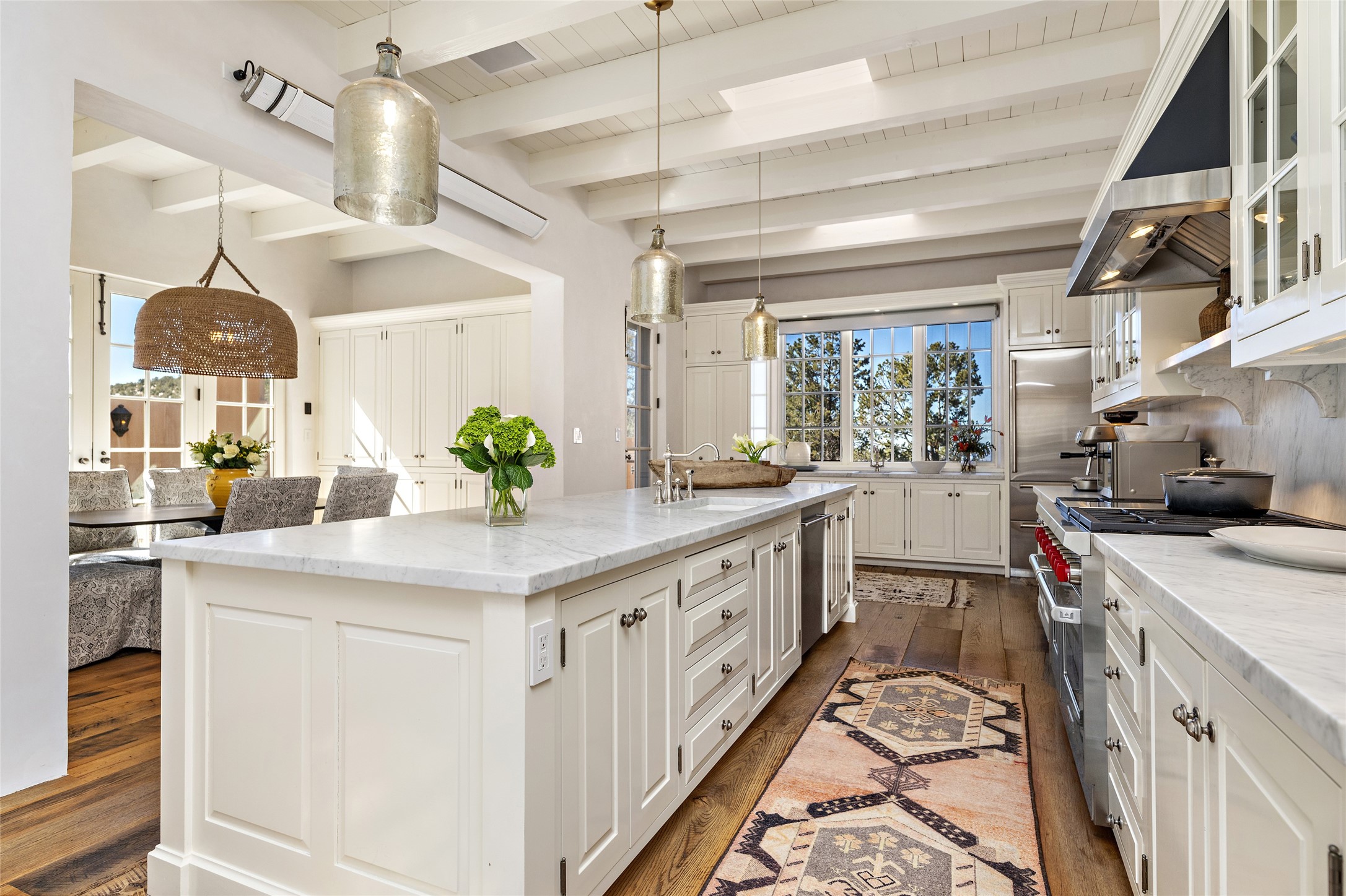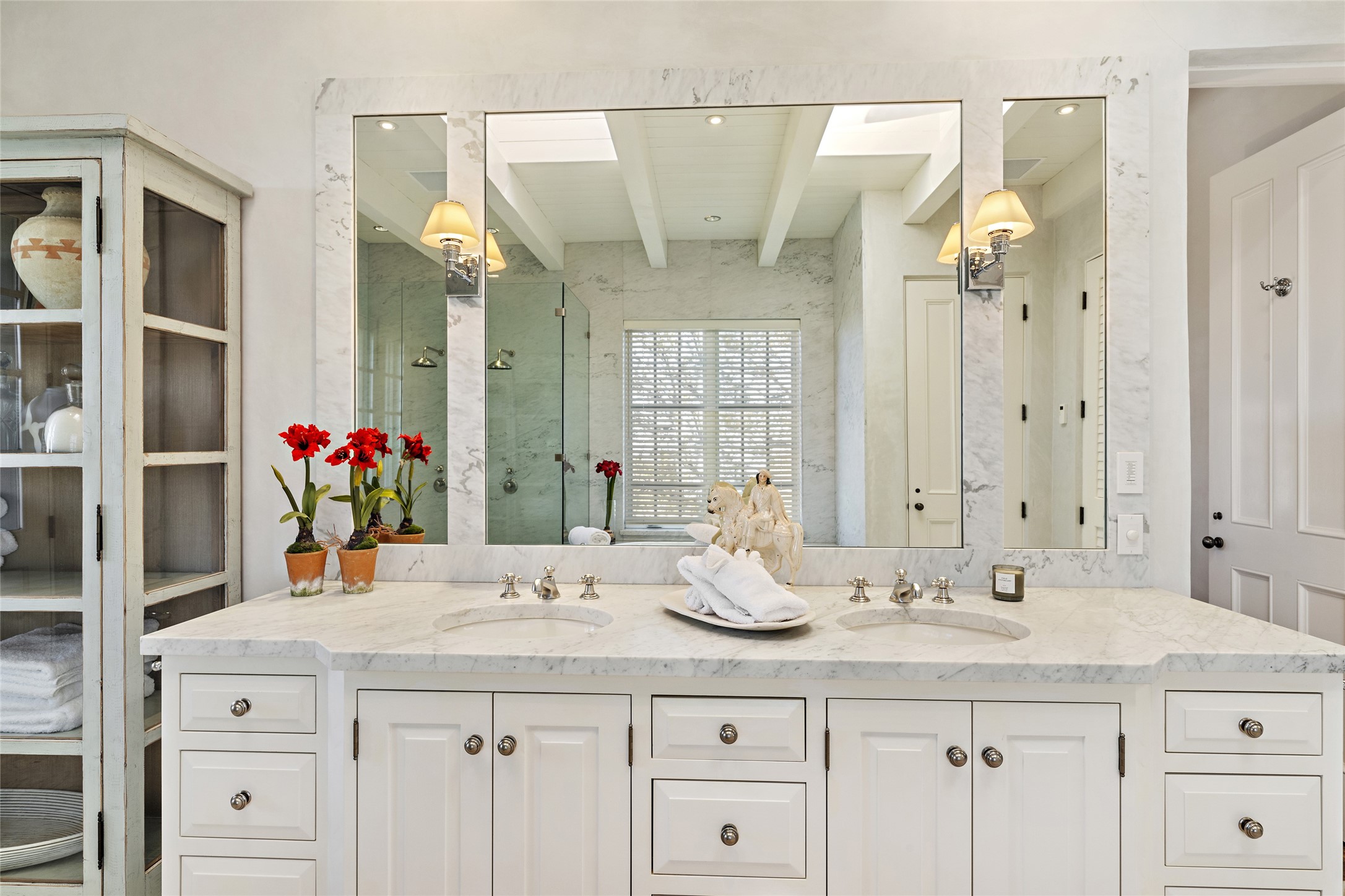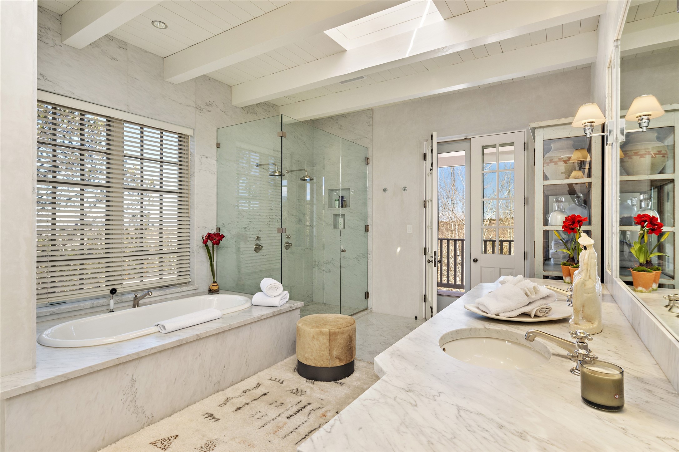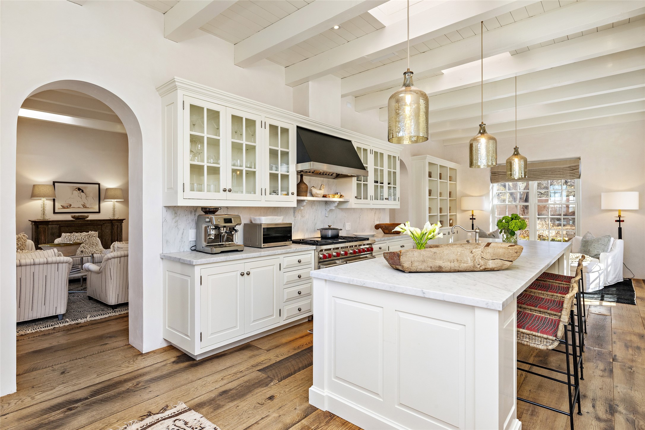 This elegant, hilltop estate, located on the Historic Eastside, offers glorious views of the Jemez and Sangre de Cristo mountains. The pueblo style home and guest house are appointed with territorial-style influences of clean lines, high ceilings, and classic features. The private, gated retreat provides a sophisticated, park-like environment to enjoy the understated beauty of quality luxury finishes throughout. The main residence offers an inviting living room with large cast stone fireplace and adjoining sitting room; and a well-appointed chef's kitchen with access to outside entertaining spaces, including a wood-burning kiva fireplace and grill. The romantic primary suite has a beautiful fireplace, two sets of French doors to a balcony to take in the beautiful surroundings, and a spa-inspired bath. Generously proportioned rooms feature diamond plaster walls and varying widths of handsome reclaimed oak plank floors. The guest house will delight with finishes consistent with the main residence: a cozy living area with fireplace, open to the beautiful chef's kitchen; its own primary and guest bedrooms; and lovely outdoor spaces to take in big views of the Jemez mountains and sunsets. The completely enclosed compound has mature gardens, gorgeous hardscape, Aspen groves, and numerous outside spaces to enjoy. This is an exceptional property in a premier location that includes a 3-car garage.