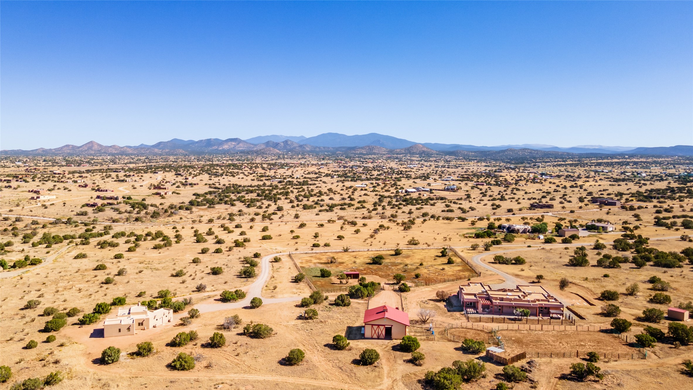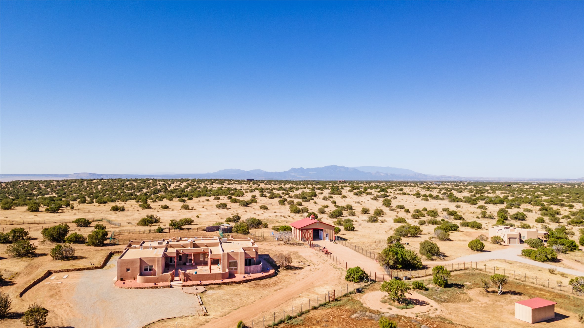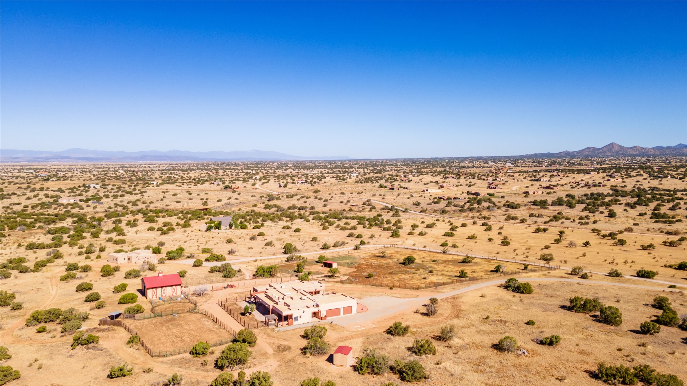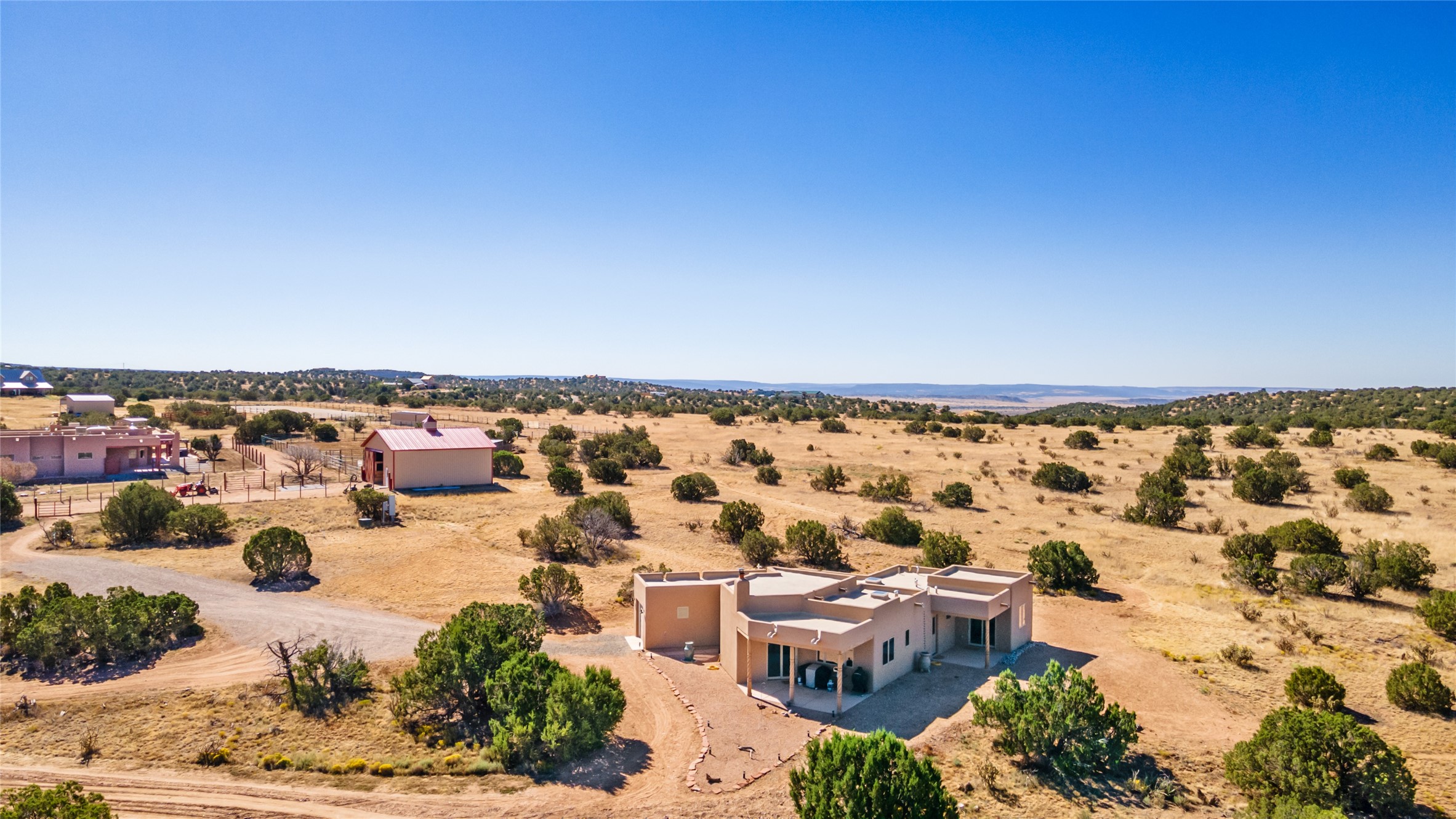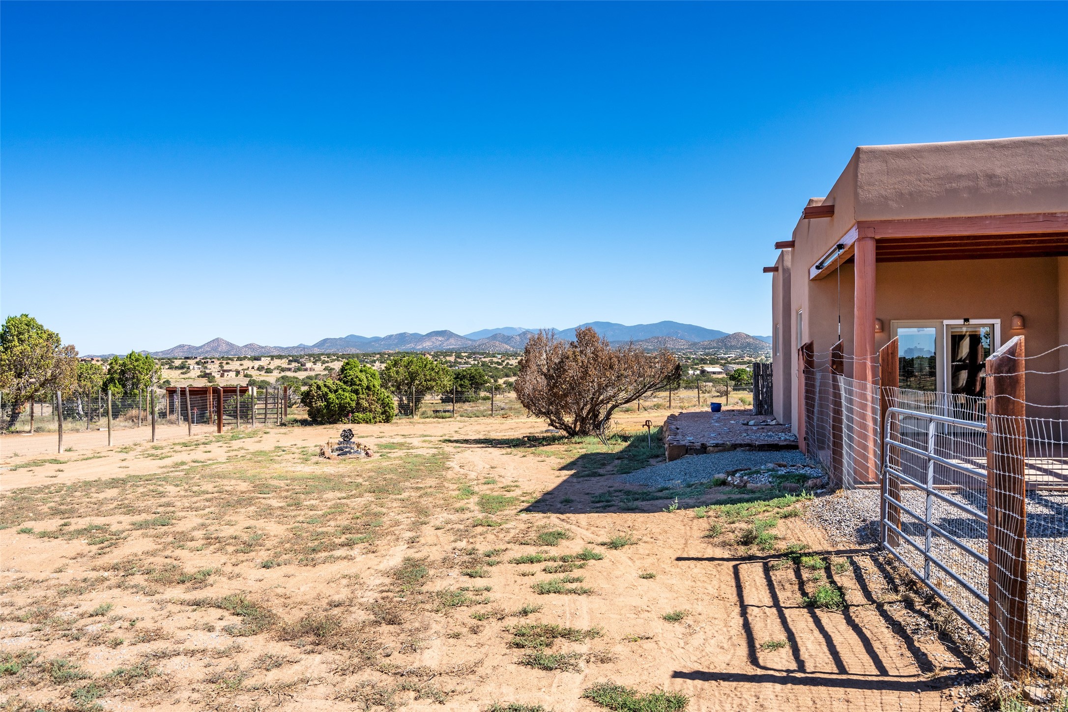 15 Silver Saddle is a 3 BRM/ 3.5 BATH main home with diamond plaster walls, polished concrete floors and wood beam high- ceilings throughout. The master suite is located on the western side of the house apart from the two additional en-suite guest bedrooms-- all with outdoor access. The master suite is well-appointed with a walk-in closet, a master bath with his and her sinks and water closets- along with a walk-in steam shower and soaking tub. Outdoor access from the master suite leads to a private outdoor area with a jacuzzi. However, it is the open concept cook's kitchen and adjacent entertaining room with a built-in wood bar that are the home's showstoppers. The almost 17-acre property also boasts a newly built (2017) two-bedroom 1,400 square foot guest house with high-end finishes and appliances throughout. Approx. 15 minutes to Santa Fe and conveniently located 5 minutes from the shopping area at Eldorado Santa Fe. For horse lovers the property has a Cleary barn, 3 horse stalls, an insulated tack room, an arena, a turnout and pasture. As an added bonus, there is direct access to Galisteo Basin Trails.