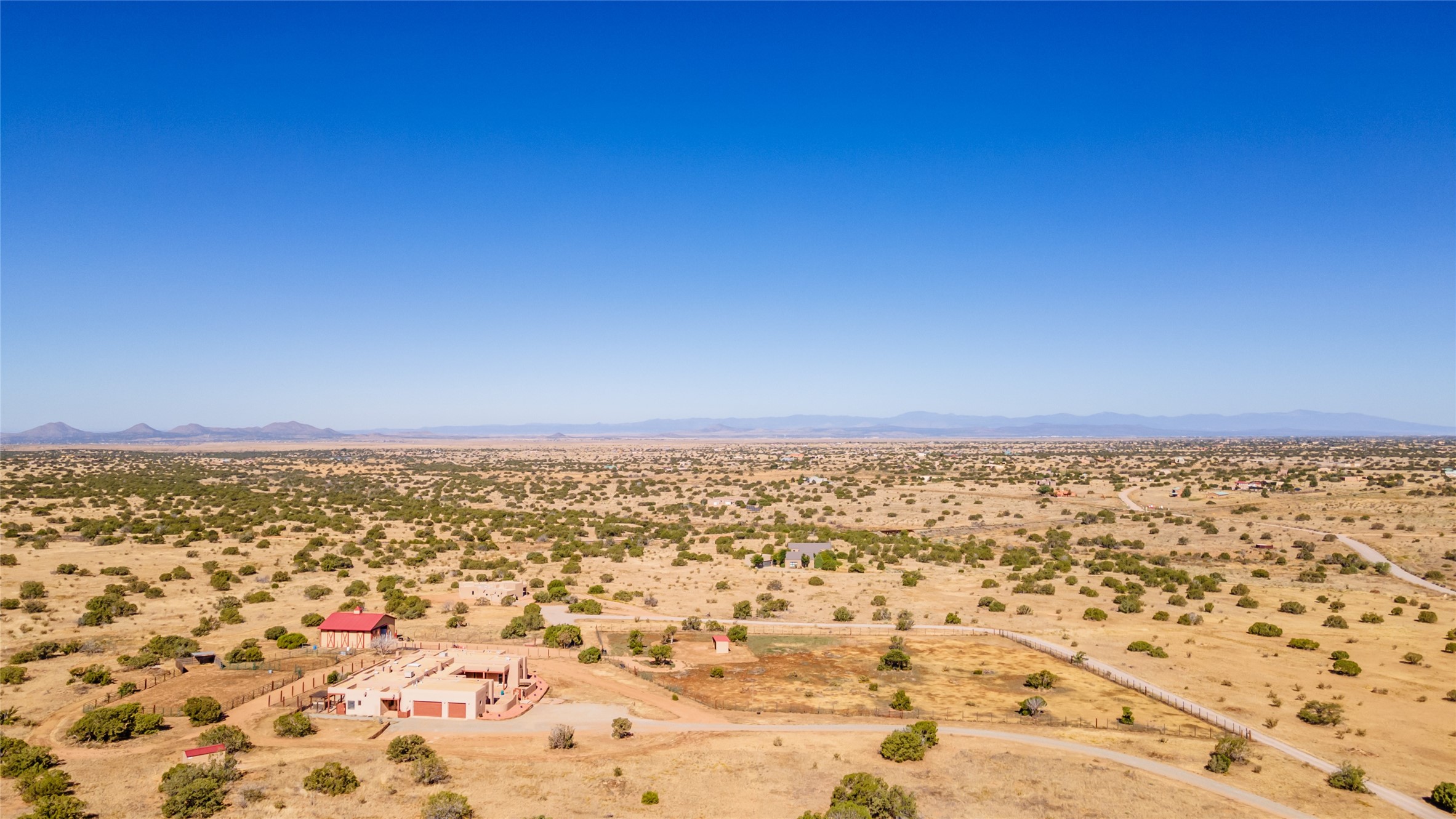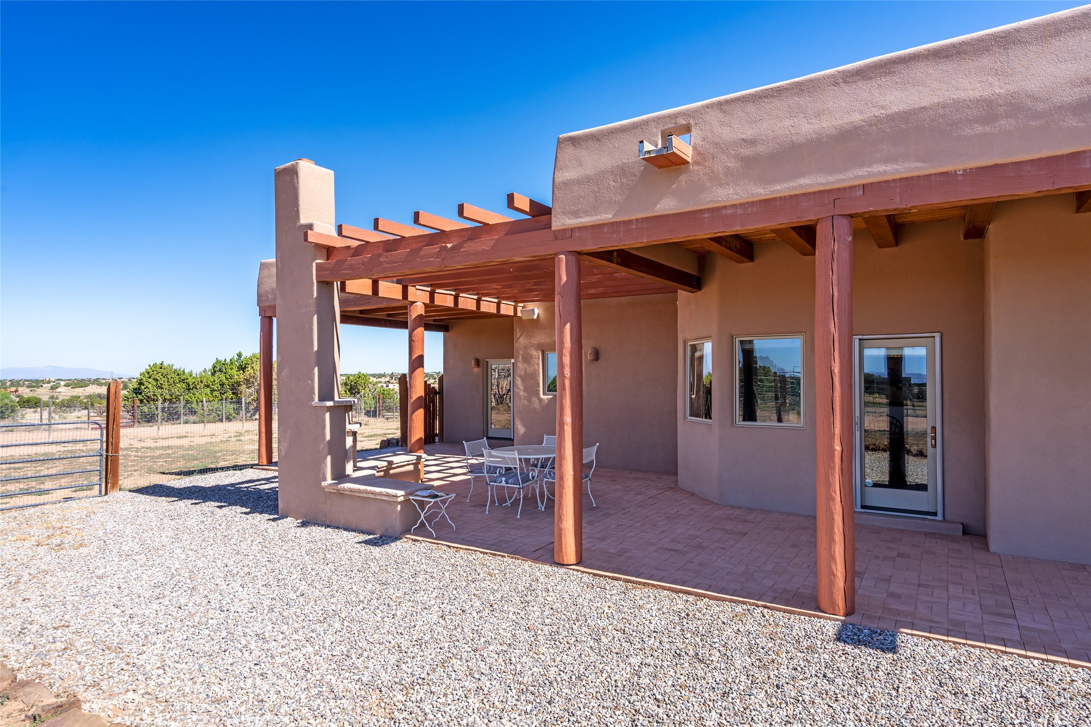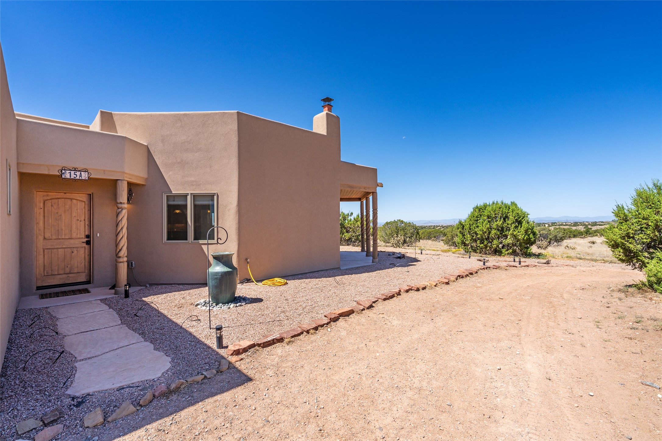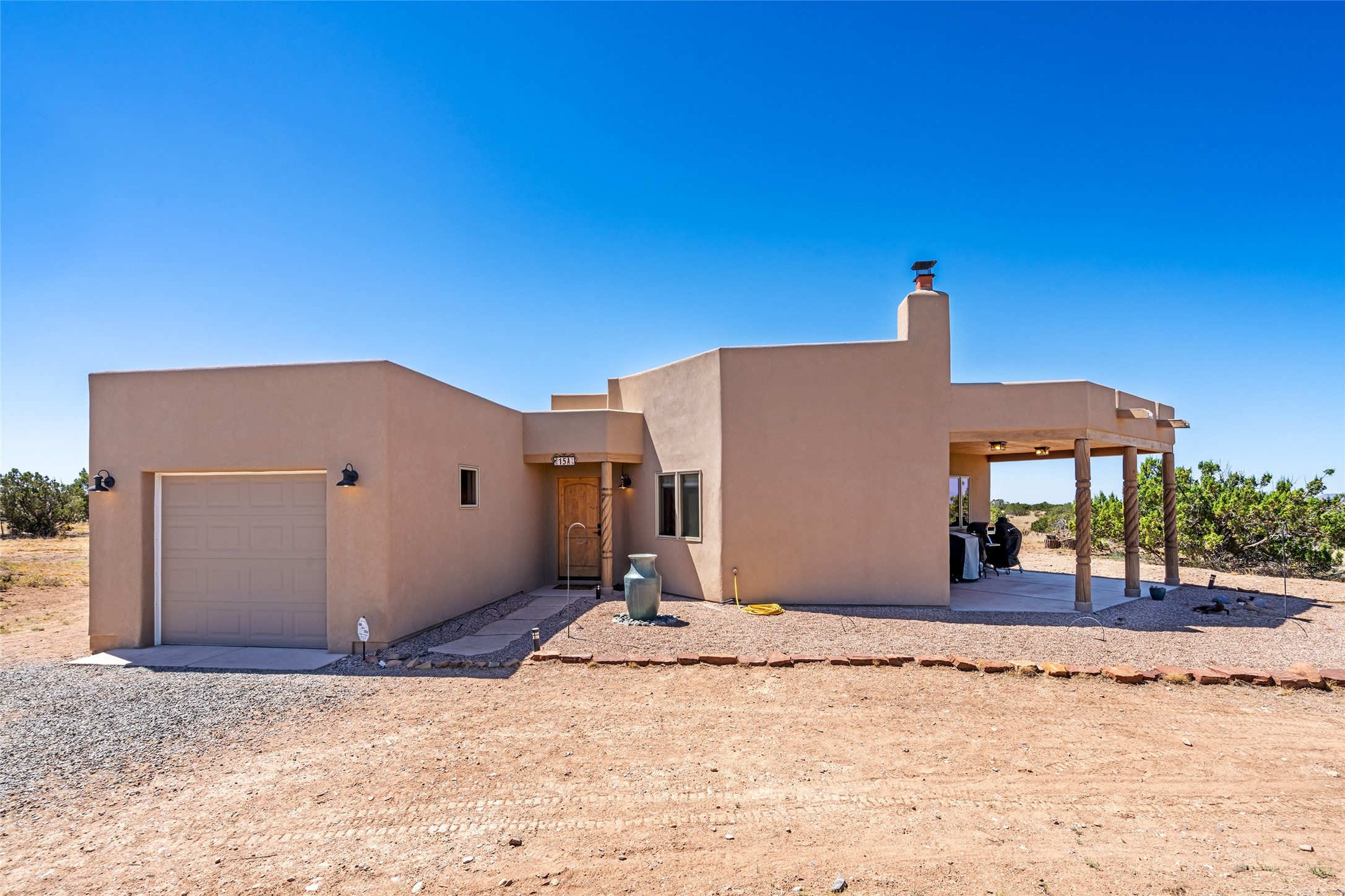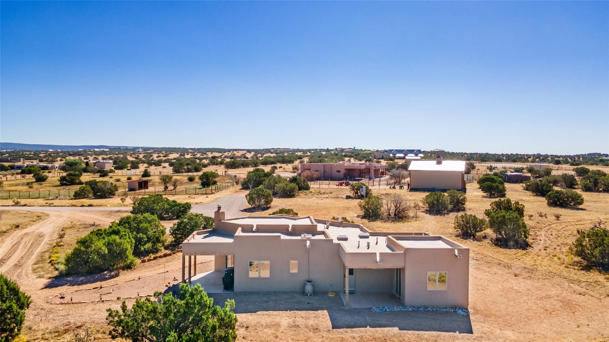 15 Silver Saddle is a 3 BRM/ 3.5 BATH main home with diamond plaster walls, polished concrete floors and wood beam high- ceilings throughout. The master suite is located on the western side of the house apart from the two additional en-suite guest bedrooms-- all with outdoor access. The master suite is well-appointed with a walk-in closet, a master bath with his and her sinks and water closets- along with a walk-in steam shower and soaking tub. Outdoor access from the master suite leads to a private outdoor area with a jacuzzi. However, it is the open concept cook's kitchen and adjacent entertaining room with a built-in wood bar that are the home's showstoppers. The almost 17-acre property also boasts a newly built (2017) two-bedroom 1,400 square foot guest house with high-end finishes and appliances throughout. Approx. 15 minutes to Santa Fe and conveniently located 5 minutes from the shopping area at Eldorado Santa Fe. For horse lovers the property has a Cleary barn, 3 horse stalls, an insulated tack room, an arena, a turnout and pasture. As an added bonus, there is direct access to Galisteo Basin Trails.