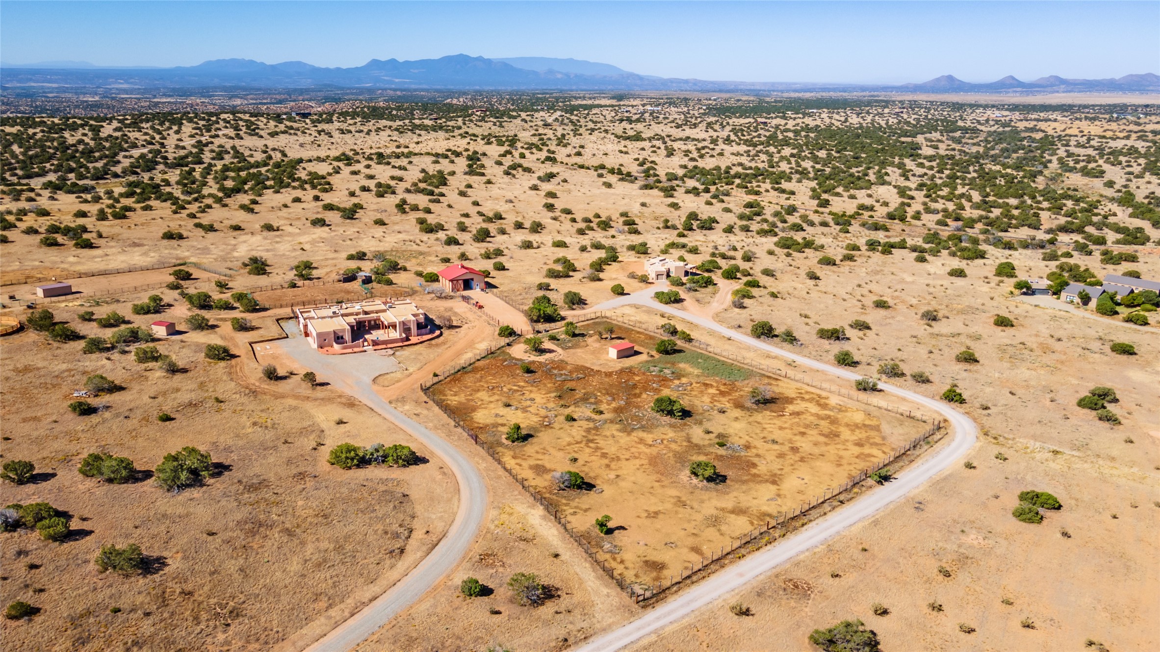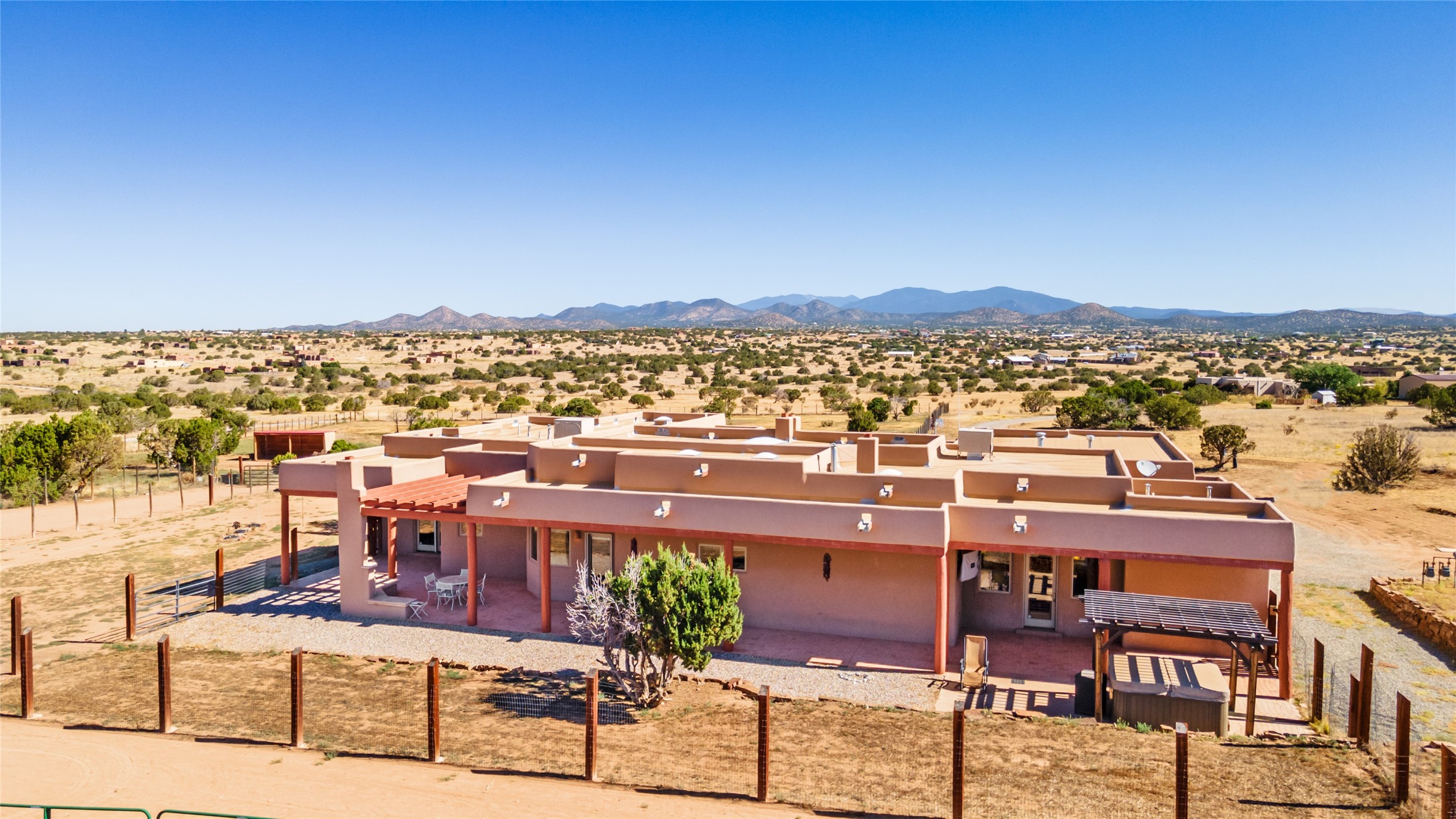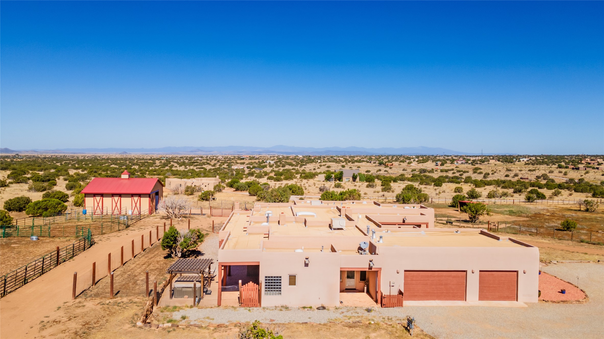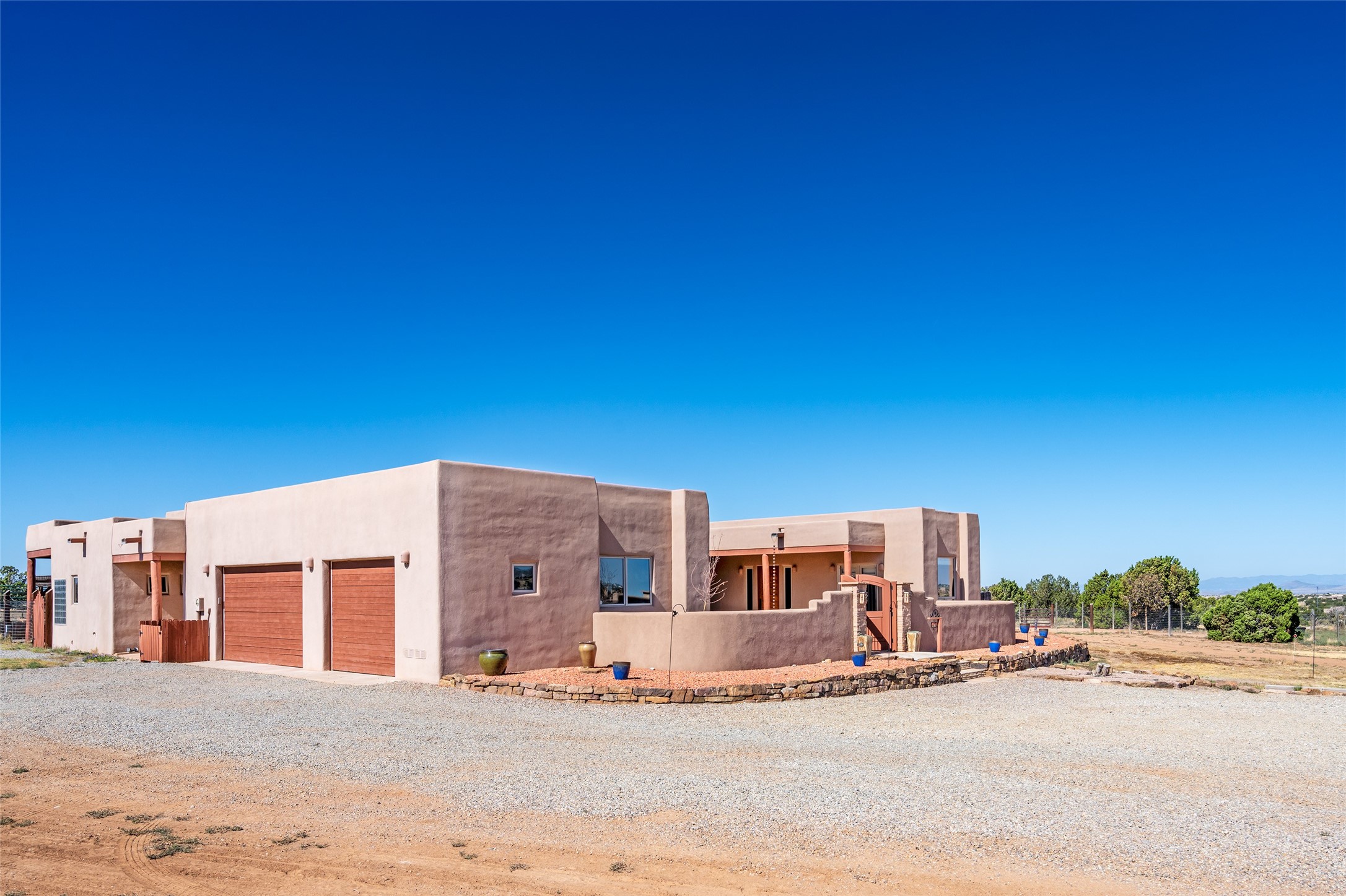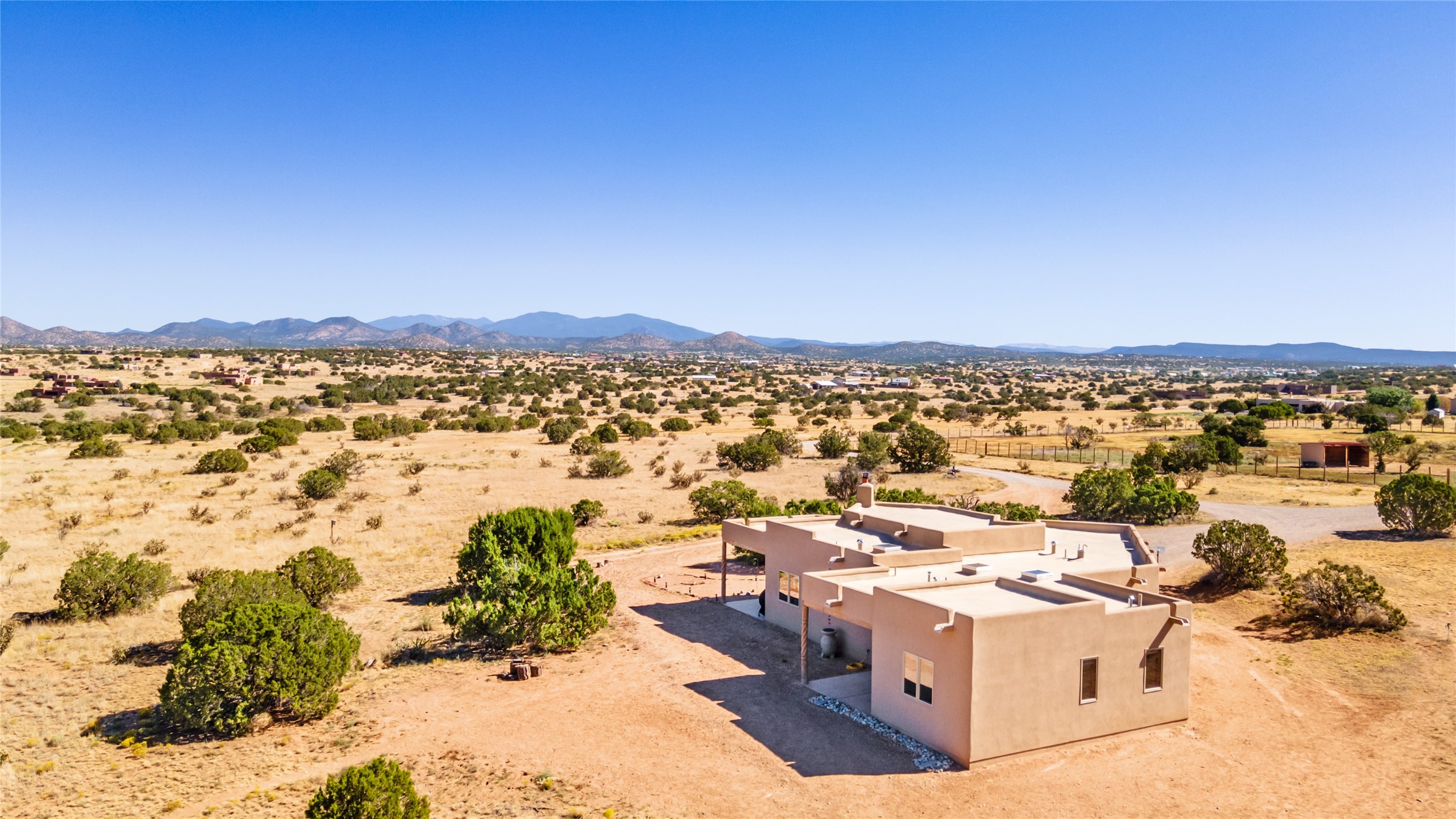 15 Silver Saddle is a 3 BRM/ 3.5 BATH main home with diamond plaster walls, polished concrete floors and wood beam high- ceilings throughout. The master suite is located on the western side of the house apart from the two additional en-suite guest bedrooms-- all with outdoor access. The master suite is well-appointed with a walk-in closet, a master bath with his and her sinks and water closets- along with a walk-in steam shower and soaking tub. Outdoor access from the master suite leads to a private outdoor area with a jacuzzi. However, it is the open concept cook's kitchen and adjacent entertaining room with a built-in wood bar that are the home's showstoppers. The almost 17-acre property also boasts a newly built (2017) two-bedroom 1,400 square foot guest house with high-end finishes and appliances throughout. Approx. 15 minutes to Santa Fe and conveniently located 5 minutes from the shopping area at Eldorado Santa Fe. For horse lovers the property has a Cleary barn, 3 horse stalls, an insulated tack room, an arena, a turnout and pasture. As an added bonus, there is direct access to Galisteo Basin Trails.