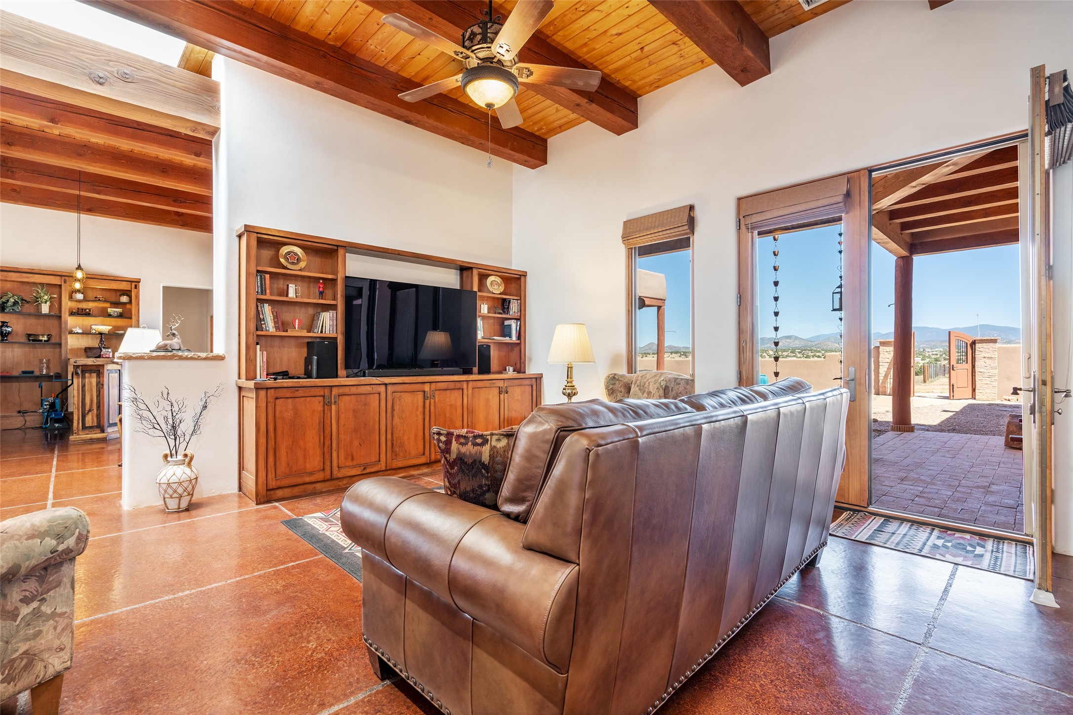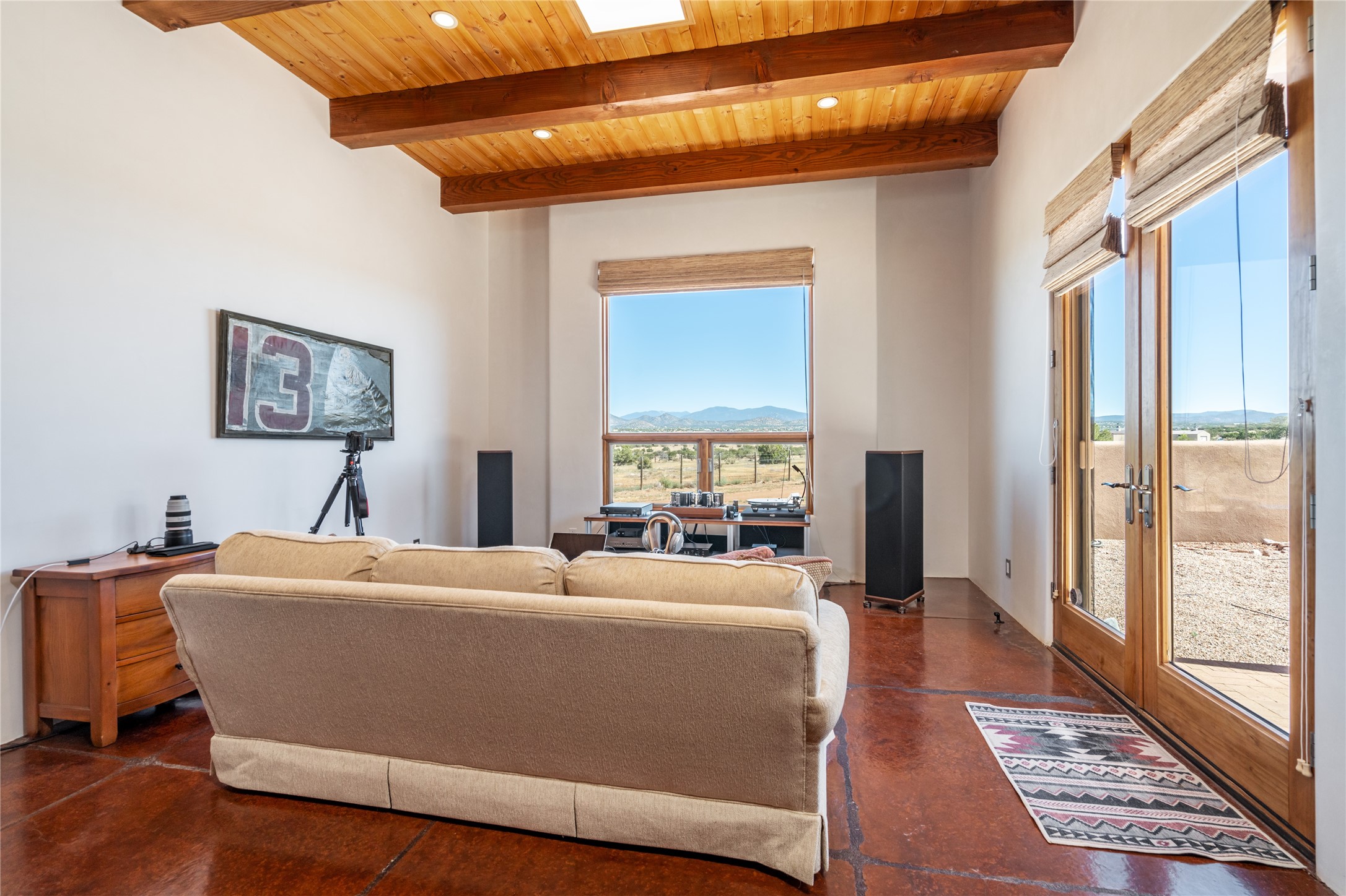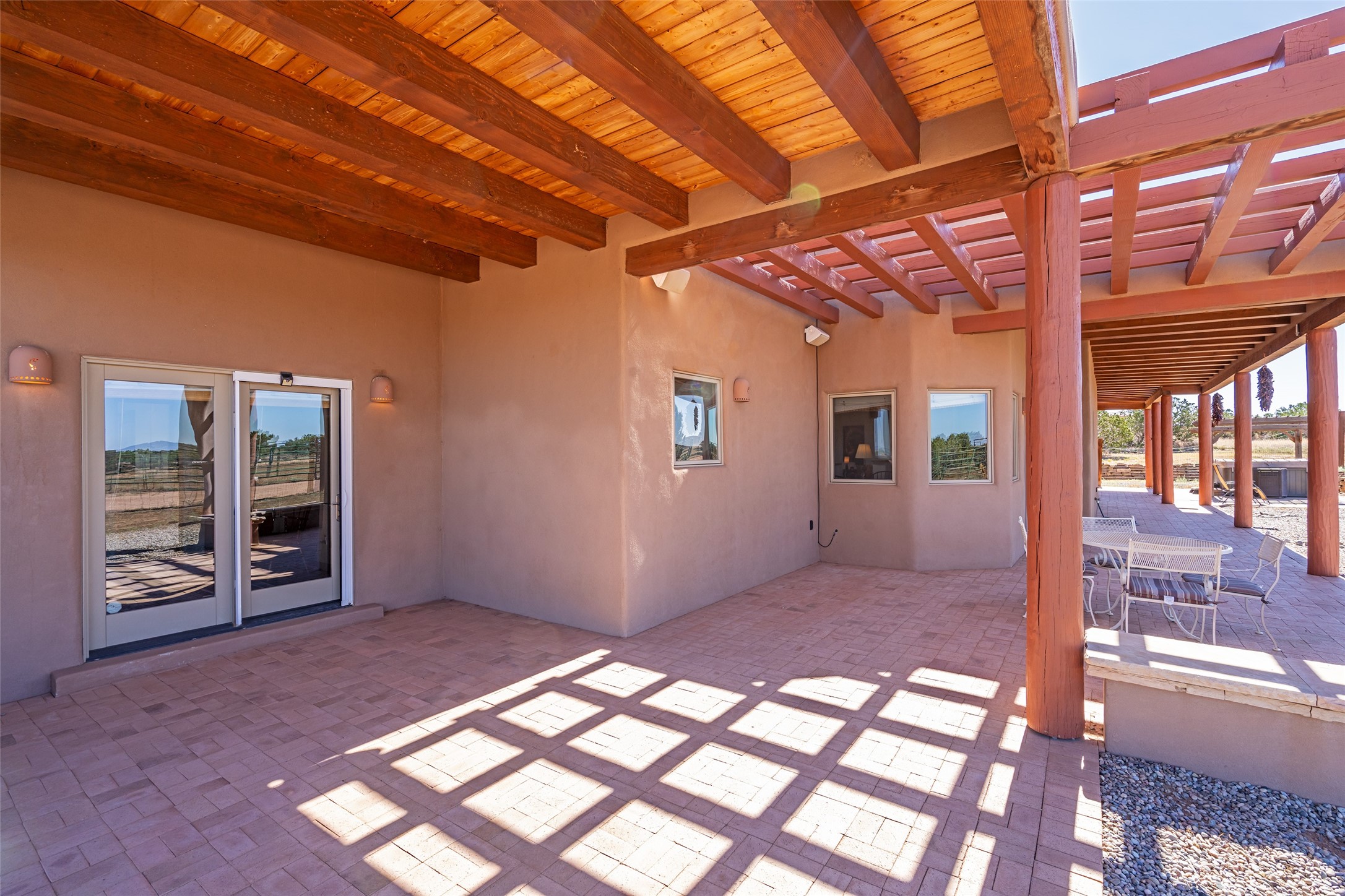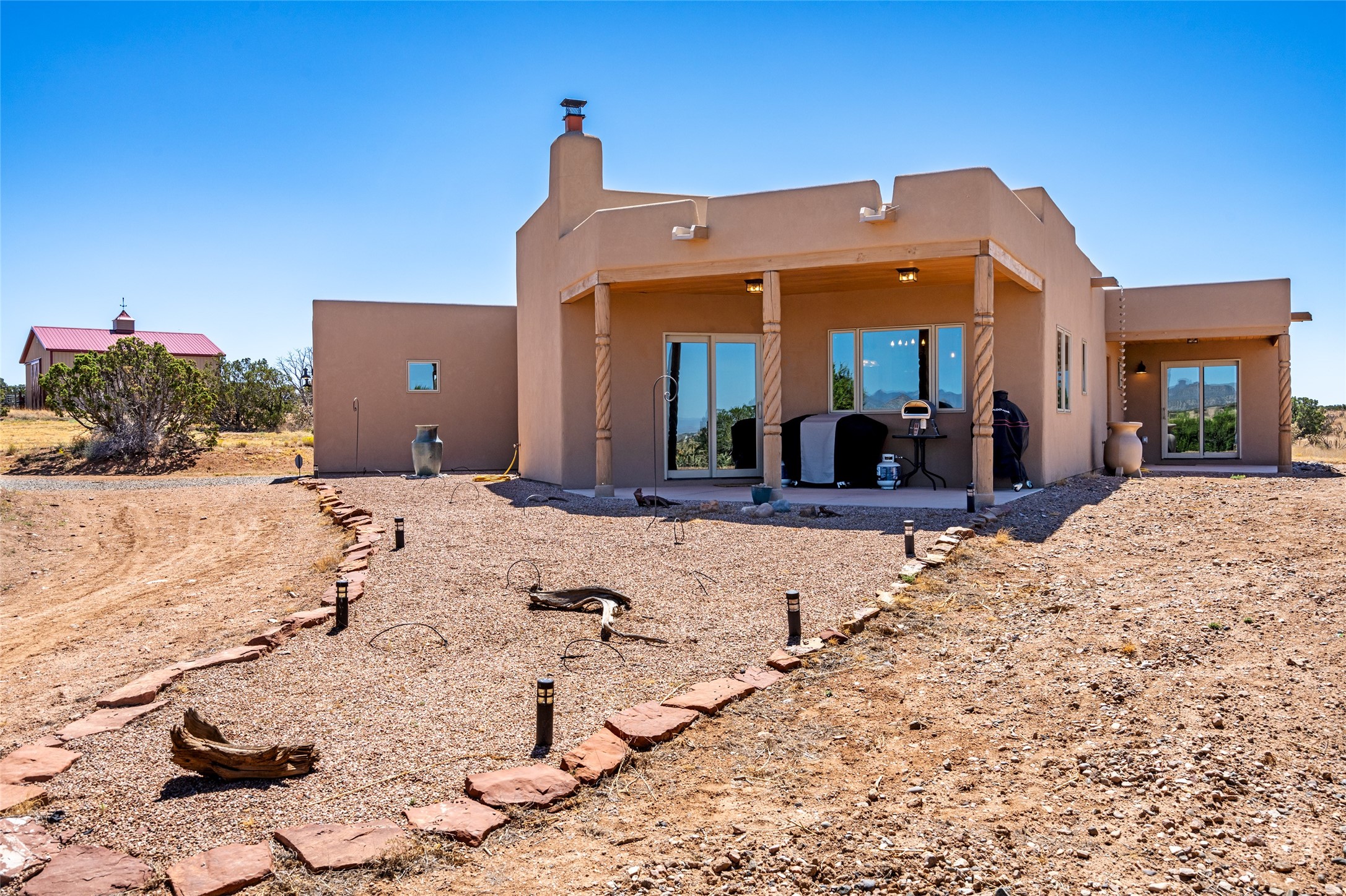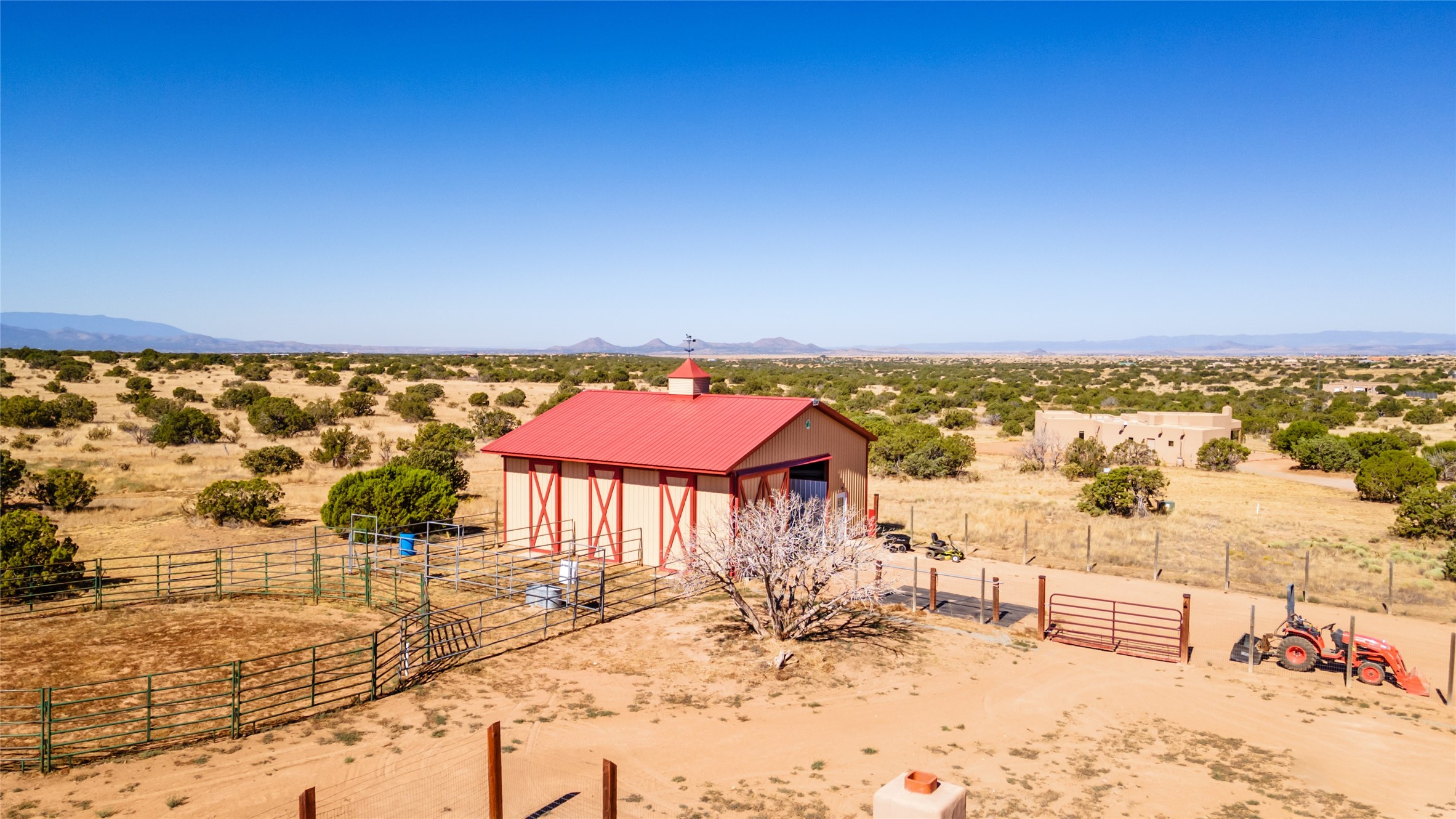 15 Silver Saddle is a 3 BRM/ 3.5 BATH main home with diamond plaster walls, polished concrete floors and wood beam high- ceilings throughout. The master suite is located on the western side of the house apart from the two additional en-suite guest bedrooms-- all with outdoor access. The master suite is well-appointed with a walk-in closet, a master bath with his and her sinks and water closets- along with a walk-in steam shower and soaking tub. Outdoor access from the master suite leads to a private outdoor area with a jacuzzi. However, it is the open concept cook's kitchen and adjacent entertaining room with a built-in wood bar that are the home's showstoppers. The almost 17-acre property also boasts a newly built (2017) two-bedroom 1,400 square foot guest house with high-end finishes and appliances throughout. Approx. 15 minutes to Santa Fe and conveniently located 5 minutes from the shopping area at Eldorado Santa Fe. For horse lovers the property has a Cleary barn, 3 horse stalls, an insulated tack room, an arena, a turnout and pasture. As an added bonus, there is direct access to Galisteo Basin Trails.