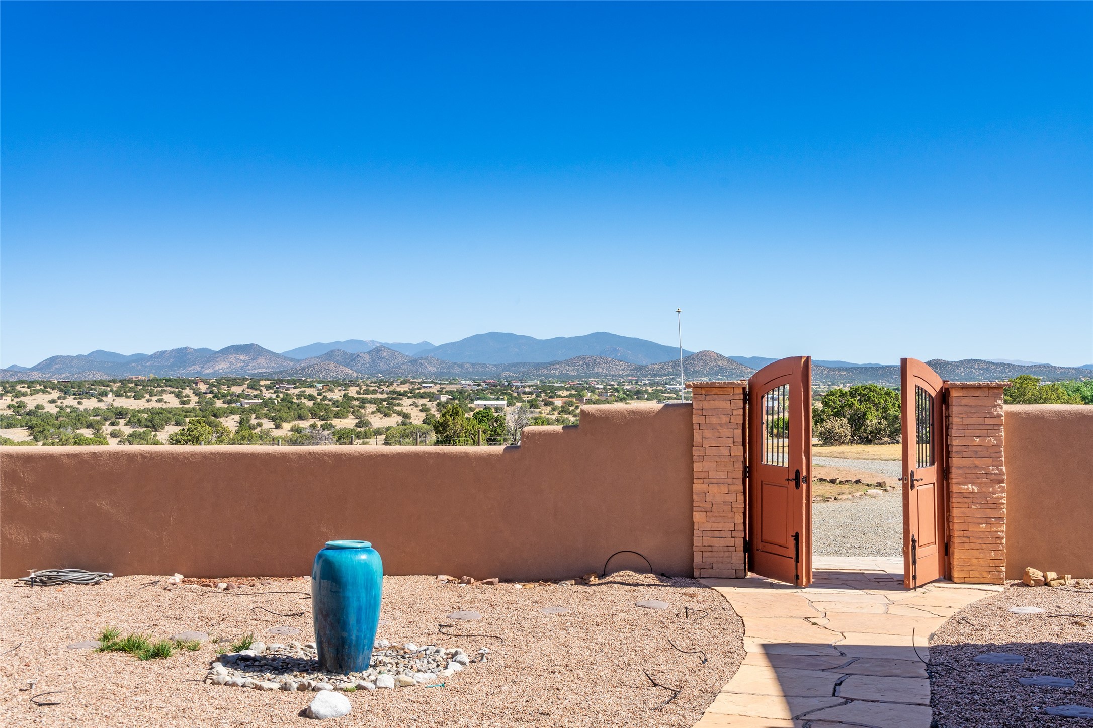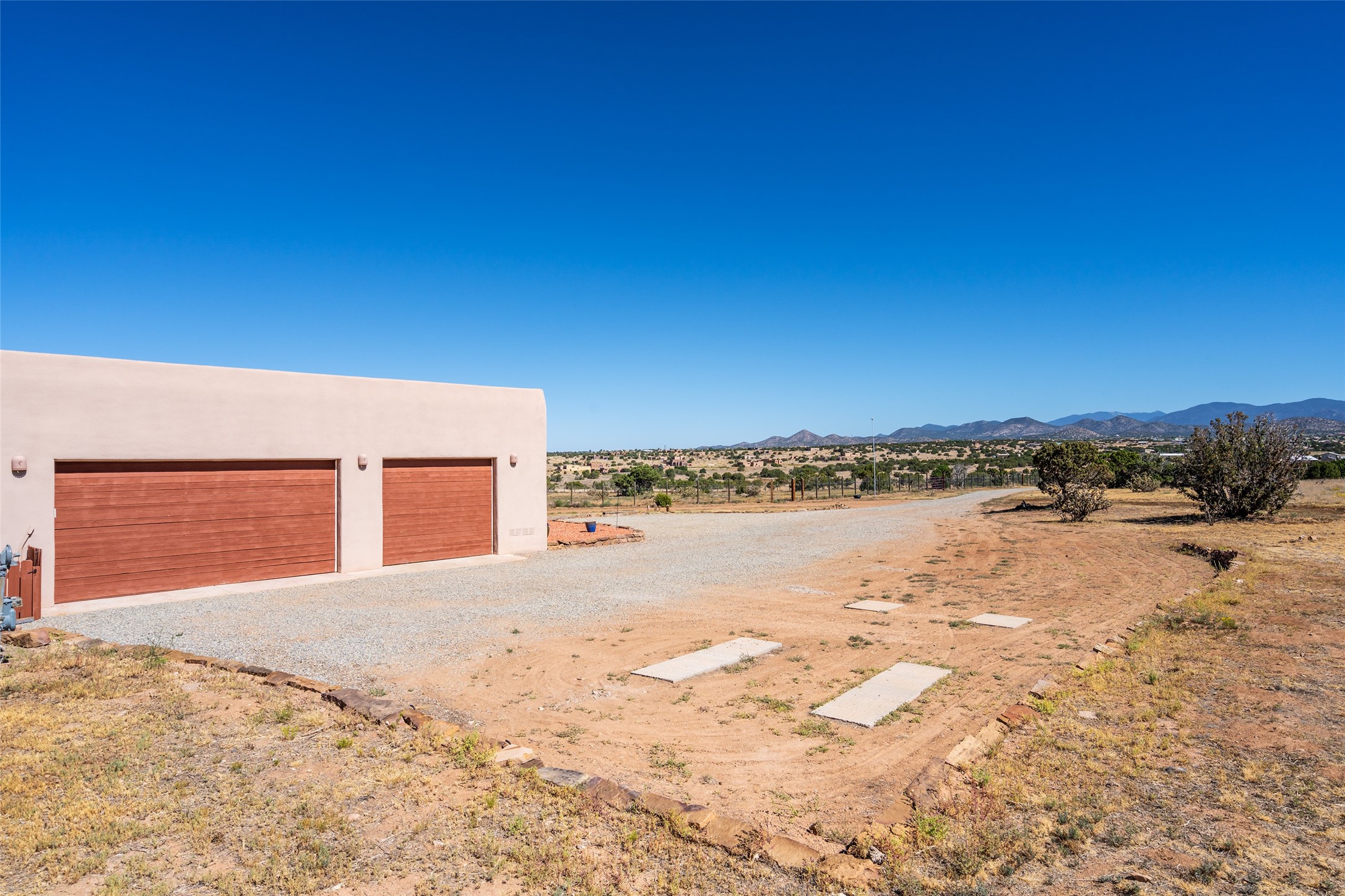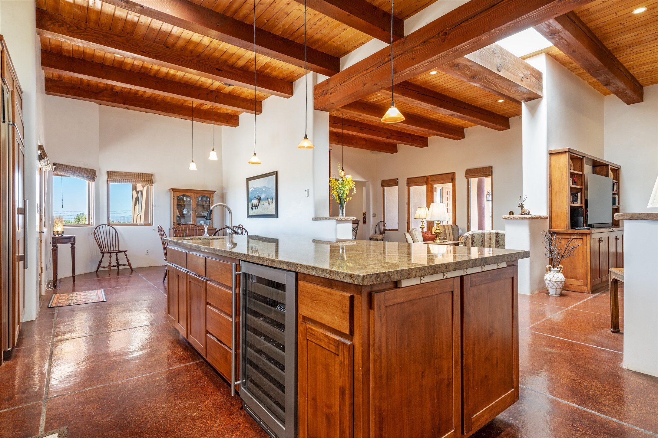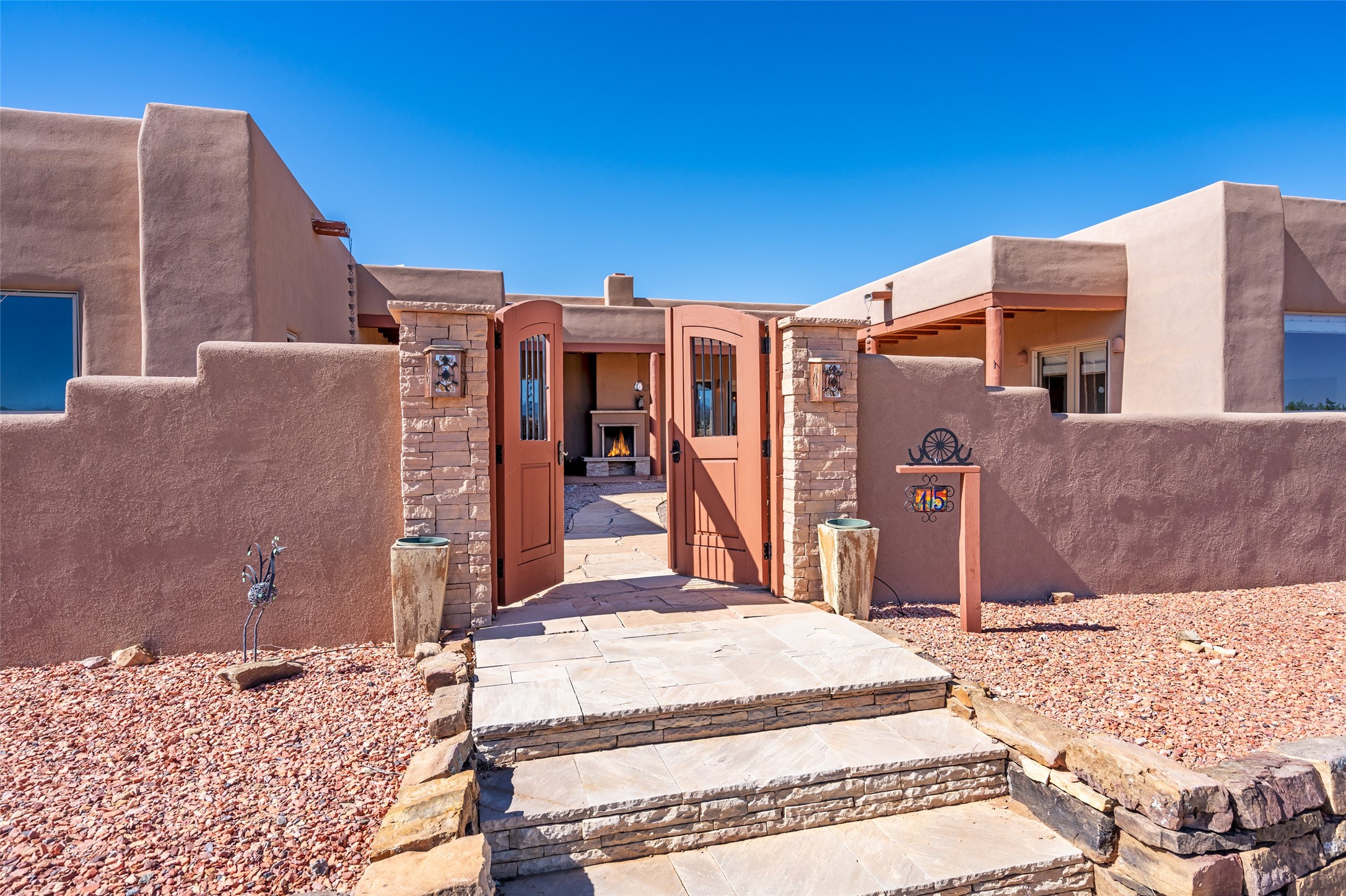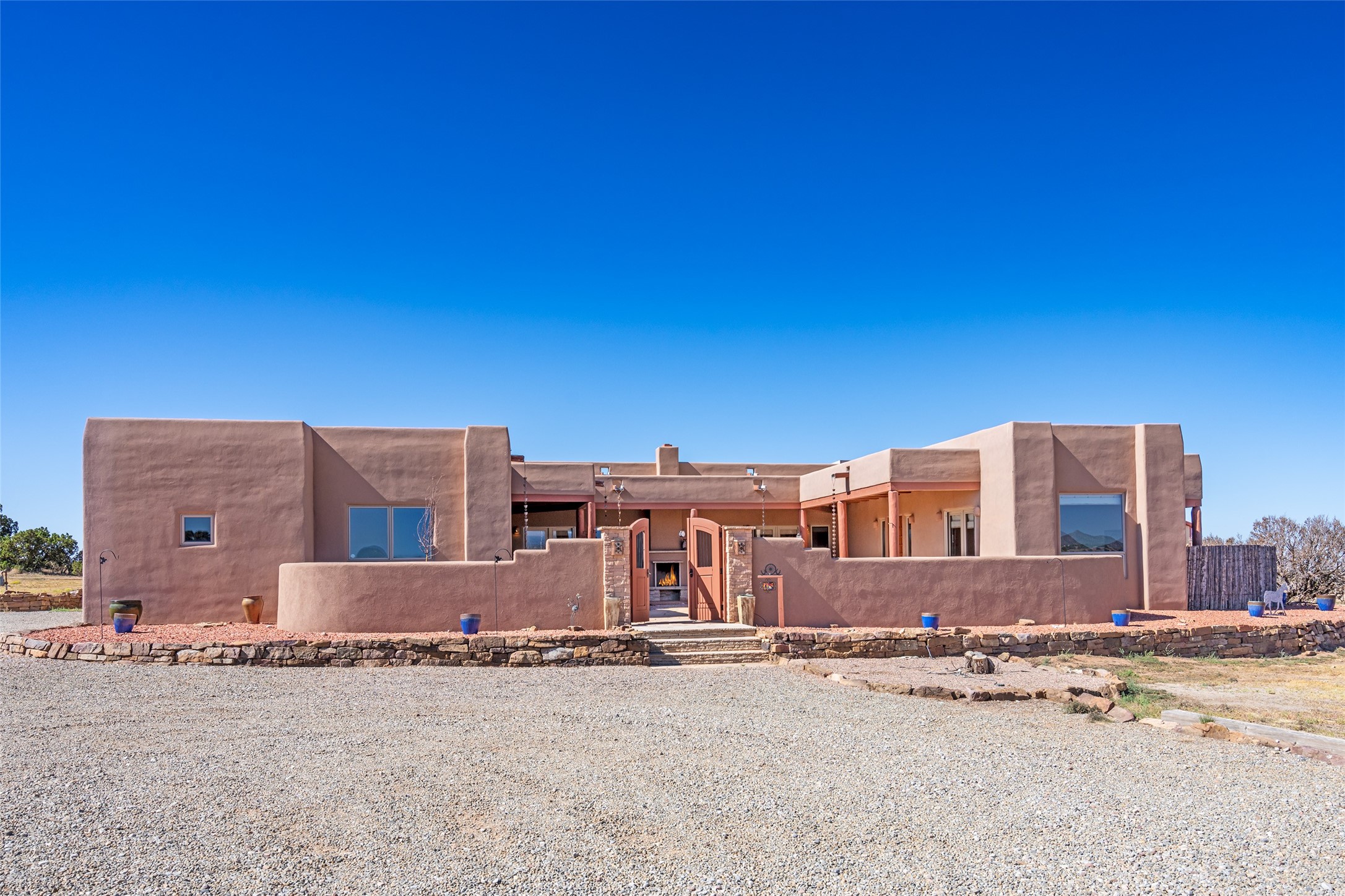 15 Silver Saddle is a 3 BRM/ 3.5 BATH main home with diamond plaster walls, polished concrete floors and wood beam high- ceilings throughout. The master suite is located on the western side of the house apart from the two additional en-suite guest bedrooms-- all with outdoor access. The master suite is well-appointed with a walk-in closet, a master bath with his and her sinks and water closets- along with a walk-in steam shower and soaking tub. Outdoor access from the master suite leads to a private outdoor area with a jacuzzi. However, it is the open concept cook's kitchen and adjacent entertaining room with a built-in wood bar that are the home's showstoppers. The almost 17-acre property also boasts a newly built (2017) two-bedroom 1,400 square foot guest house with high-end finishes and appliances throughout. Approx. 15 minutes to Santa Fe and conveniently located 5 minutes from the shopping area at Eldorado Santa Fe. For horse lovers the property has a Cleary barn, 3 horse stalls, an insulated tack room, an arena, a turnout and pasture. As an added bonus, there is direct access to Galisteo Basin Trails.