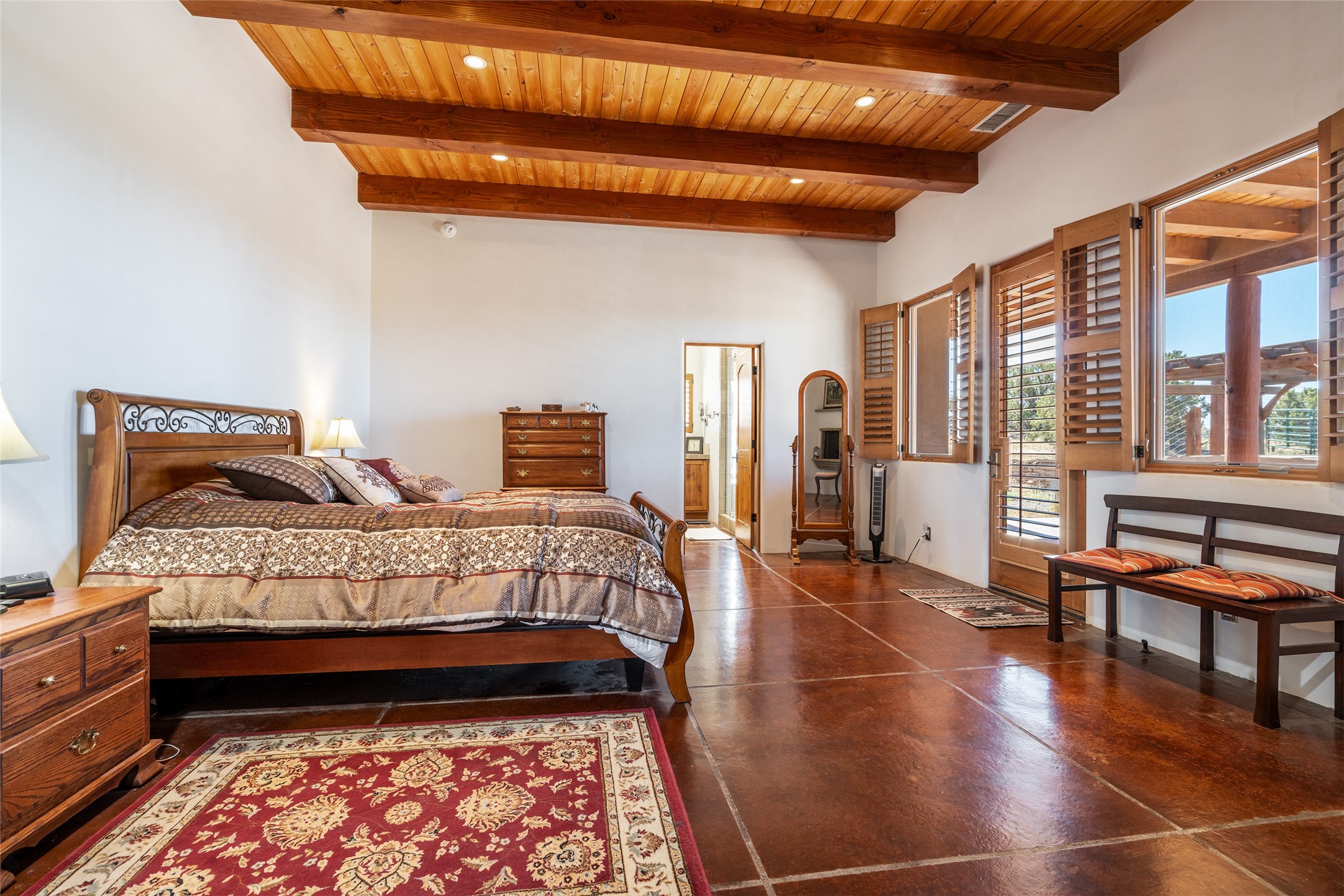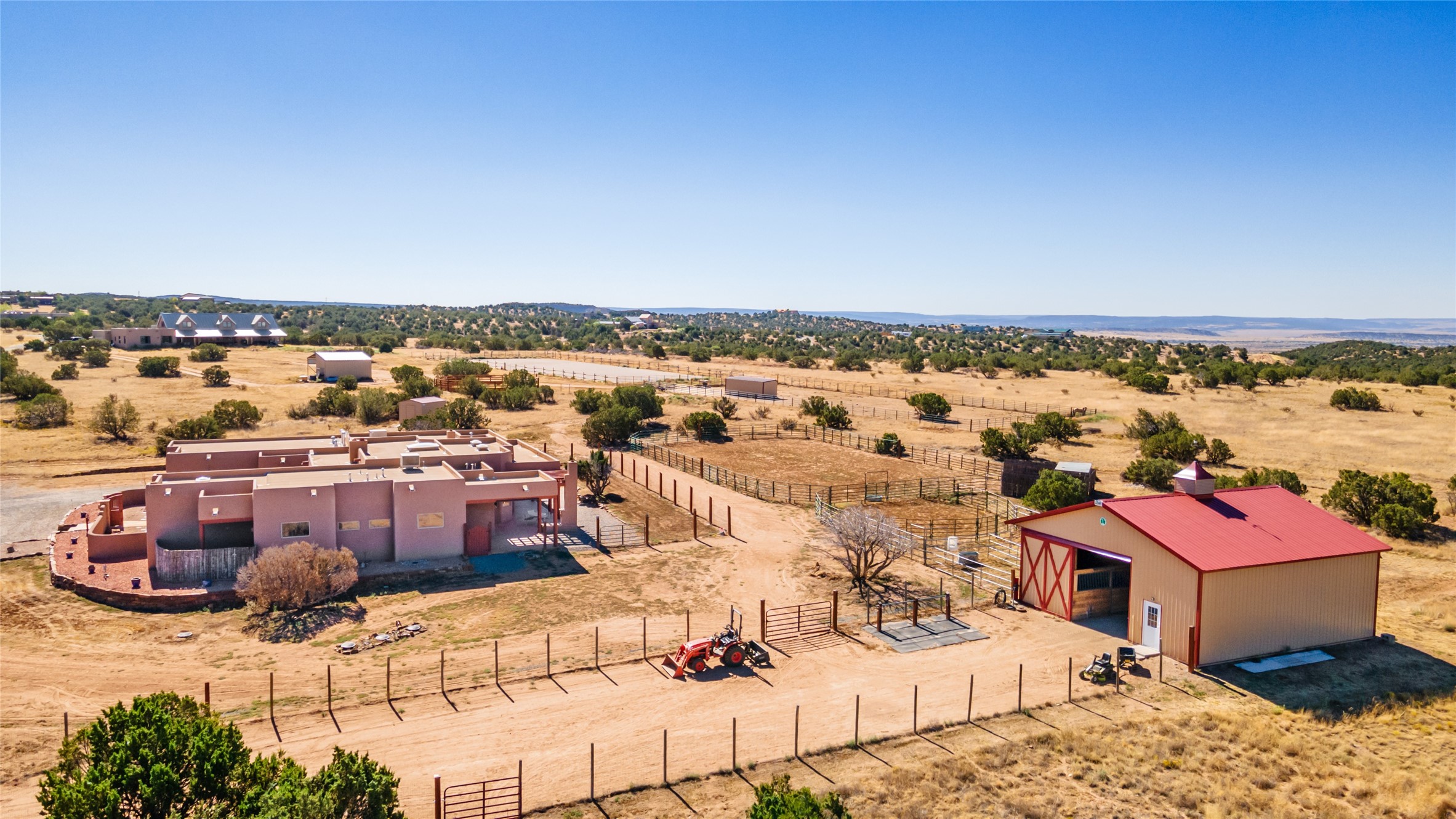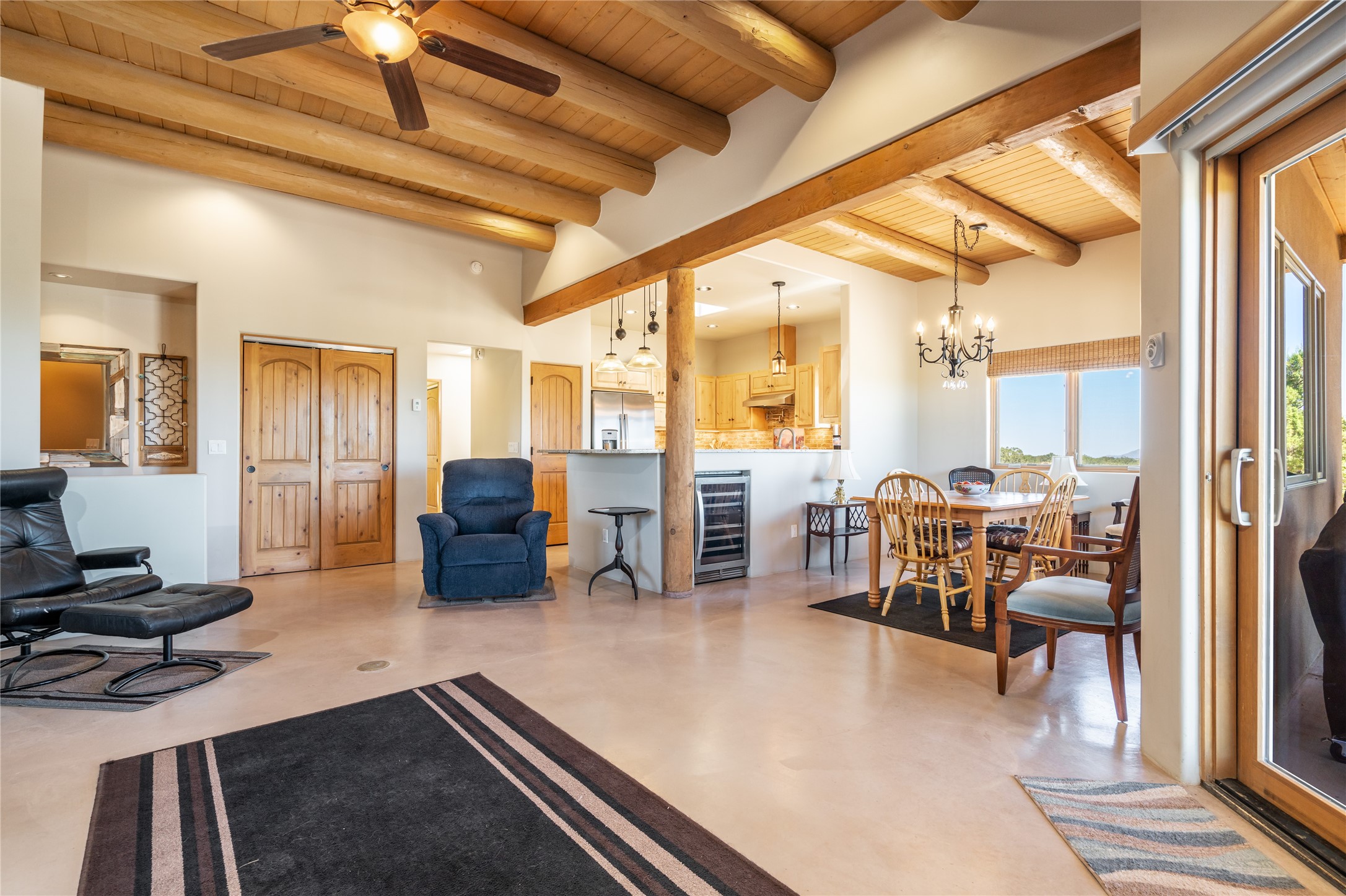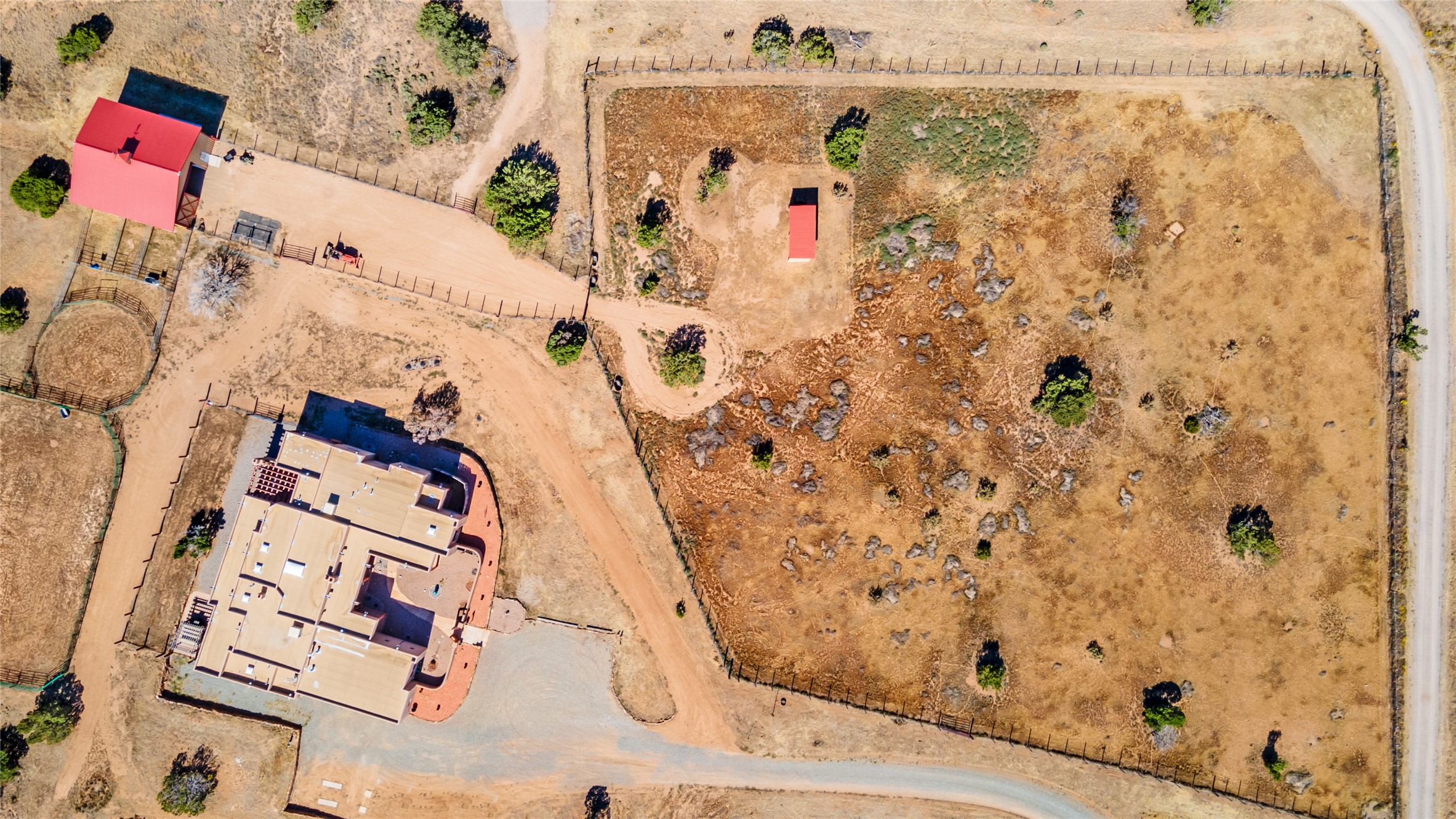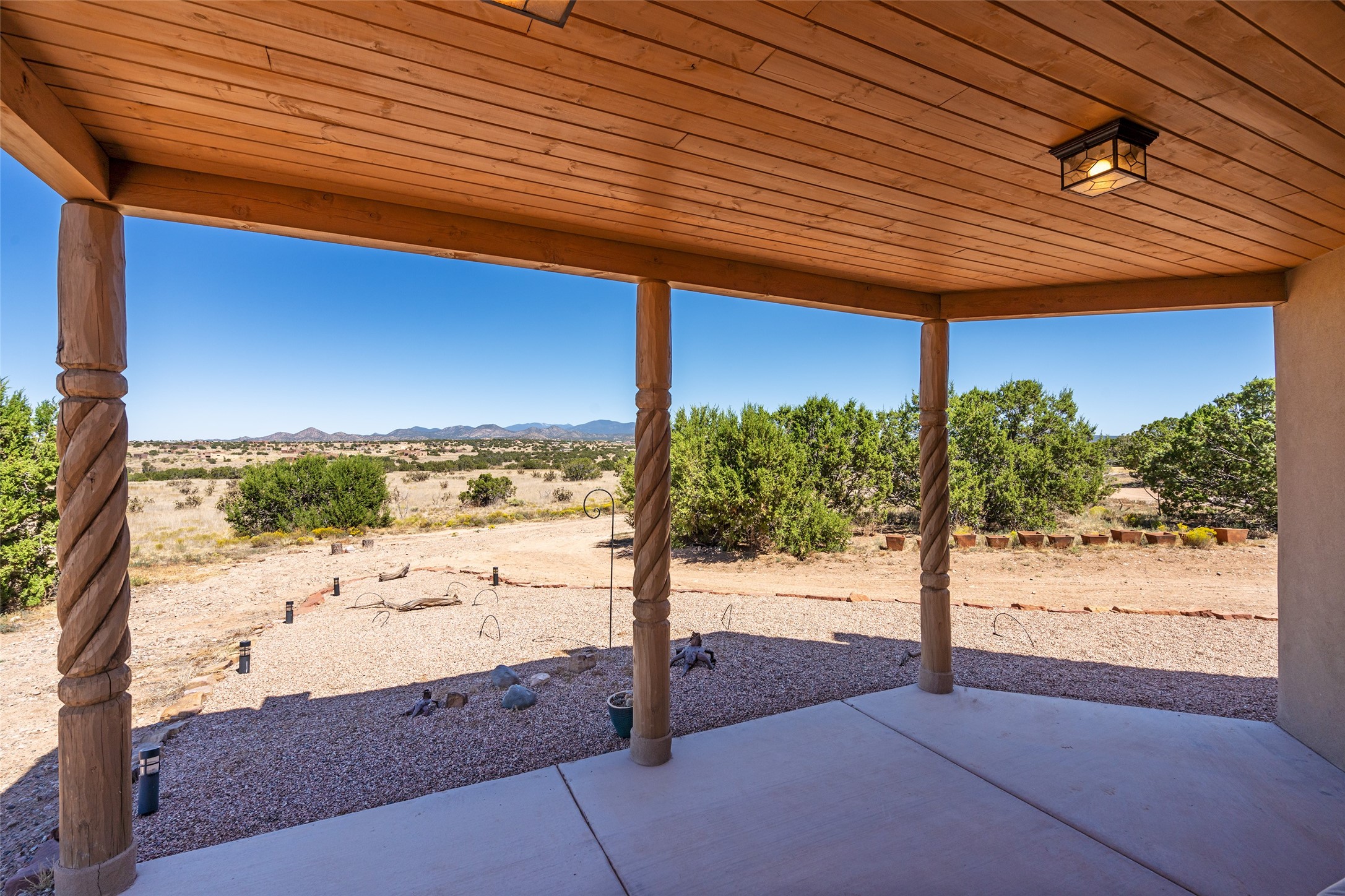15 Silver Saddle is a 3 BRM/ 3.5 BATH main home with diamond plaster walls, polished concrete floors and wood beam high- ceilings throughout. The master suite is located on the western side of the house apart from the two additional en-suite guest bedrooms-- all with outdoor access. The master suite is well-appointed with a walk-in closet, a master bath with his and her sinks and water closets- along with a walk-in steam shower and soaking tub. Outdoor access from the master suite leads to a private outdoor area with a jacuzzi. However, it is the open concept cook's kitchen and adjacent entertaining room with a built-in wood bar that are the home's showstoppers. The almost 17-acre property also boasts a newly built (2017) two-bedroom 1,400 square foot guest house with high-end finishes and appliances throughout. Approx. 15 minutes to Santa Fe and conveniently located 5 minutes from the shopping area at Eldorado Santa Fe. For horse lovers the property has a Cleary barn, 3 horse stalls, an insulated tack room, an arena, a turnout and pasture. As an added bonus, there is direct access to Galisteo Basin Trails.