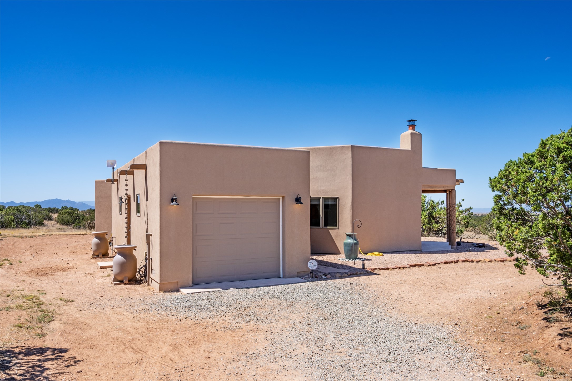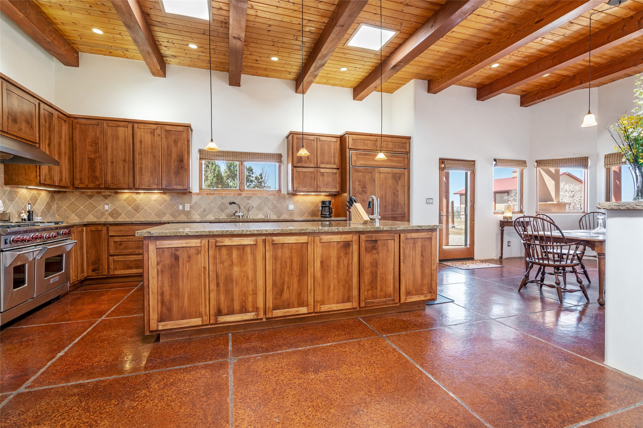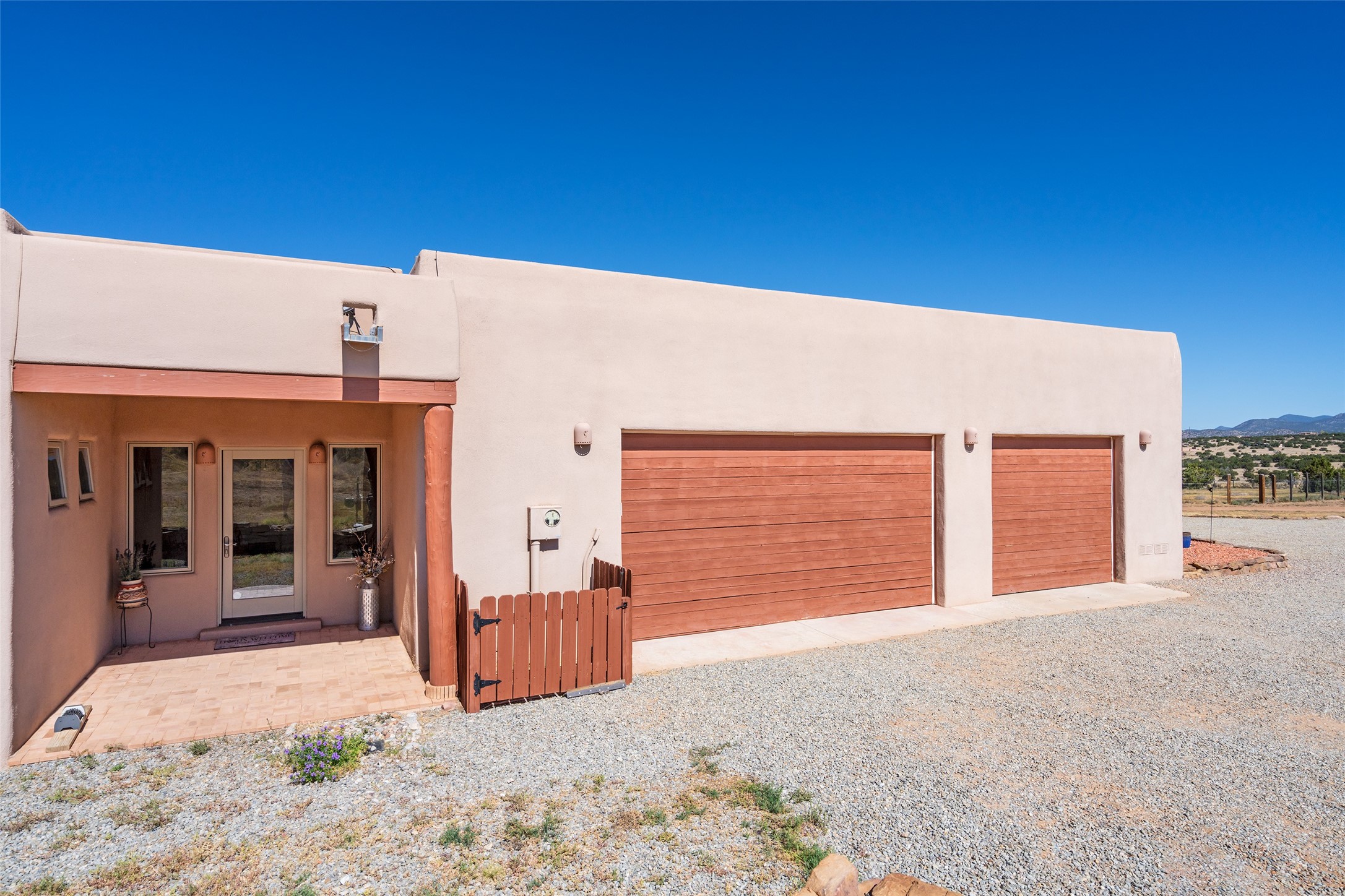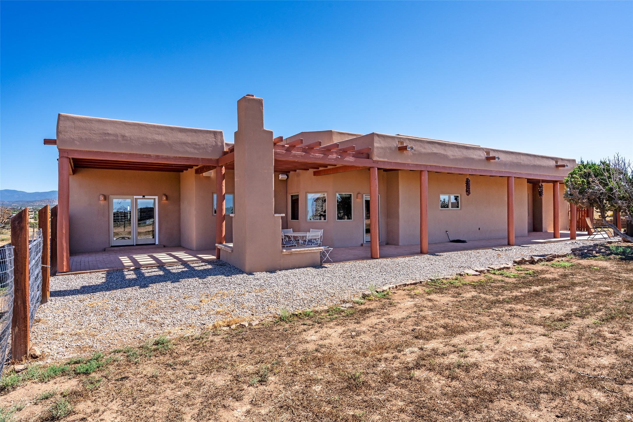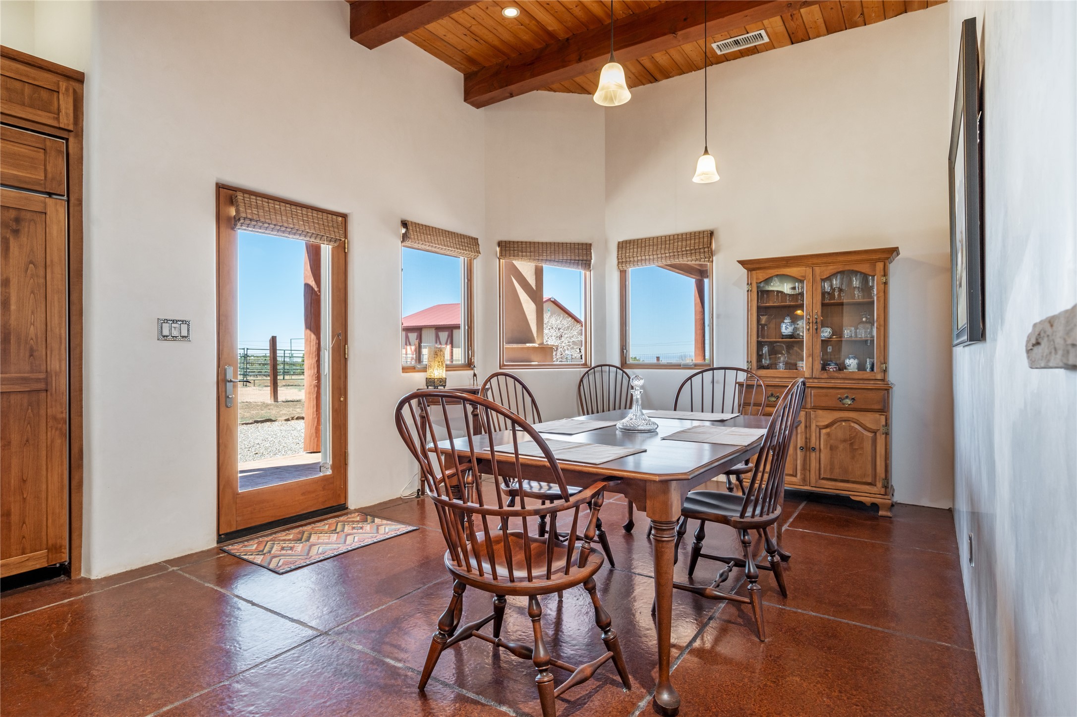 15 Silver Saddle is a 3 BRM/ 3.5 BATH main home with diamond plaster walls, polished concrete floors and wood beam high- ceilings throughout. The master suite is located on the western side of the house apart from the two additional en-suite guest bedrooms-- all with outdoor access. The master suite is well-appointed with a walk-in closet, a master bath with his and her sinks and water closets- along with a walk-in steam shower and soaking tub. Outdoor access from the master suite leads to a private outdoor area with a jacuzzi. However, it is the open concept cook's kitchen and adjacent entertaining room with a built-in wood bar that are the home's showstoppers. The almost 17-acre property also boasts a newly built (2017) two-bedroom 1,400 square foot guest house with high-end finishes and appliances throughout. Approx. 15 minutes to Santa Fe and conveniently located 5 minutes from the shopping area at Eldorado Santa Fe. For horse lovers the property has a Cleary barn, 3 horse stalls, an insulated tack room, an arena, a turnout and pasture. As an added bonus, there is direct access to Galisteo Basin Trails.
