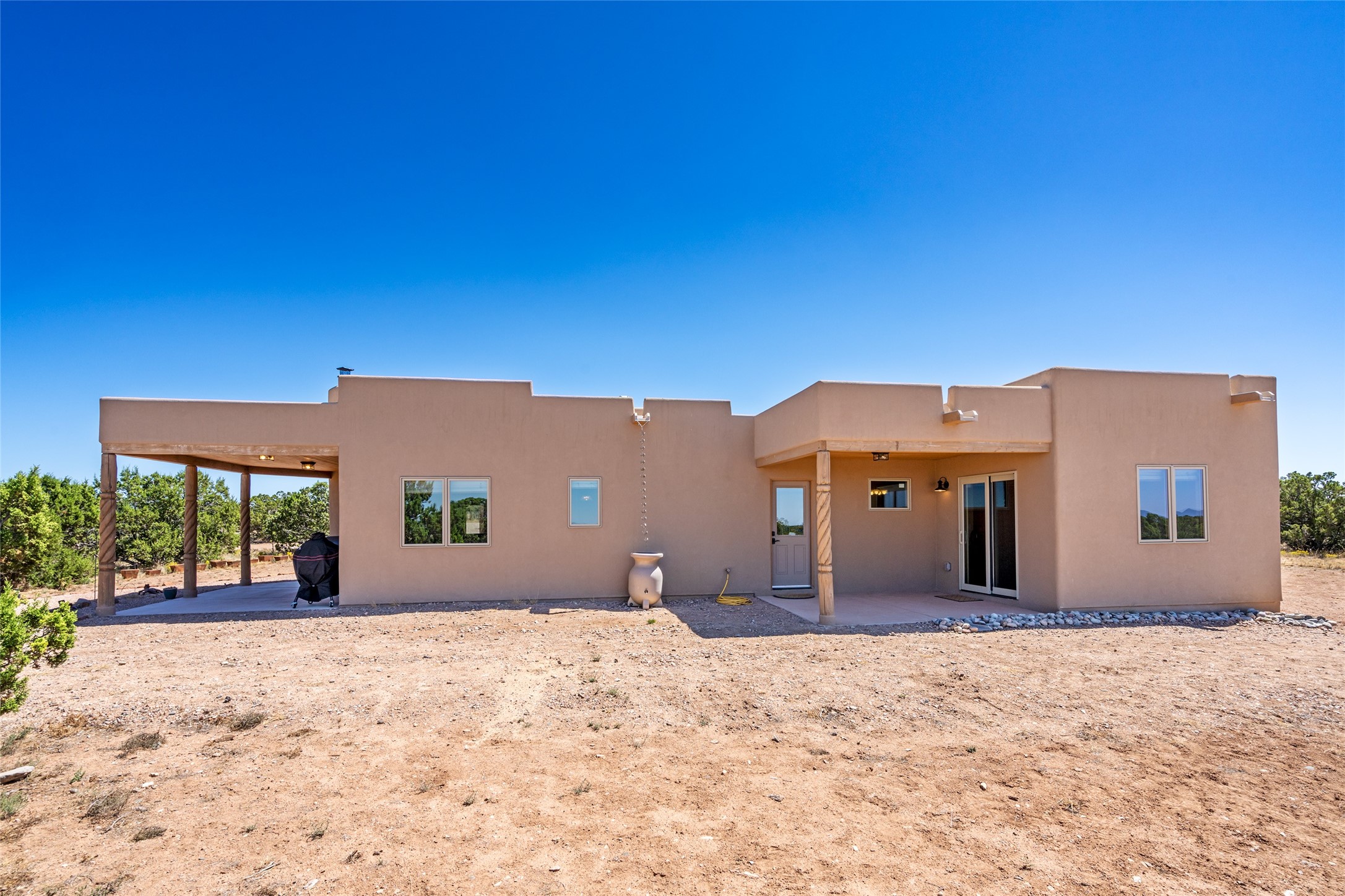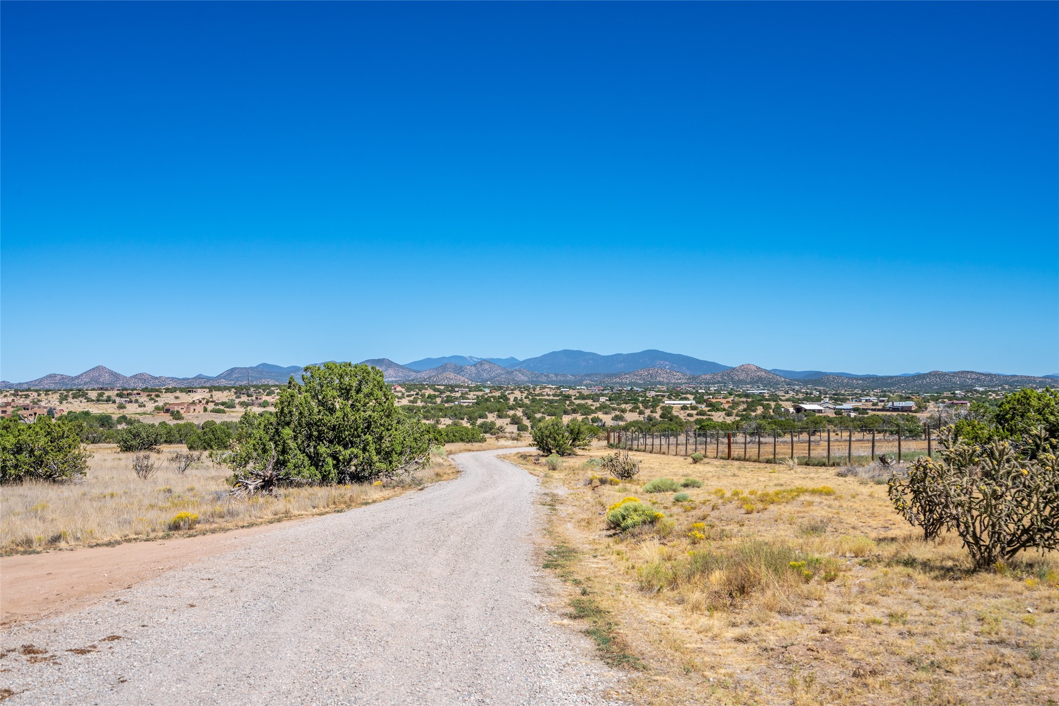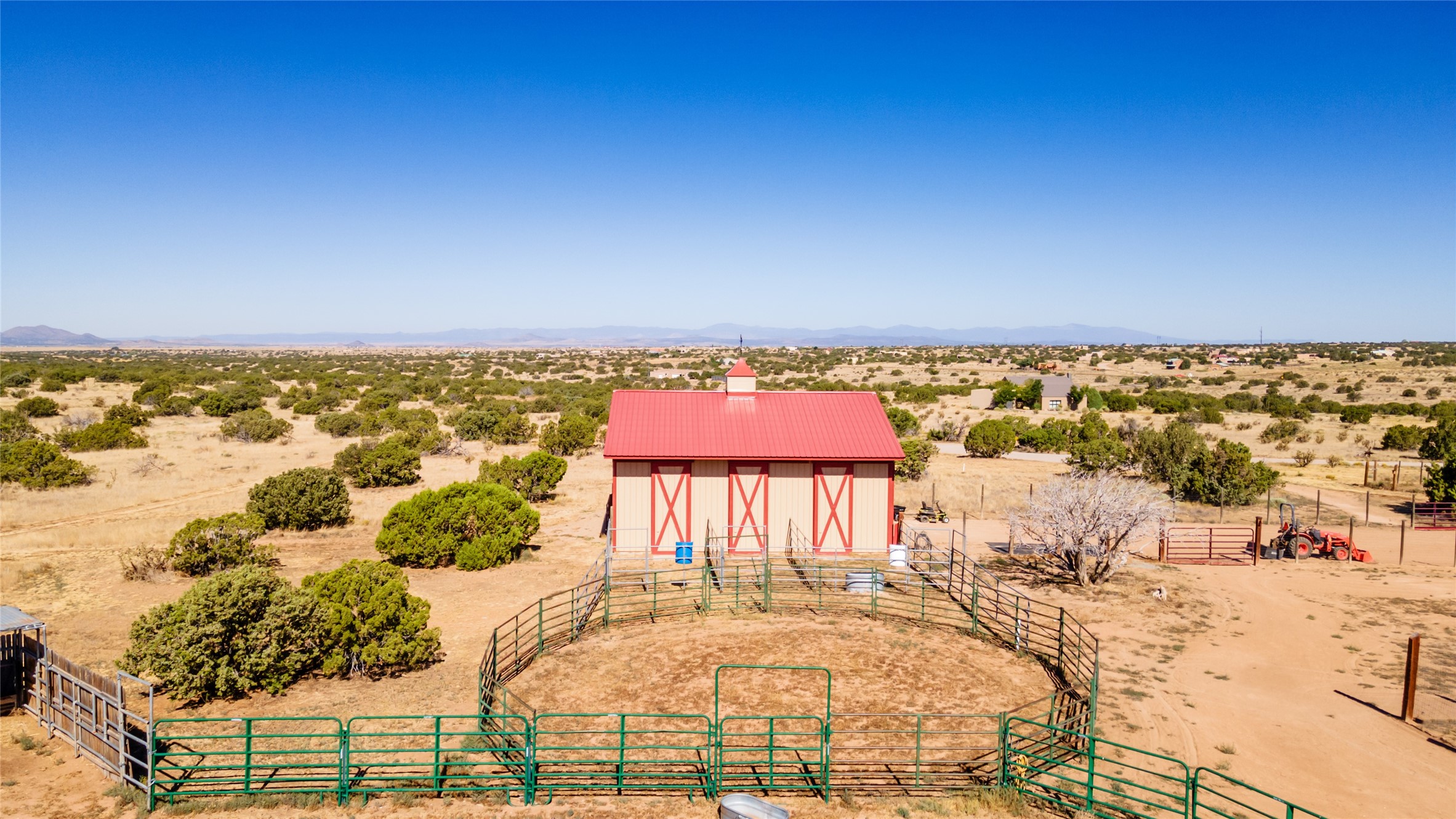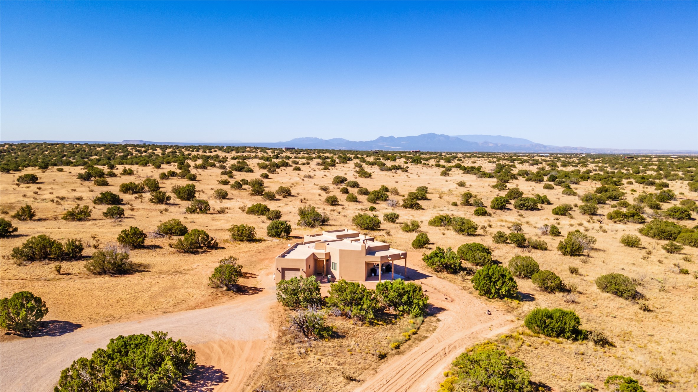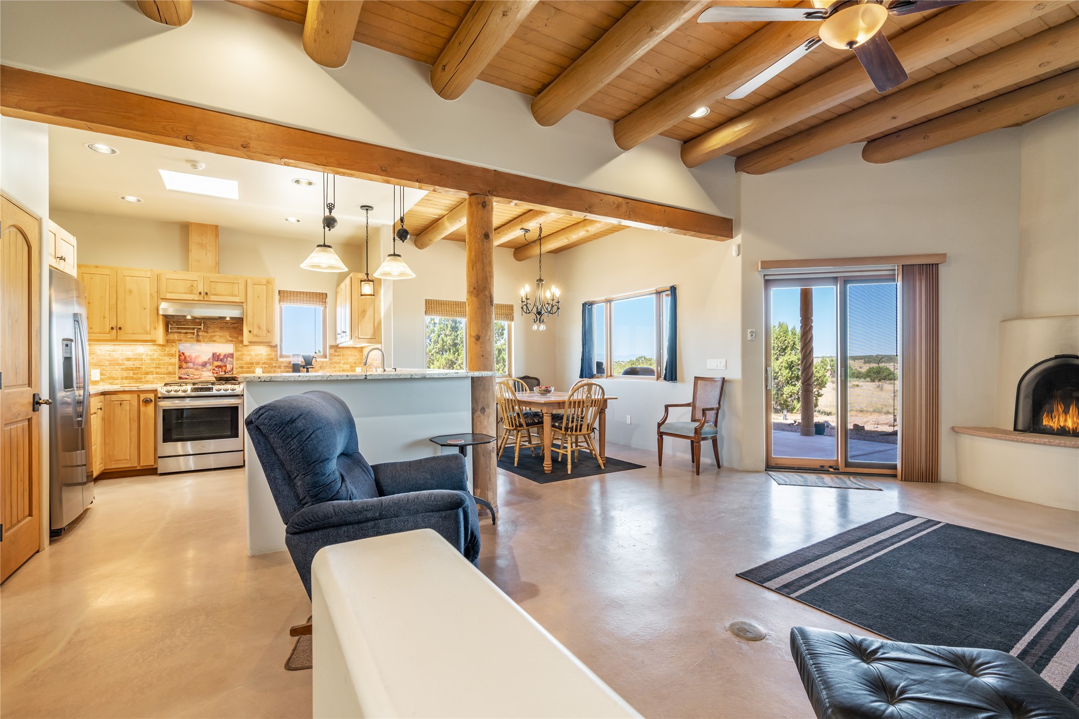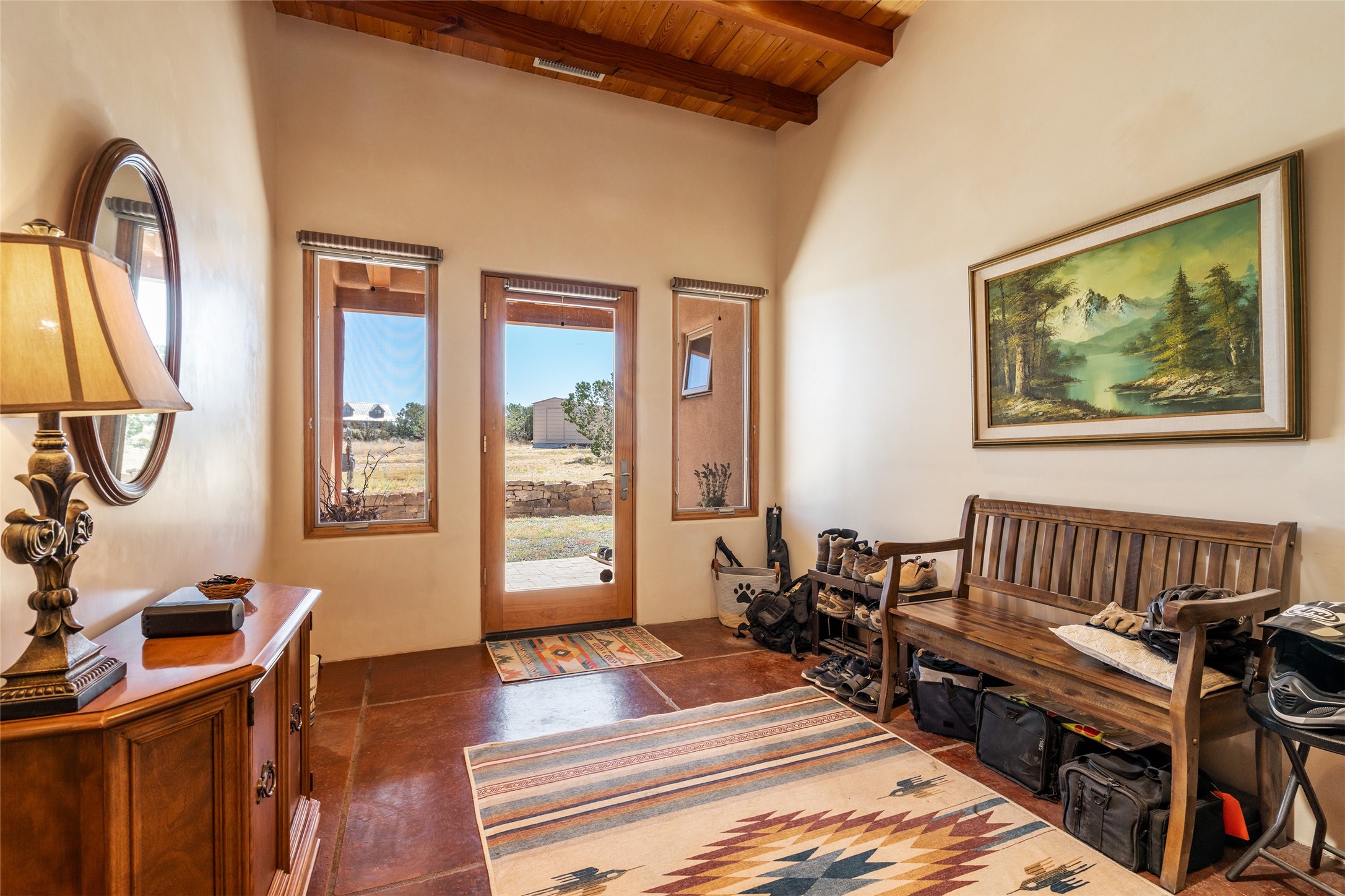 15 Silver Saddle is a 3 BRM/ 3.5 BATH main home with diamond plaster walls, polished concrete floors and wood beam high- ceilings throughout. The master suite is located on the western side of the house apart from the two additional en-suite guest bedrooms-- all with outdoor access. The master suite is well-appointed with a walk-in closet, a master bath with his and her sinks and water closets- along with a walk-in steam shower and soaking tub. Outdoor access from the master suite leads to a private outdoor area with a jacuzzi. However, it is the open concept cook's kitchen and adjacent entertaining room with a built-in wood bar that are the home's showstoppers. The almost 17-acre property also boasts a newly built (2017) two-bedroom 1,400 square foot guest house with high-end finishes and appliances throughout. Approx. 15 minutes to Santa Fe and conveniently located 5 minutes from the shopping area at Eldorado Santa Fe. For horse lovers the property has a Cleary barn, 3 horse stalls, an insulated tack room, an arena, a turnout and pasture. As an added bonus, there is direct access to Galisteo Basin Trails.