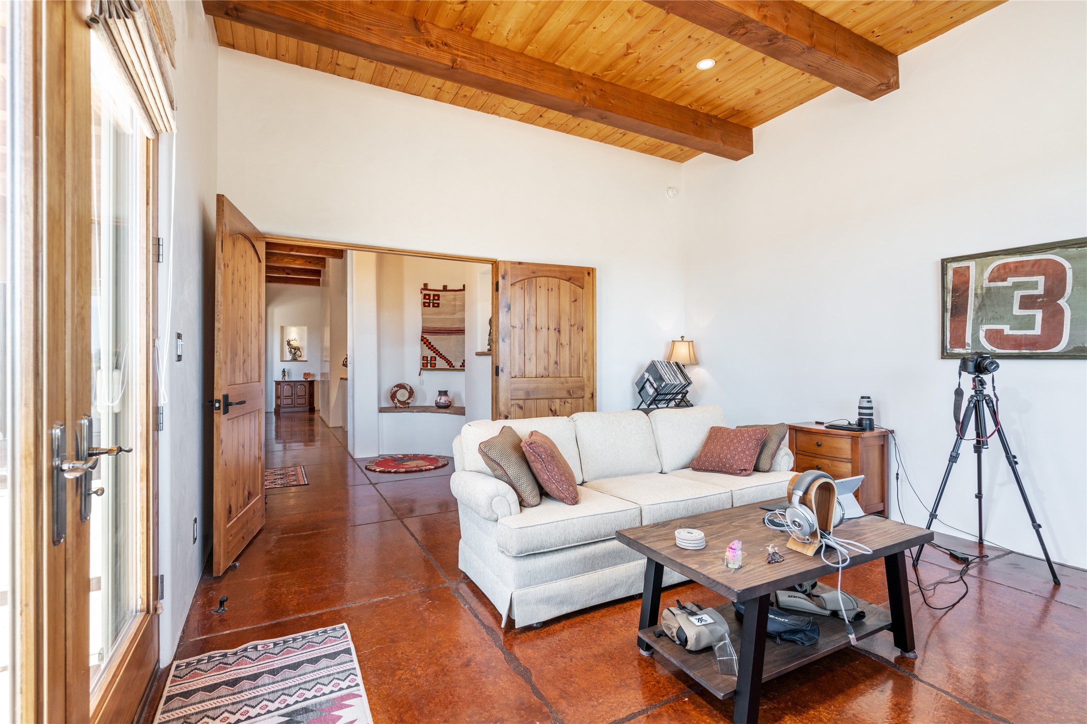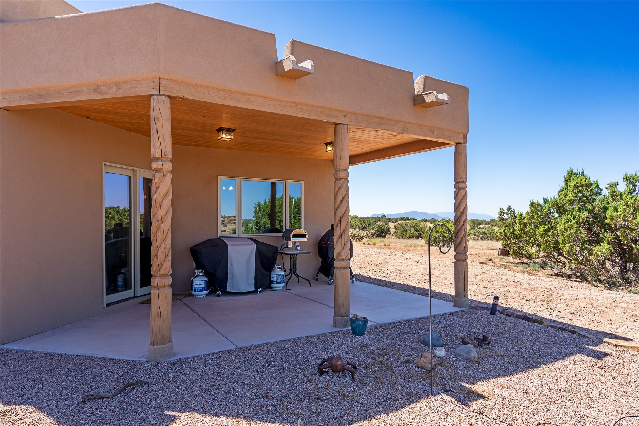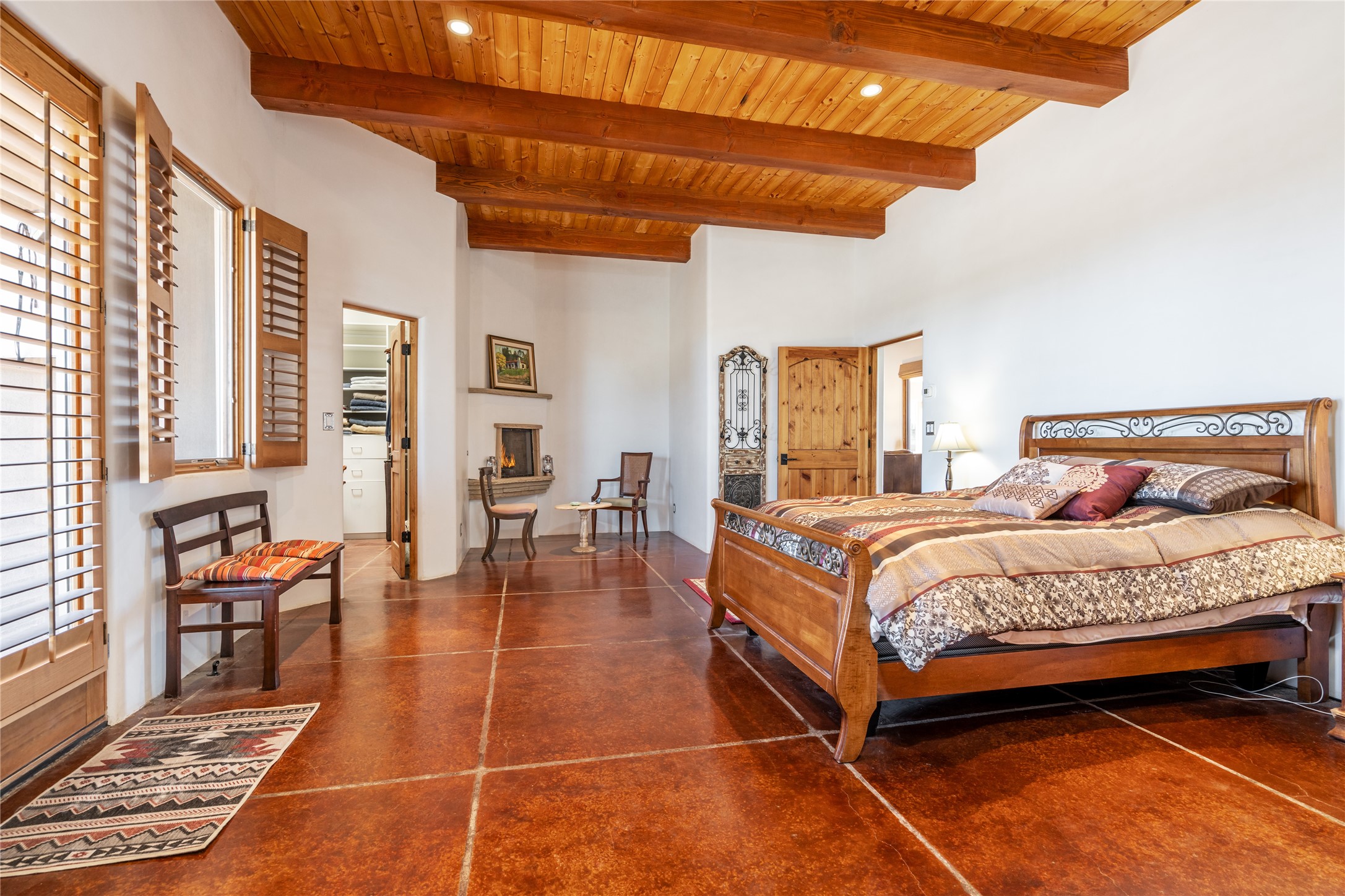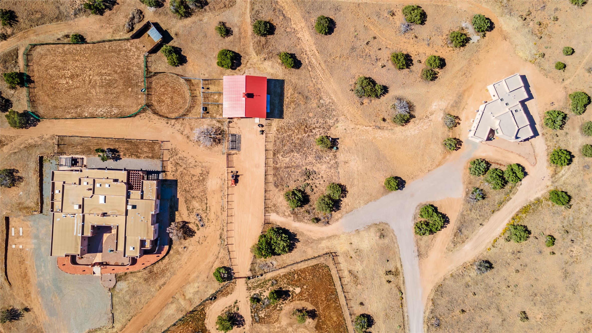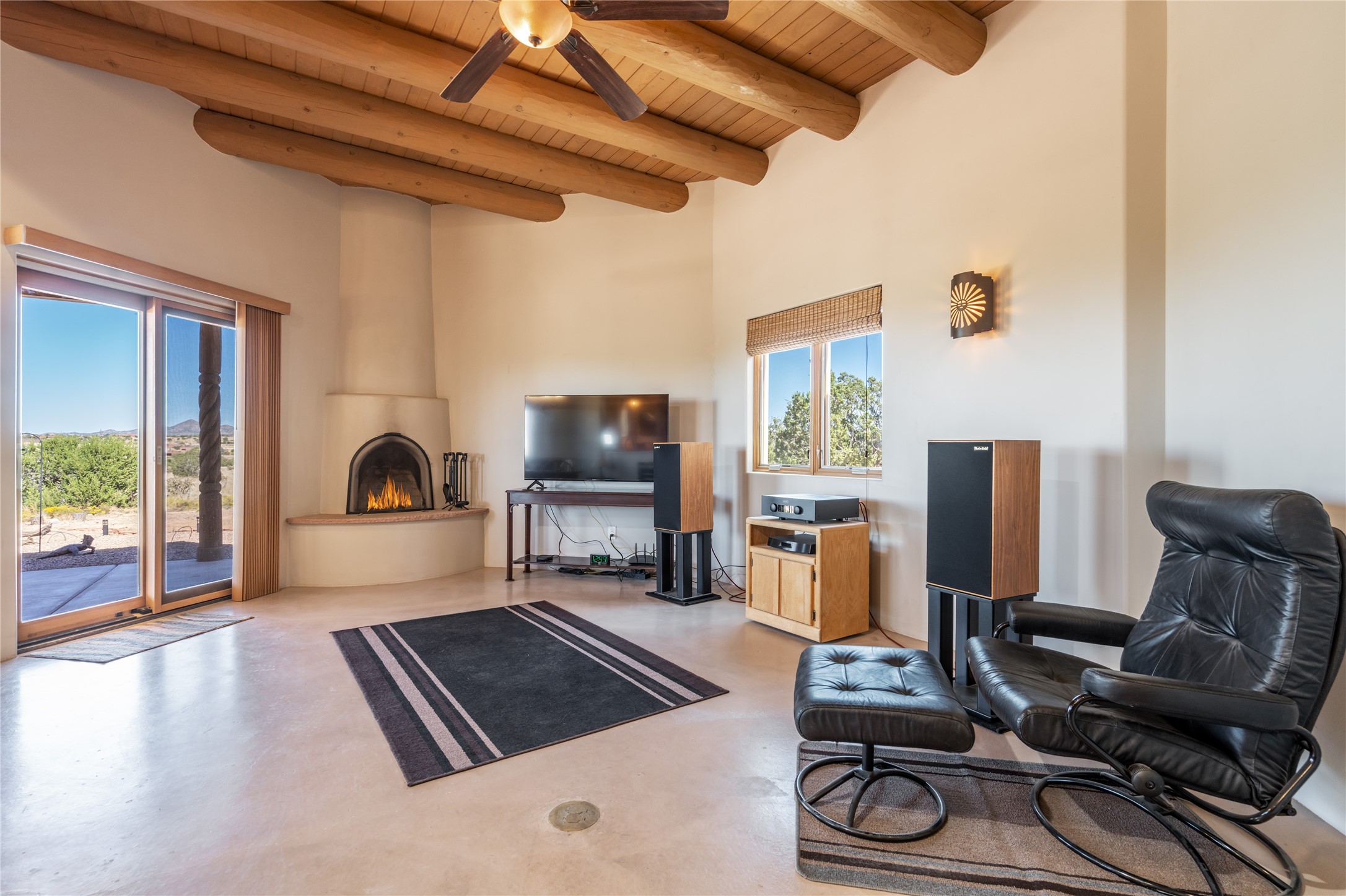 15 Silver Saddle is a 3 BRM/ 3.5 BATH main home with diamond plaster walls, polished concrete floors and wood beam high- ceilings throughout. The master suite is located on the western side of the house apart from the two additional en-suite guest bedrooms-- all with outdoor access. The master suite is well-appointed with a walk-in closet, a master bath with his and her sinks and water closets- along with a walk-in steam shower and soaking tub. Outdoor access from the master suite leads to a private outdoor area with a jacuzzi. However, it is the open concept cook's kitchen and adjacent entertaining room with a built-in wood bar that are the home's showstoppers. The almost 17-acre property also boasts a newly built (2017) two-bedroom 1,400 square foot guest house with high-end finishes and appliances throughout. Approx. 15 minutes to Santa Fe and conveniently located 5 minutes from the shopping area at Eldorado Santa Fe. For horse lovers the property has a Cleary barn, 3 horse stalls, an insulated tack room, an arena, a turnout and pasture. As an added bonus, there is direct access to Galisteo Basin Trails.