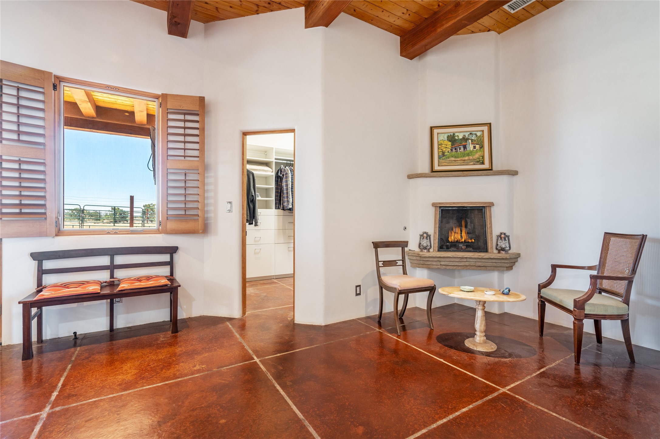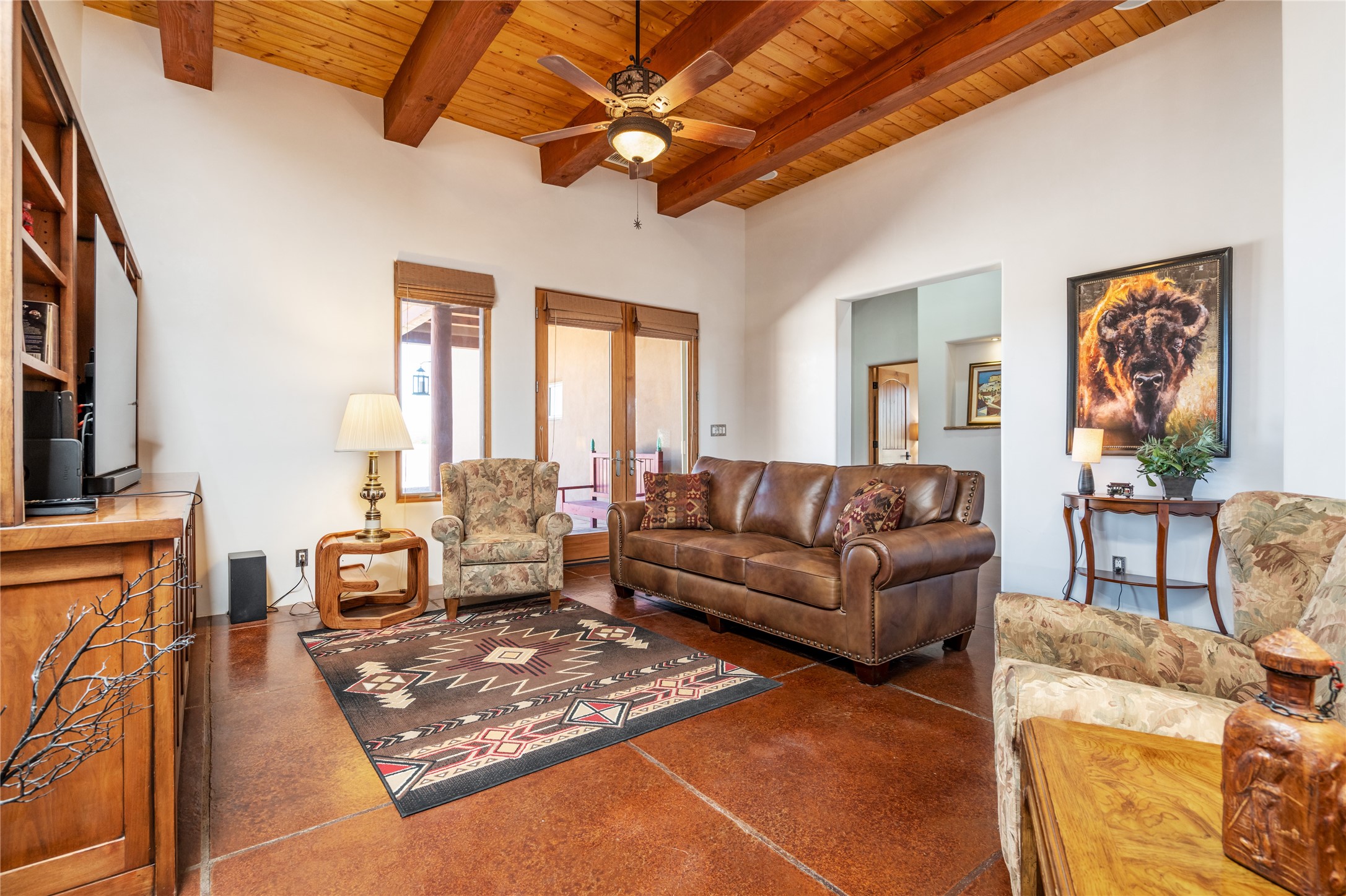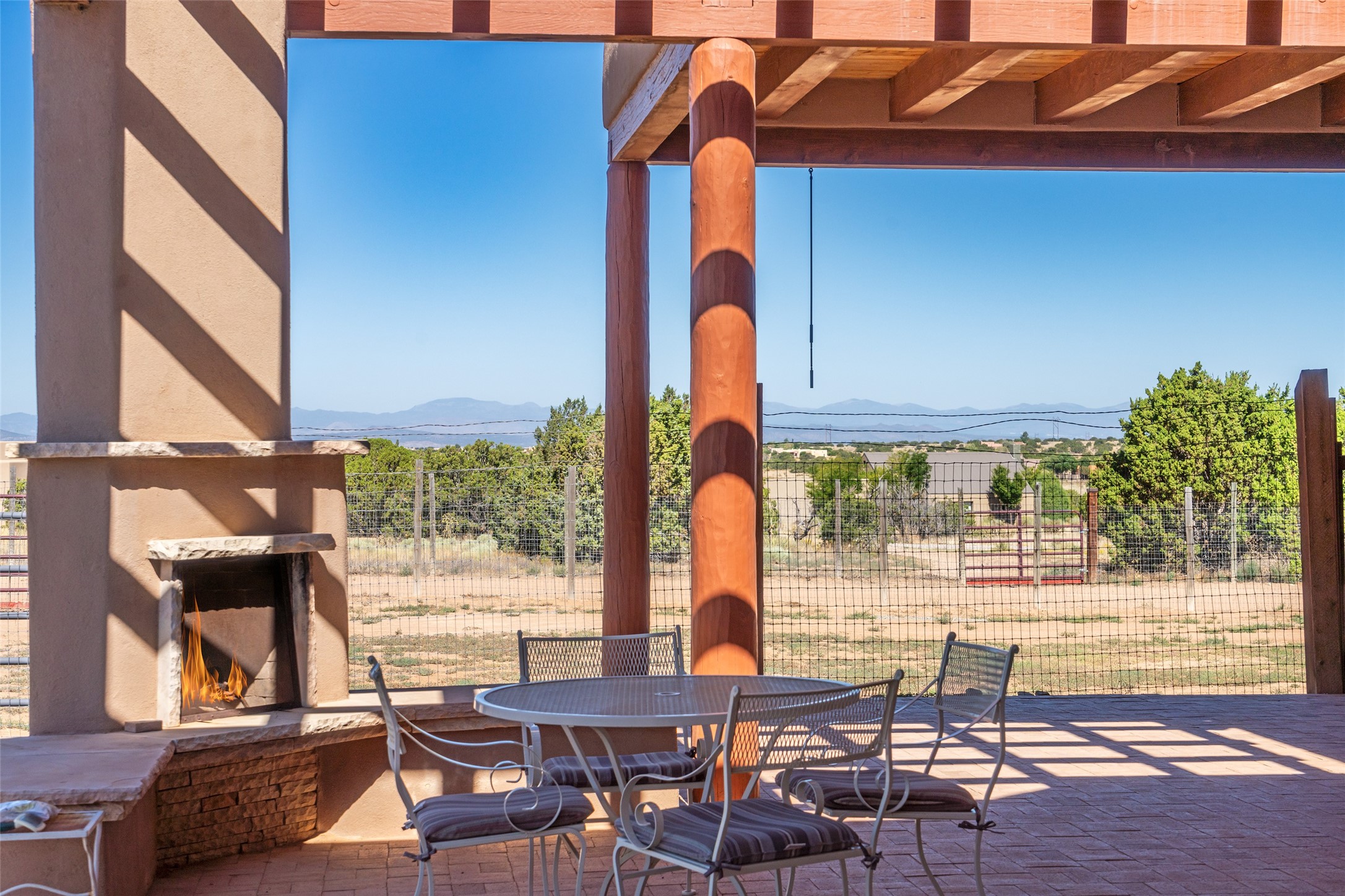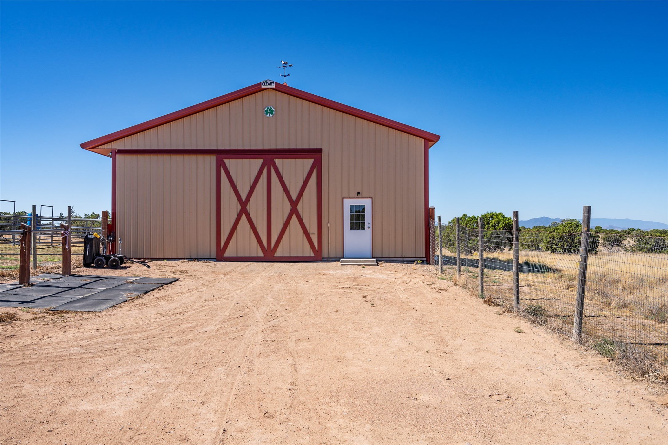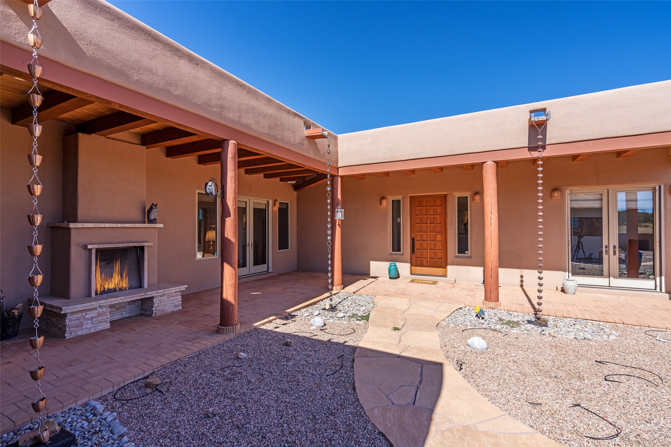 15 Silver Saddle is a 3 BRM/ 3.5 BATH main home with diamond plaster walls, polished concrete floors and wood beam high- ceilings throughout. The master suite is located on the western side of the house apart from the two additional en-suite guest bedrooms-- all with outdoor access. The master suite is well-appointed with a walk-in closet, a master bath with his and her sinks and water closets- along with a walk-in steam shower and soaking tub. Outdoor access from the master suite leads to a private outdoor area with a jacuzzi. However, it is the open concept cook's kitchen and adjacent entertaining room with a built-in wood bar that are the home's showstoppers. The almost 17-acre property also boasts a newly built (2017) two-bedroom 1,400 square foot guest house with high-end finishes and appliances throughout. Approx. 15 minutes to Santa Fe and conveniently located 5 minutes from the shopping area at Eldorado Santa Fe. For horse lovers the property has a Cleary barn, 3 horse stalls, an insulated tack room, an arena, a turnout and pasture. As an added bonus, there is direct access to Galisteo Basin Trails.