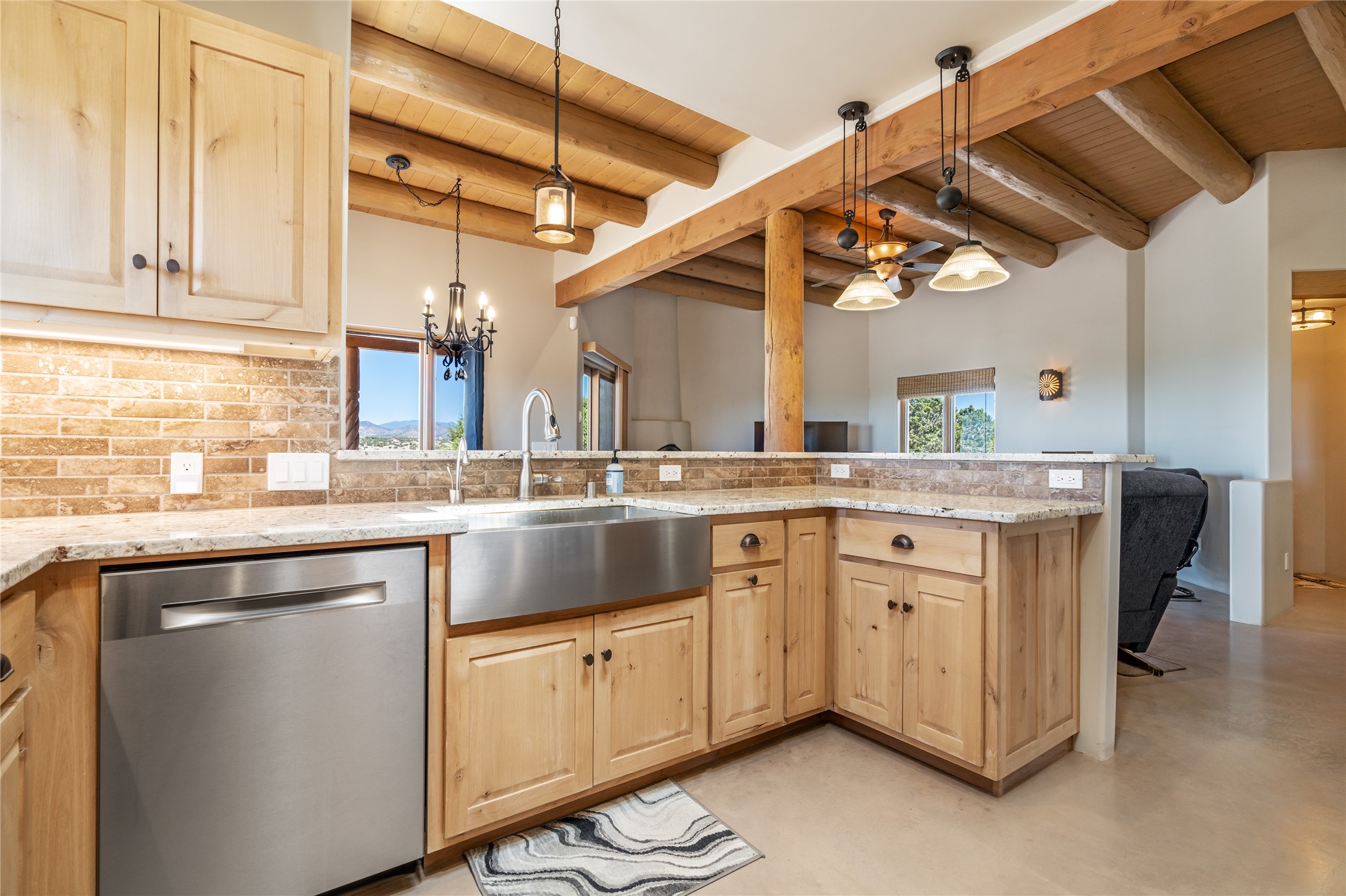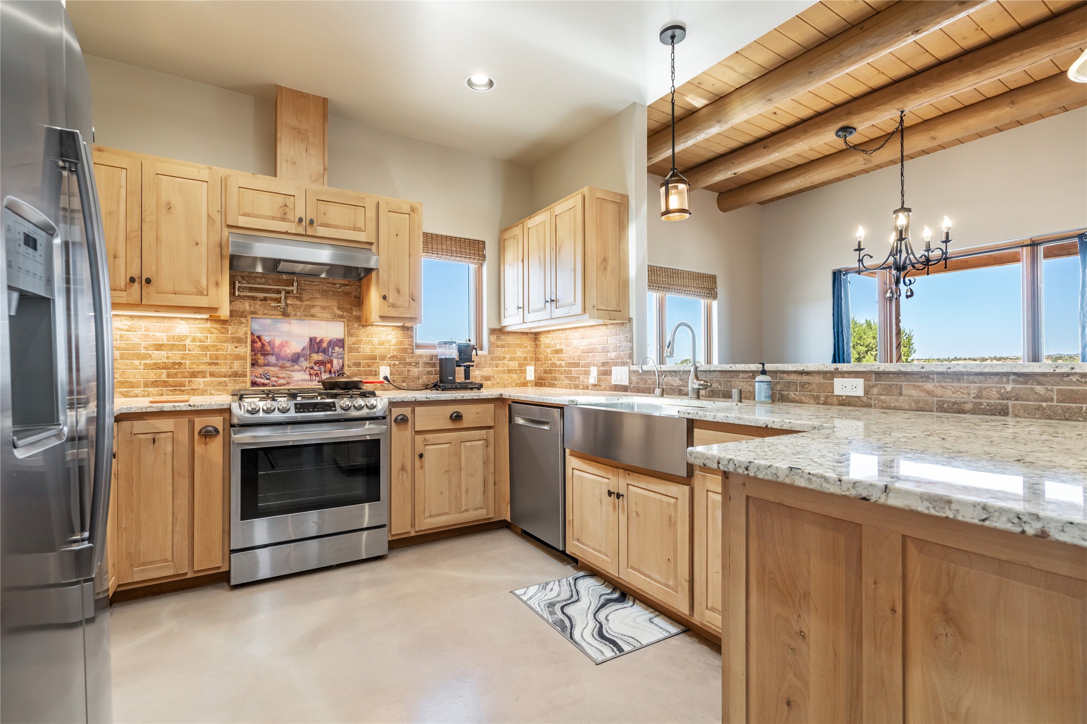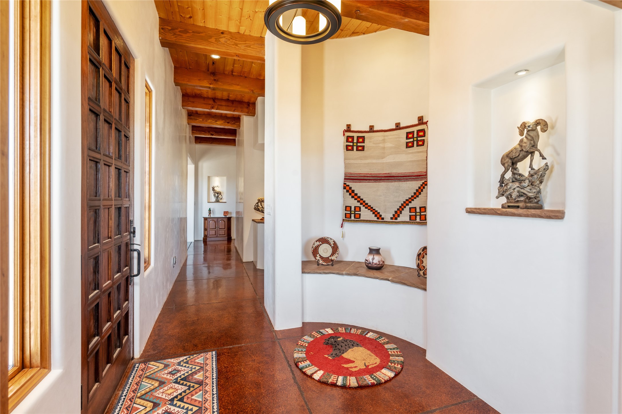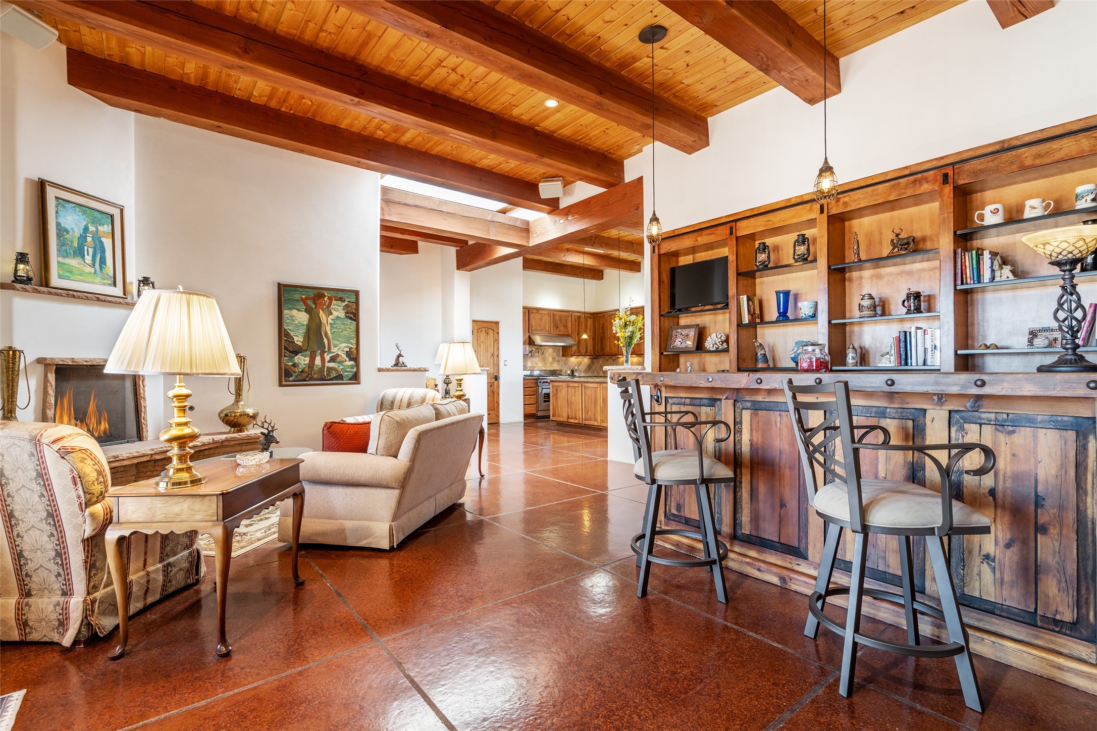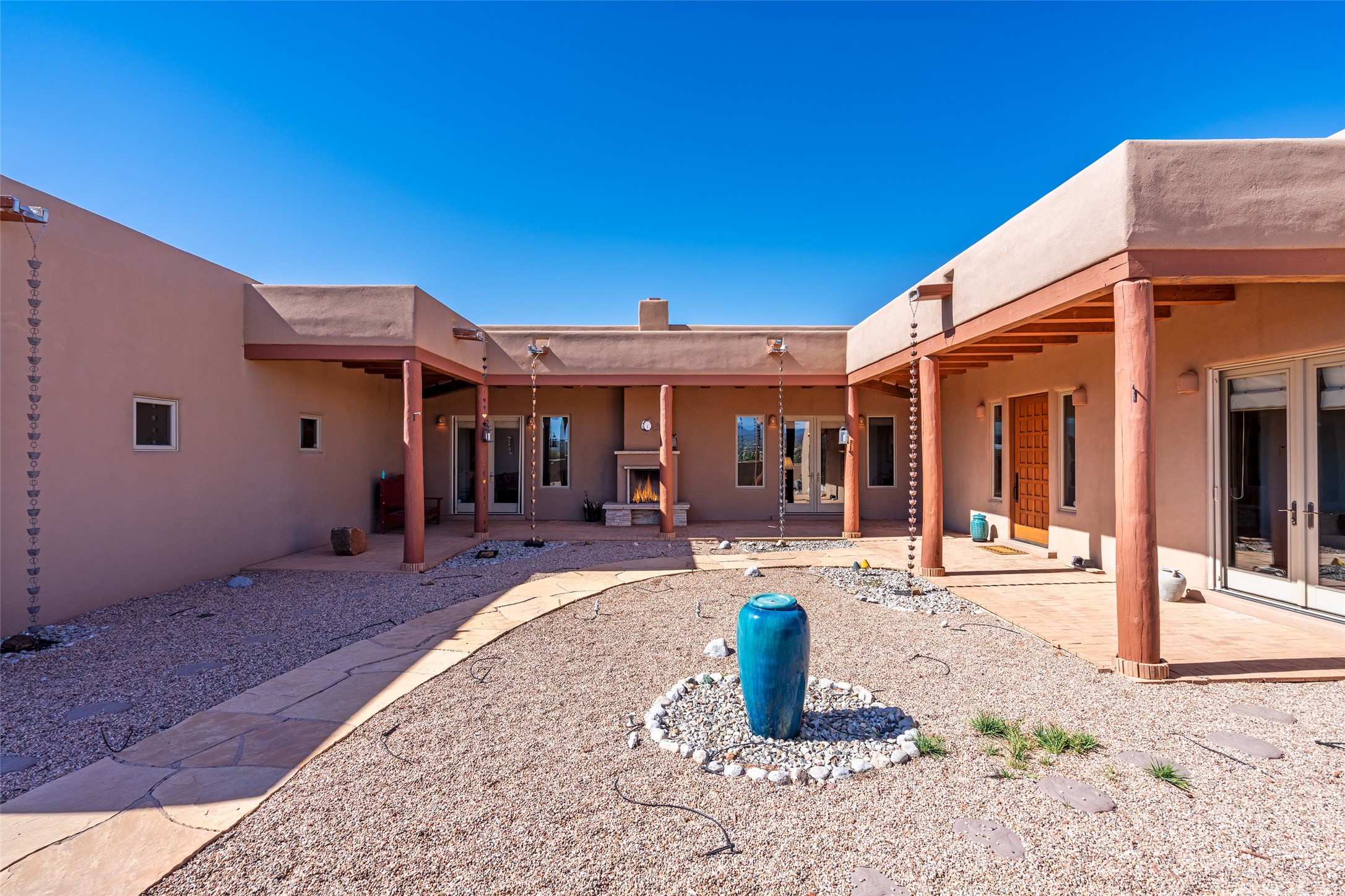 15 Silver Saddle is a 3 BRM/ 3.5 BATH main home with diamond plaster walls, polished concrete floors and wood beam high- ceilings throughout. The master suite is located on the western side of the house apart from the two additional en-suite guest bedrooms-- all with outdoor access. The master suite is well-appointed with a walk-in closet, a master bath with his and her sinks and water closets- along with a walk-in steam shower and soaking tub. Outdoor access from the master suite leads to a private outdoor area with a jacuzzi. However, it is the open concept cook's kitchen and adjacent entertaining room with a built-in wood bar that are the home's showstoppers. The almost 17-acre property also boasts a newly built (2017) two-bedroom 1,400 square foot guest house with high-end finishes and appliances throughout. Approx. 15 minutes to Santa Fe and conveniently located 5 minutes from the shopping area at Eldorado Santa Fe. For horse lovers the property has a Cleary barn, 3 horse stalls, an insulated tack room, an arena, a turnout and pasture. As an added bonus, there is direct access to Galisteo Basin Trails.
