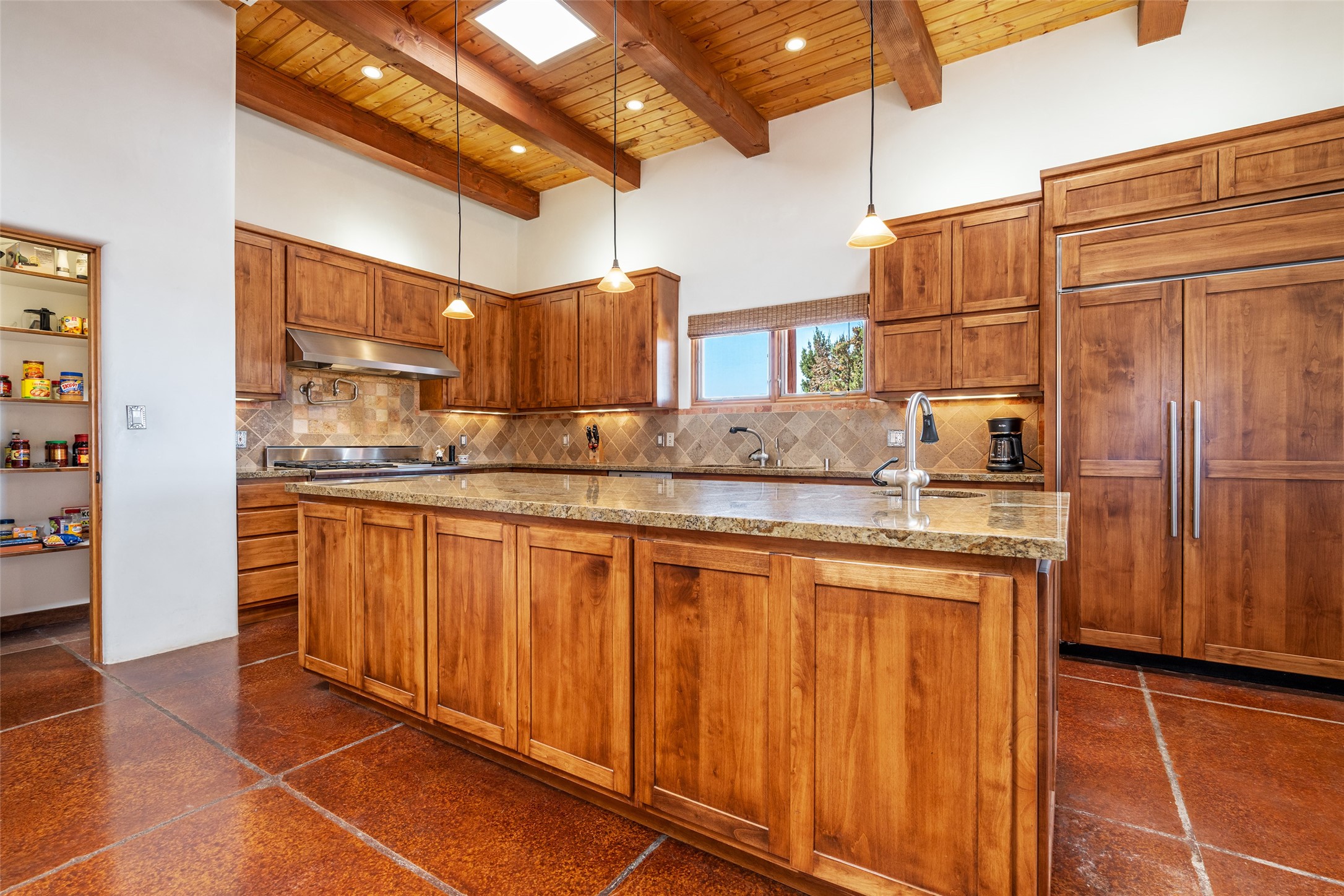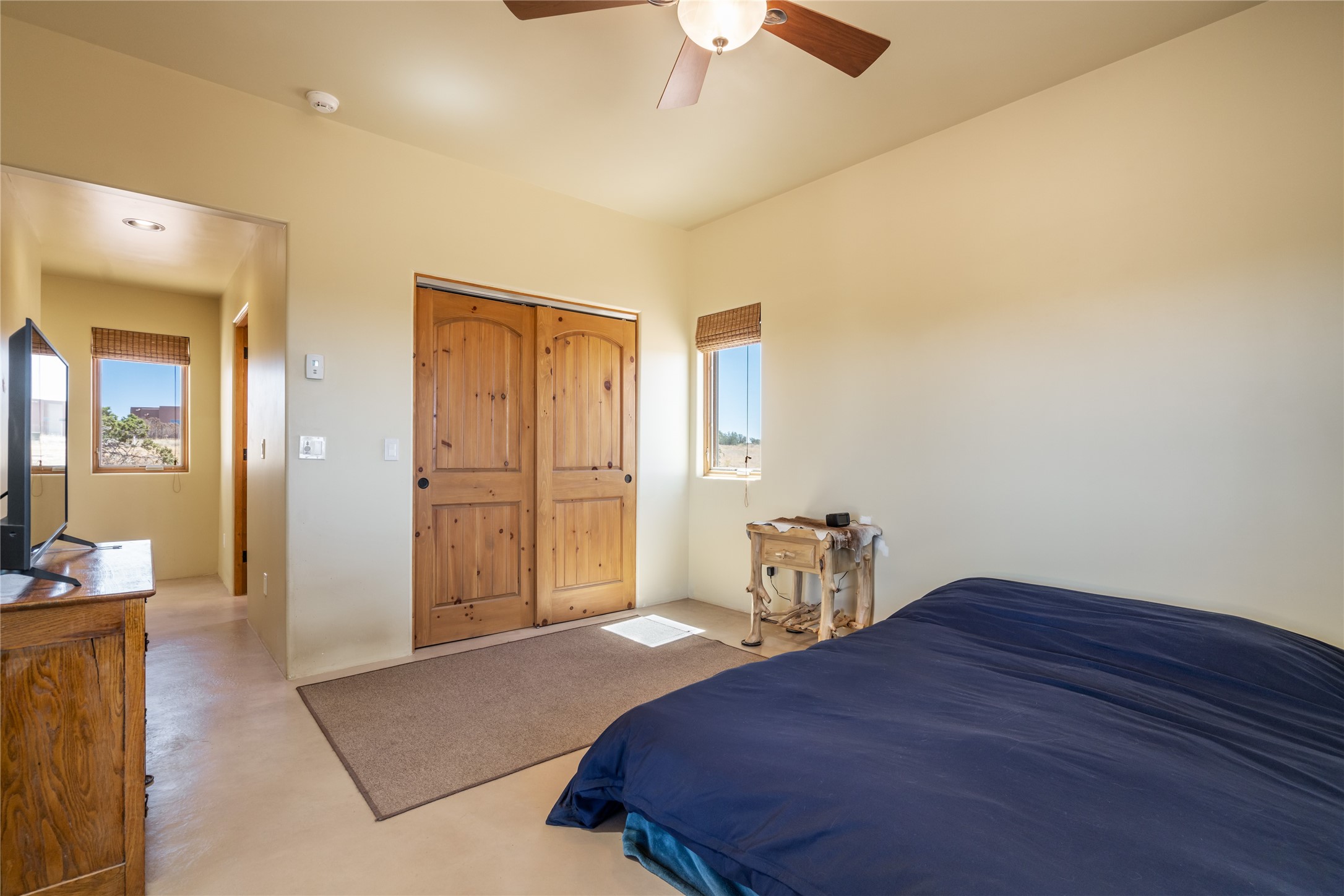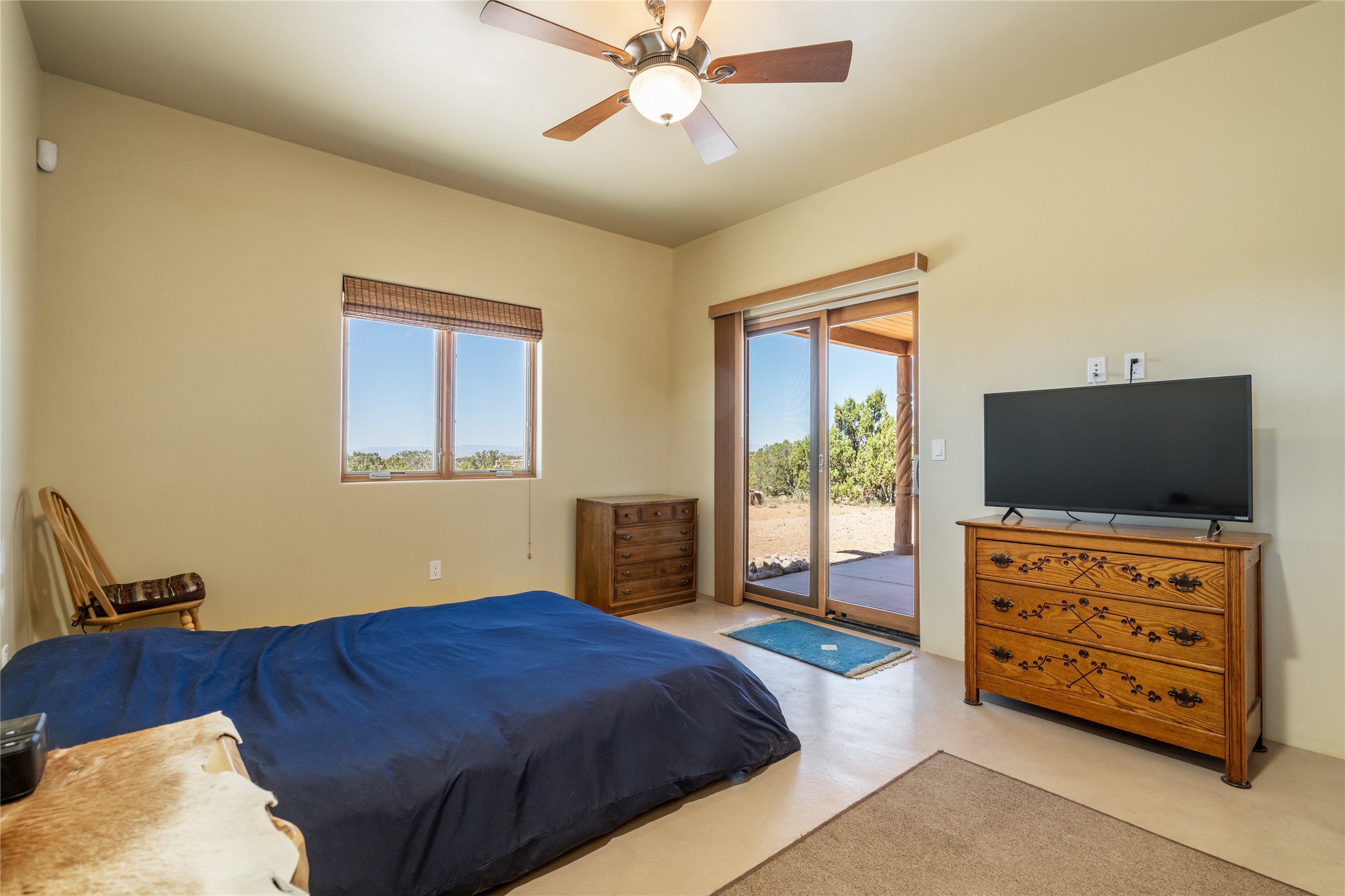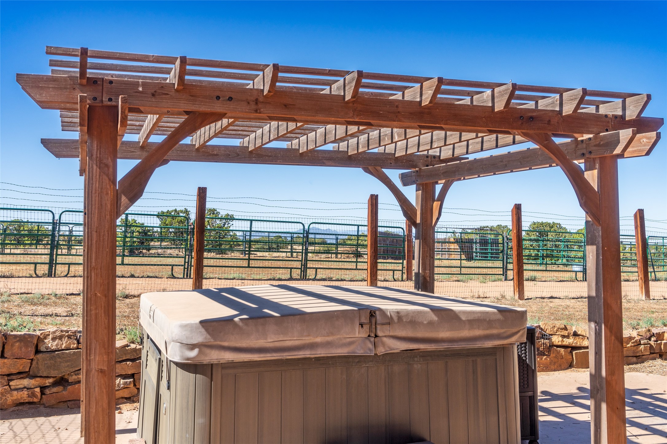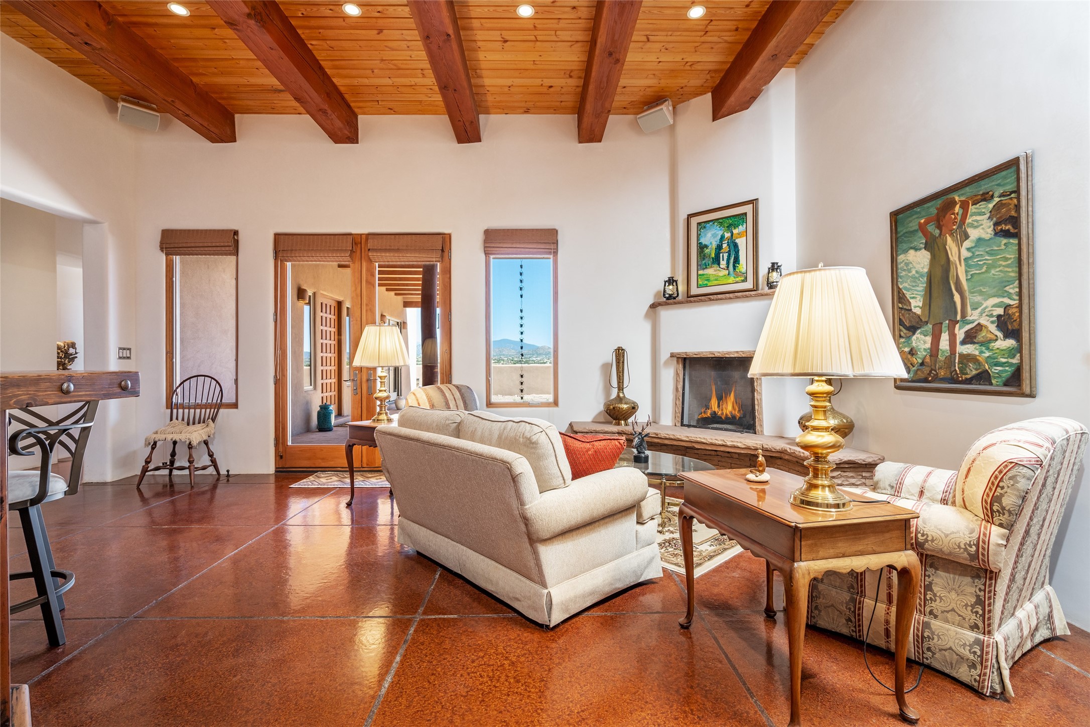 15 Silver Saddle is a 3 BRM/ 3.5 BATH main home with diamond plaster walls, polished concrete floors and wood beam high- ceilings throughout. The master suite is located on the western side of the house apart from the two additional en-suite guest bedrooms-- all with outdoor access. The master suite is well-appointed with a walk-in closet, a master bath with his and her sinks and water closets- along with a walk-in steam shower and soaking tub. Outdoor access from the master suite leads to a private outdoor area with a jacuzzi. However, it is the open concept cook's kitchen and adjacent entertaining room with a built-in wood bar that are the home's showstoppers. The almost 17-acre property also boasts a newly built (2017) two-bedroom 1,400 square foot guest house with high-end finishes and appliances throughout. Approx. 15 minutes to Santa Fe and conveniently located 5 minutes from the shopping area at Eldorado Santa Fe. For horse lovers the property has a Cleary barn, 3 horse stalls, an insulated tack room, an arena, a turnout and pasture. As an added bonus, there is direct access to Galisteo Basin Trails.