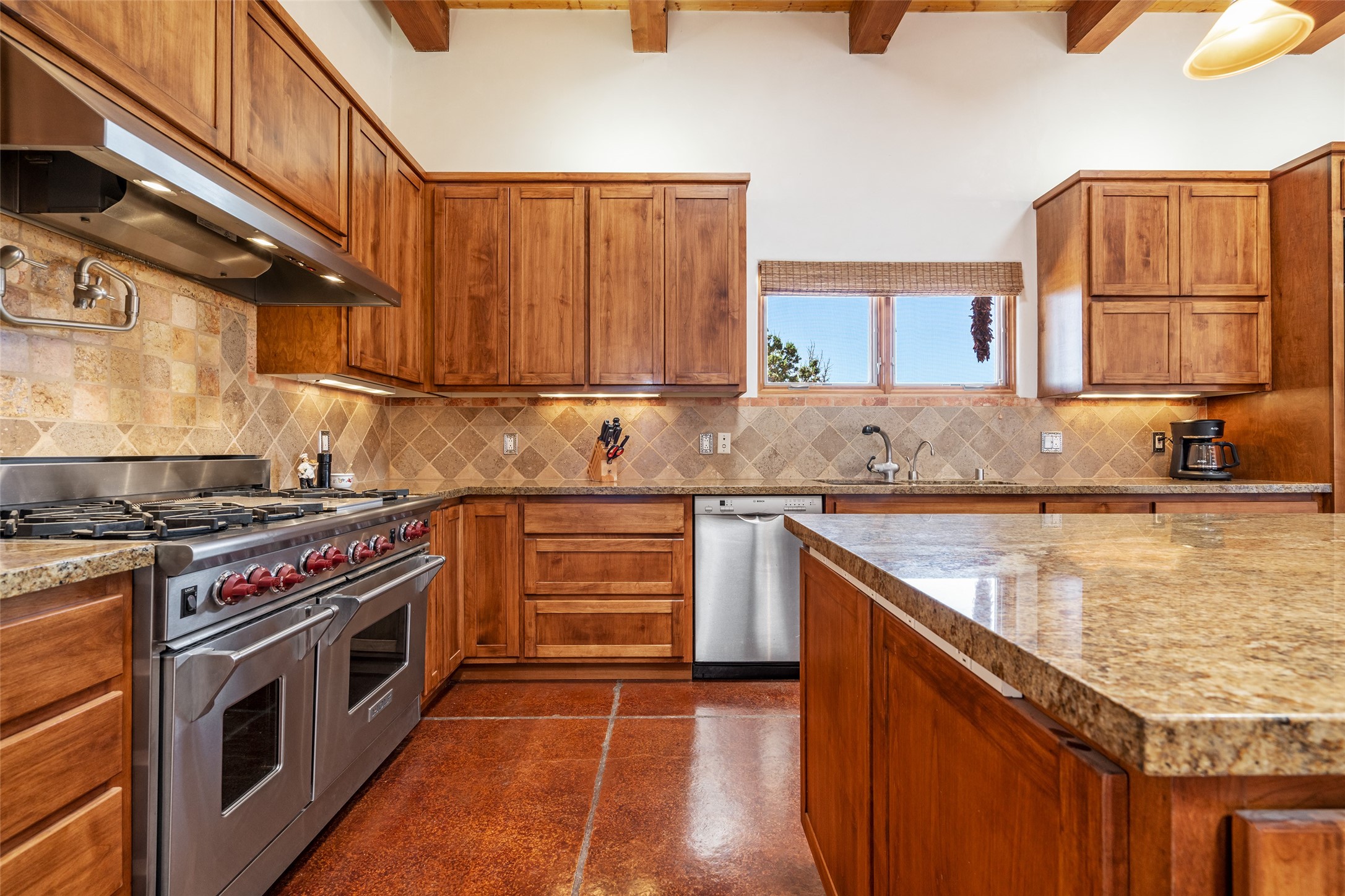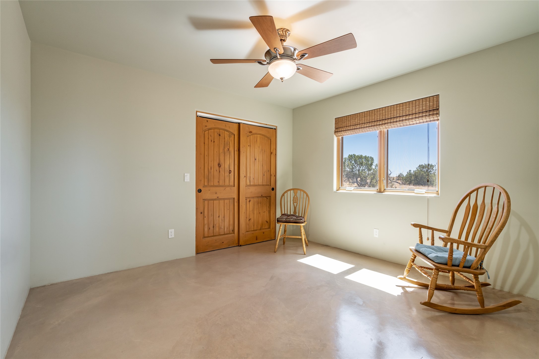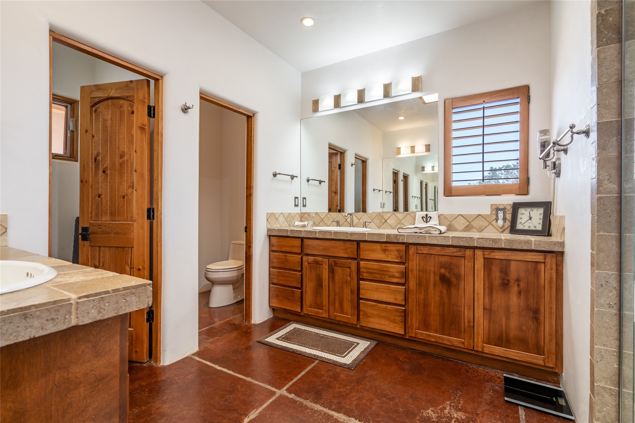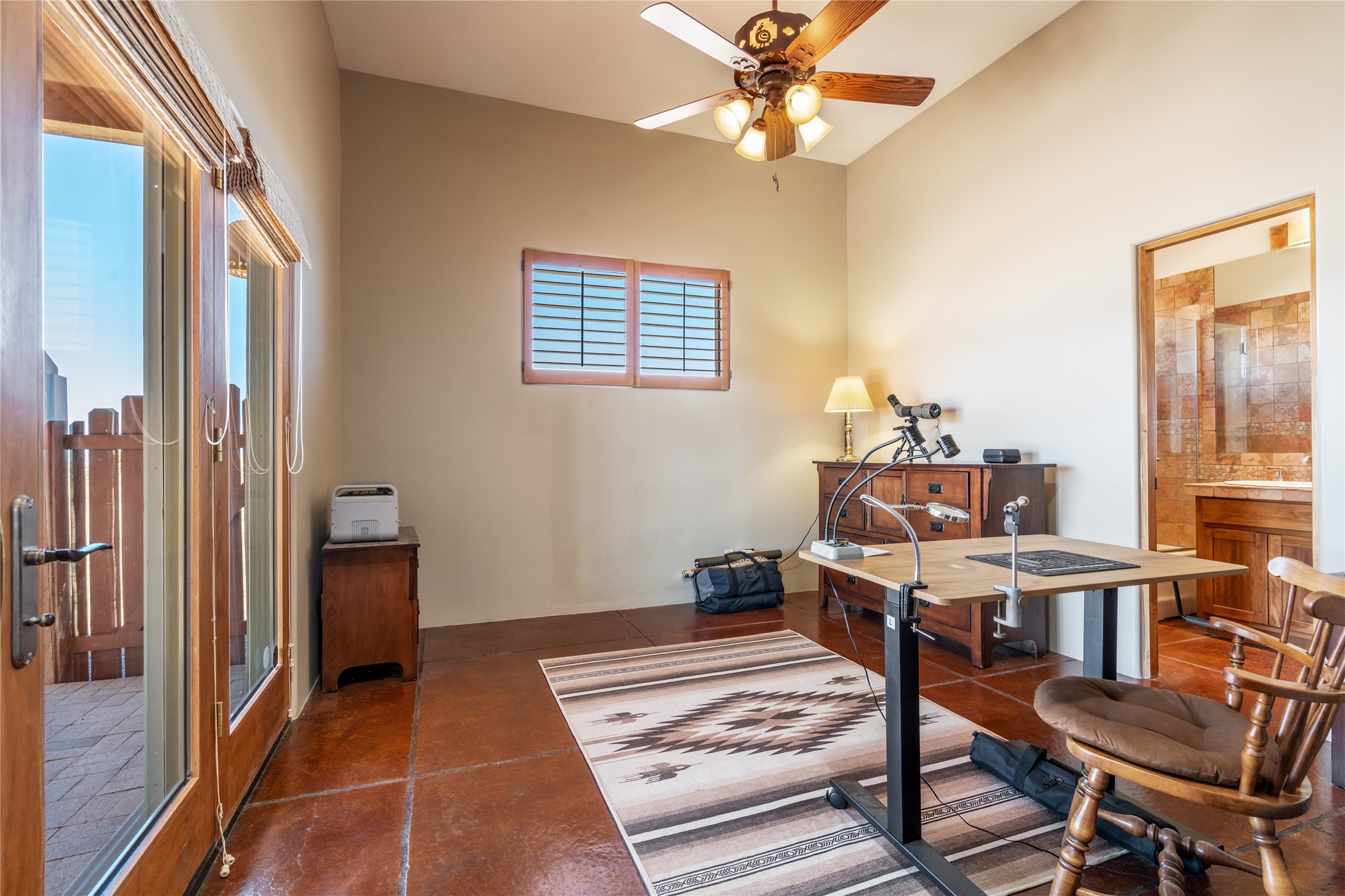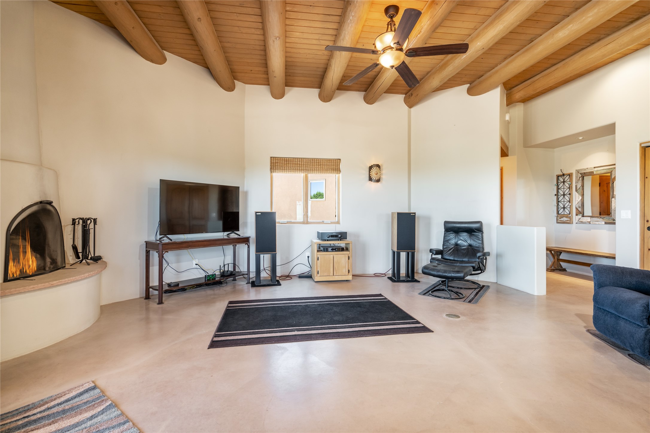 15 Silver Saddle is a 3 BRM/ 3.5 BATH main home with diamond plaster walls, polished concrete floors and wood beam high- ceilings throughout. The master suite is located on the western side of the house apart from the two additional en-suite guest bedrooms-- all with outdoor access. The master suite is well-appointed with a walk-in closet, a master bath with his and her sinks and water closets- along with a walk-in steam shower and soaking tub. Outdoor access from the master suite leads to a private outdoor area with a jacuzzi. However, it is the open concept cook's kitchen and adjacent entertaining room with a built-in wood bar that are the home's showstoppers. The almost 17-acre property also boasts a newly built (2017) two-bedroom 1,400 square foot guest house with high-end finishes and appliances throughout. Approx. 15 minutes to Santa Fe and conveniently located 5 minutes from the shopping area at Eldorado Santa Fe. For horse lovers the property has a Cleary barn, 3 horse stalls, an insulated tack room, an arena, a turnout and pasture. As an added bonus, there is direct access to Galisteo Basin Trails.