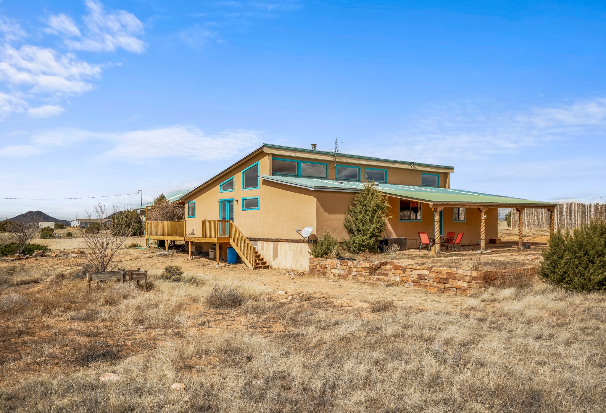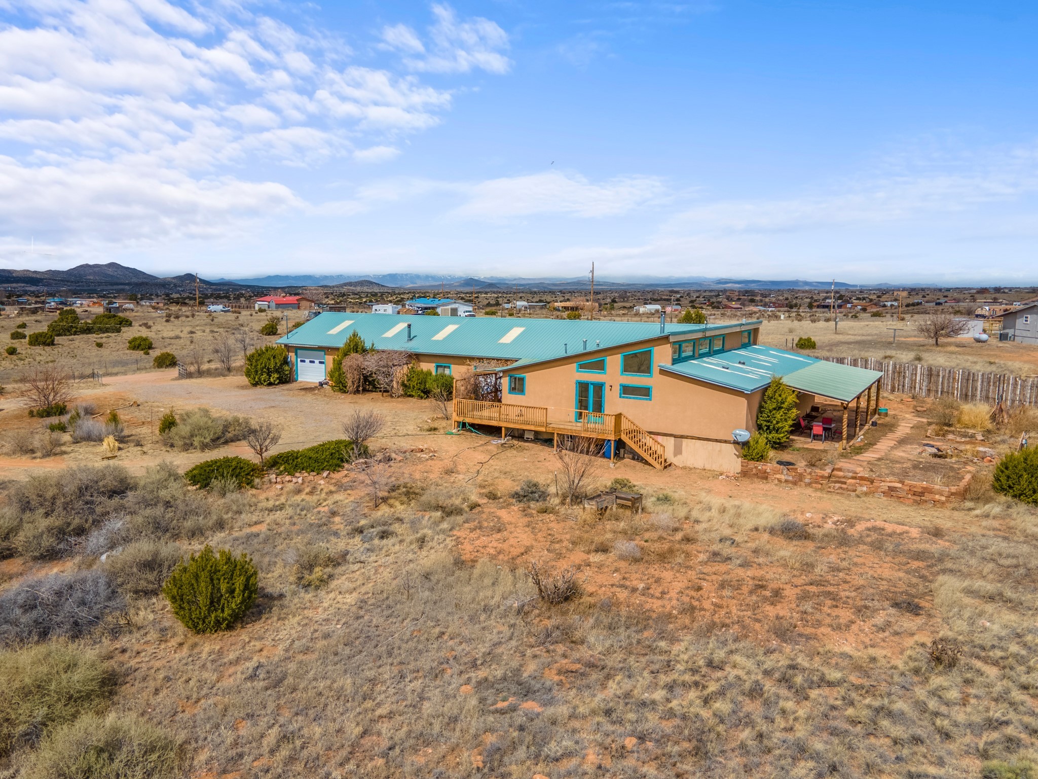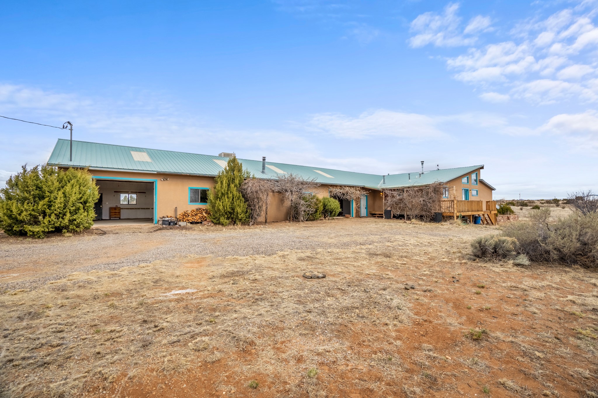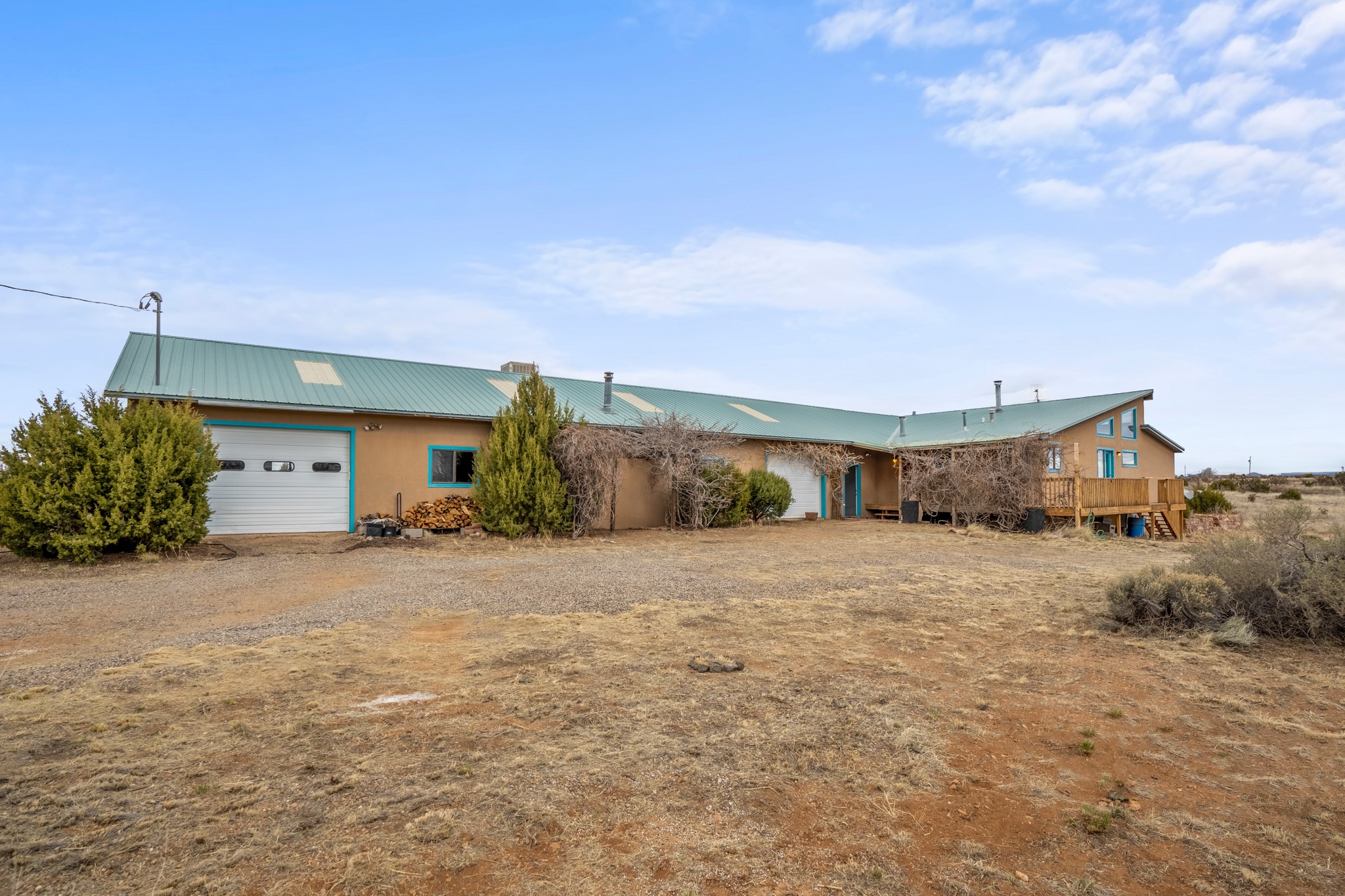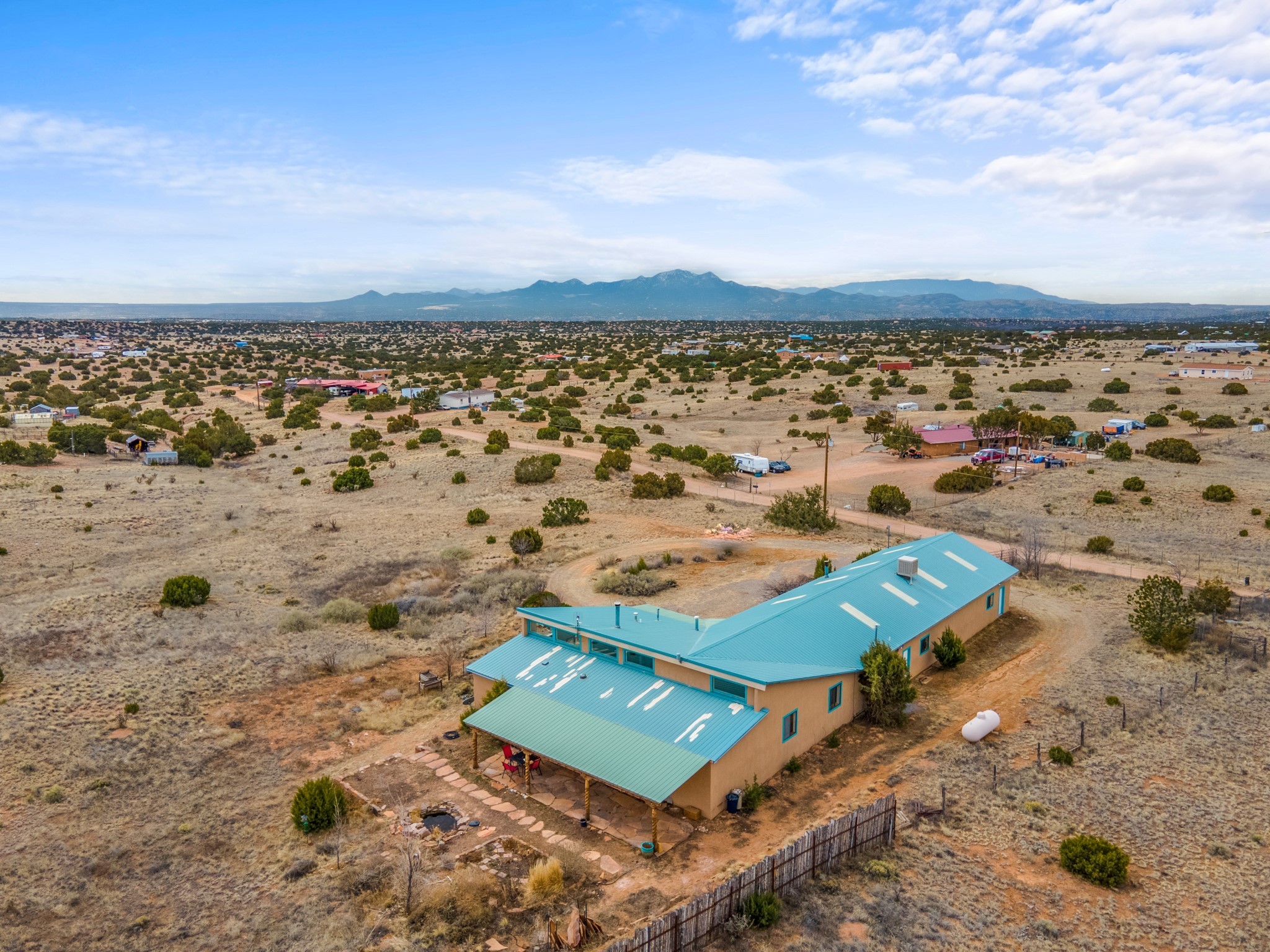 Beautiful customized modular home on almost 5 acres. An artist or craft person's dream with a nearly 2,200 square foot ATTACHED STUDIO/WORKSHOP on its own electrical panel, with a wood heater, evaporative cooler, gas stub out, electrical outlets throughout, and two garage doors! The 2,275 square foot main home features raised vaulted tongue and groove wood ceilings, an open concept great room with clerestory windows, solar tube, and a wood burning stove. Lots of natural light. This does not feel like a modular home! Three bedrooms each with their own walk-in closet and an office. Wonderful views from all directions. Private well. Primary bathroom has a jetted tub, separate shower and double sinks. 5 Hydroviv filters installed, one on each shower, one in the kitchen sink, and two on bathroom sinks. Wrap around porch in the front and a patio with a wood portal off the back of the home with a small pond, perfect for relaxing and taking in the views. The whole home has been freshly painted and professionally cleaned including windows. According to Seller, the metal roof may have been installed within the last 6 years. New hot water heater with instant hot circulation, and stainless steel farm sink in the kitchen recently installed. Gas range is only two years old. Make this Santa Fe escape and live/work dream a reality!