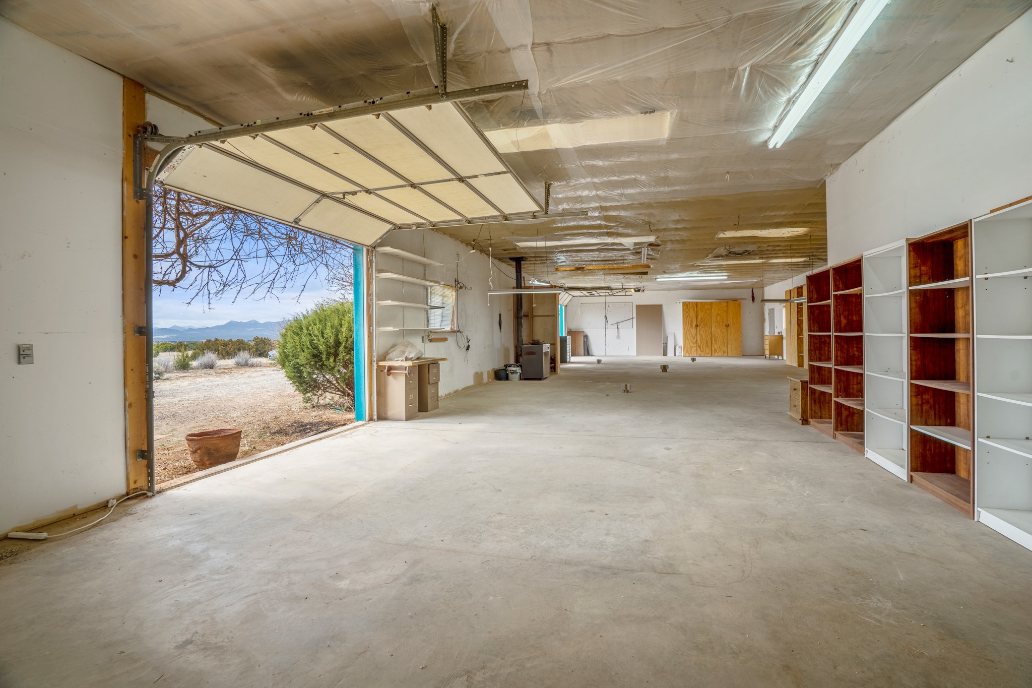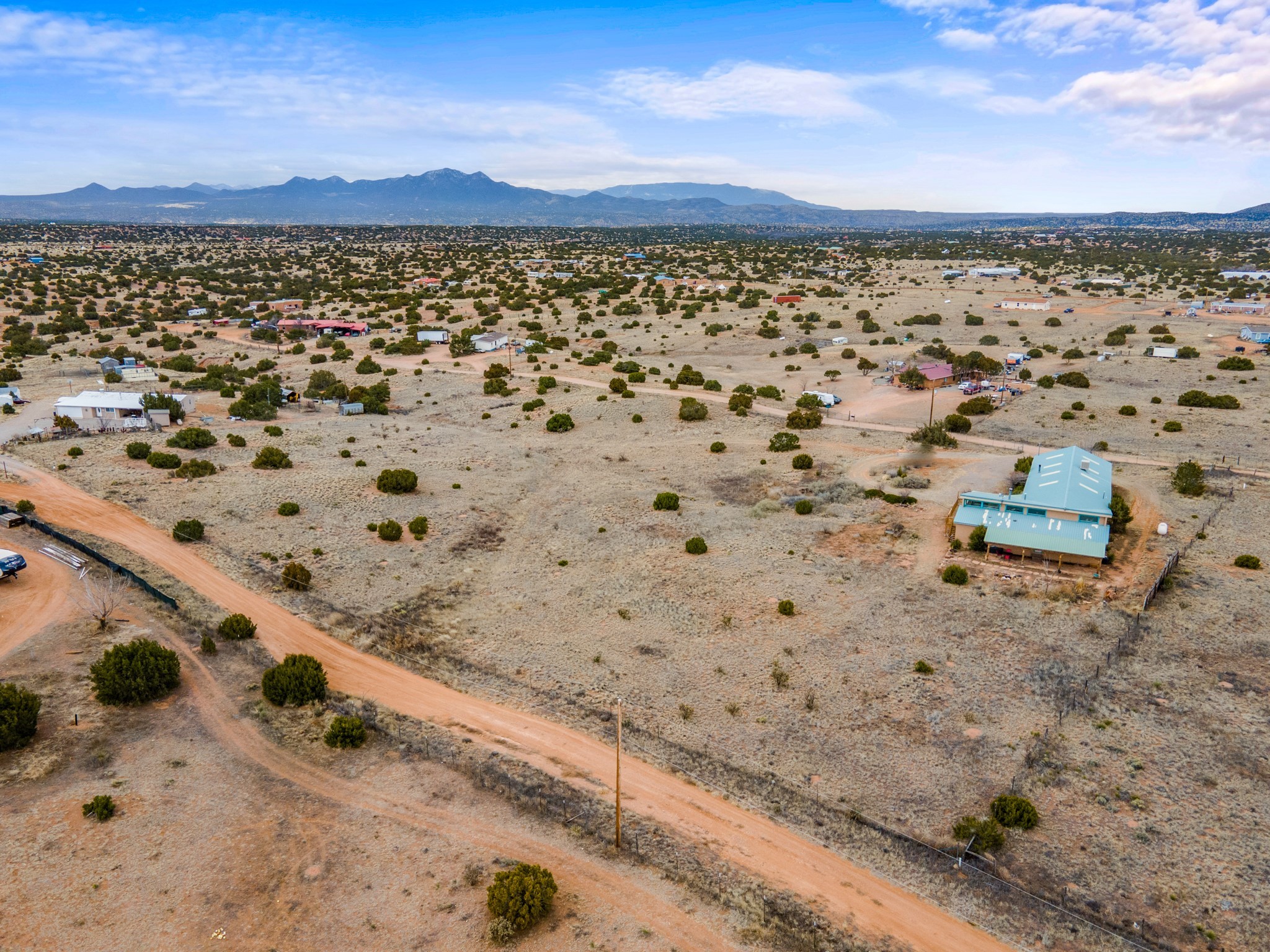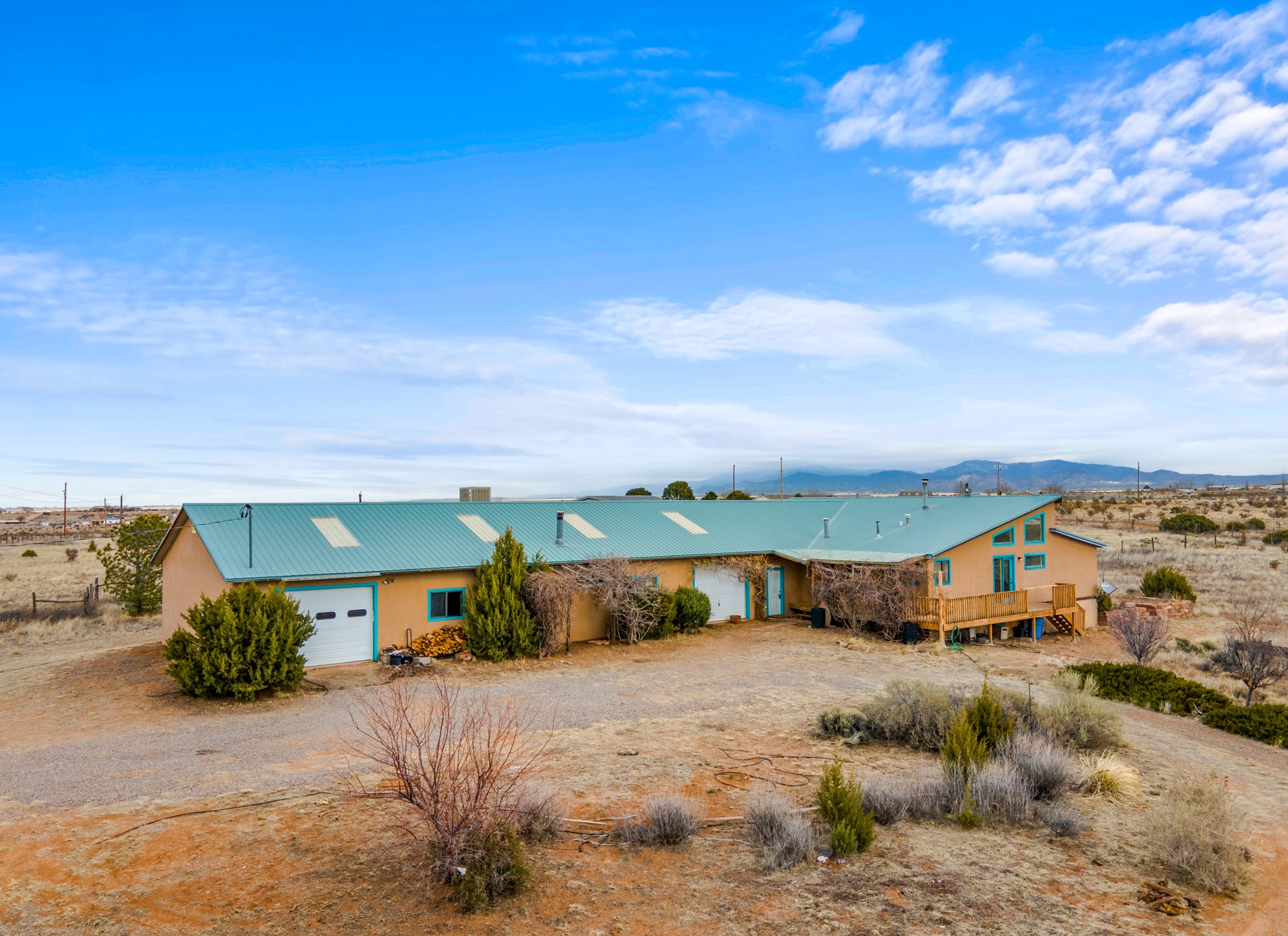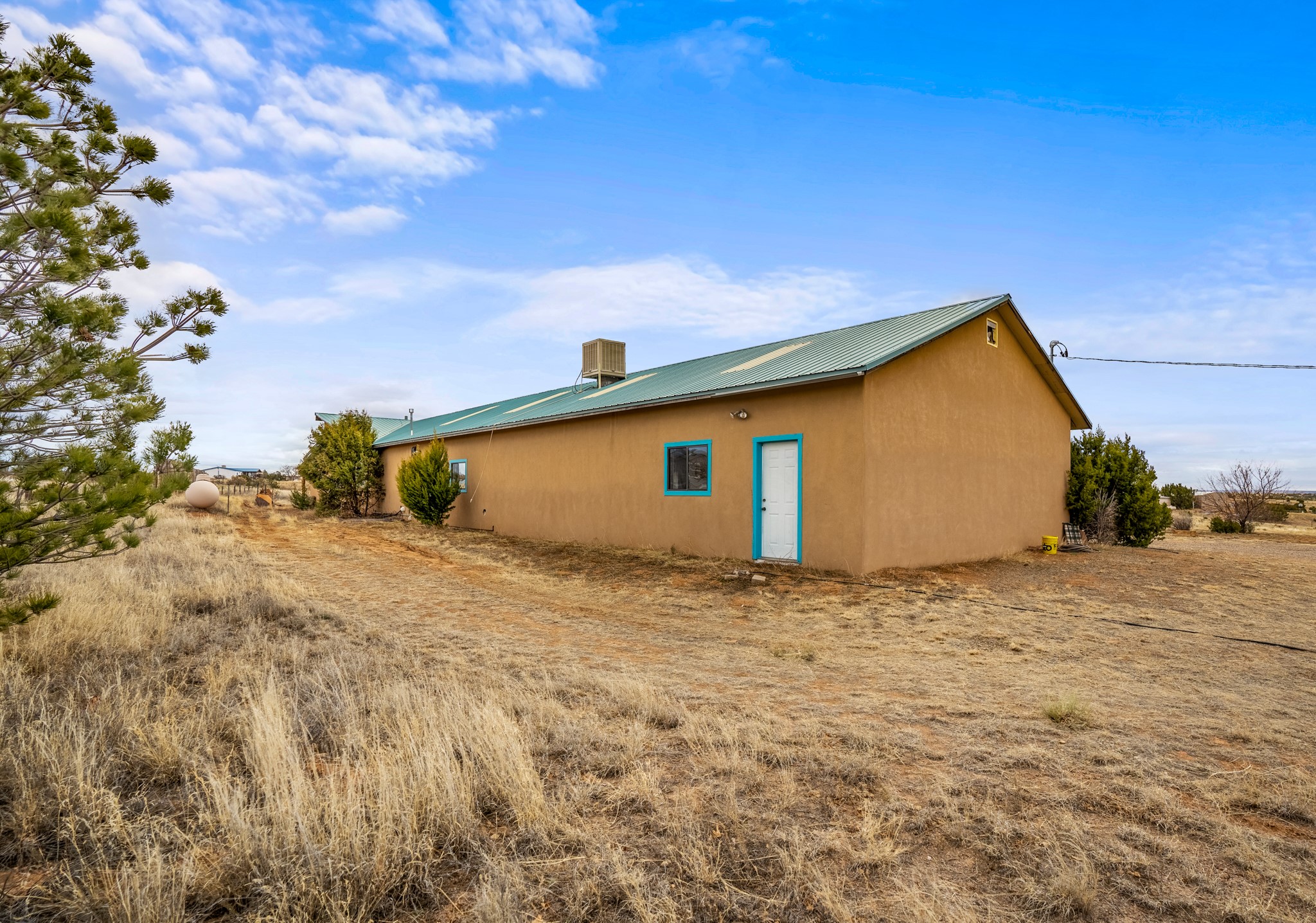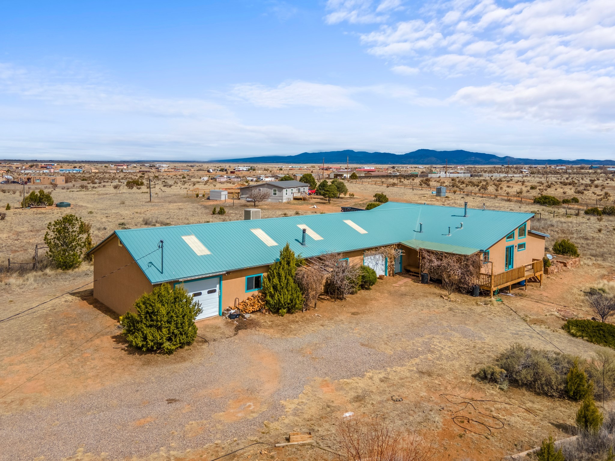 Beautiful customized modular home on almost 5 acres. An artist or craft person's dream with a nearly 2,200 square foot ATTACHED STUDIO/WORKSHOP on its own electrical panel, with a wood heater, evaporative cooler, gas stub out, electrical outlets throughout, and two garage doors! The 2,275 square foot main home features raised vaulted tongue and groove wood ceilings, an open concept great room with clerestory windows, solar tube, and a wood burning stove. Lots of natural light. This does not feel like a modular home! Three bedrooms each with their own walk-in closet and an office. Wonderful views from all directions. Private well. Primary bathroom has a jetted tub, separate shower and double sinks. 5 Hydroviv filters installed, one on each shower, one in the kitchen sink, and two on bathroom sinks. Wrap around porch in the front and a patio with a wood portal off the back of the home with a small pond, perfect for relaxing and taking in the views. The whole home has been freshly painted and professionally cleaned including windows. According to Seller, the metal roof may have been installed within the last 6 years. New hot water heater with instant hot circulation, and stainless steel farm sink in the kitchen recently installed. Gas range is only two years old. Make this Santa Fe escape and live/work dream a reality!
