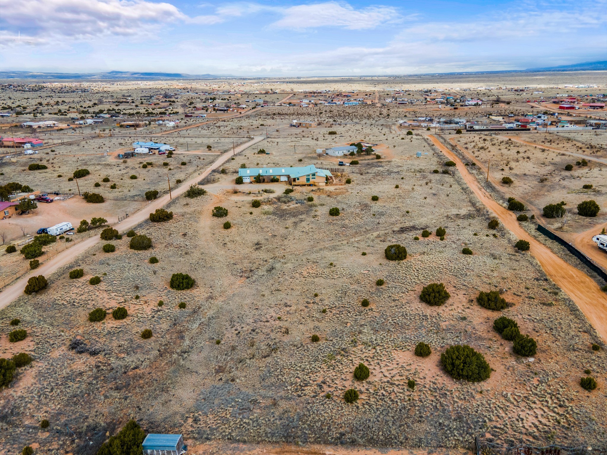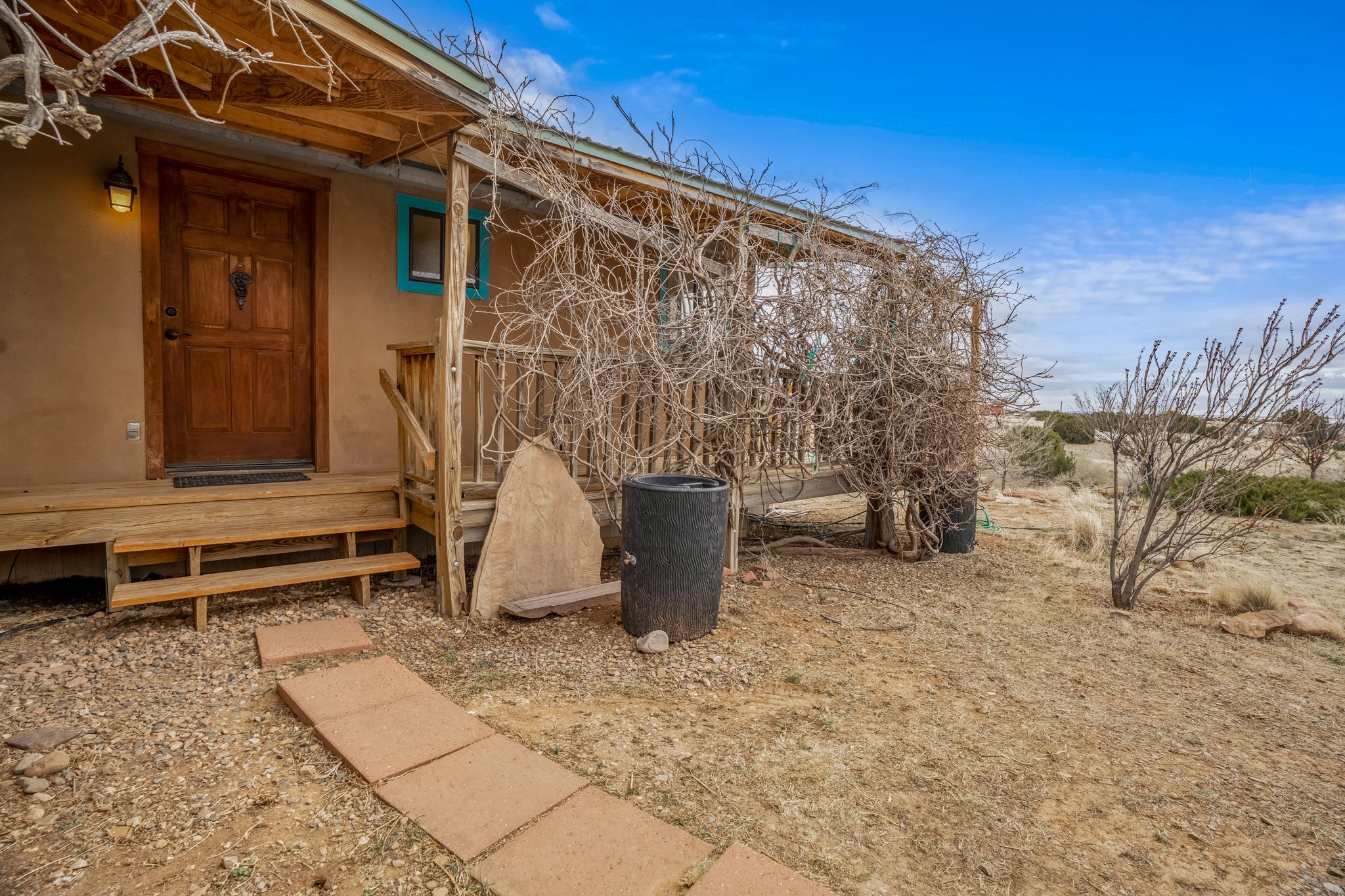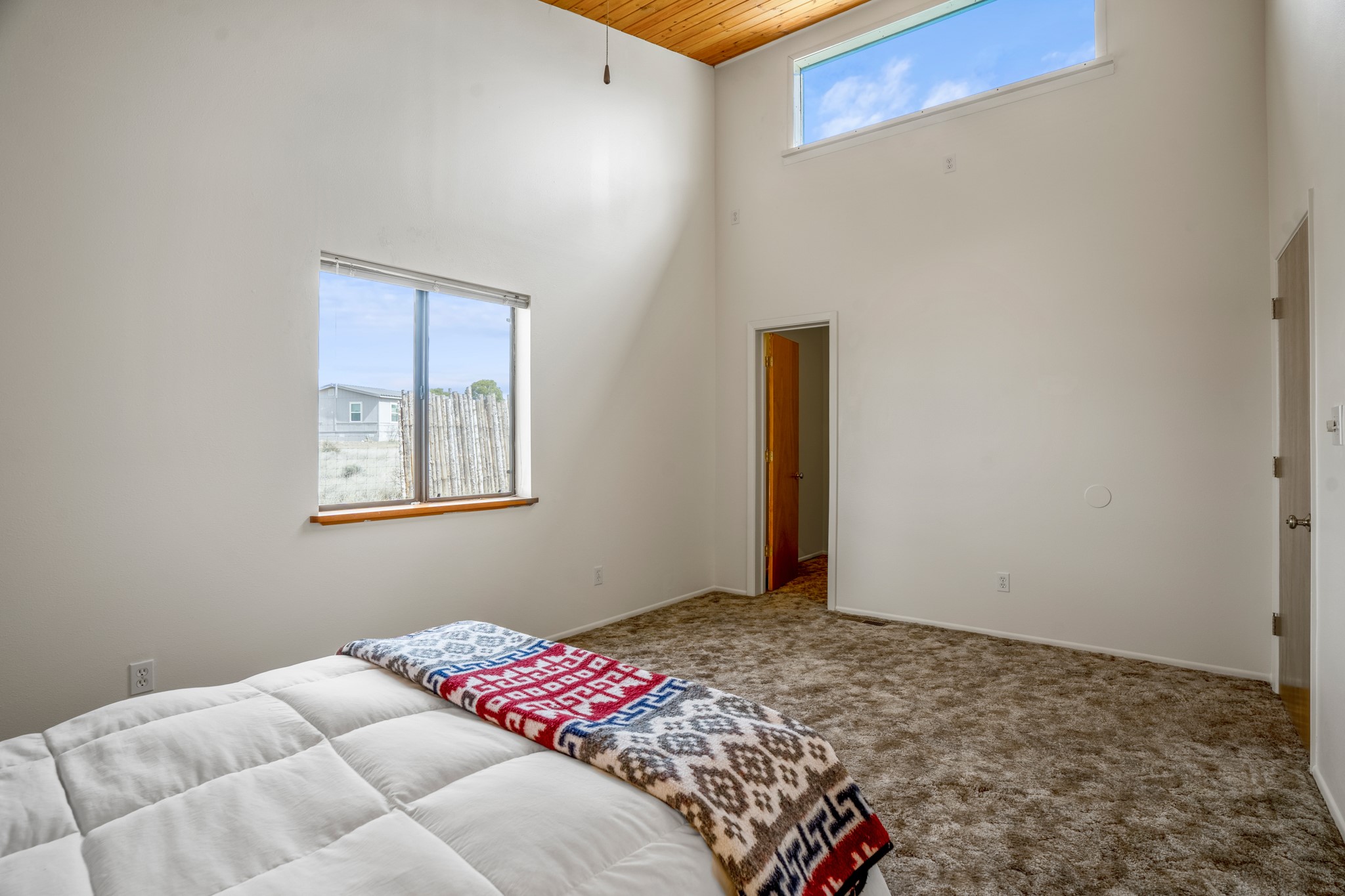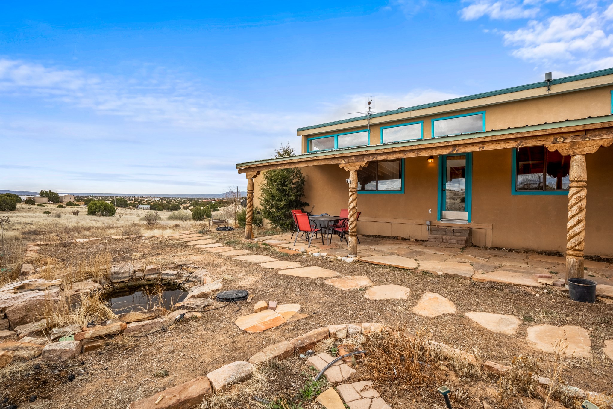 Beautiful customized modular home on almost 5 acres. An artist or craft person's dream with a nearly 2,200 square foot ATTACHED STUDIO/WORKSHOP on its own electrical panel, with a wood heater, evaporative cooler, gas stub out, electrical outlets throughout, and two garage doors! The 2,275 square foot main home features raised vaulted tongue and groove wood ceilings, an open concept great room with clerestory windows, solar tube, and a wood burning stove. Lots of natural light. This does not feel like a modular home! Three bedrooms each with their own walk-in closet and an office. Wonderful views from all directions. Private well. Primary bathroom has a jetted tub, separate shower and double sinks. 5 Hydroviv filters installed, one on each shower, one in the kitchen sink, and two on bathroom sinks. Wrap around porch in the front and a patio with a wood portal off the back of the home with a small pond, perfect for relaxing and taking in the views. The whole home has been freshly painted and professionally cleaned including windows. According to Seller, the metal roof may have been installed within the last 6 years. New hot water heater with instant hot circulation, and stainless steel farm sink in the kitchen recently installed. Gas range is only two years old. Make this Santa Fe escape and live/work dream a reality!