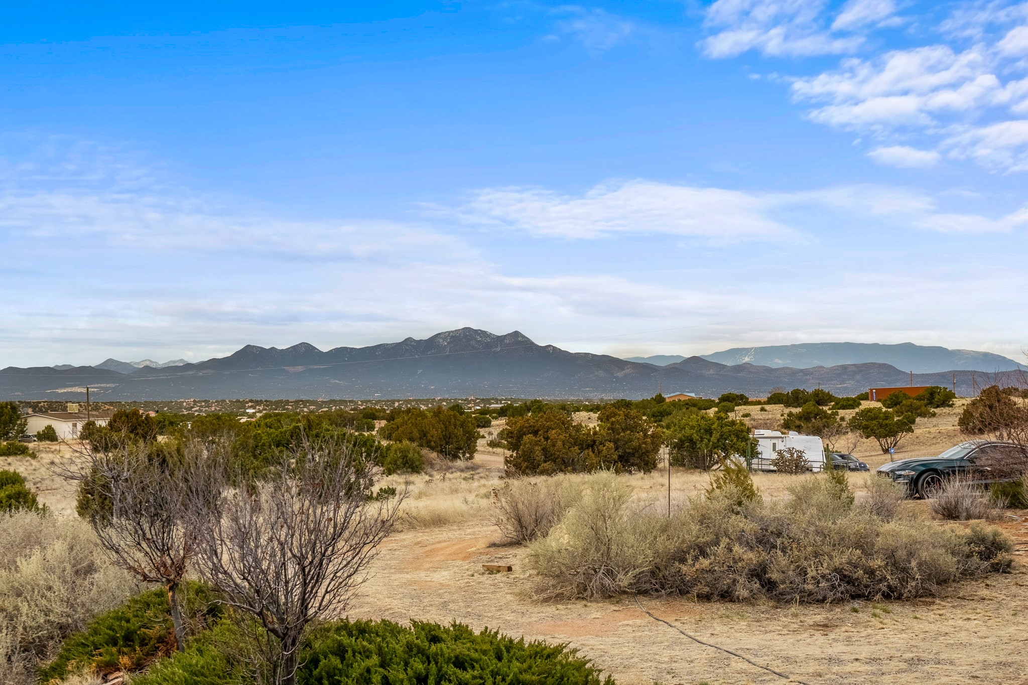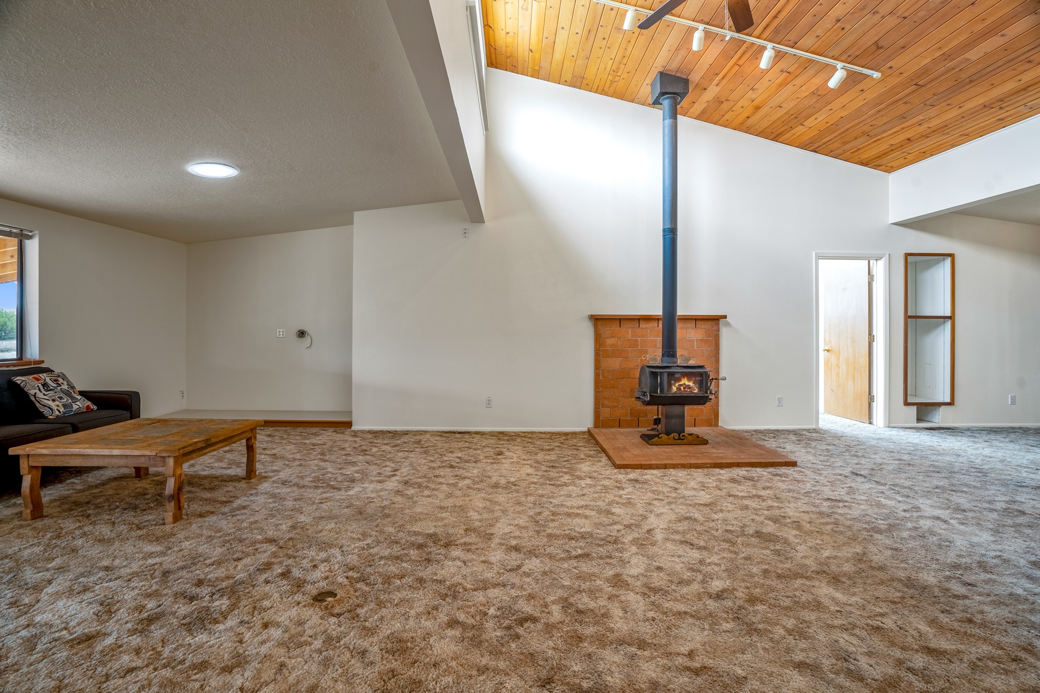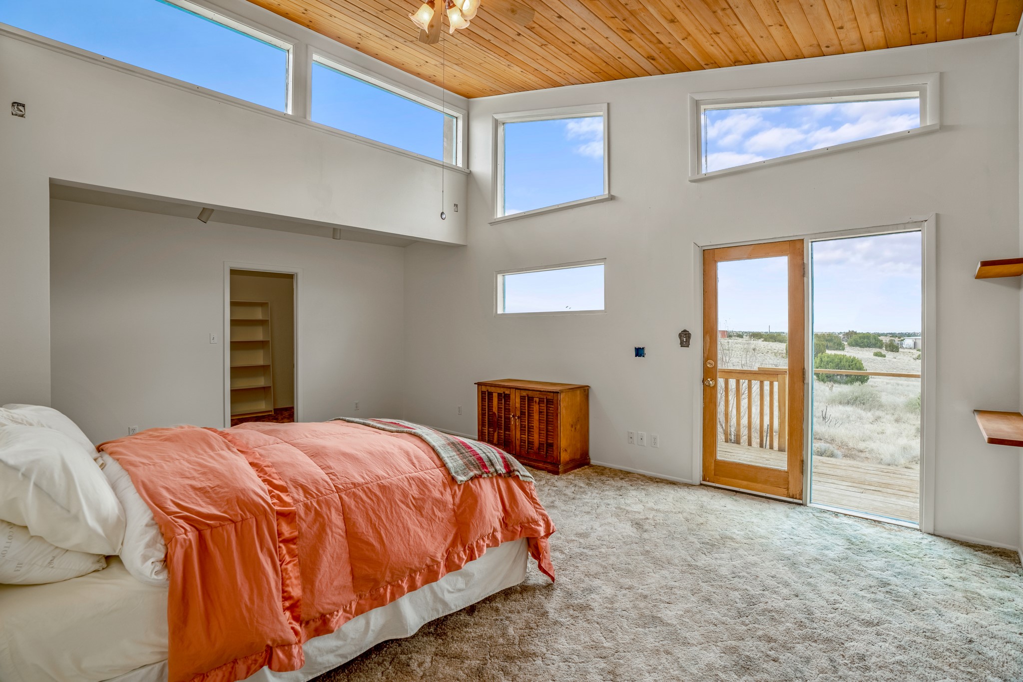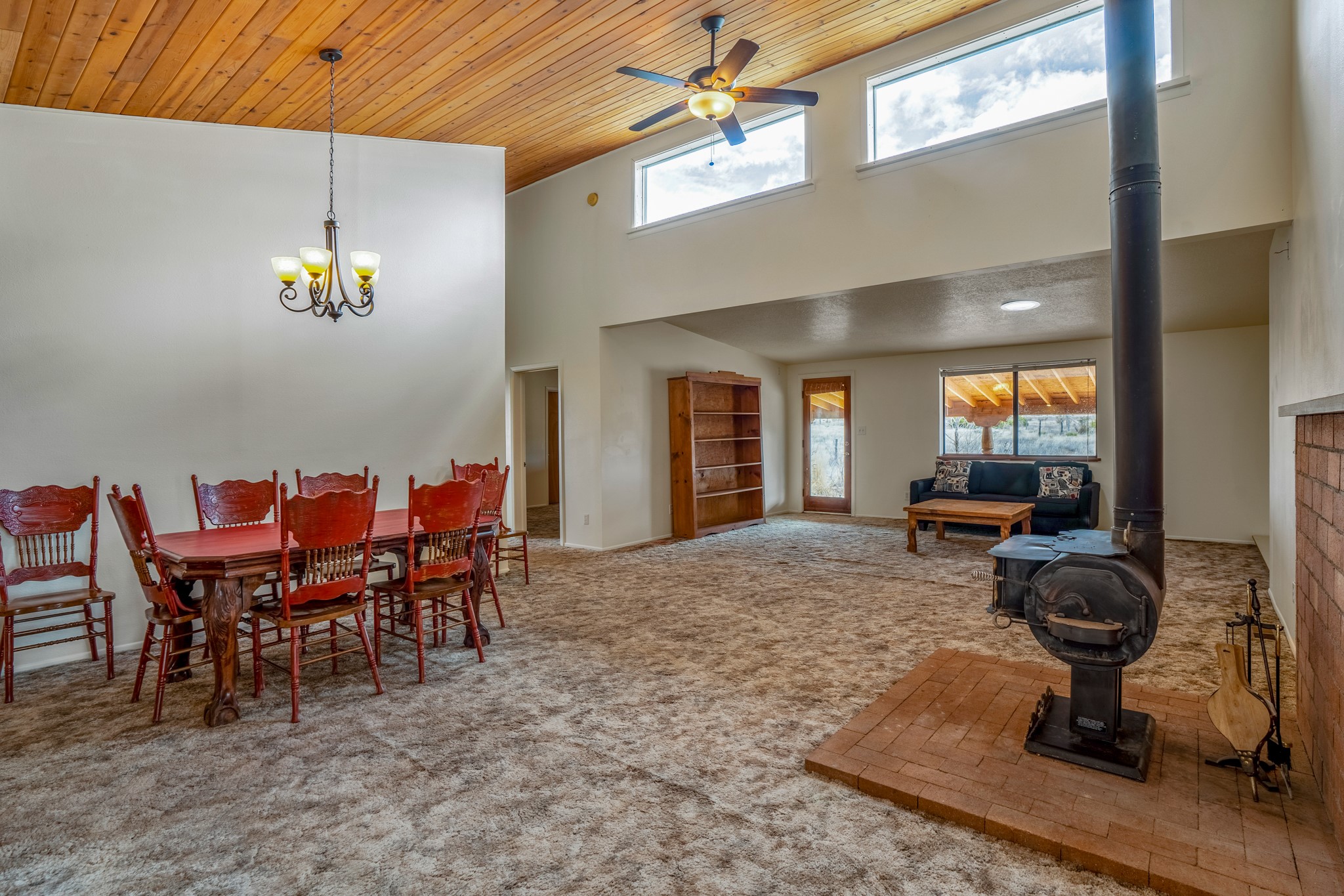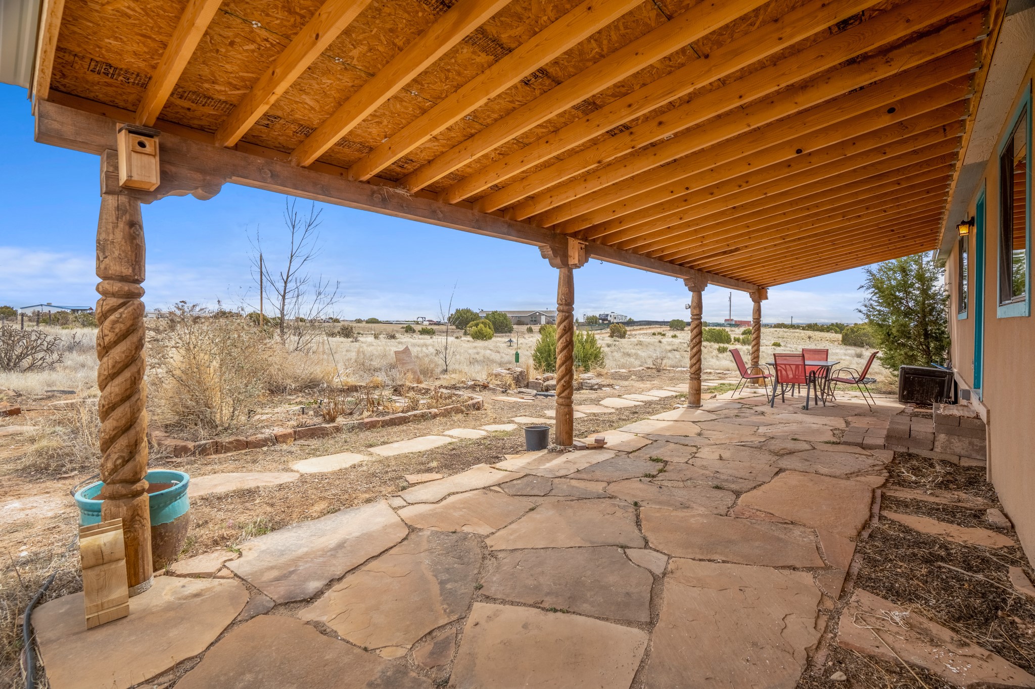 Beautiful customized modular home on almost 5 acres. An artist or craft person's dream with a nearly 2,200 square foot ATTACHED STUDIO/WORKSHOP on its own electrical panel, with a wood heater, evaporative cooler, gas stub out, electrical outlets throughout, and two garage doors! The 2,275 square foot main home features raised vaulted tongue and groove wood ceilings, an open concept great room with clerestory windows, solar tube, and a wood burning stove. Lots of natural light. This does not feel like a modular home! Three bedrooms each with their own walk-in closet and an office. Wonderful views from all directions. Private well. Primary bathroom has a jetted tub, separate shower and double sinks. 5 Hydroviv filters installed, one on each shower, one in the kitchen sink, and two on bathroom sinks. Wrap around porch in the front and a patio with a wood portal off the back of the home with a small pond, perfect for relaxing and taking in the views. The whole home has been freshly painted and professionally cleaned including windows. According to Seller, the metal roof may have been installed within the last 6 years. New hot water heater with instant hot circulation, and stainless steel farm sink in the kitchen recently installed. Gas range is only two years old. Make this Santa Fe escape and live/work dream a reality!