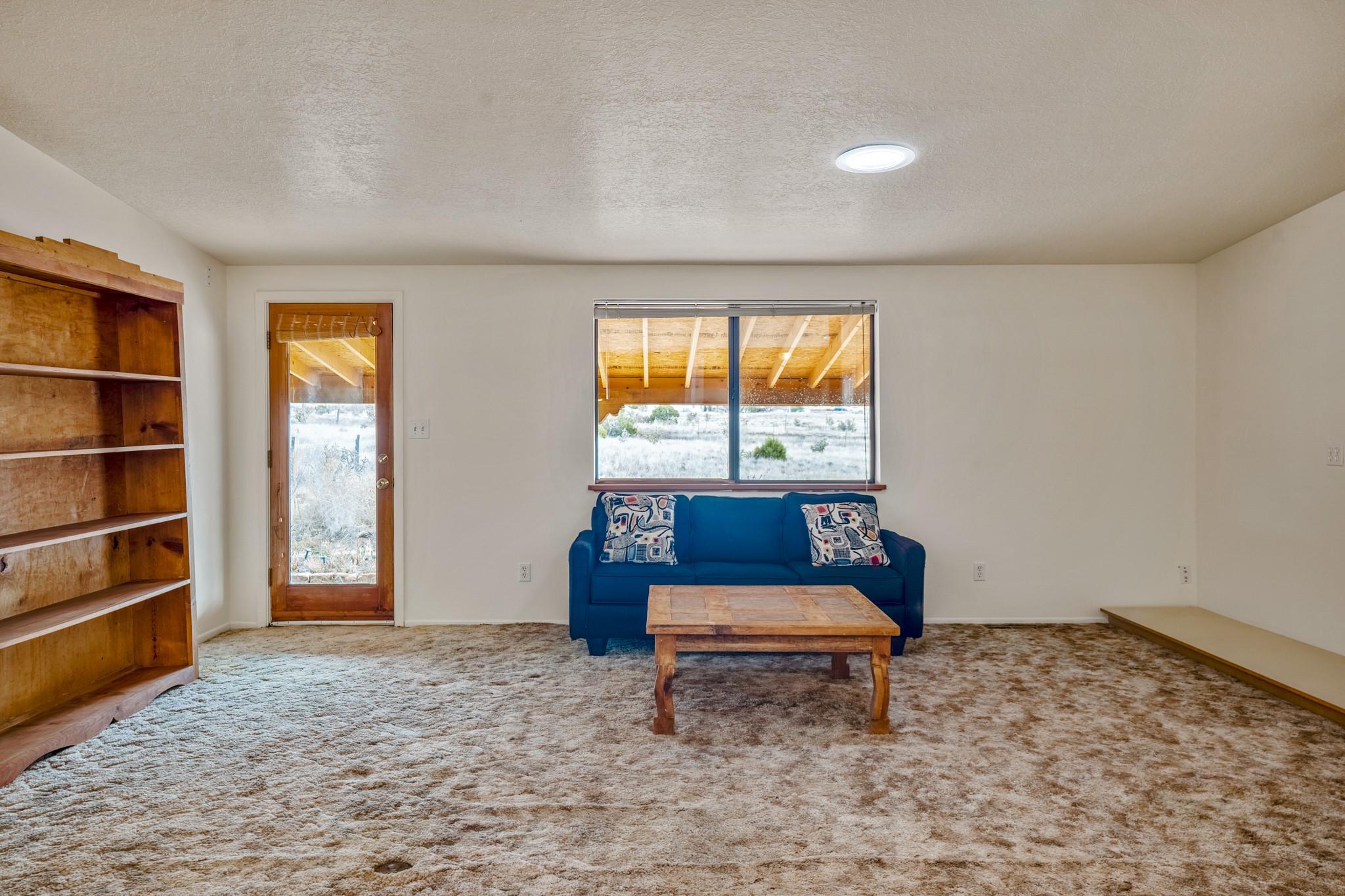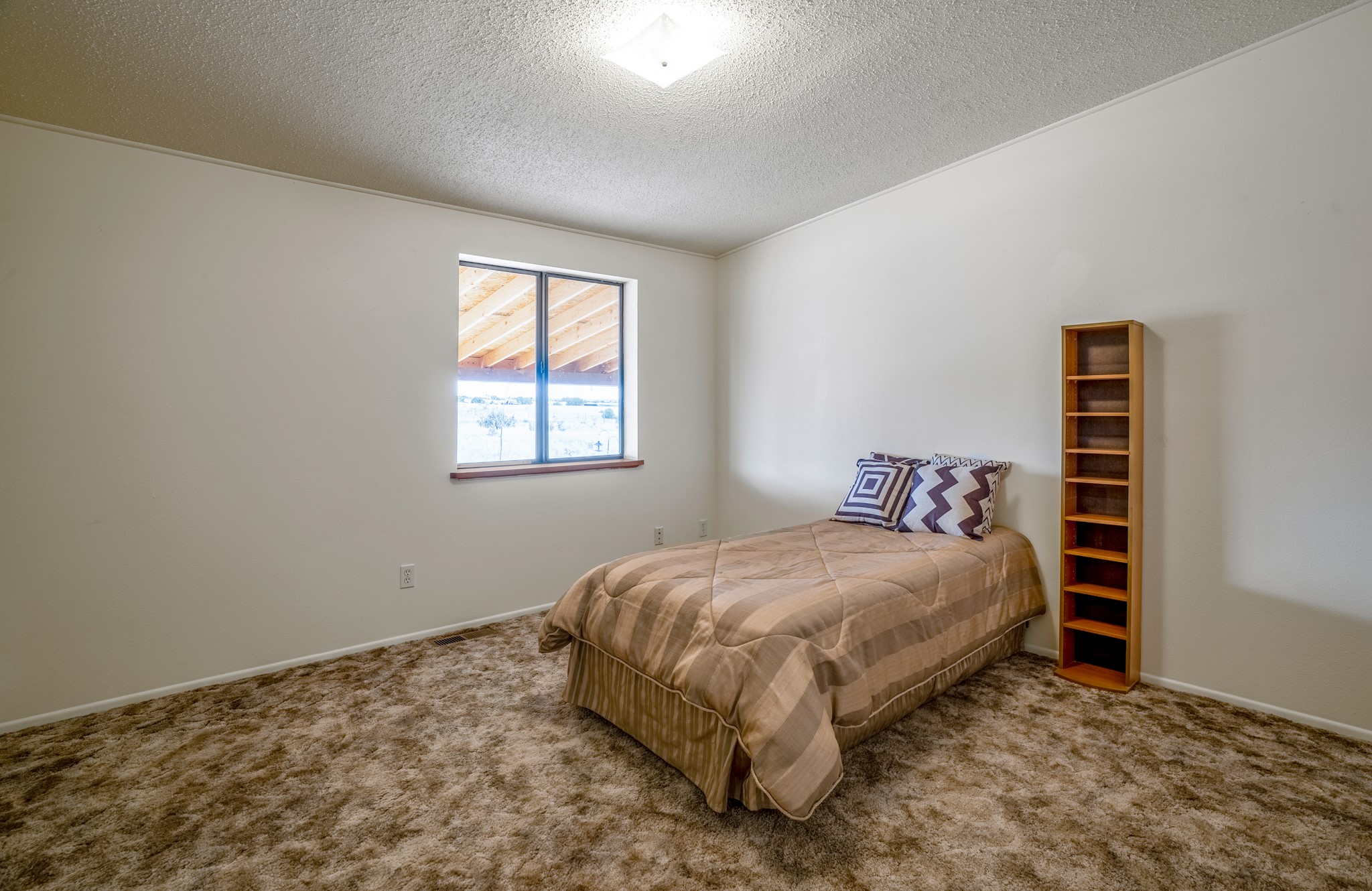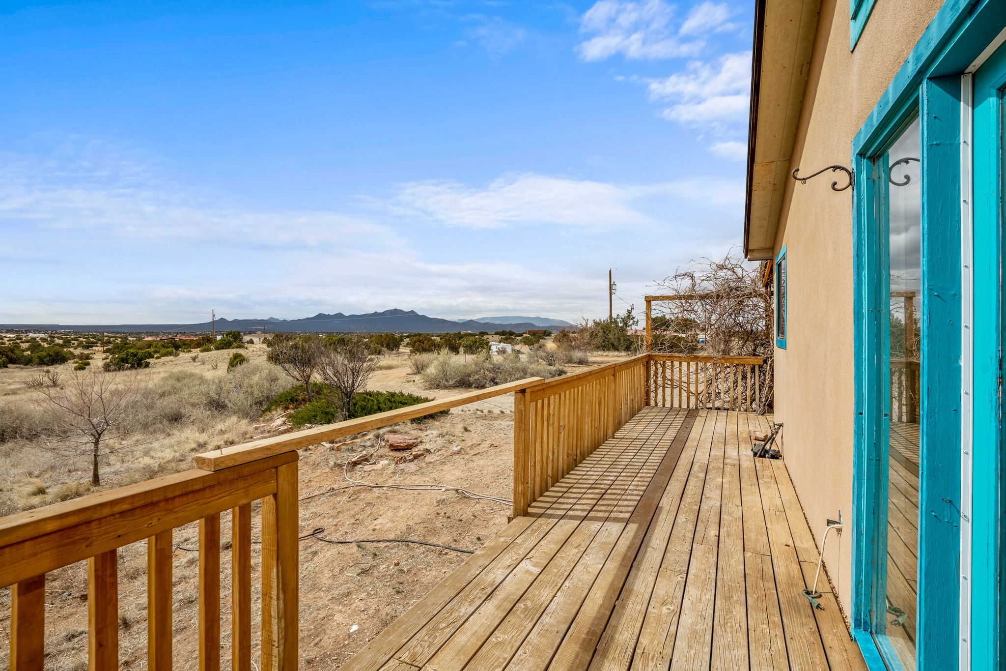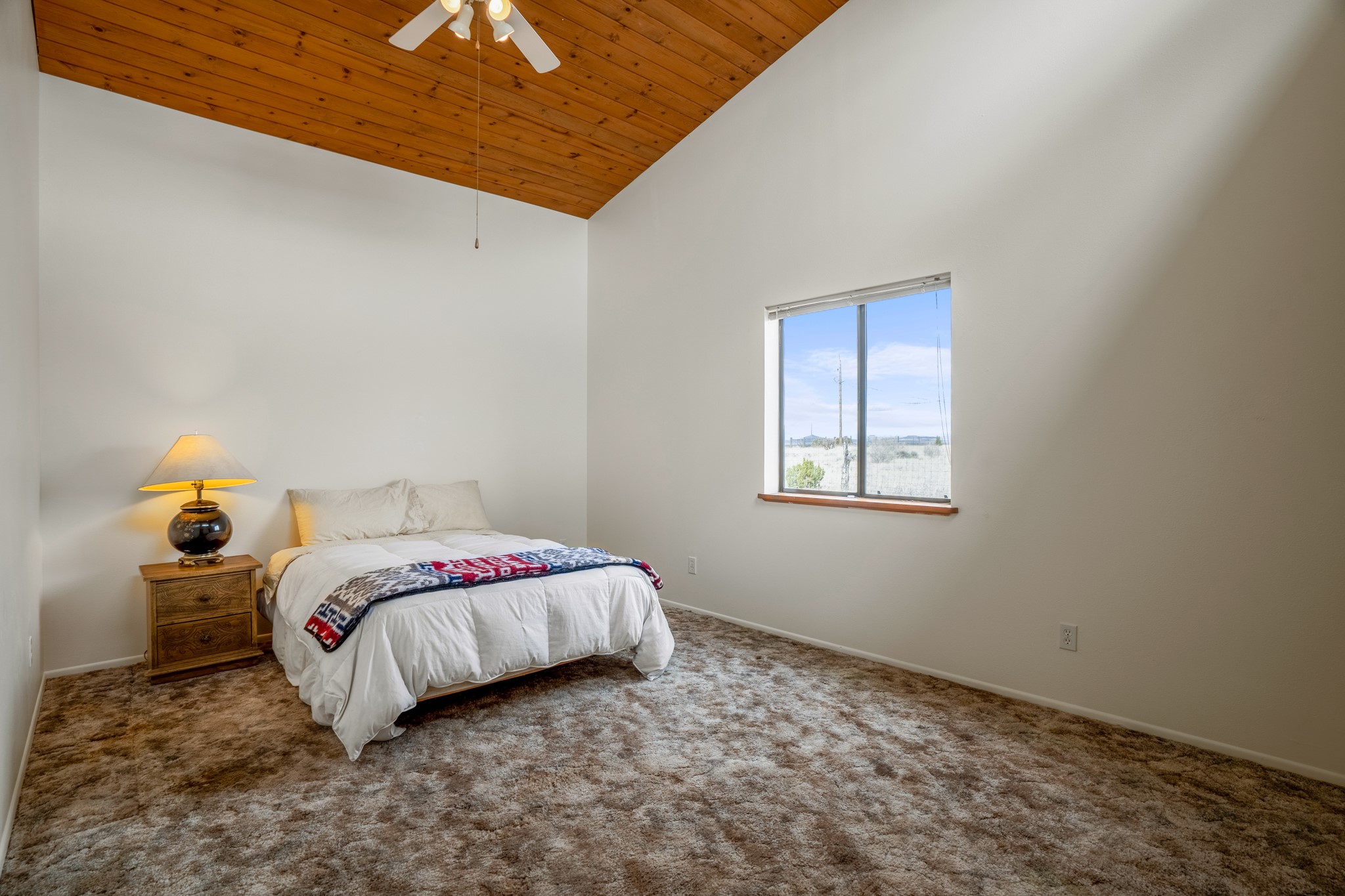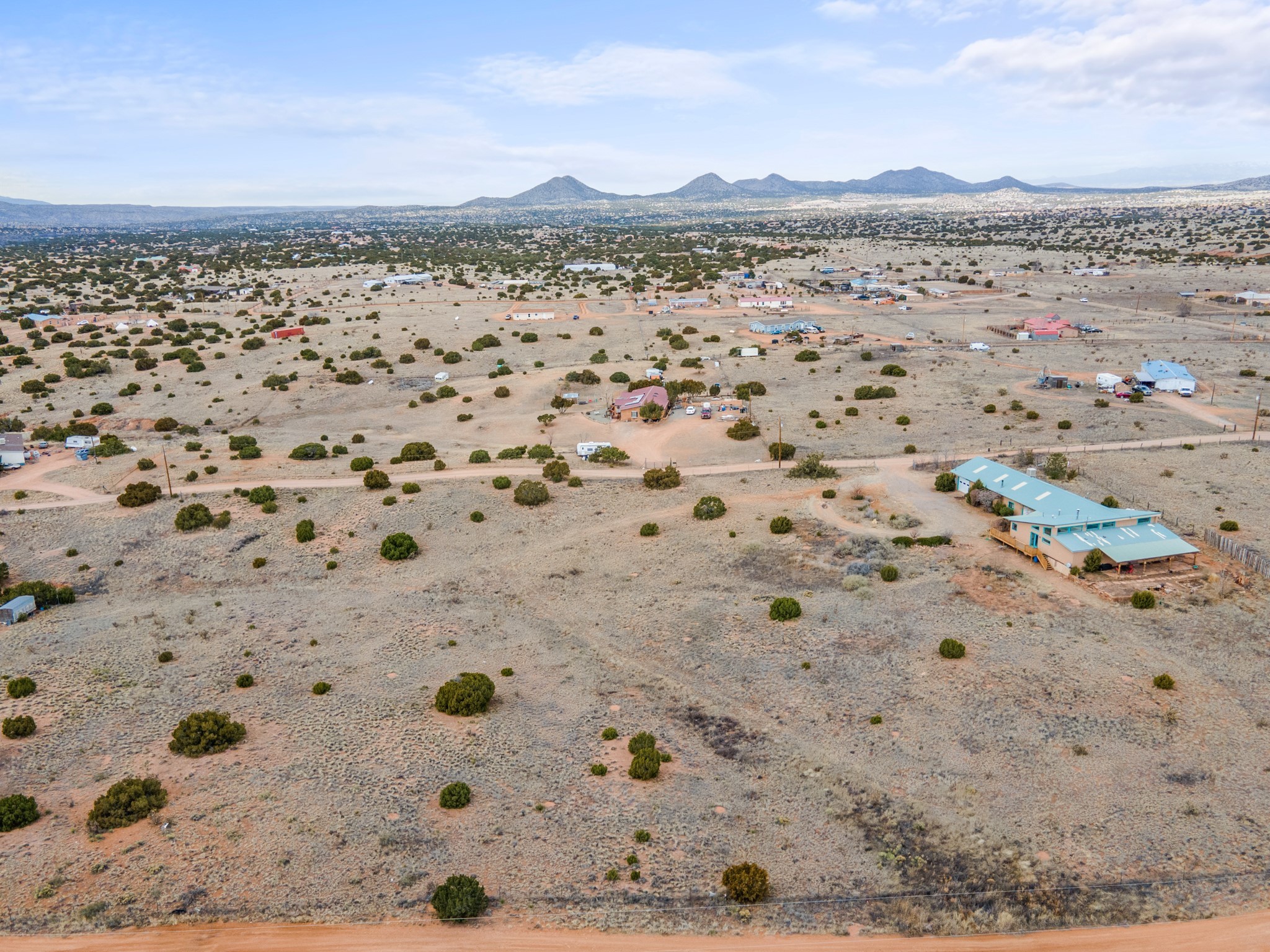 Beautiful customized modular home on almost 5 acres. An artist or craft person's dream with a nearly 2,200 square foot ATTACHED STUDIO/WORKSHOP on its own electrical panel, with a wood heater, evaporative cooler, gas stub out, electrical outlets throughout, and two garage doors! The 2,275 square foot main home features raised vaulted tongue and groove wood ceilings, an open concept great room with clerestory windows, solar tube, and a wood burning stove. Lots of natural light. This does not feel like a modular home! Three bedrooms each with their own walk-in closet and an office. Wonderful views from all directions. Private well. Primary bathroom has a jetted tub, separate shower and double sinks. 5 Hydroviv filters installed, one on each shower, one in the kitchen sink, and two on bathroom sinks. Wrap around porch in the front and a patio with a wood portal off the back of the home with a small pond, perfect for relaxing and taking in the views. The whole home has been freshly painted and professionally cleaned including windows. According to Seller, the metal roof may have been installed within the last 6 years. New hot water heater with instant hot circulation, and stainless steel farm sink in the kitchen recently installed. Gas range is only two years old. Make this Santa Fe escape and live/work dream a reality!
