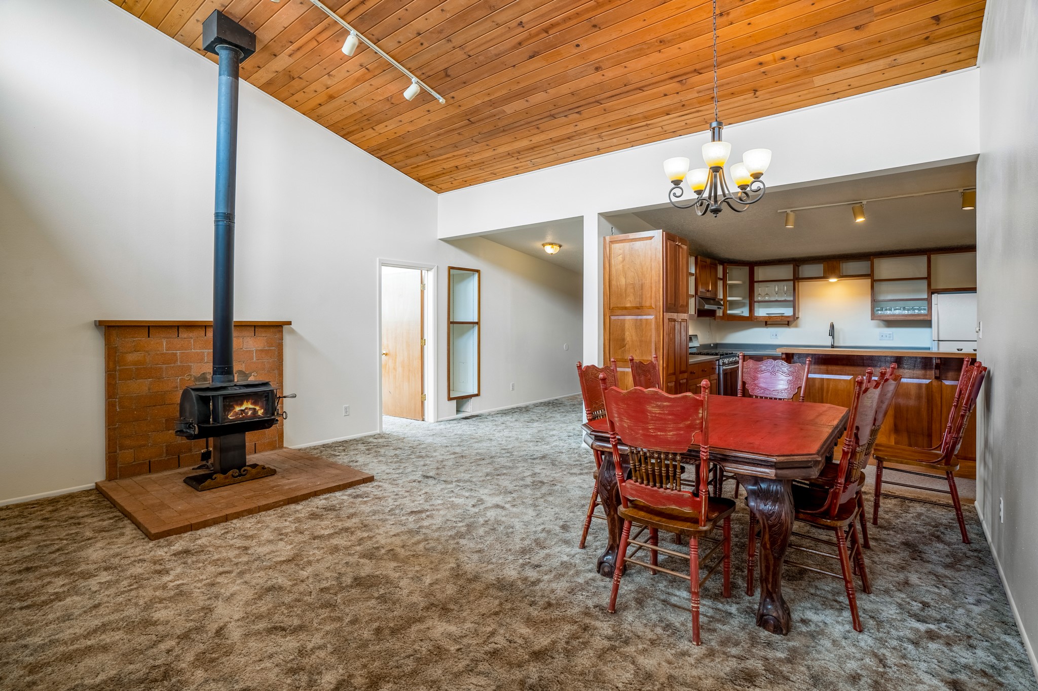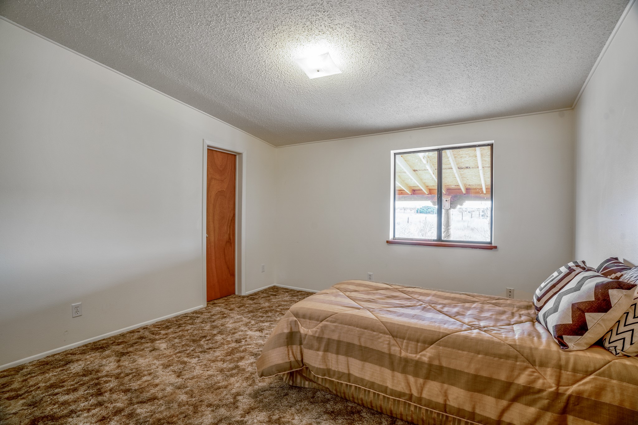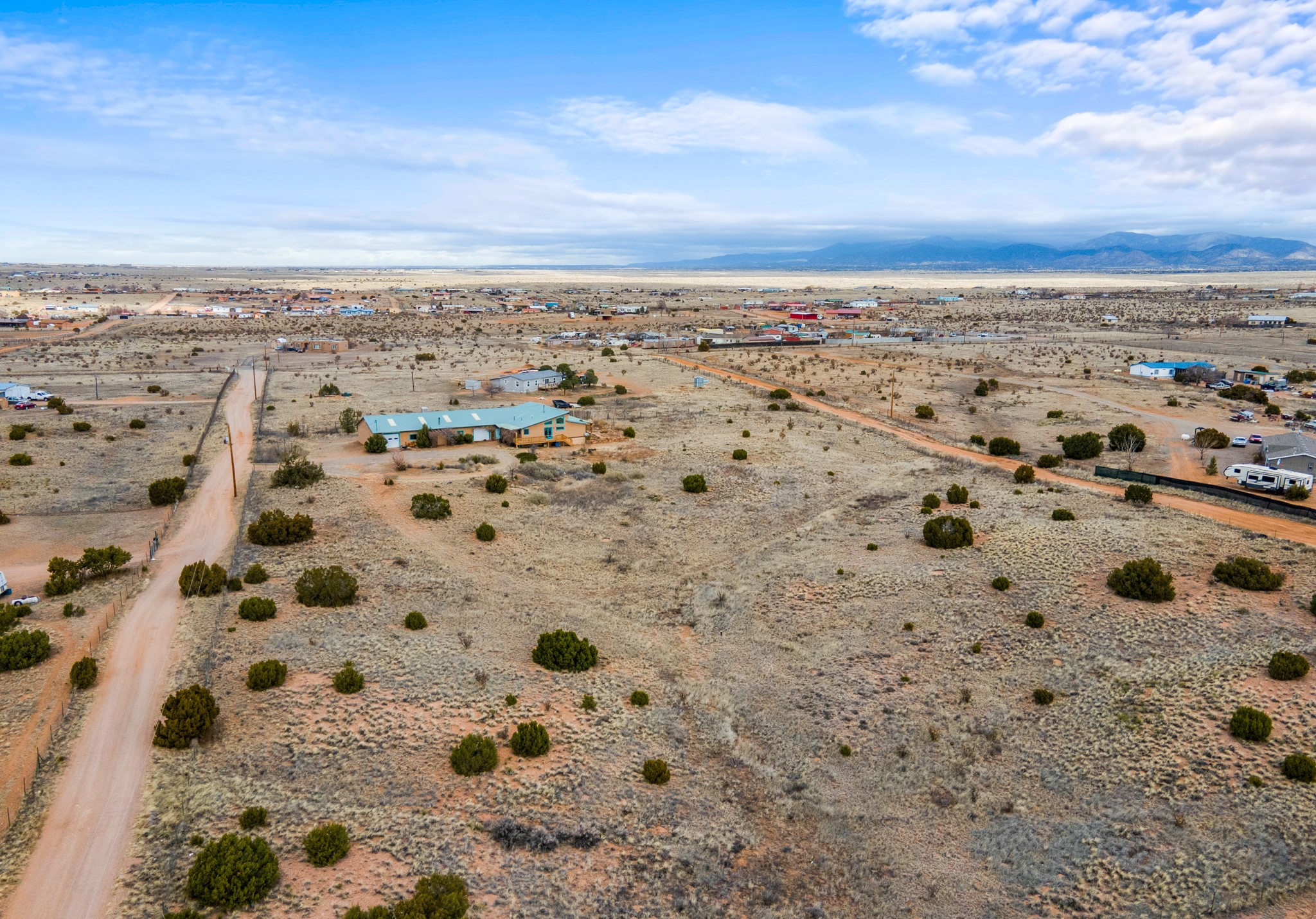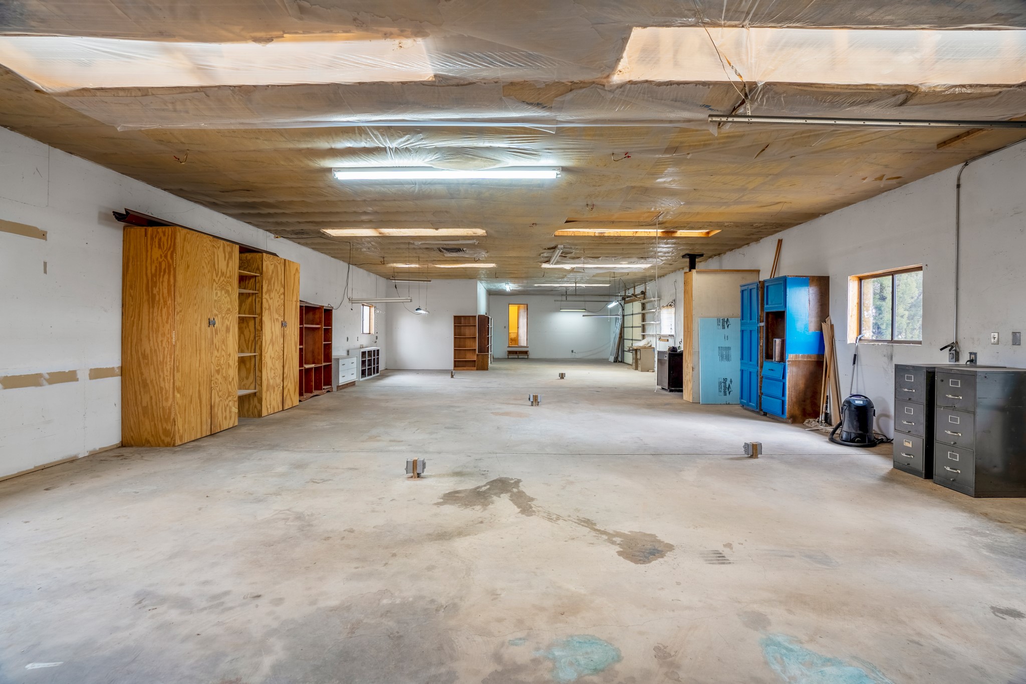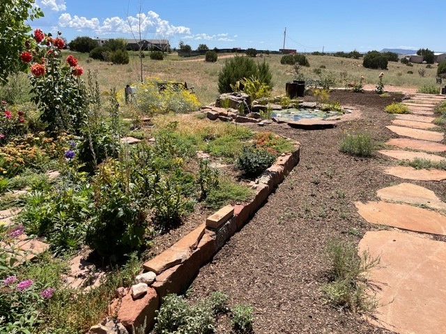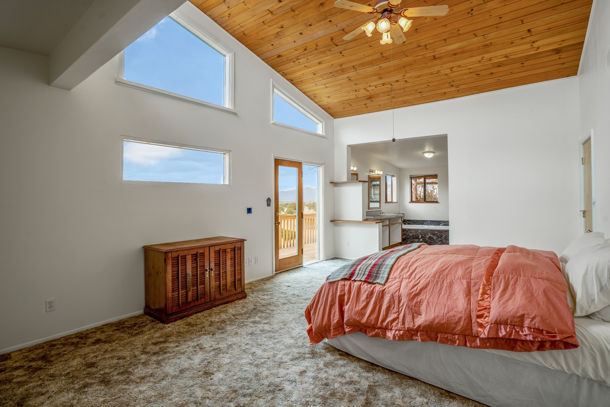 Beautiful customized modular home on almost 5 acres. An artist or craft person's dream with a nearly 2,200 square foot ATTACHED STUDIO/WORKSHOP on its own electrical panel, with a wood heater, evaporative cooler, gas stub out, electrical outlets throughout, and two garage doors! The 2,275 square foot main home features raised vaulted tongue and groove wood ceilings, an open concept great room with clerestory windows, solar tube, and a wood burning stove. Lots of natural light. This does not feel like a modular home! Three bedrooms each with their own walk-in closet and an office. Wonderful views from all directions. Private well. Primary bathroom has a jetted tub, separate shower and double sinks. 5 Hydroviv filters installed, one on each shower, one in the kitchen sink, and two on bathroom sinks. Wrap around porch in the front and a patio with a wood portal off the back of the home with a small pond, perfect for relaxing and taking in the views. The whole home has been freshly painted and professionally cleaned including windows. According to Seller, the metal roof may have been installed within the last 6 years. New hot water heater with instant hot circulation, and stainless steel farm sink in the kitchen recently installed. Gas range is only two years old. Make this Santa Fe escape and live/work dream a reality!