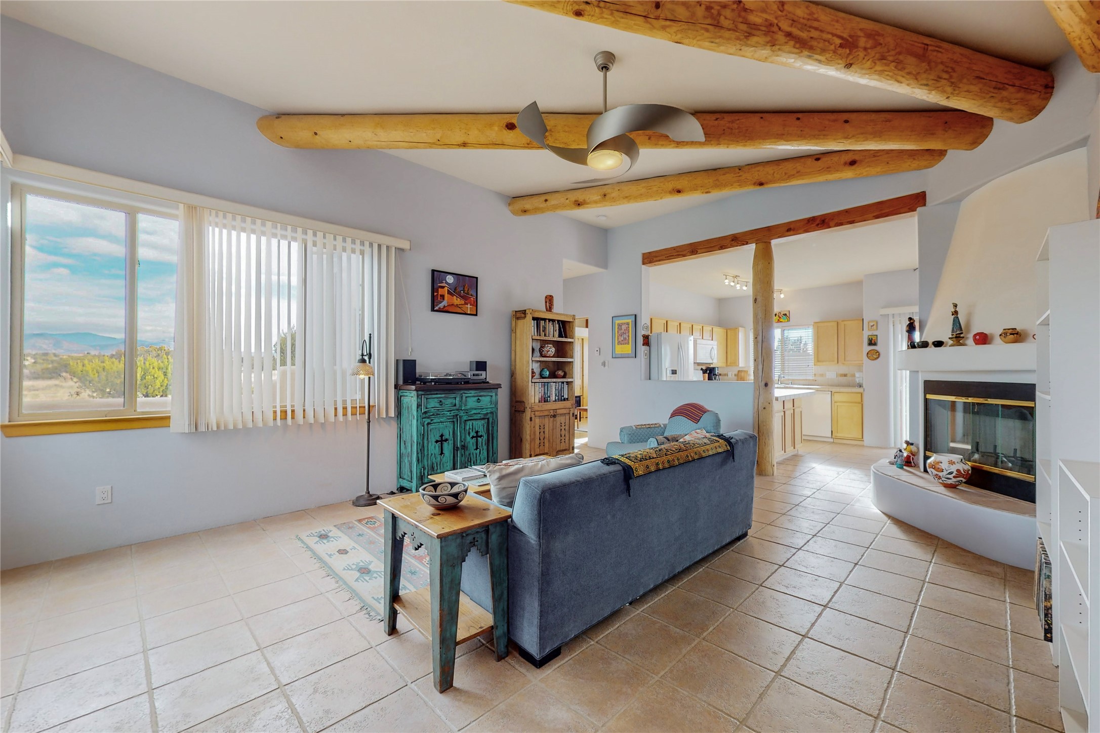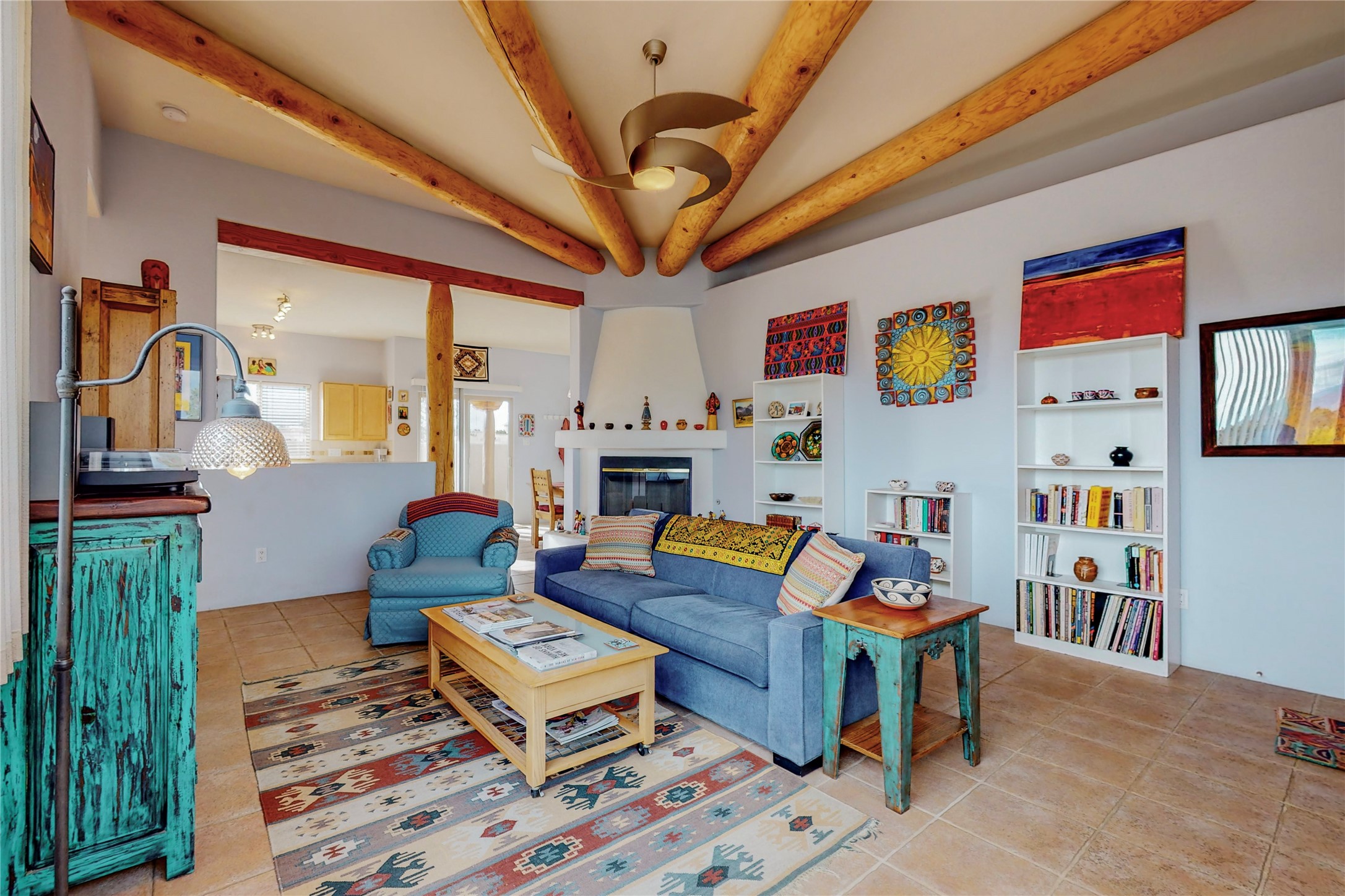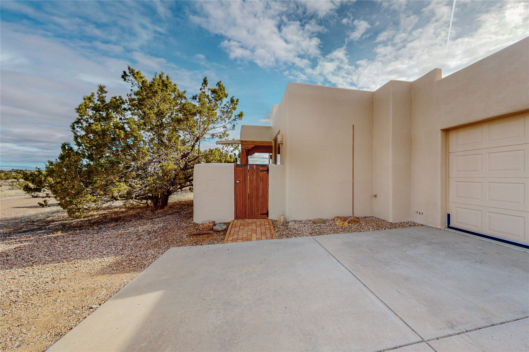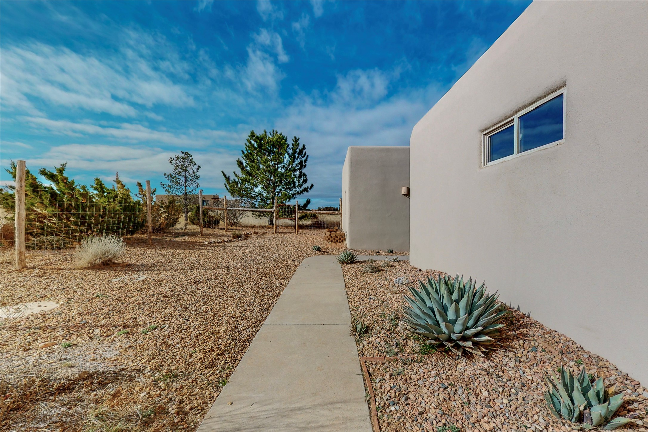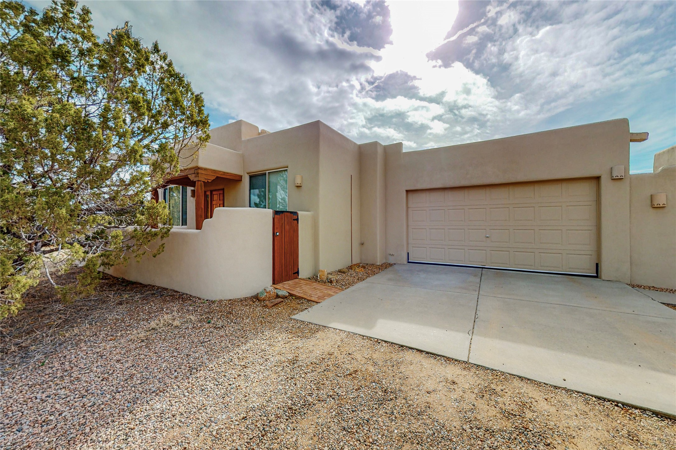 Sparkling light open plan contemporary pueblo Eldorado home with heated and cooled detached studio on high mountain view lot. Simply delightful open plan split 3 bedroom, 2 bath design plus 3/4 bath in Studio. This lovely home is in sparkling condition and shows light and bright throughout. New Navien boiler, hot water heater, casita storm door / 2 windows and awning and dog fenced area in 2021/2022. Stucco, roof and general home maintenance updated to 2022/2023. Fabulous Sangre de Cristo and Jemez mountain views from the living room with vigas and kiva fireplace. Open kitchen with dining area flowing to private walled patio for outside entertaining. Wood floors in bedrooms, tile floors in main living areas. Close to paved Avenida Eldorado for quick access to Eldorado community amenities, local shopping and services, only minutes into Santa Fe