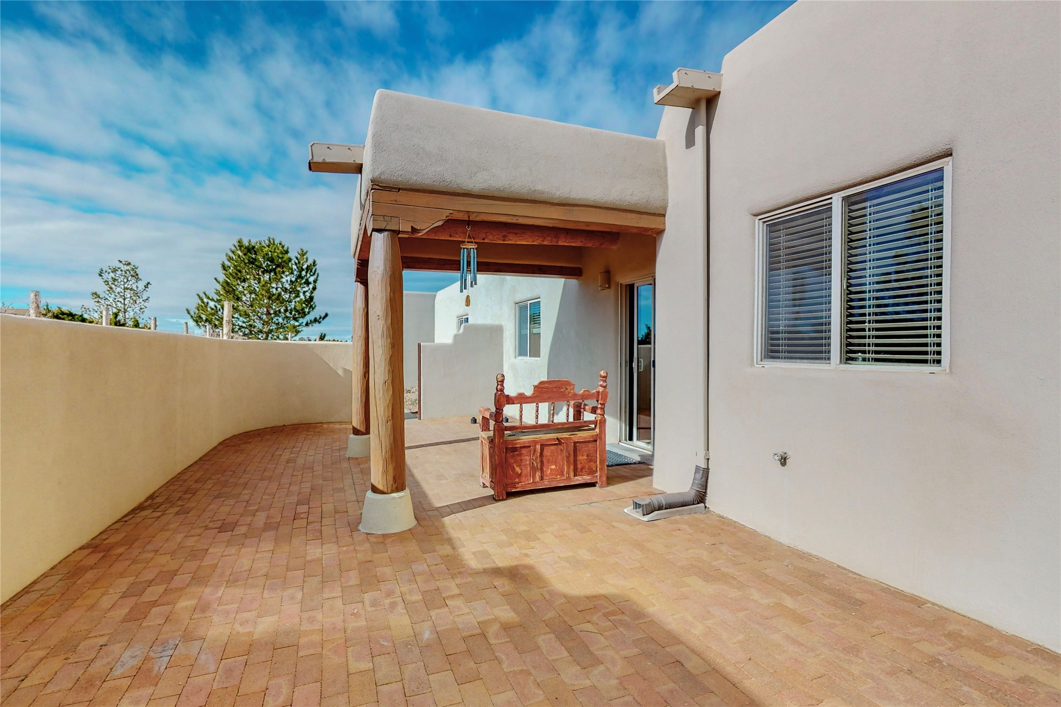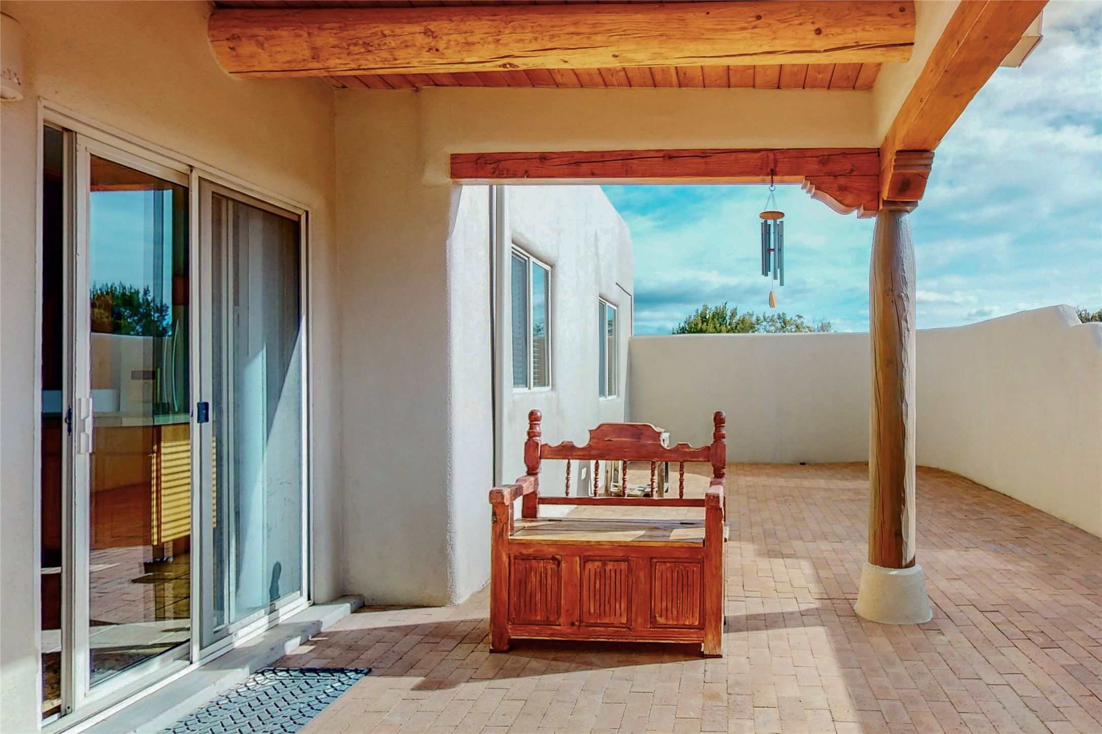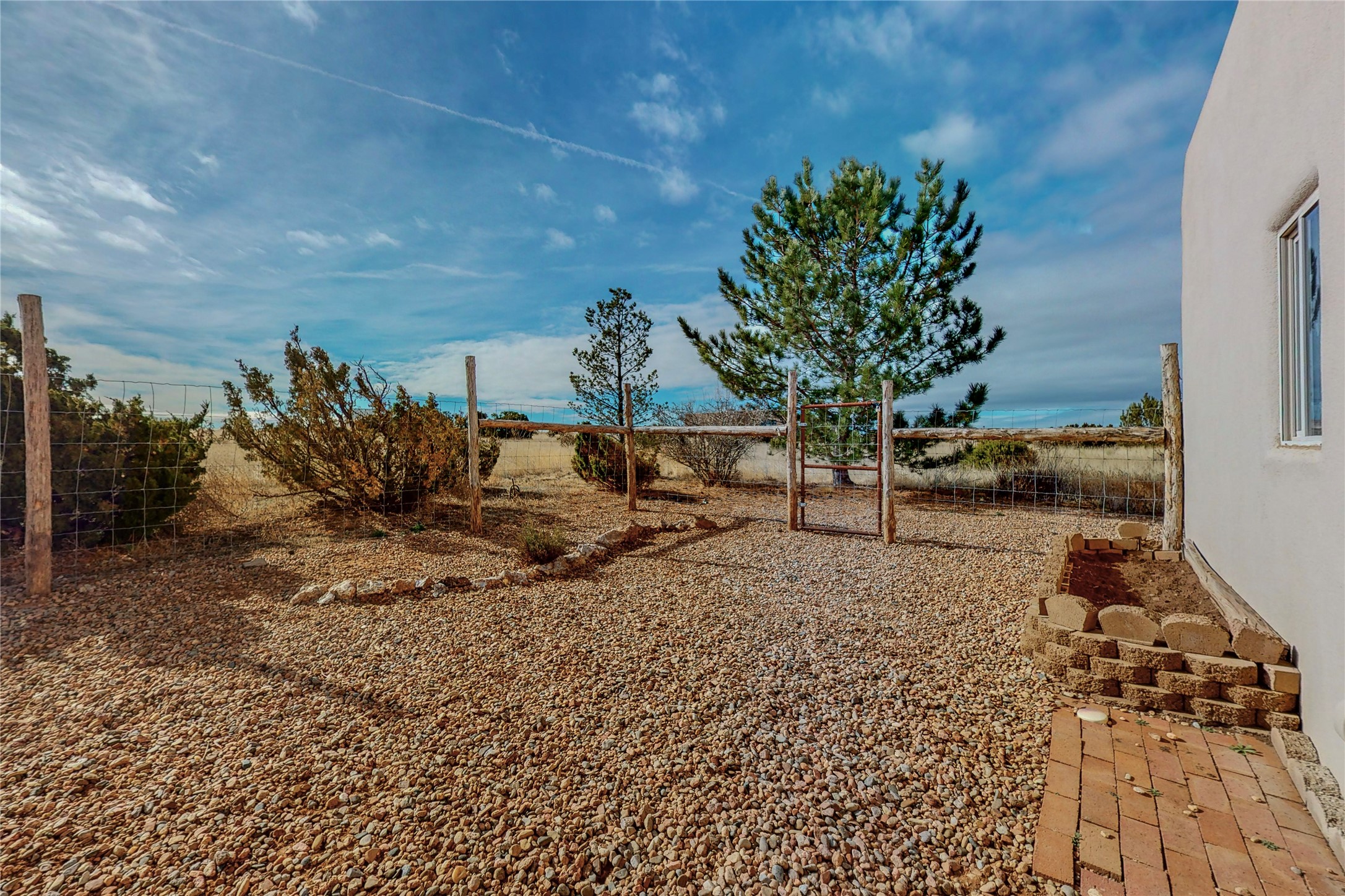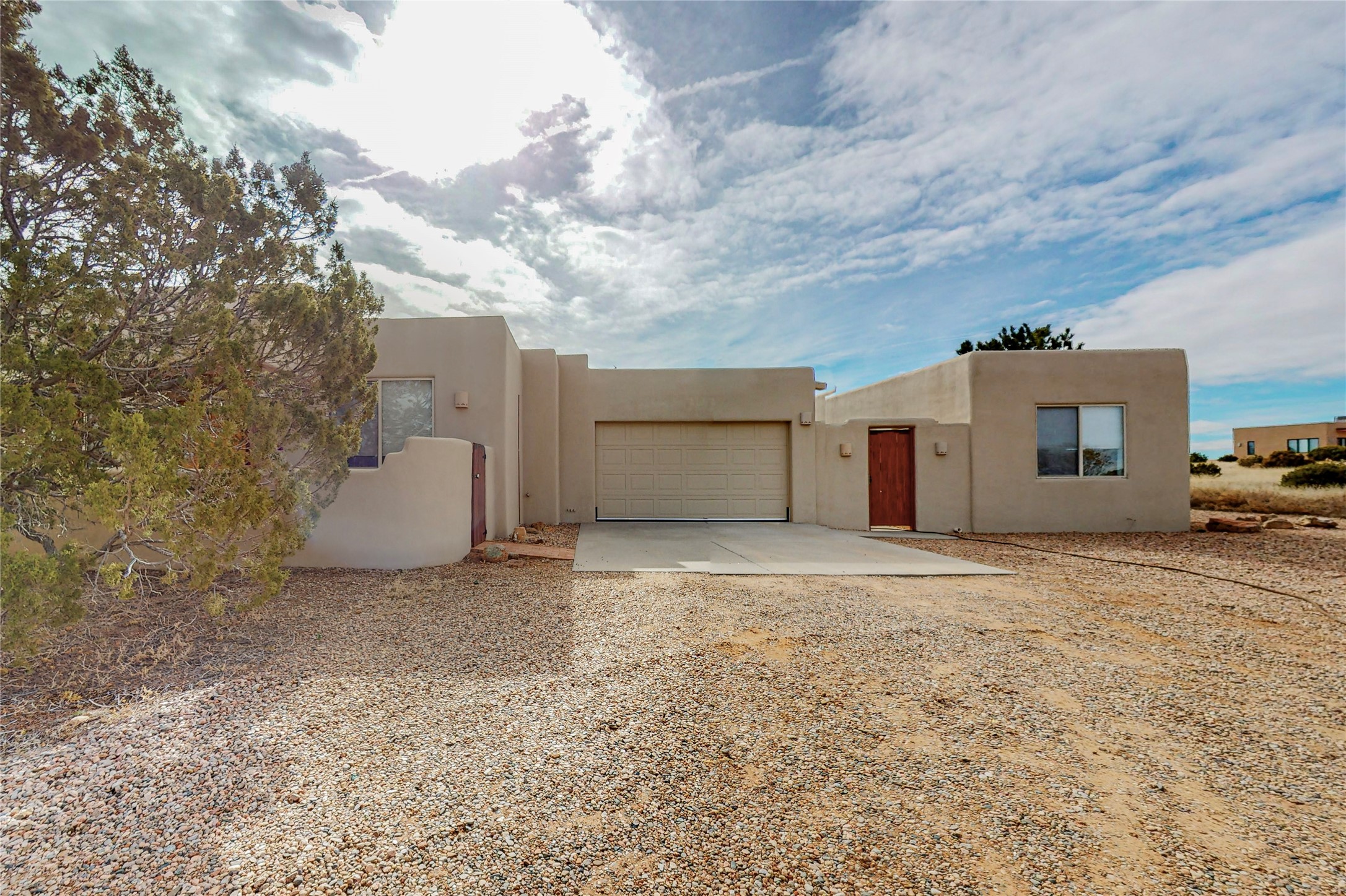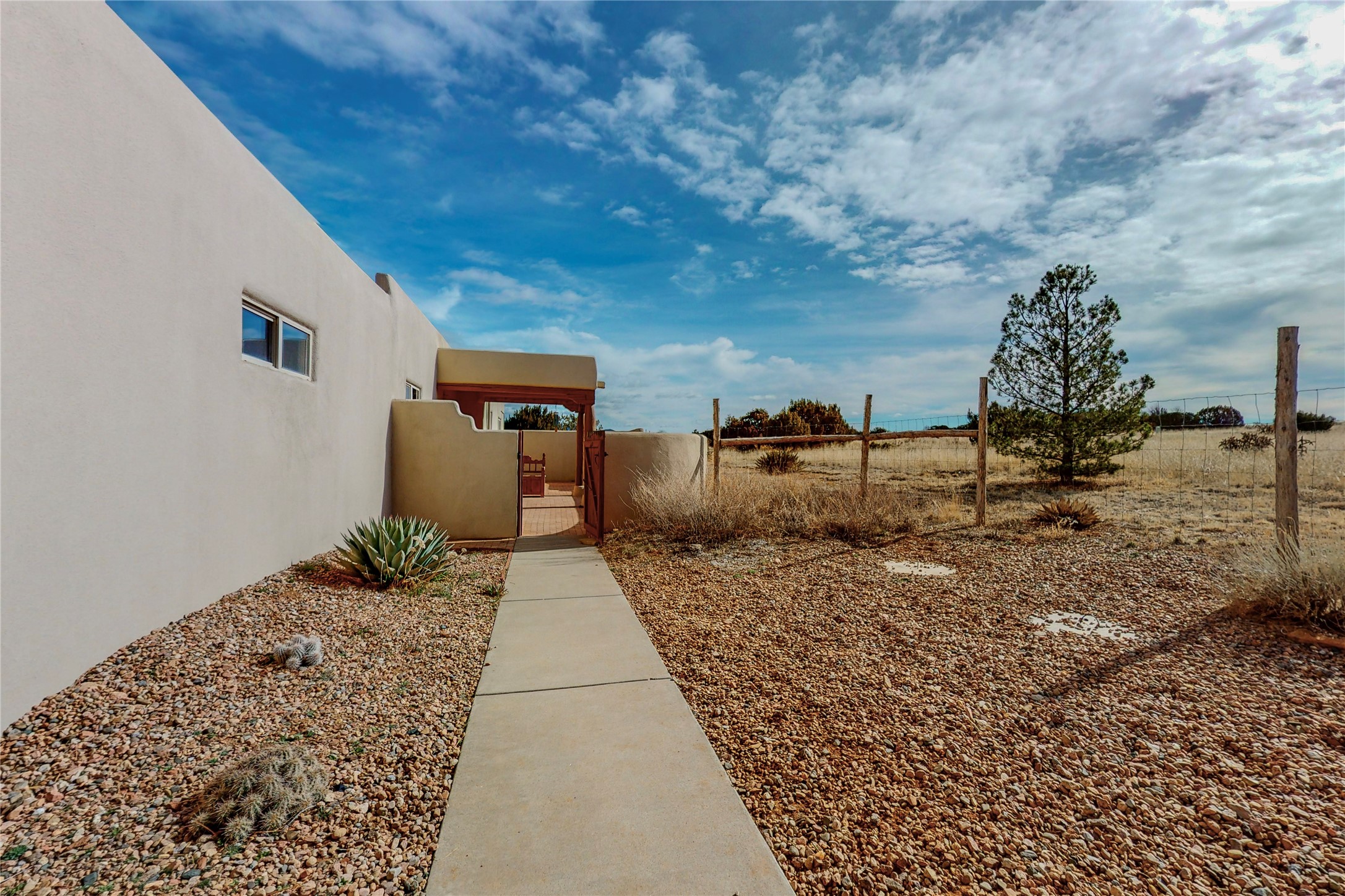 Sparkling light open plan contemporary pueblo Eldorado home with heated and cooled detached studio on high mountain view lot. Simply delightful open plan split 3 bedroom, 2 bath design plus 3/4 bath in Studio. This lovely home is in sparkling condition and shows light and bright throughout. New Navien boiler, hot water heater, casita storm door / 2 windows and awning and dog fenced area in 2021/2022. Stucco, roof and general home maintenance updated to 2022/2023. Fabulous Sangre de Cristo and Jemez mountain views from the living room with vigas and kiva fireplace. Open kitchen with dining area flowing to private walled patio for outside entertaining. Wood floors in bedrooms, tile floors in main living areas. Close to paved Avenida Eldorado for quick access to Eldorado community amenities, local shopping and services, only minutes into Santa Fe