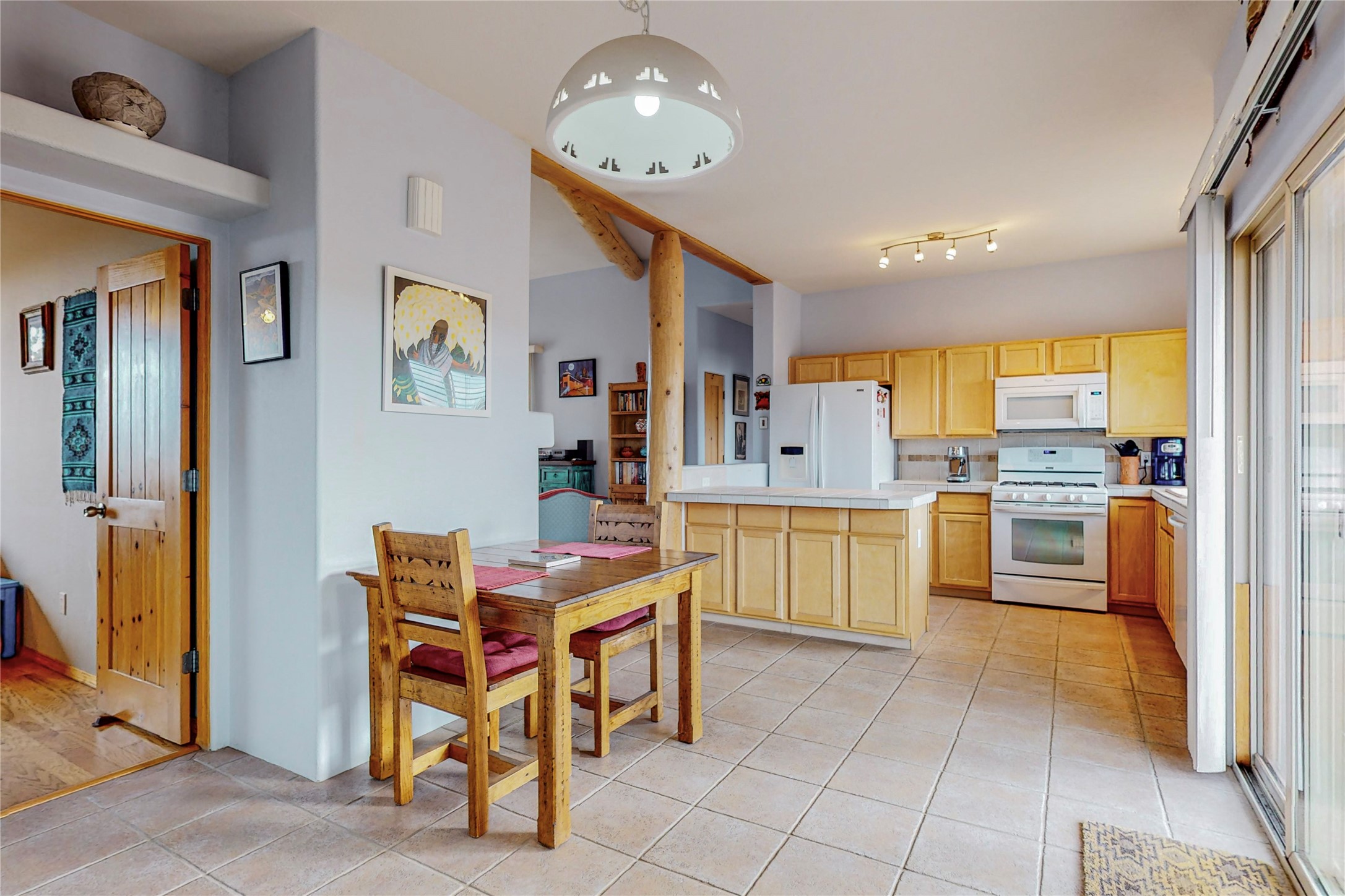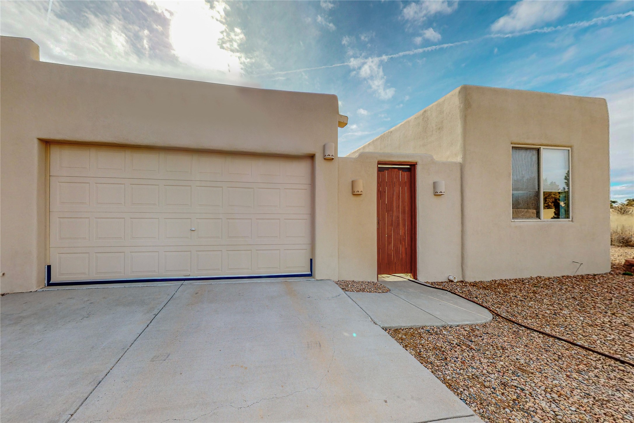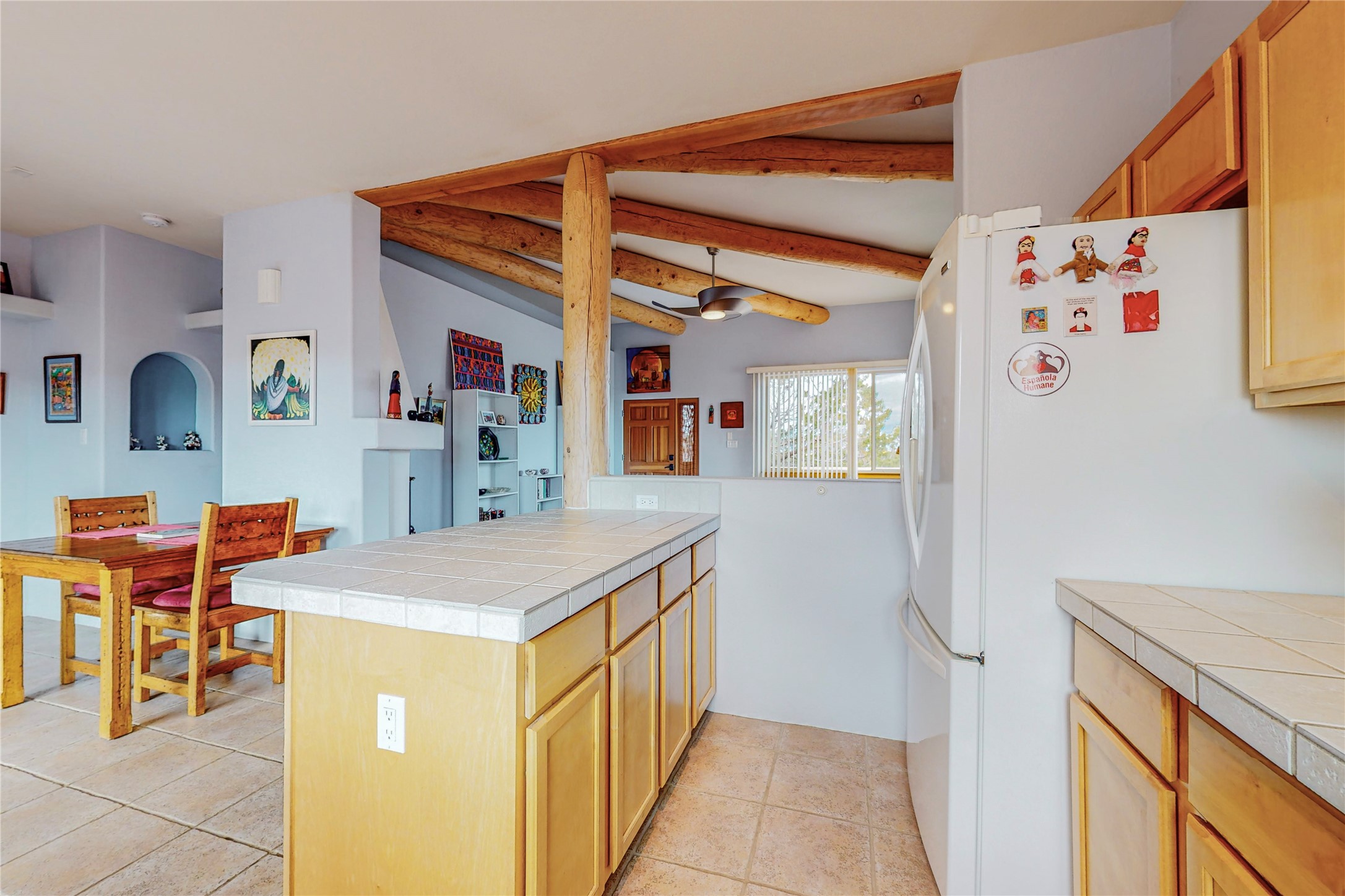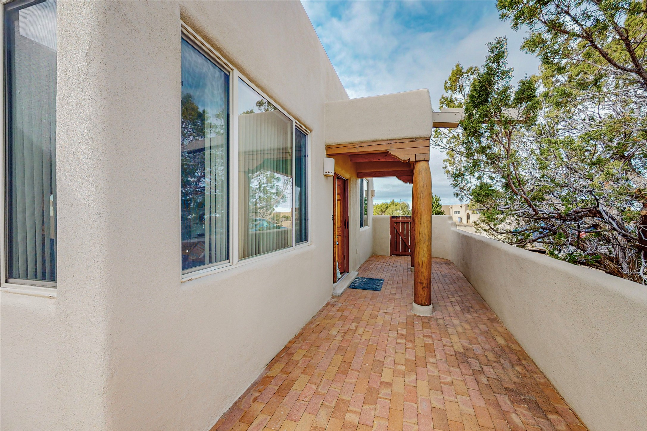 Sparkling light open plan contemporary pueblo Eldorado home with heated and cooled detached studio on high mountain view lot. Simply delightful open plan split 3 bedroom, 2 bath design plus 3/4 bath in Studio. This lovely home is in sparkling condition and shows light and bright throughout. New Navien boiler, hot water heater, casita storm door / 2 windows and awning and dog fenced area in 2021/2022. Stucco, roof and general home maintenance updated to 2022/2023. Fabulous Sangre de Cristo and Jemez mountain views from the living room with vigas and kiva fireplace. Open kitchen with dining area flowing to private walled patio for outside entertaining. Wood floors in bedrooms, tile floors in main living areas. Close to paved Avenida Eldorado for quick access to Eldorado community amenities, local shopping and services, only minutes into Santa Fe