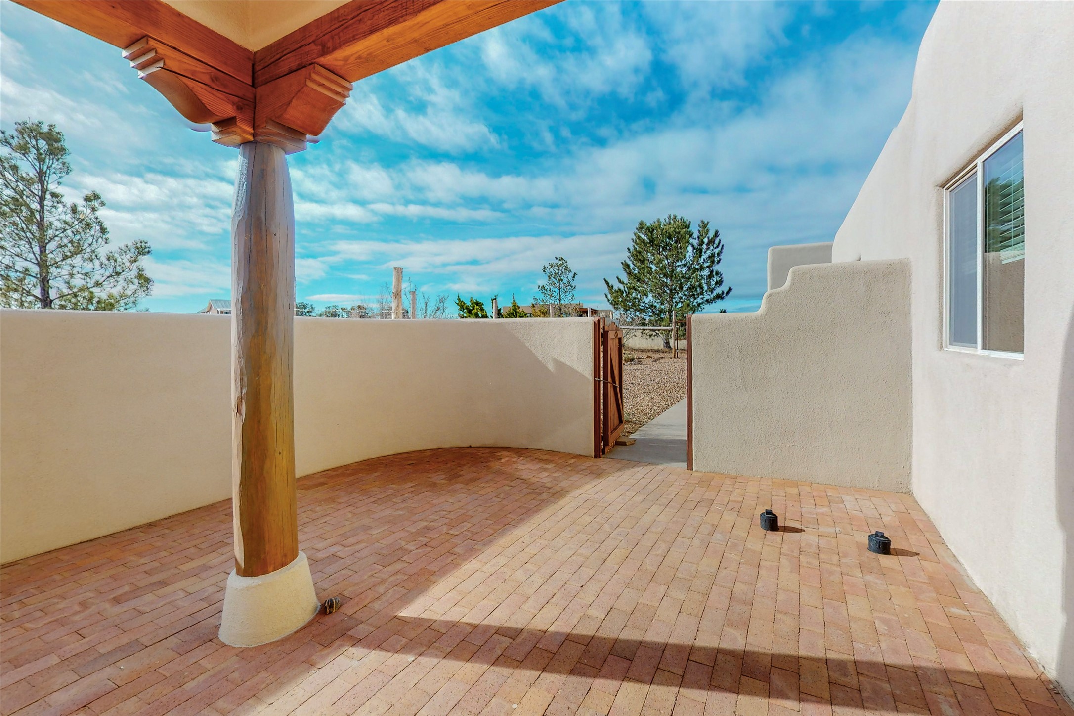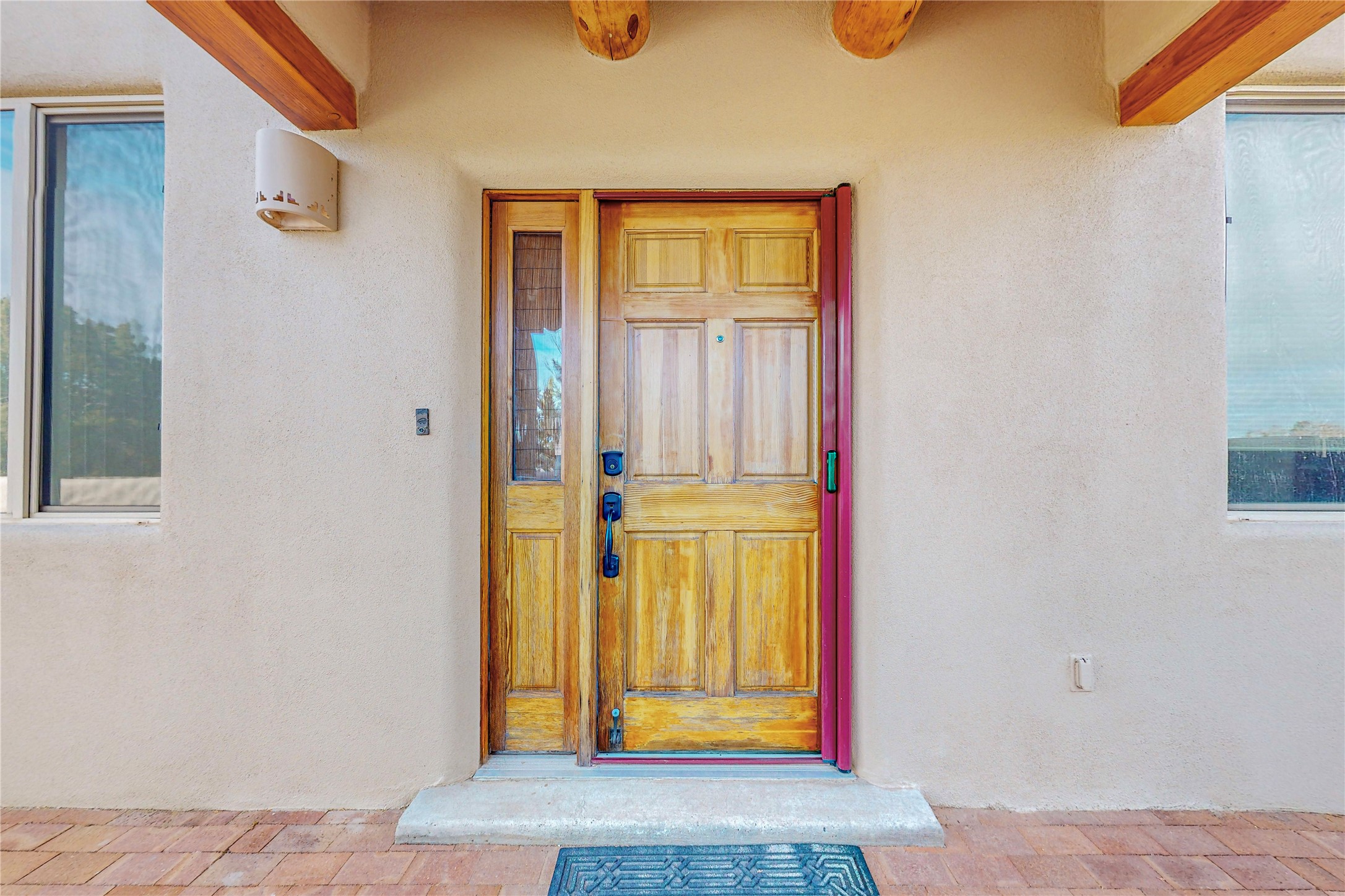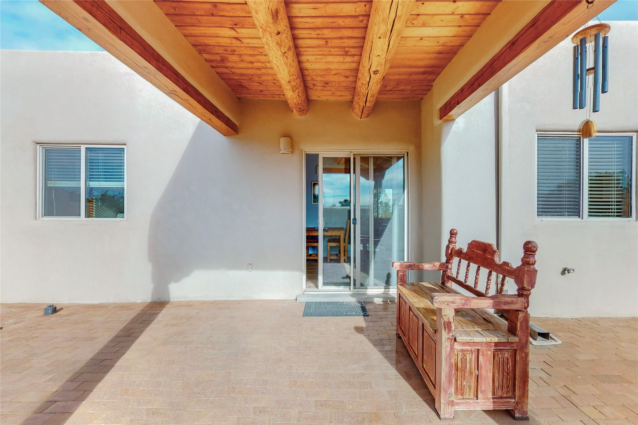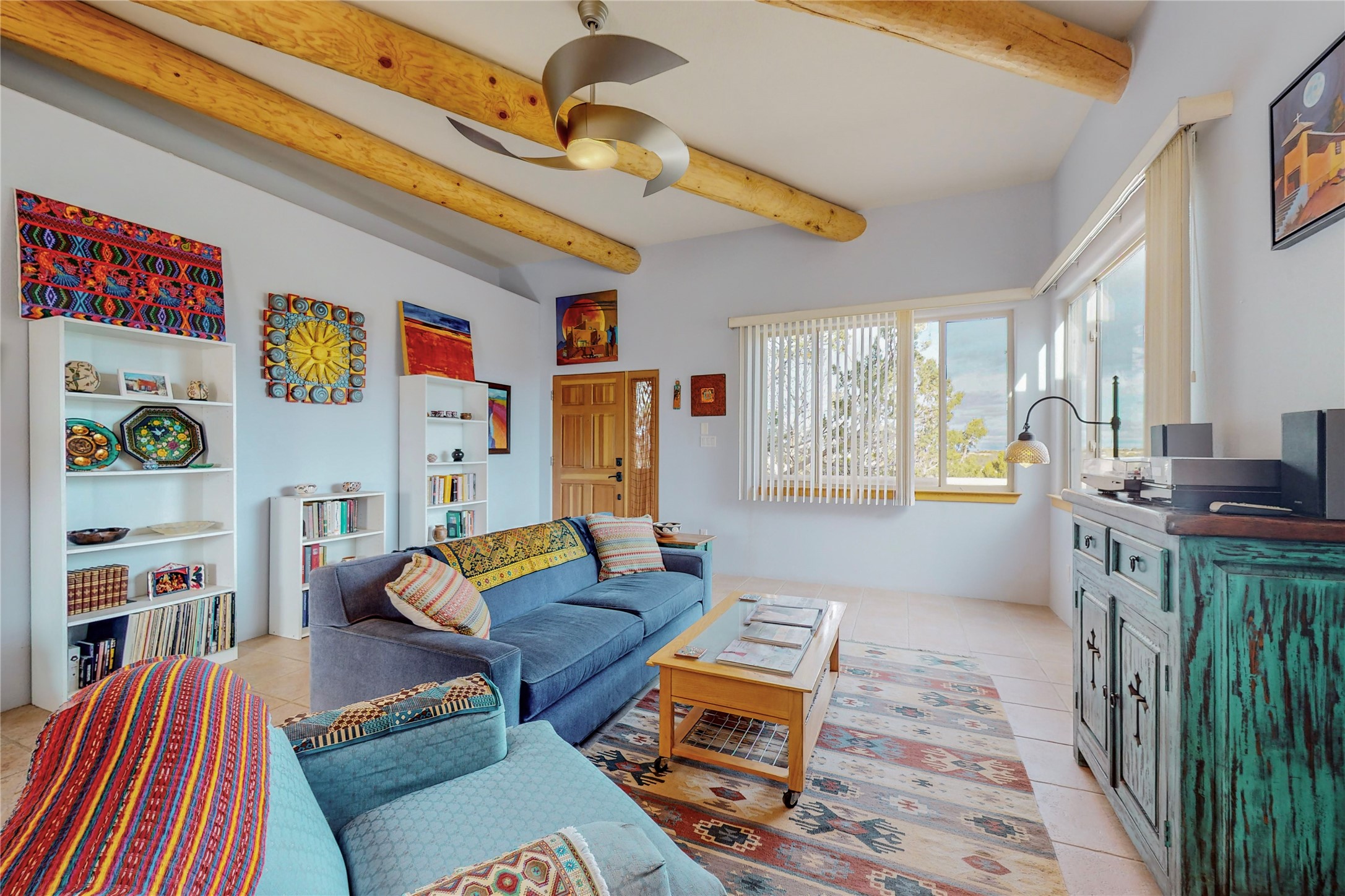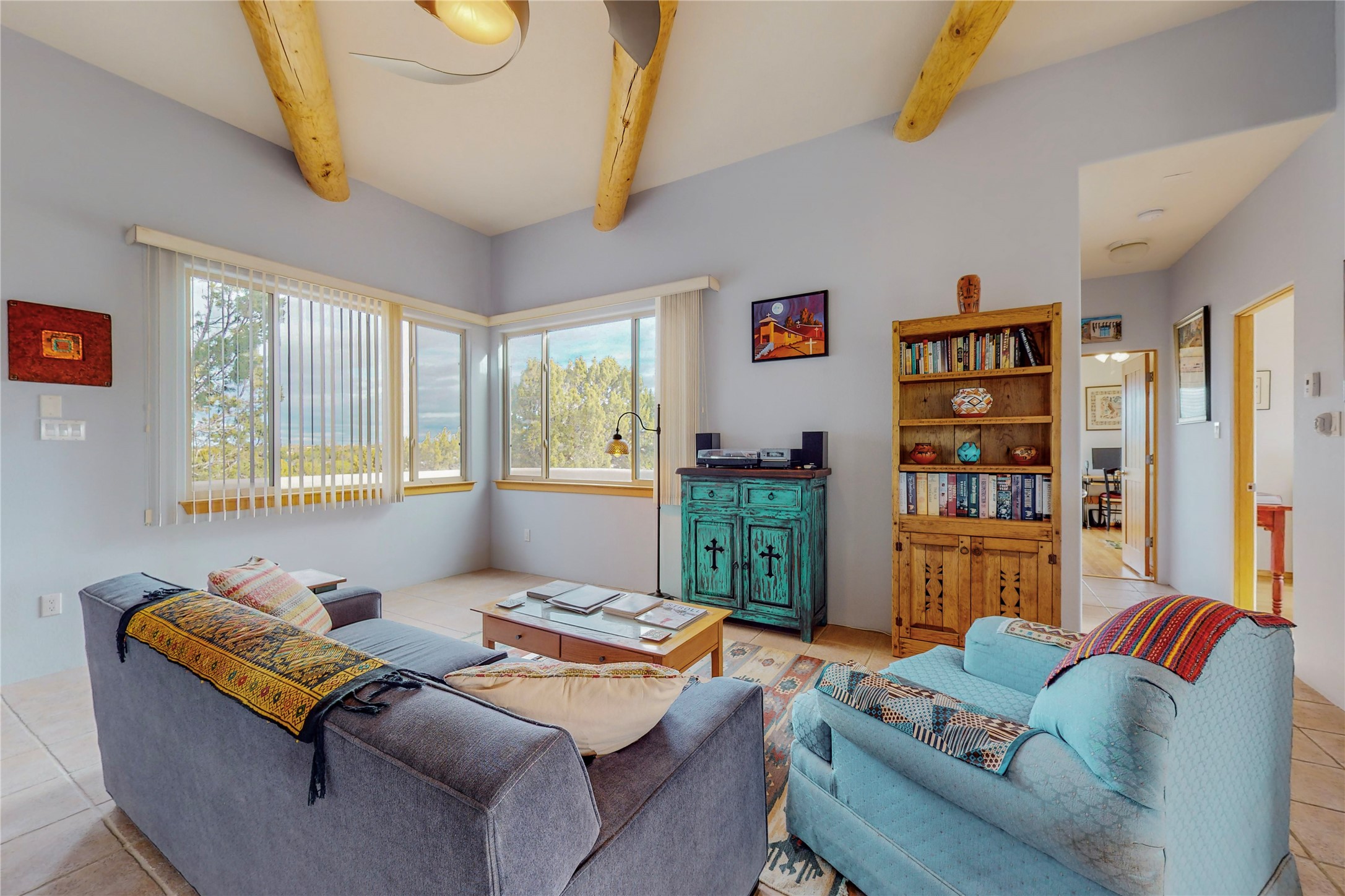 Sparkling light open plan contemporary pueblo Eldorado home with heated and cooled detached studio on high mountain view lot. Simply delightful open plan split 3 bedroom, 2 bath design plus 3/4 bath in Studio. This lovely home is in sparkling condition and shows light and bright throughout. New Navien boiler, hot water heater, casita storm door / 2 windows and awning and dog fenced area in 2021/2022. Stucco, roof and general home maintenance updated to 2022/2023. Fabulous Sangre de Cristo and Jemez mountain views from the living room with vigas and kiva fireplace. Open kitchen with dining area flowing to private walled patio for outside entertaining. Wood floors in bedrooms, tile floors in main living areas. Close to paved Avenida Eldorado for quick access to Eldorado community amenities, local shopping and services, only minutes into Santa Fe
