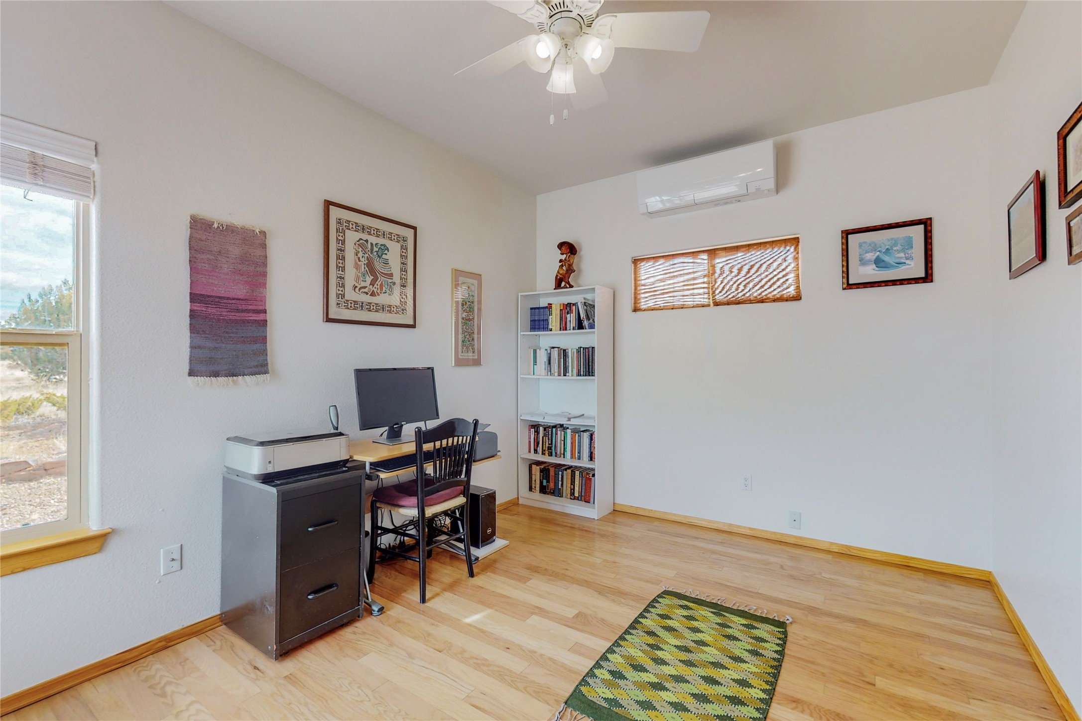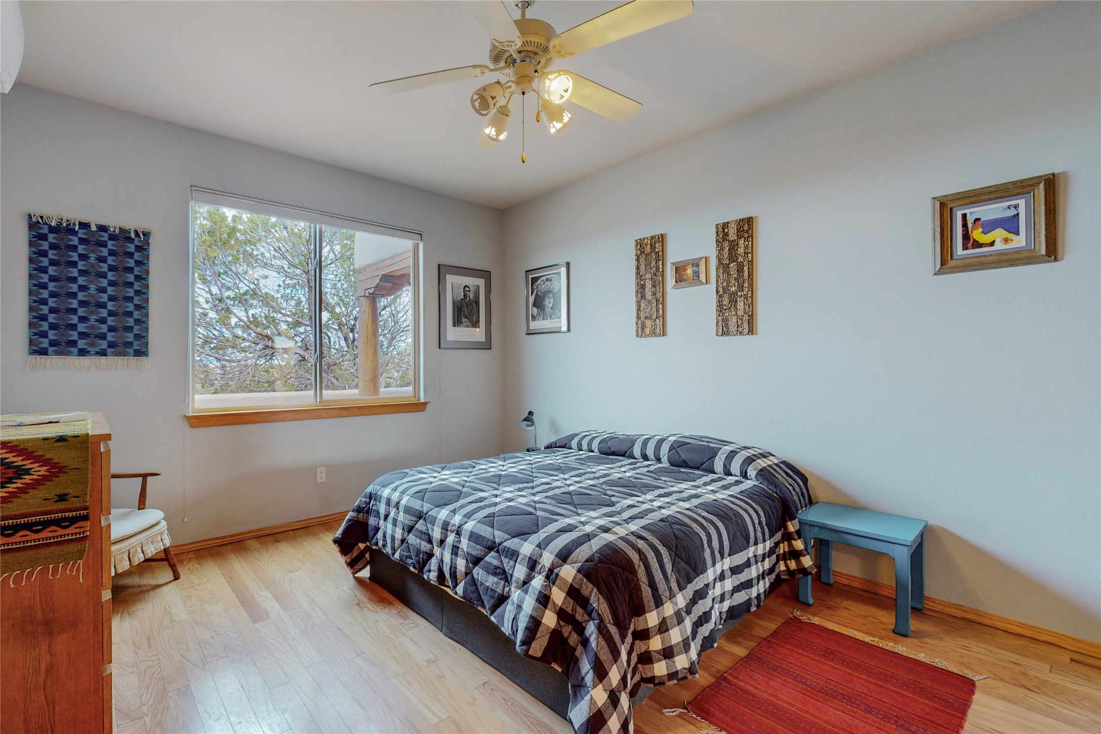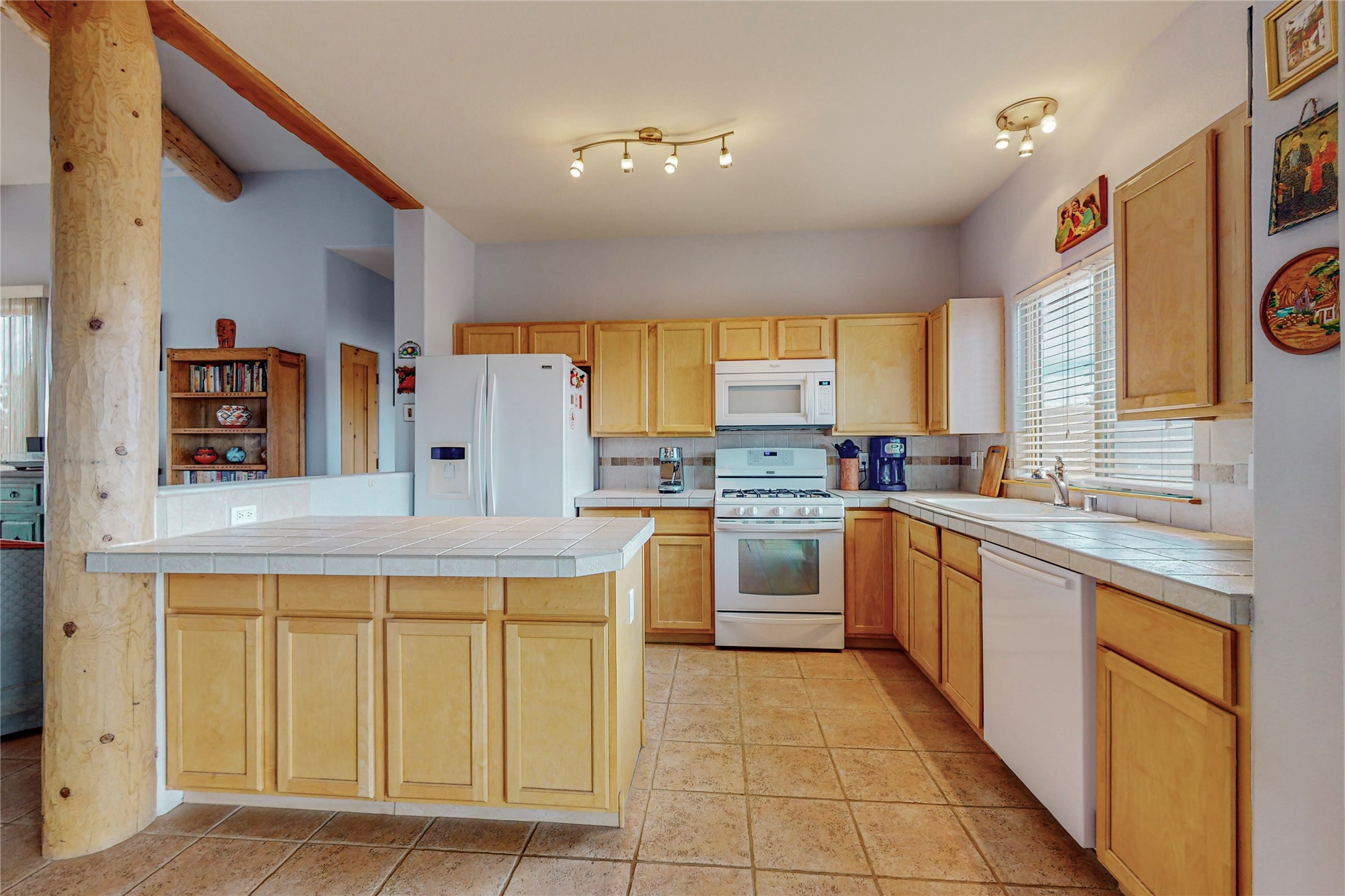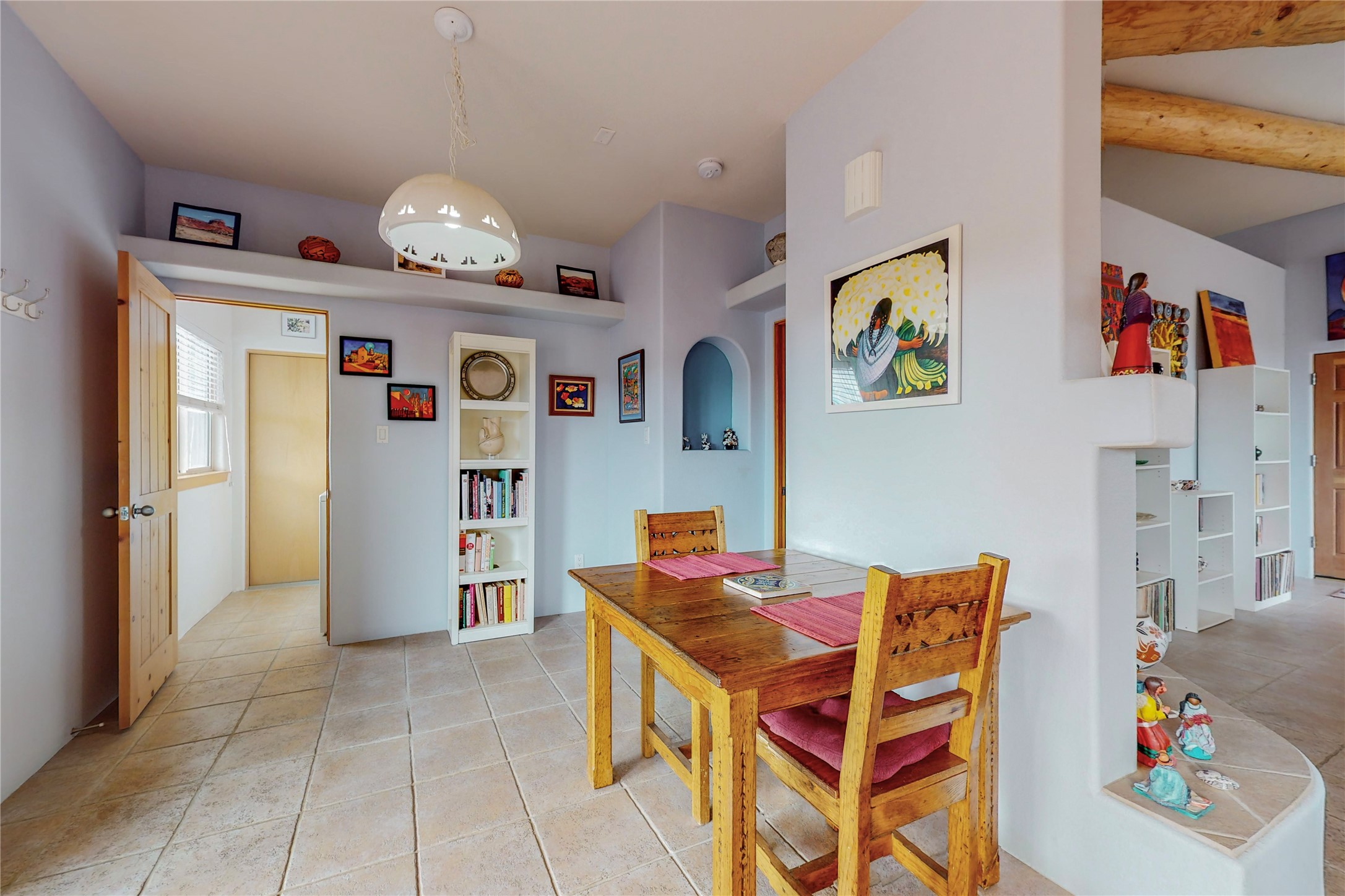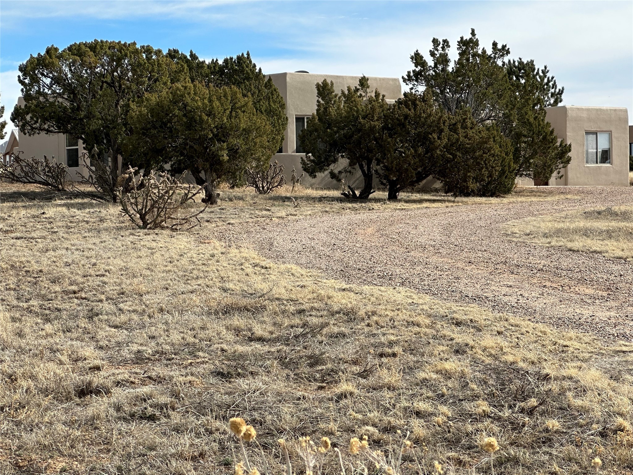 Sparkling light open plan contemporary pueblo Eldorado home with heated and cooled detached studio on high mountain view lot. Simply delightful open plan split 3 bedroom, 2 bath design plus 3/4 bath in Studio. This lovely home is in sparkling condition and shows light and bright throughout. New Navien boiler, hot water heater, casita storm door / 2 windows and awning and dog fenced area in 2021/2022. Stucco, roof and general home maintenance updated to 2022/2023. Fabulous Sangre de Cristo and Jemez mountain views from the living room with vigas and kiva fireplace. Open kitchen with dining area flowing to private walled patio for outside entertaining. Wood floors in bedrooms, tile floors in main living areas. Close to paved Avenida Eldorado for quick access to Eldorado community amenities, local shopping and services, only minutes into Santa Fe