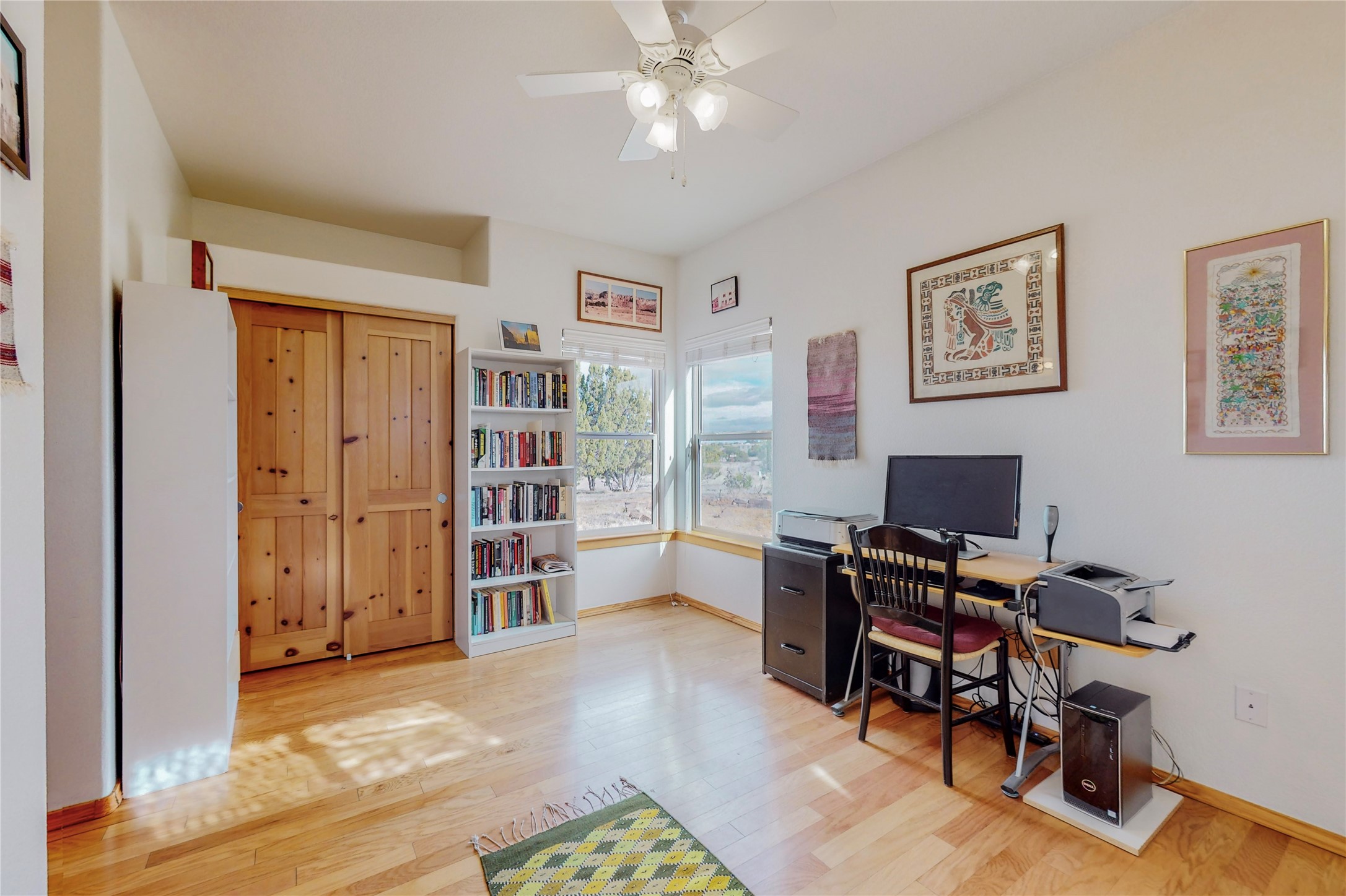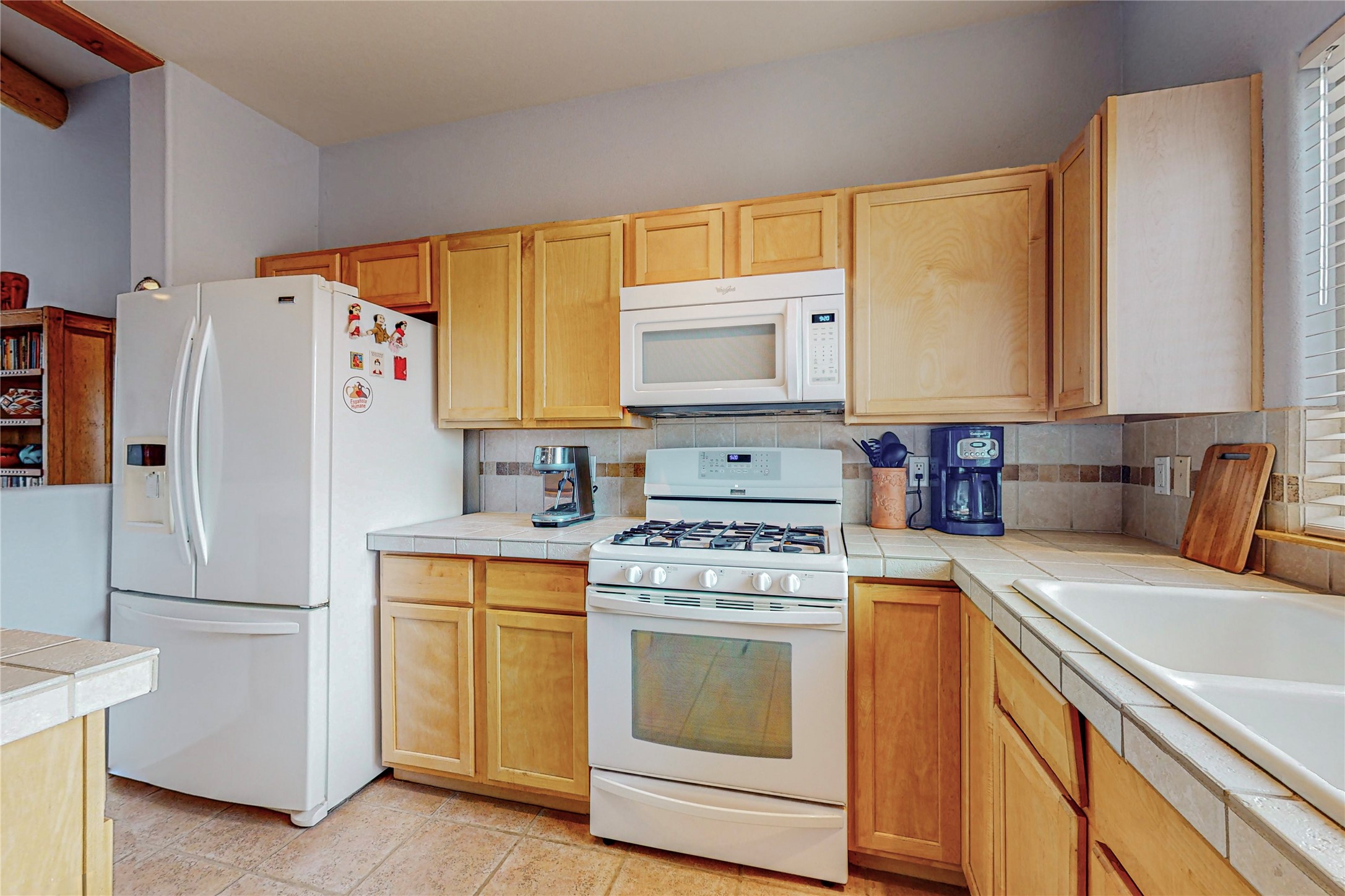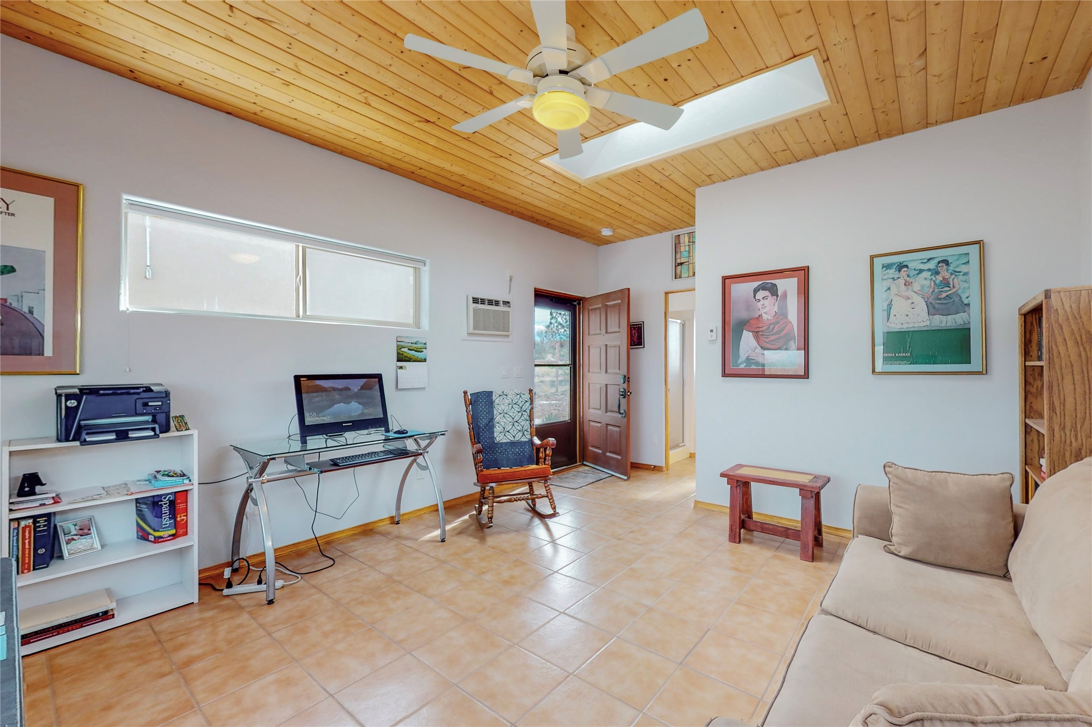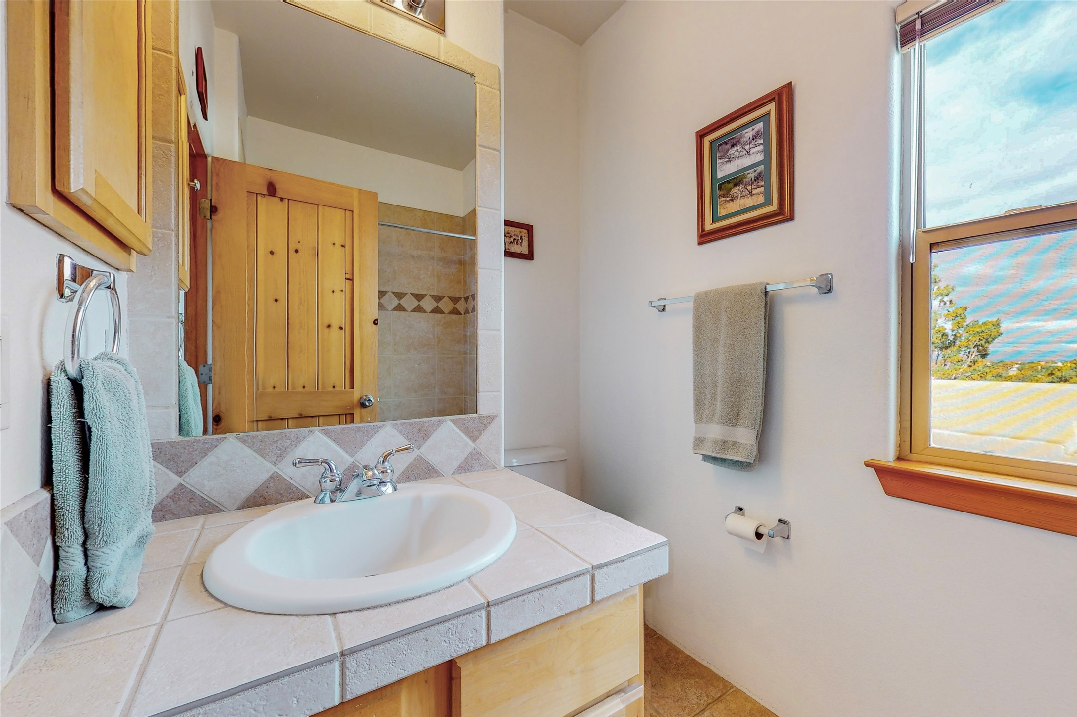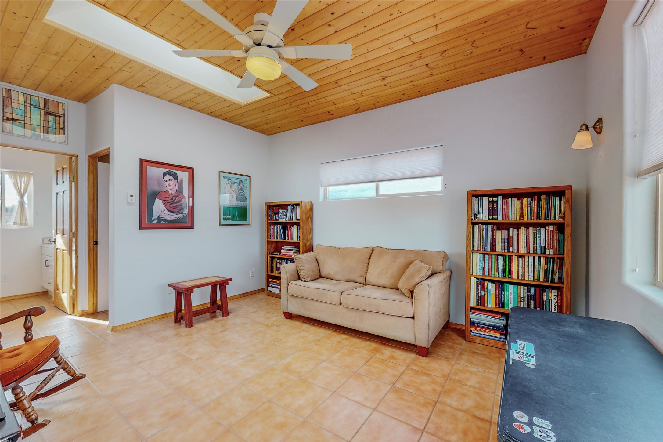Sparkling light open plan contemporary pueblo Eldorado home with heated and cooled detached studio on high mountain view lot. Simply delightful open plan split 3 bedroom, 2 bath design plus 3/4 bath in Studio. This lovely home is in sparkling condition and shows light and bright throughout. New Navien boiler, hot water heater, casita storm door / 2 windows and awning and dog fenced area in 2021/2022. Stucco, roof and general home maintenance updated to 2022/2023. Fabulous Sangre de Cristo and Jemez mountain views from the living room with vigas and kiva fireplace. Open kitchen with dining area flowing to private walled patio for outside entertaining. Wood floors in bedrooms, tile floors in main living areas. Close to paved Avenida Eldorado for quick access to Eldorado community amenities, local shopping and services, only minutes into Santa Fe