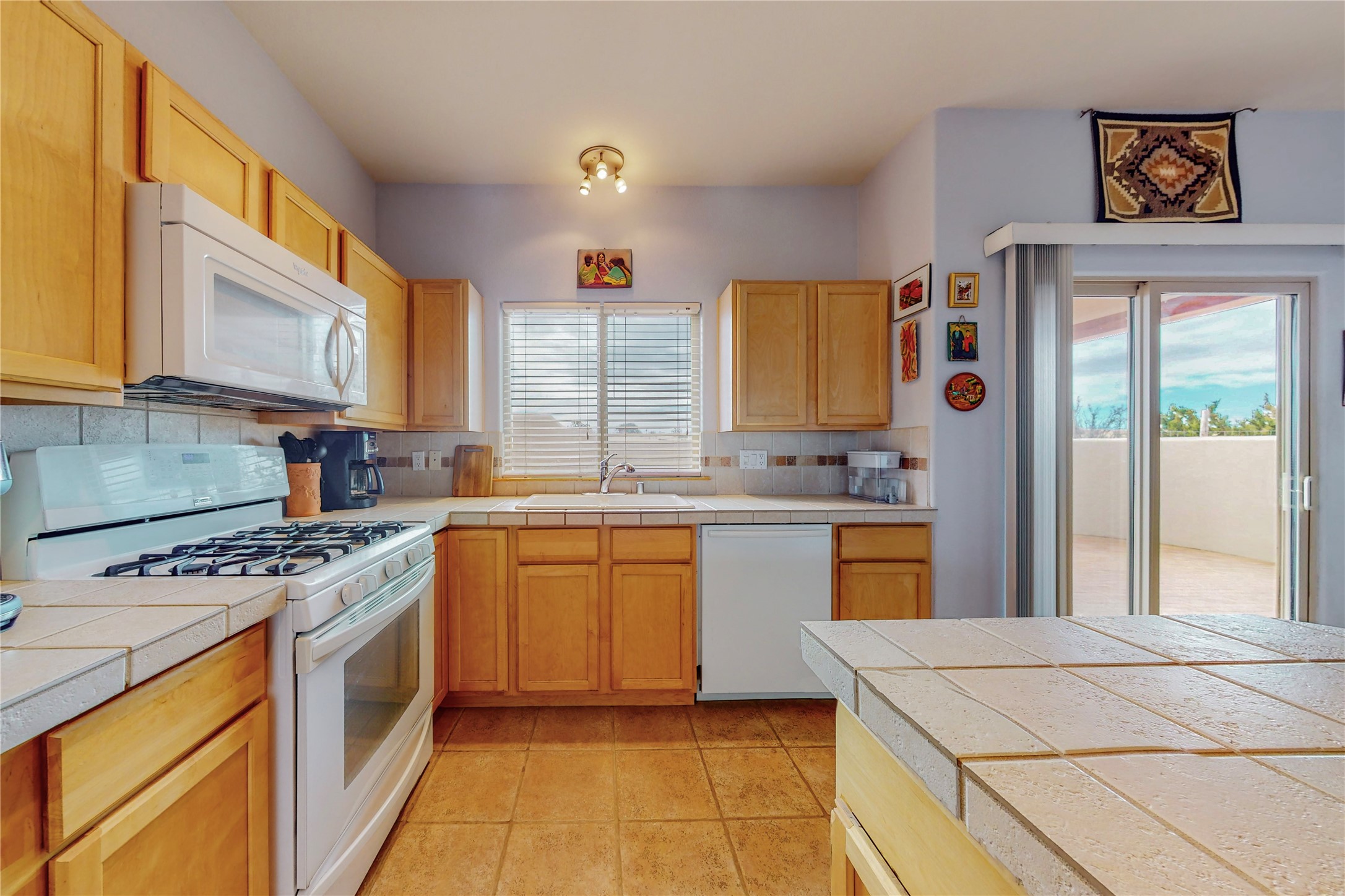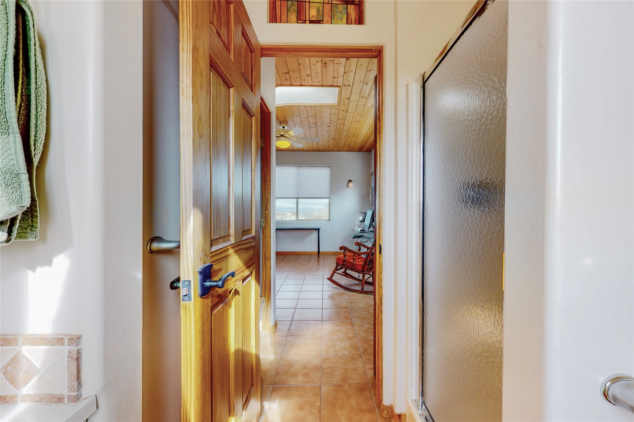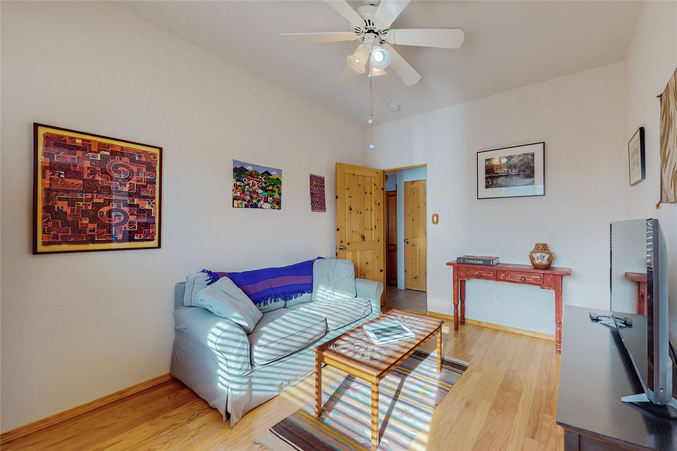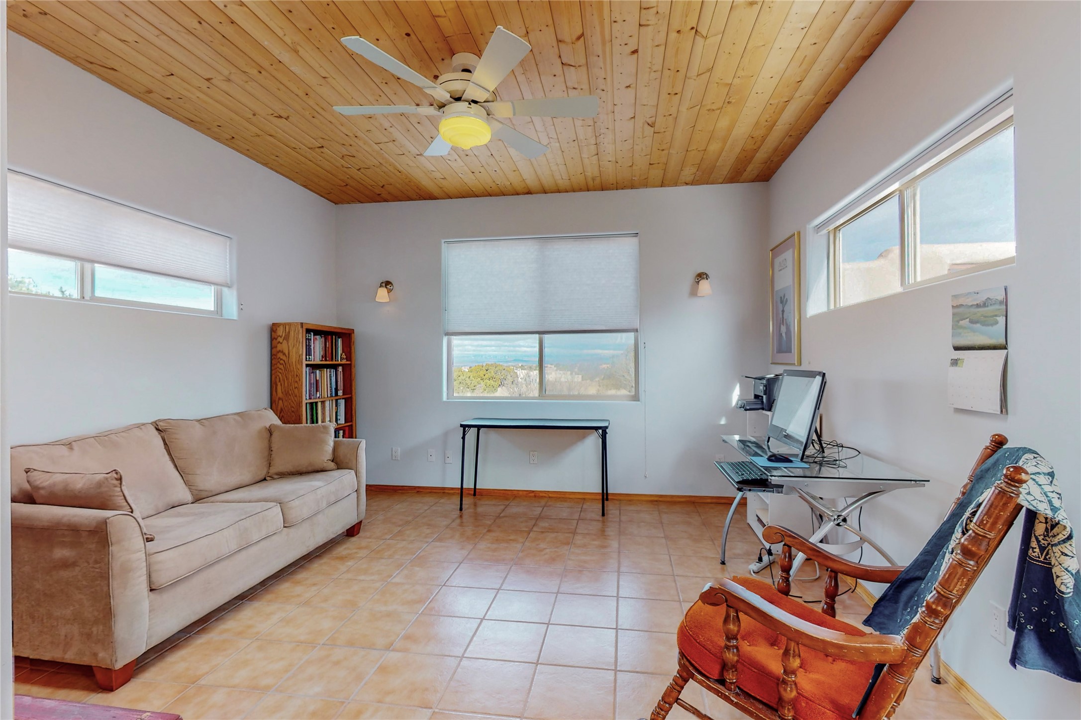 Sparkling light open plan contemporary pueblo Eldorado home with heated and cooled detached studio on high mountain view lot. Simply delightful open plan split 3 bedroom, 2 bath design plus 3/4 bath in Studio. This lovely home is in sparkling condition and shows light and bright throughout. New Navien boiler, hot water heater, casita storm door / 2 windows and awning and dog fenced area in 2021/2022. Stucco, roof and general home maintenance updated to 2022/2023. Fabulous Sangre de Cristo and Jemez mountain views from the living room with vigas and kiva fireplace. Open kitchen with dining area flowing to private walled patio for outside entertaining. Wood floors in bedrooms, tile floors in main living areas. Close to paved Avenida Eldorado for quick access to Eldorado community amenities, local shopping and services, only minutes into Santa Fe