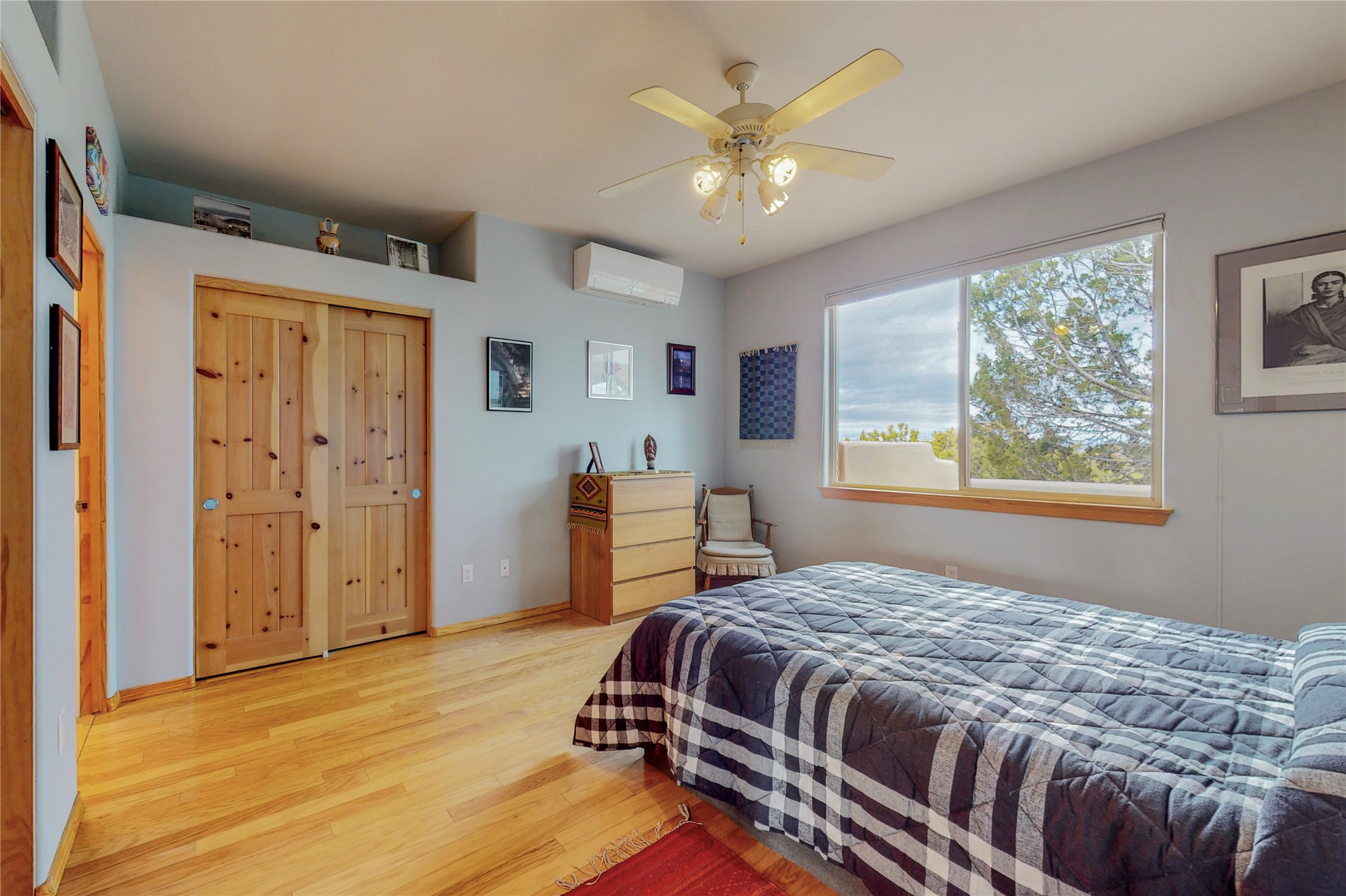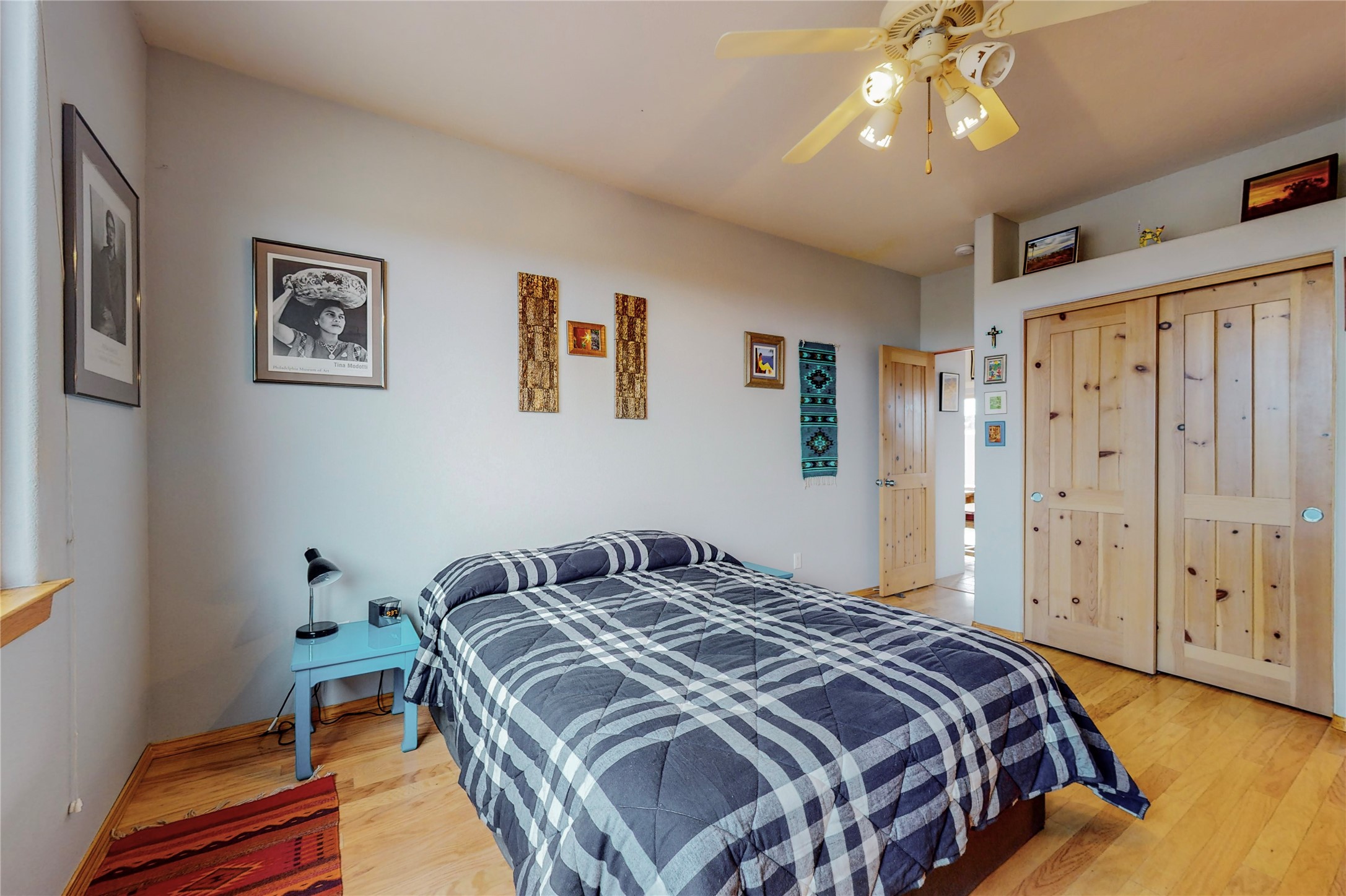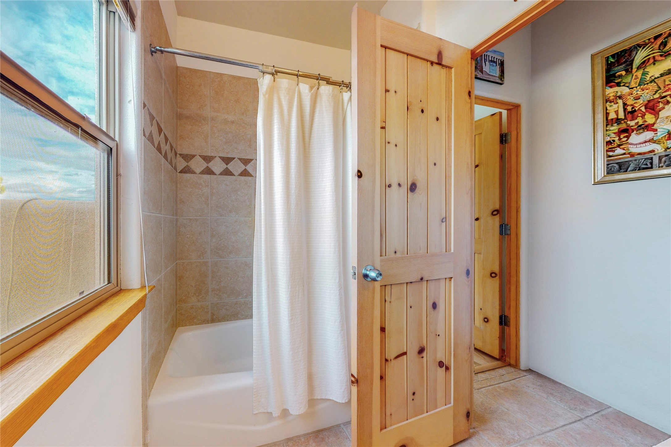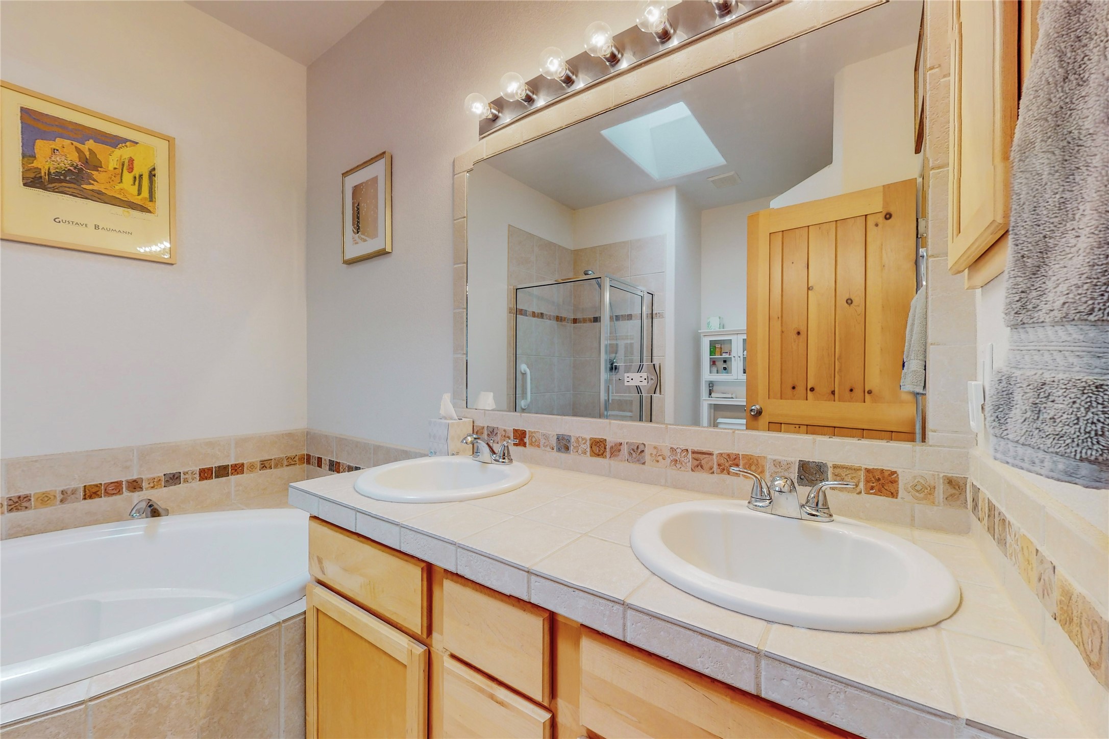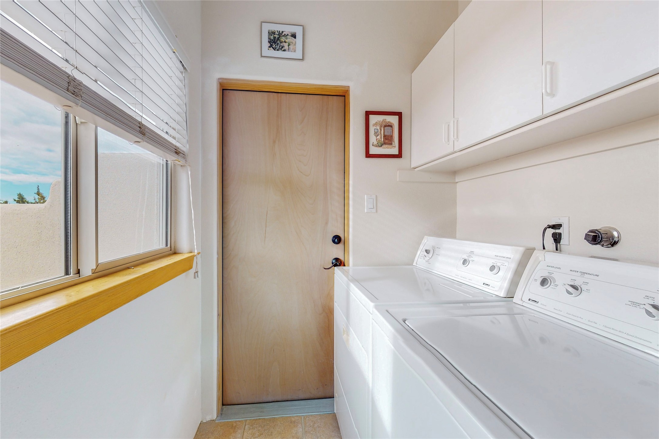 Sparkling light open plan contemporary pueblo Eldorado home with heated and cooled detached studio on high mountain view lot. Simply delightful open plan split 3 bedroom, 2 bath design plus 3/4 bath in Studio. This lovely home is in sparkling condition and shows light and bright throughout. New Navien boiler, hot water heater, casita storm door / 2 windows and awning and dog fenced area in 2021/2022. Stucco, roof and general home maintenance updated to 2022/2023. Fabulous Sangre de Cristo and Jemez mountain views from the living room with vigas and kiva fireplace. Open kitchen with dining area flowing to private walled patio for outside entertaining. Wood floors in bedrooms, tile floors in main living areas. Close to paved Avenida Eldorado for quick access to Eldorado community amenities, local shopping and services, only minutes into Santa Fe