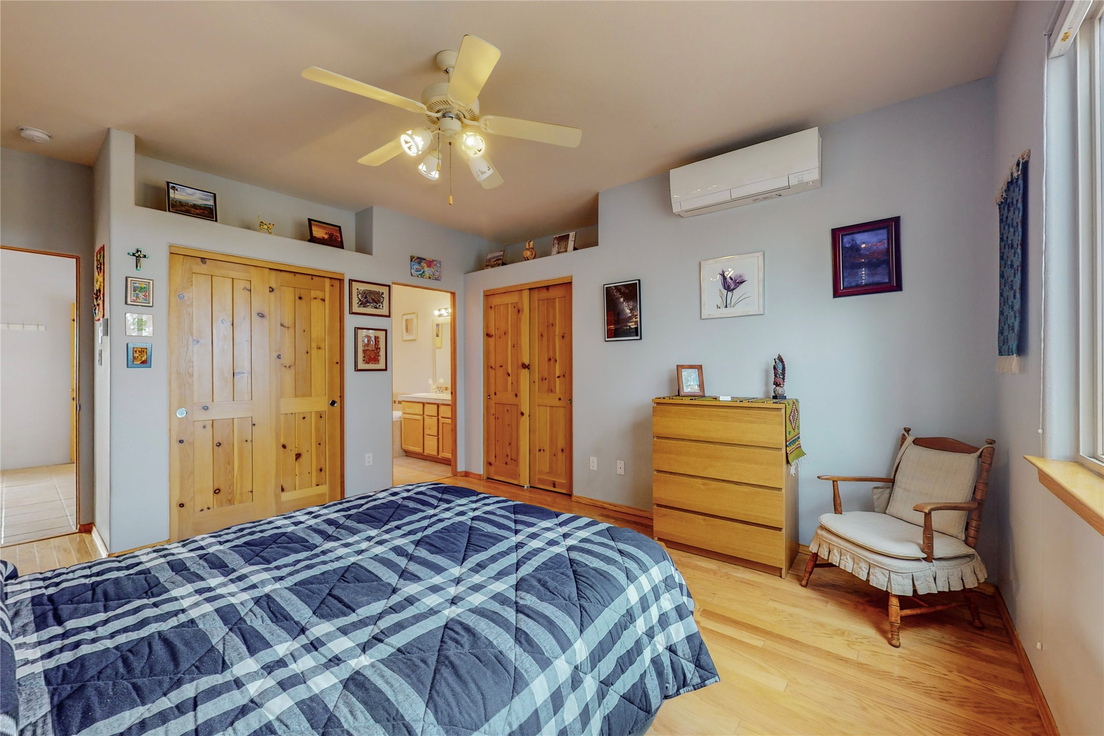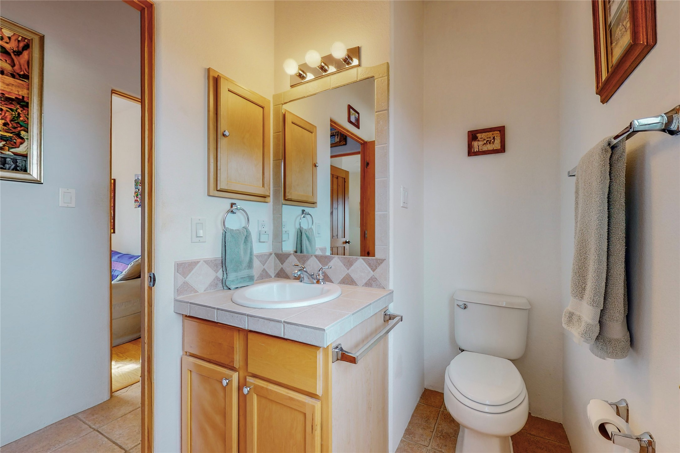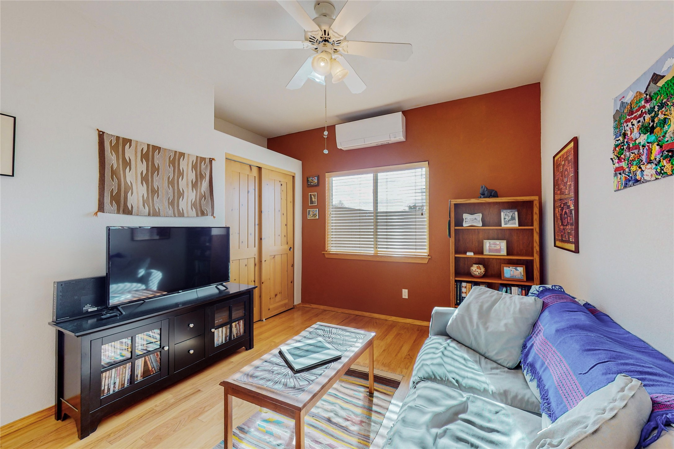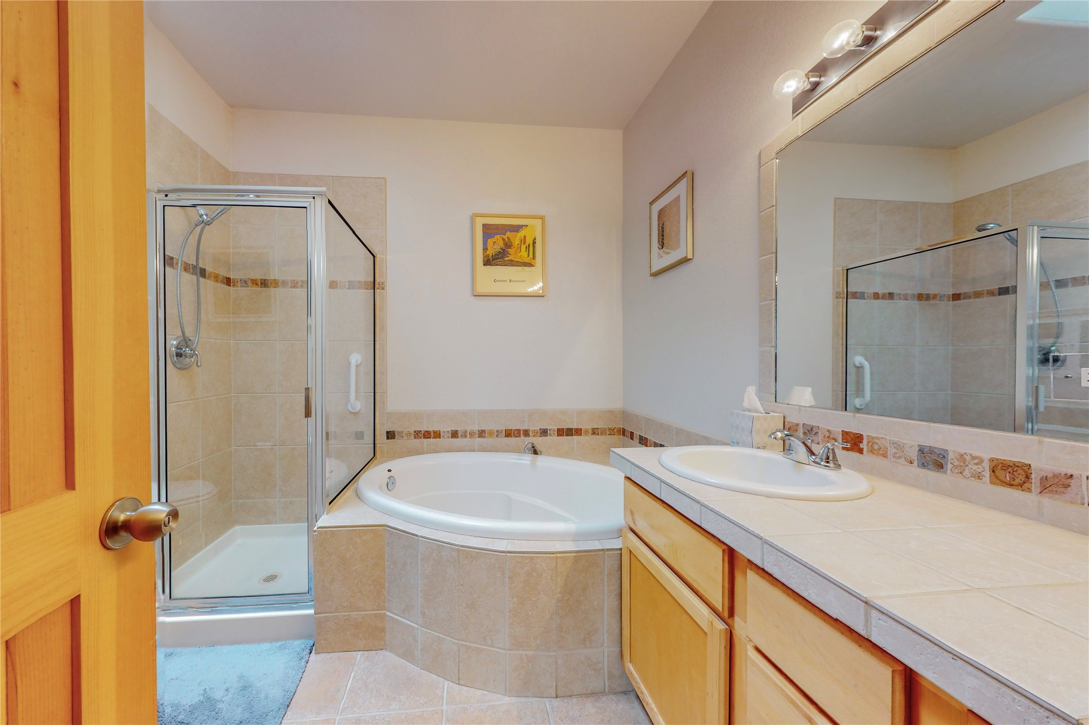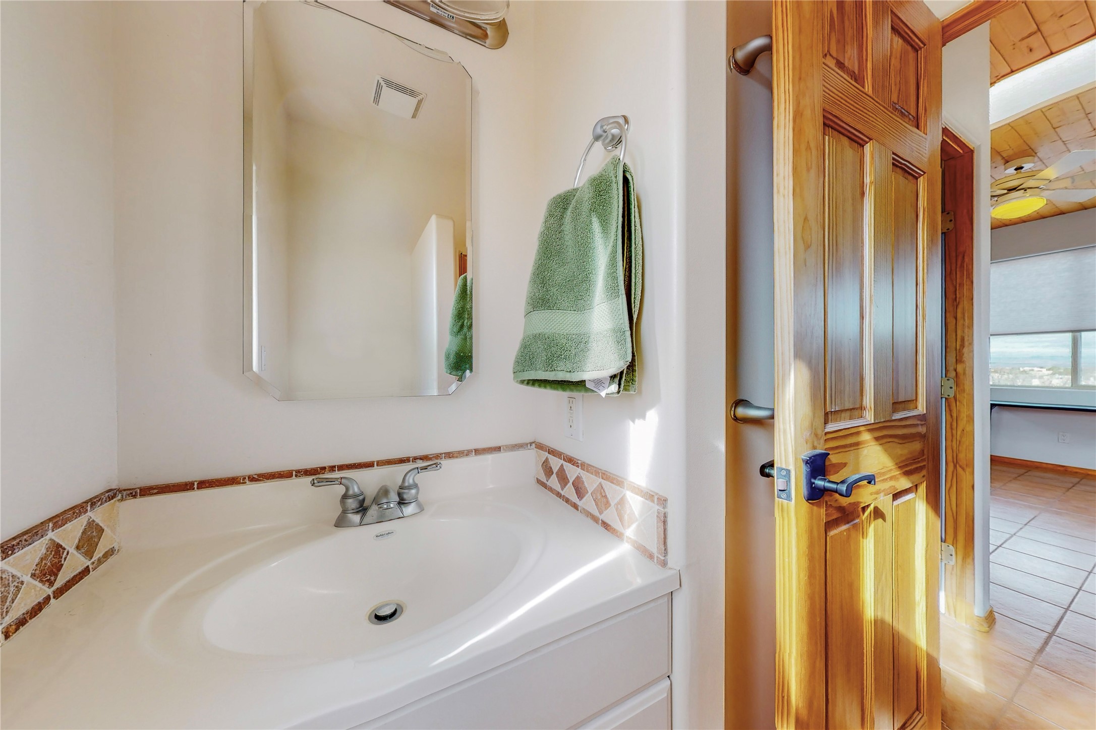 Sparkling light open plan contemporary pueblo Eldorado home with heated and cooled detached studio on high mountain view lot. Simply delightful open plan split 3 bedroom, 2 bath design plus 3/4 bath in Studio. This lovely home is in sparkling condition and shows light and bright throughout. New Navien boiler, hot water heater, casita storm door / 2 windows and awning and dog fenced area in 2021/2022. Stucco, roof and general home maintenance updated to 2022/2023. Fabulous Sangre de Cristo and Jemez mountain views from the living room with vigas and kiva fireplace. Open kitchen with dining area flowing to private walled patio for outside entertaining. Wood floors in bedrooms, tile floors in main living areas. Close to paved Avenida Eldorado for quick access to Eldorado community amenities, local shopping and services, only minutes into Santa Fe