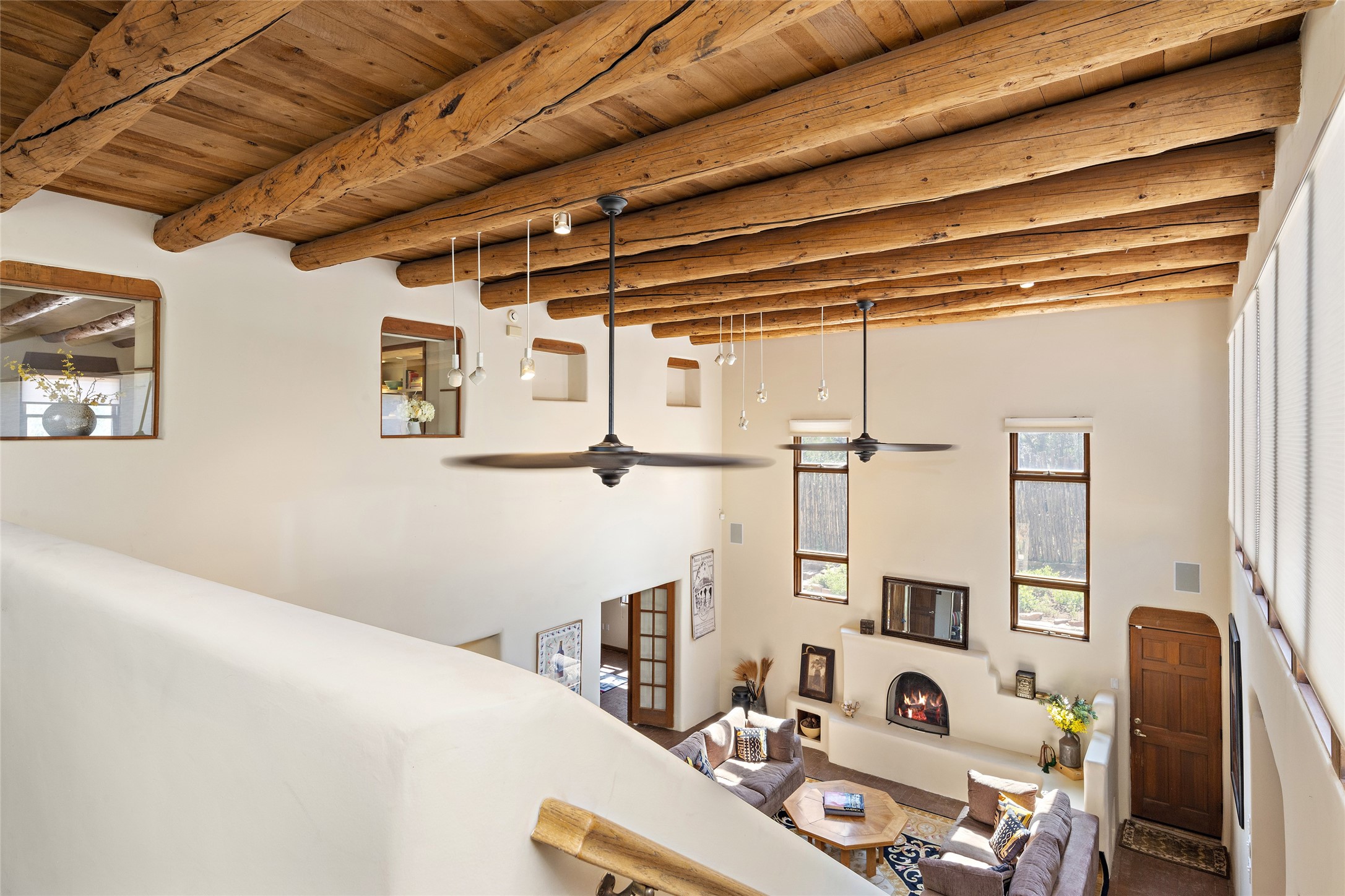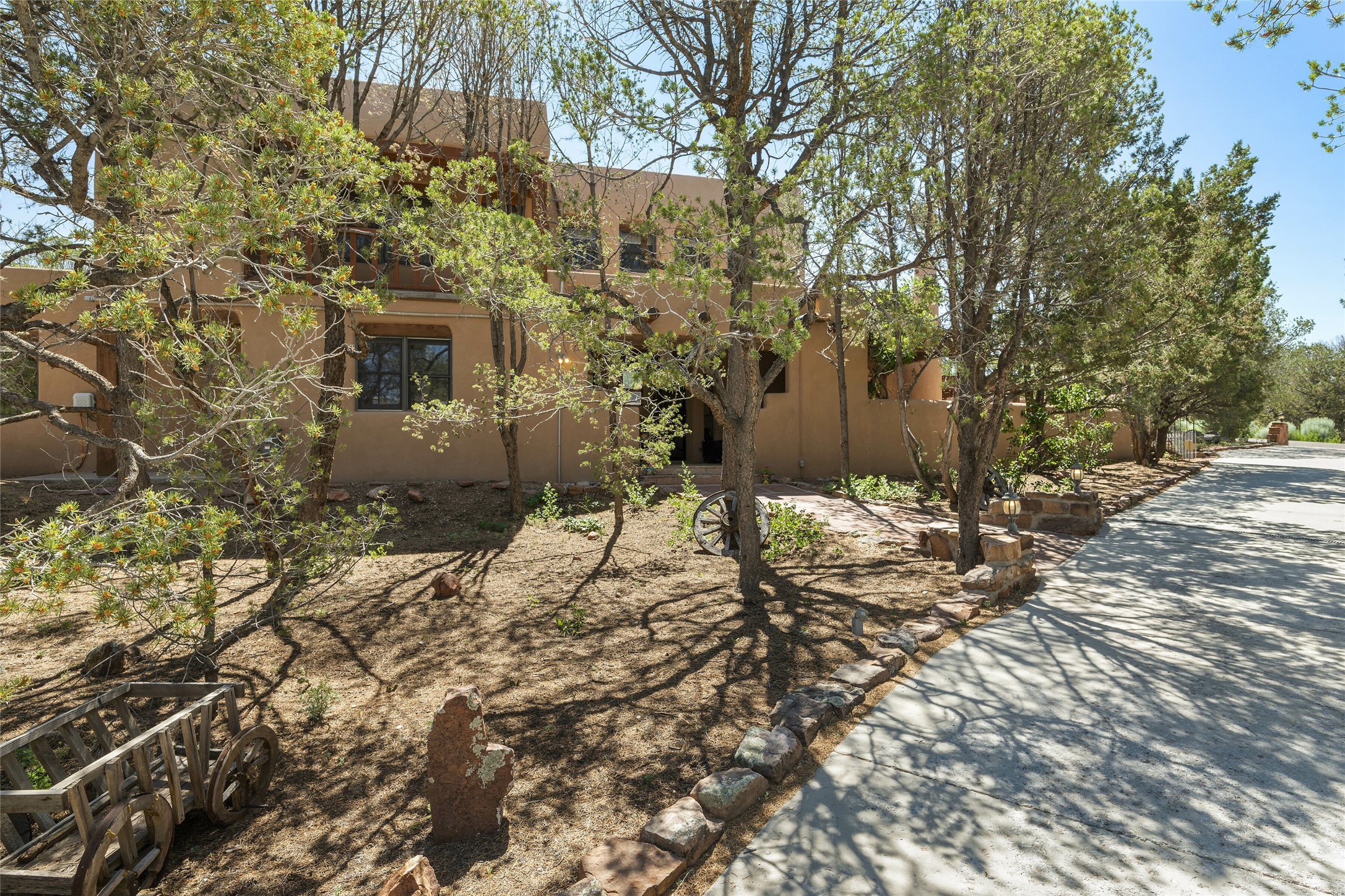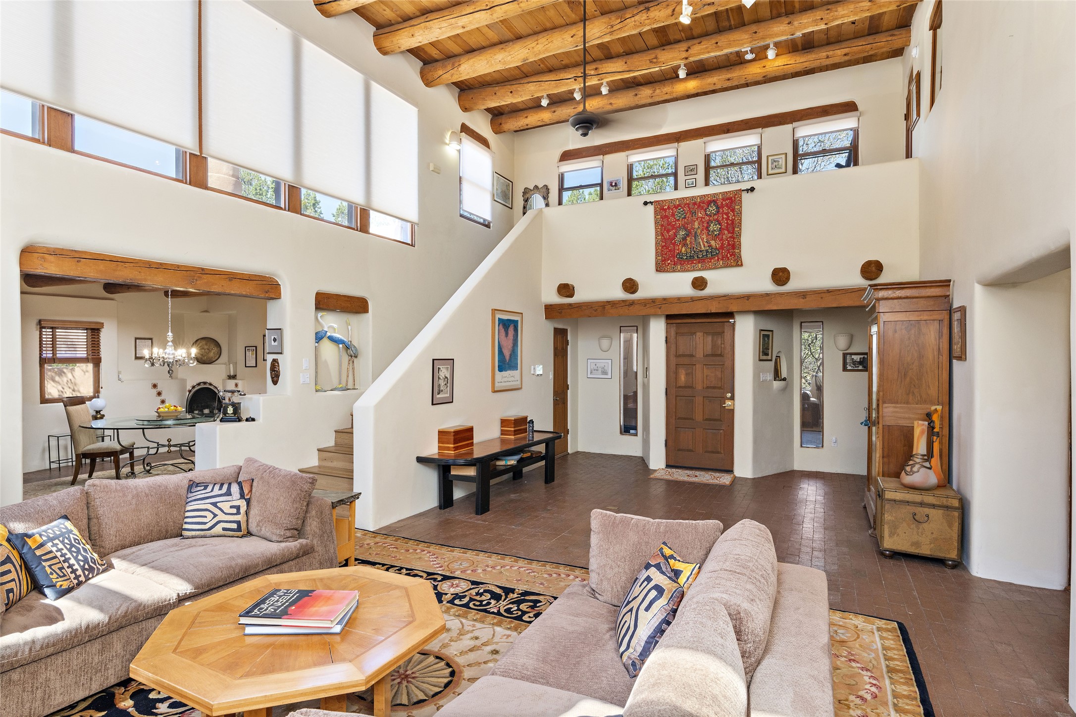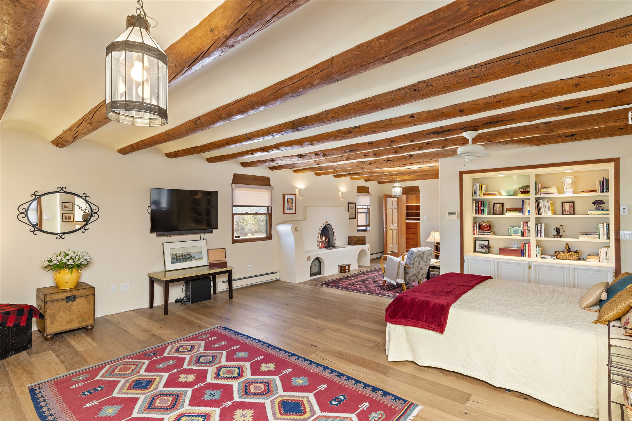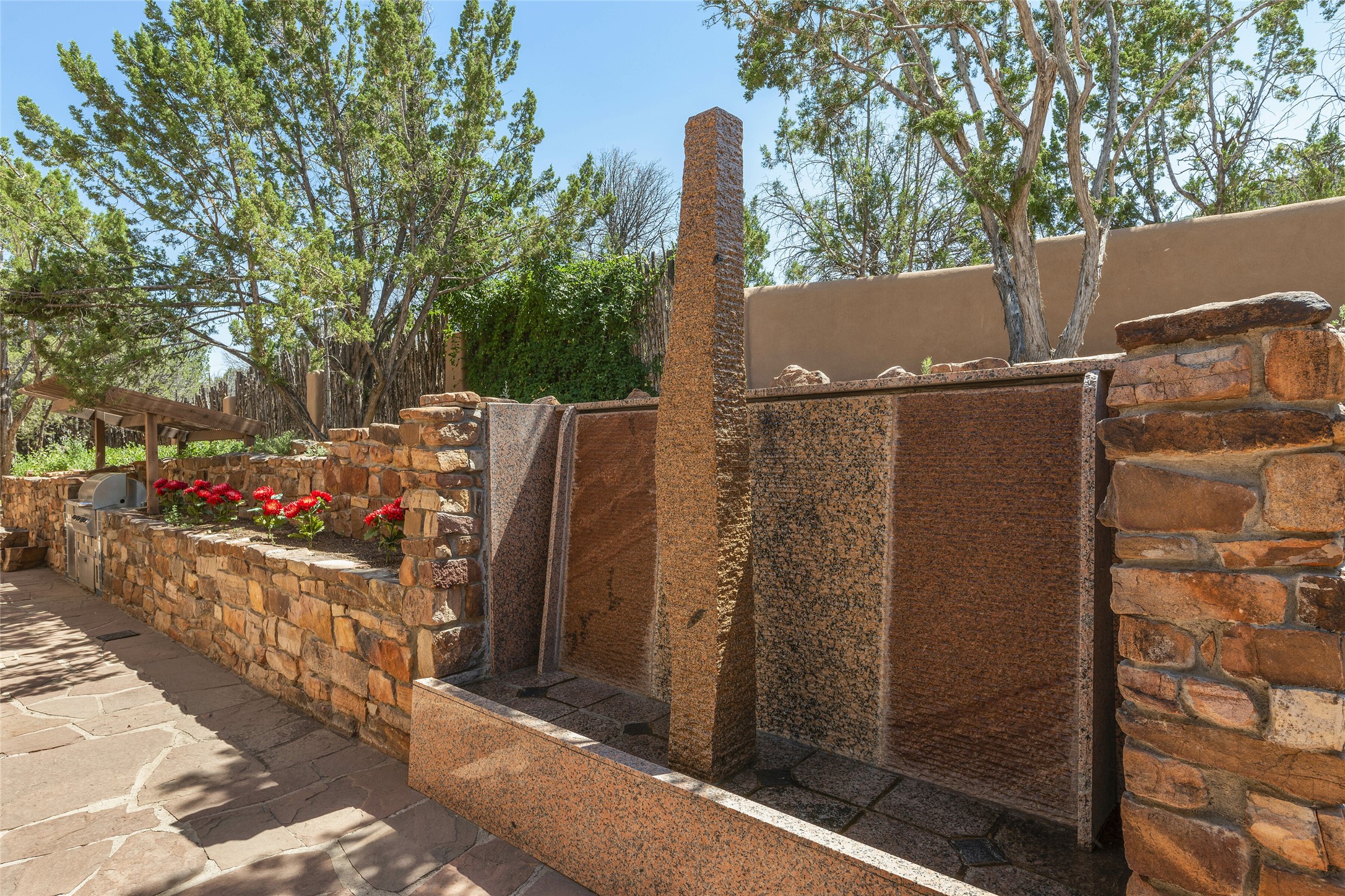 Just off the Old Santa Fe Trail, with the iconic Sun Mountain as the backdrop, this home is conveniently located close to Museum Hill and only 2.5 miles to the Plaza. There is ample space for flexibility in the residence with separate office, large den, storage rooms, and an oversized garage. The grand living room is graced by vaulted ceilings, spacious art walls, nichos and abundant natural light. The kitchen features granite countertops, Wolf cooktop and double-ovens, Subzero beverage cooler, and built-in buffet and china cabinet. The dining area has a kiva fireplace that is perfect for fireside meals. Set apart on the upper level is the gracious primary suite that features a balcony, coved viga ceiling, sitting area with fireplace, and a well-appointed closet with center island of drawers and a separate cedar-lined closet. On the main level is a guest bedroom with en suite bath. There is also a four-bedroom attached "live/work" space with two bathrooms and a large common area that provides privacy for guests or the flexibility for home offices. The outdoor entertainment spaces take full advantage of Santa Fe living: the expansive patio off the kitchen with a kiva fireplace, built-in grill, and a granite water feature by renowned sculptor Jesus Bautista Moroles, recipient of the 2008 Medal of Arts award. The garden beds are irrigated by an underground water catchment system. This is the perfect setting to entertain family and friends.