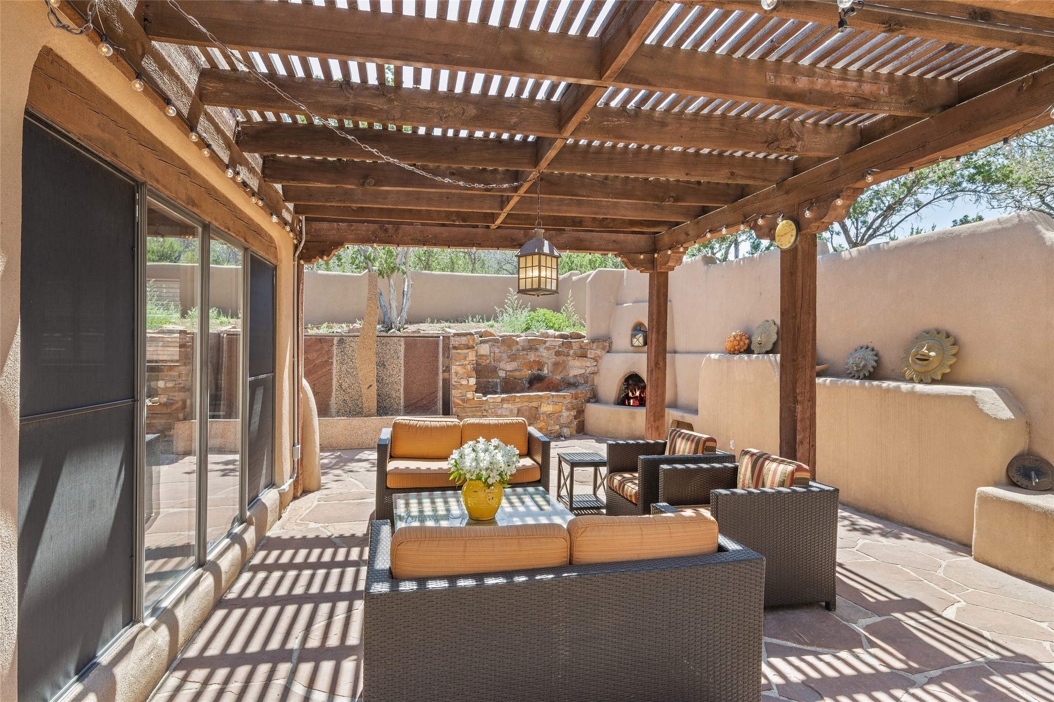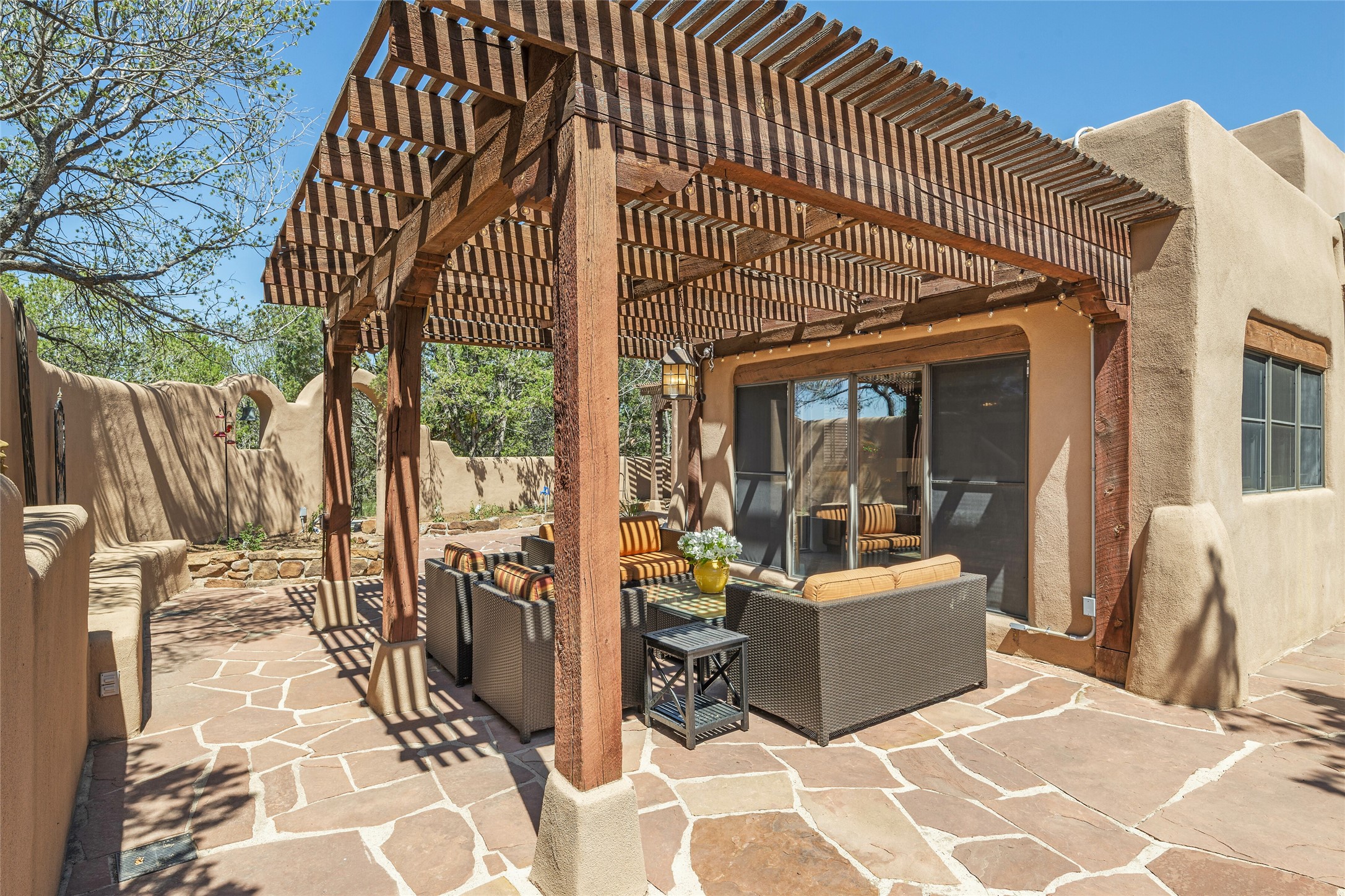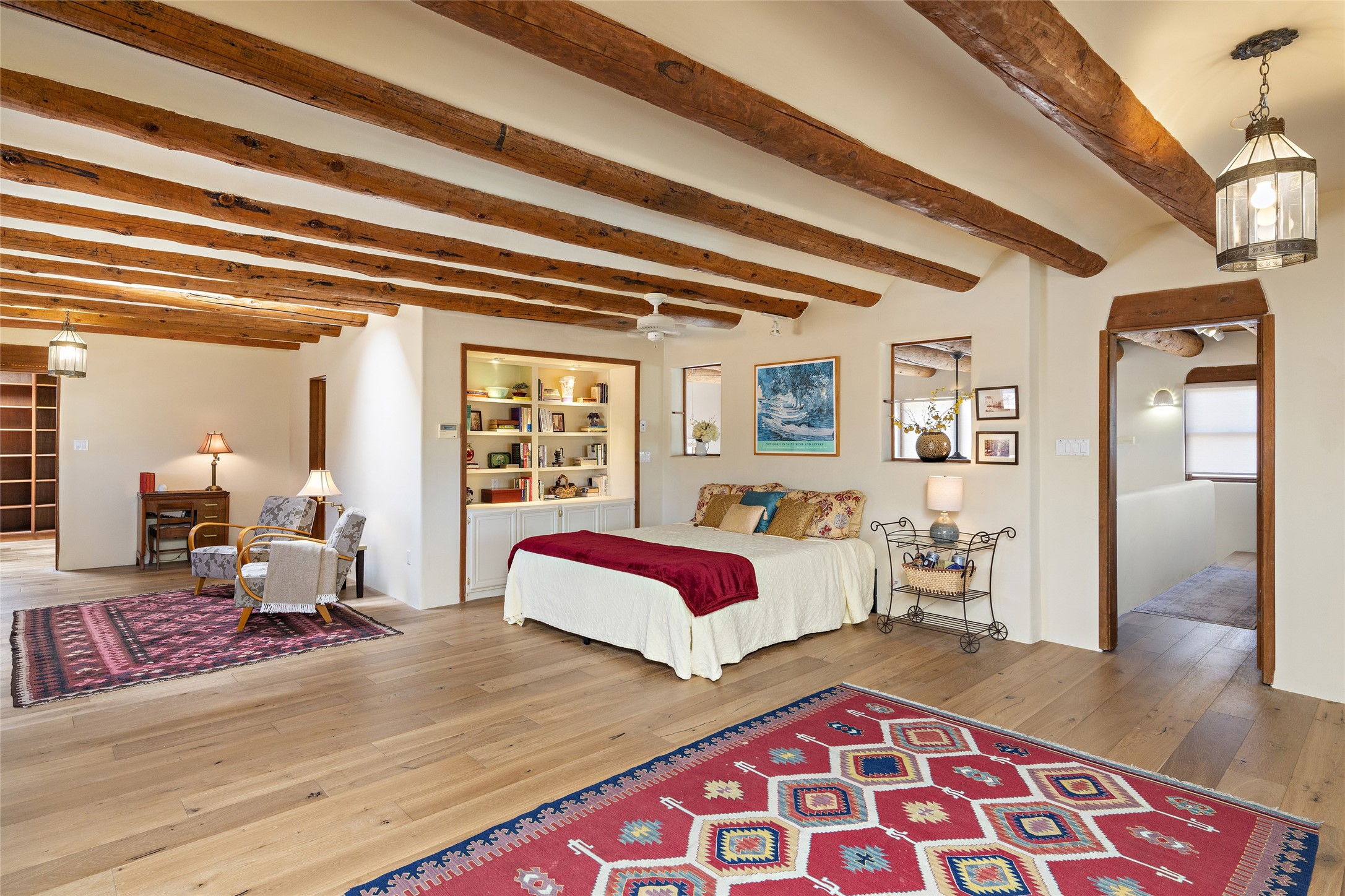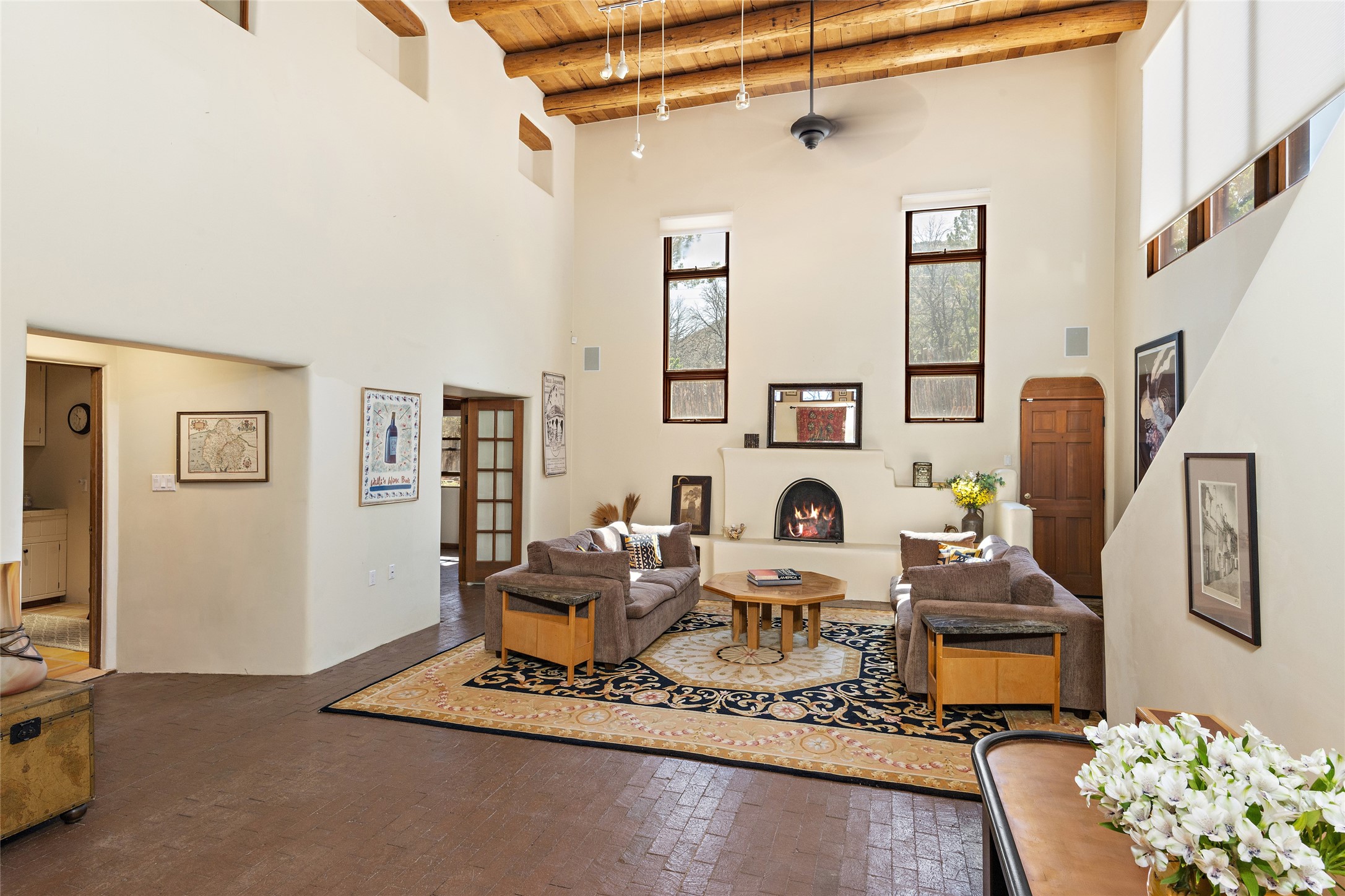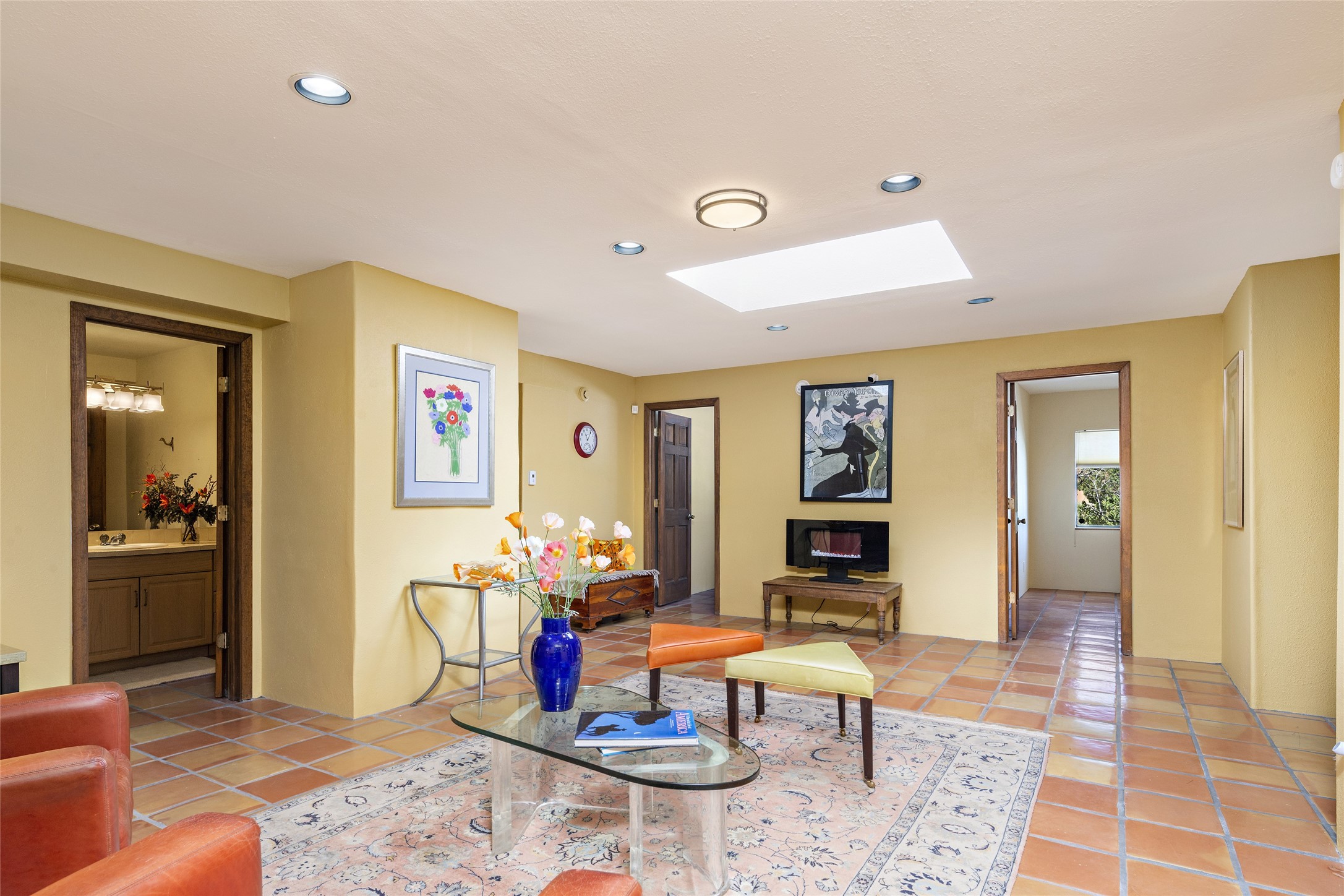 Just off the Old Santa Fe Trail, with the iconic Sun Mountain as the backdrop, this home is conveniently located close to Museum Hill and only 2.5 miles to the Plaza. There is ample space for flexibility in the residence with separate office, large den, storage rooms, and an oversized garage. The grand living room is graced by vaulted ceilings, spacious art walls, nichos and abundant natural light. The kitchen features granite countertops, Wolf cooktop and double-ovens, Subzero beverage cooler, and built-in buffet and china cabinet. The dining area has a kiva fireplace that is perfect for fireside meals. Set apart on the upper level is the gracious primary suite that features a balcony, coved viga ceiling, sitting area with fireplace, and a well-appointed closet with center island of drawers and a separate cedar-lined closet. On the main level is a guest bedroom with en suite bath. There is also a four-bedroom attached "live/work" space with two bathrooms and a large common area that provides privacy for guests or the flexibility for home offices. The outdoor entertainment spaces take full advantage of Santa Fe living: the expansive patio off the kitchen with a kiva fireplace, built-in grill, and a granite water feature by renowned sculptor Jesus Bautista Moroles, recipient of the 2008 Medal of Arts award. The garden beds are irrigated by an underground water catchment system. This is the perfect setting to entertain family and friends.