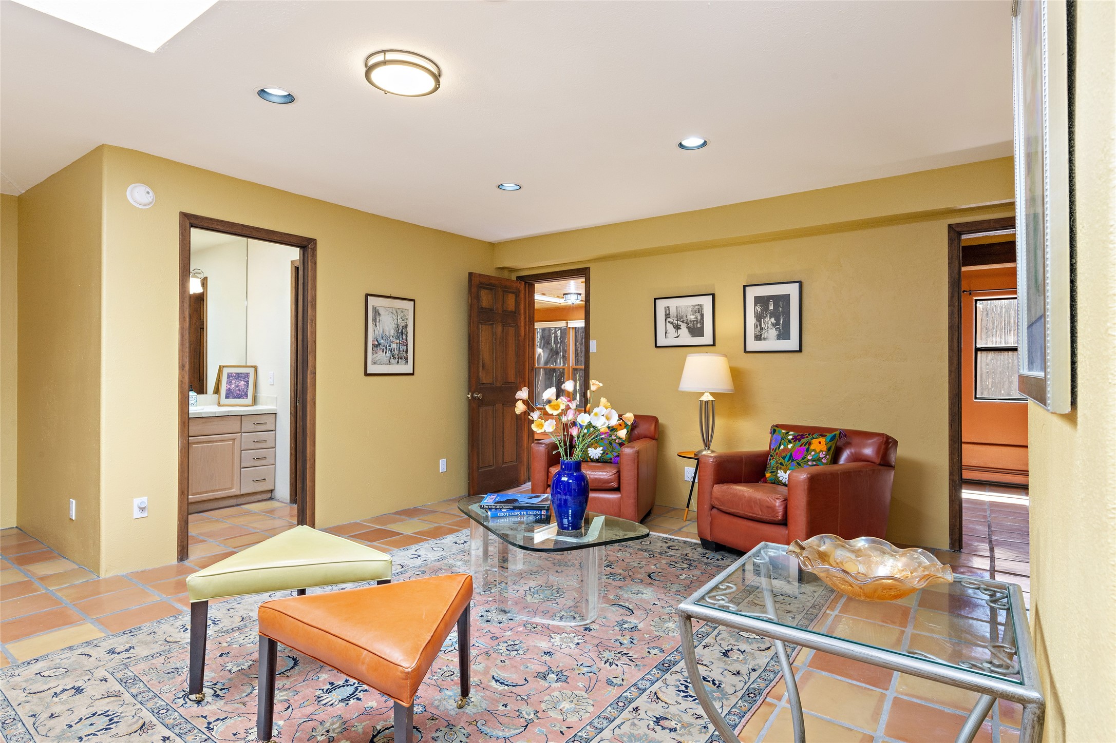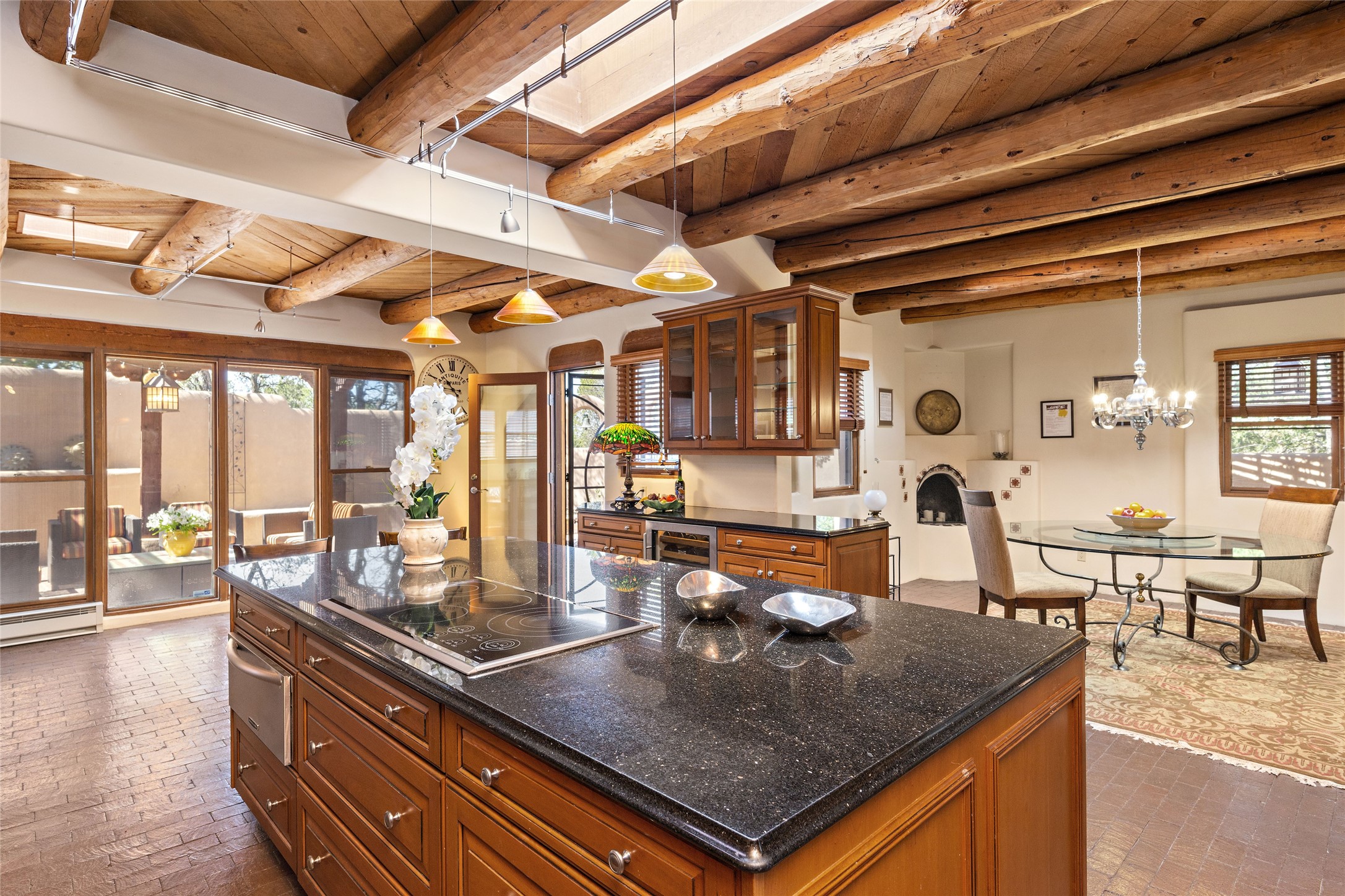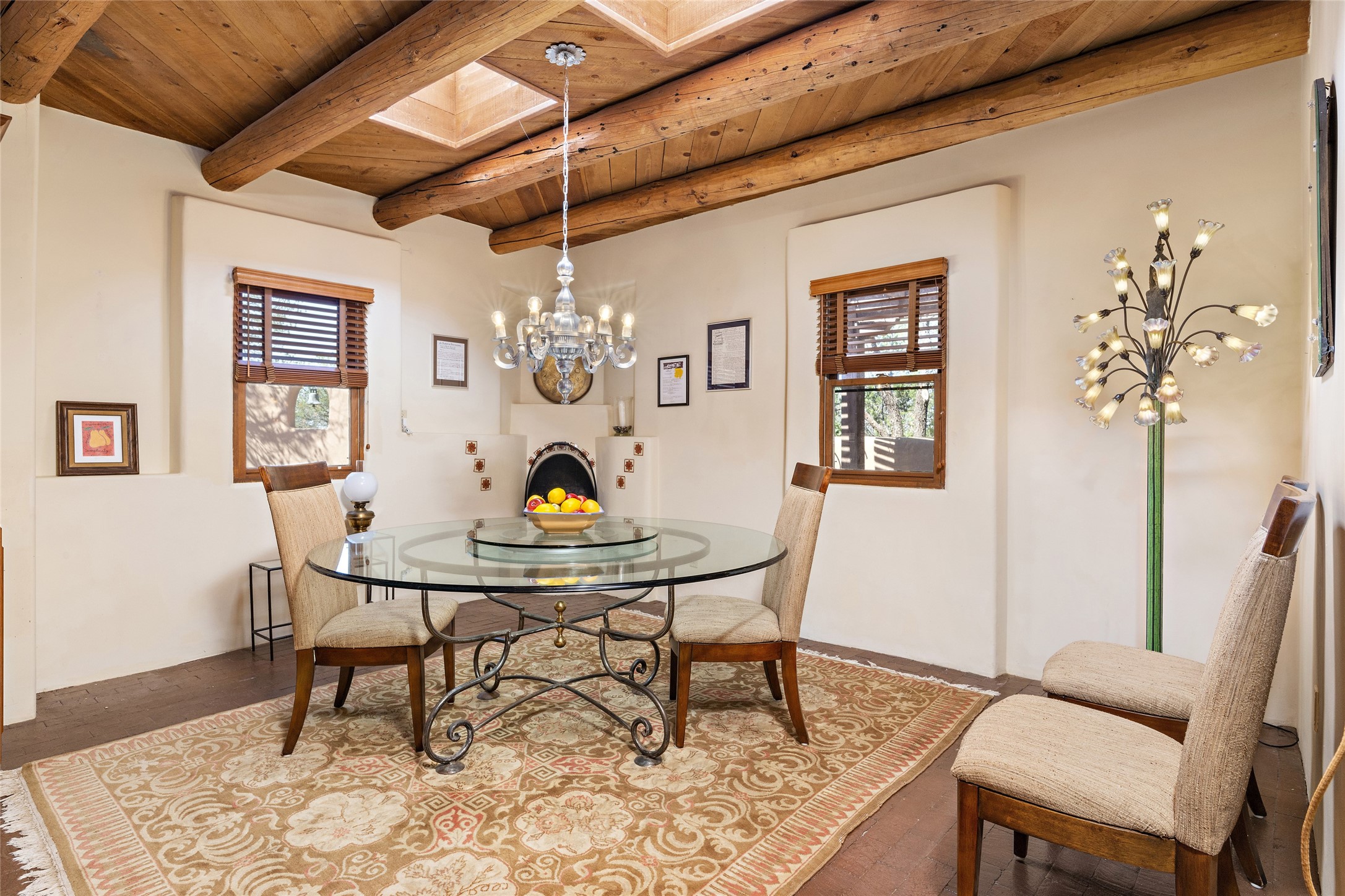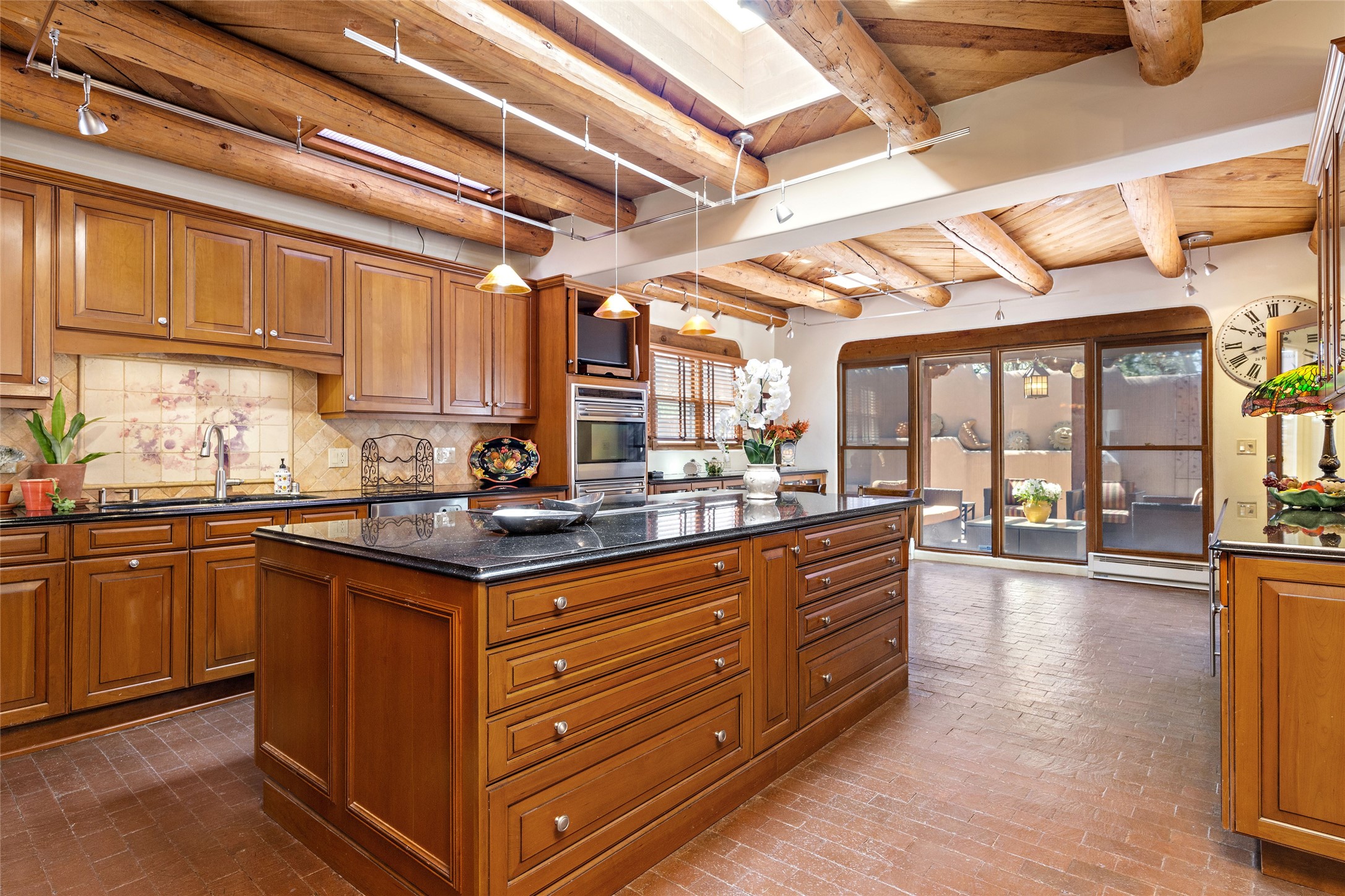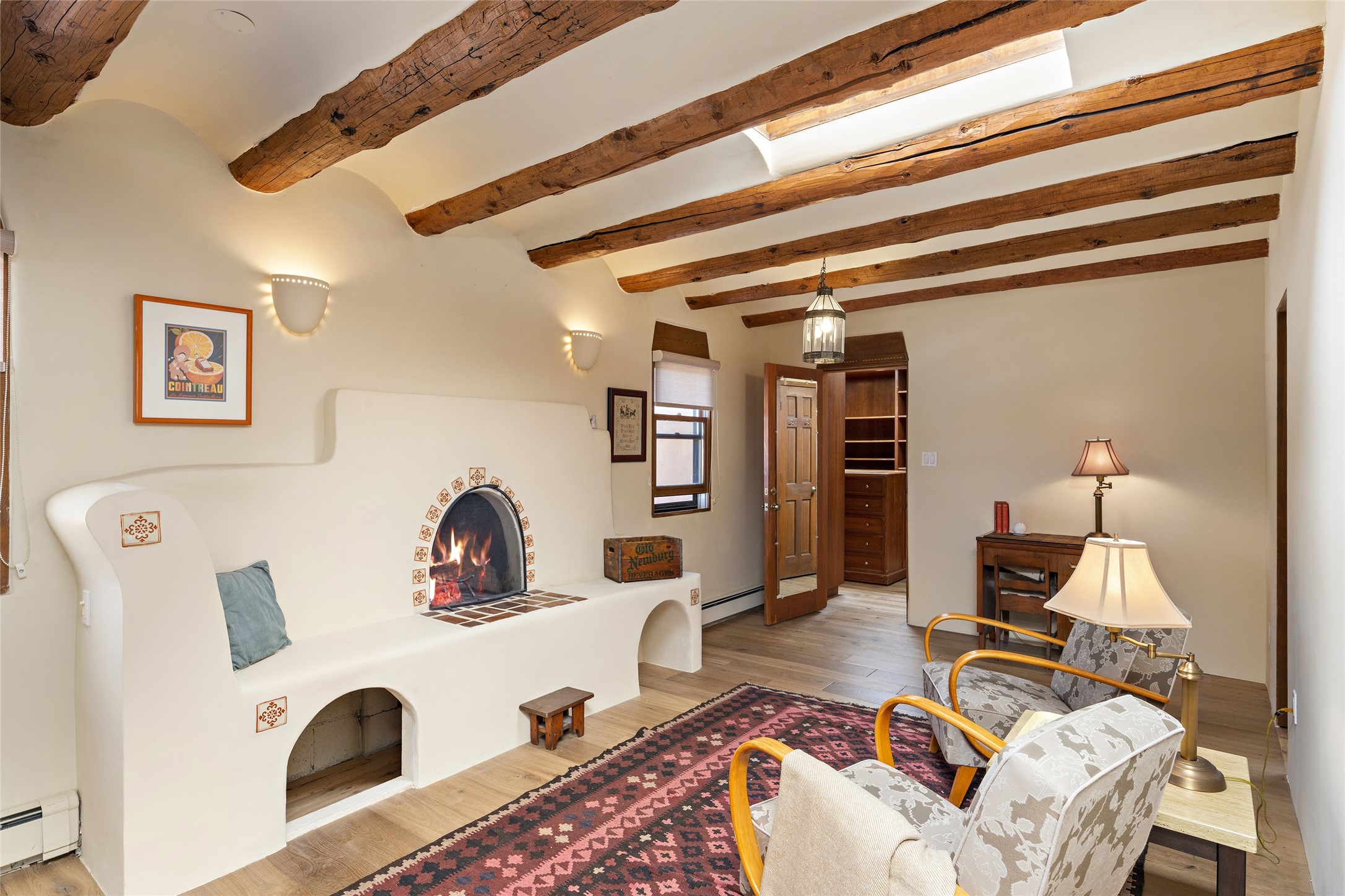 Just off the Old Santa Fe Trail, with the iconic Sun Mountain as the backdrop, this home is conveniently located close to Museum Hill and only 2.5 miles to the Plaza. There is ample space for flexibility in the residence with separate office, large den, storage rooms, and an oversized garage. The grand living room is graced by vaulted ceilings, spacious art walls, nichos and abundant natural light. The kitchen features granite countertops, Wolf cooktop and double-ovens, Subzero beverage cooler, and built-in buffet and china cabinet. The dining area has a kiva fireplace that is perfect for fireside meals. Set apart on the upper level is the gracious primary suite that features a balcony, coved viga ceiling, sitting area with fireplace, and a well-appointed closet with center island of drawers and a separate cedar-lined closet. On the main level is a guest bedroom with en suite bath. There is also a four-bedroom attached "live/work" space with two bathrooms and a large common area that provides privacy for guests or the flexibility for home offices. The outdoor entertainment spaces take full advantage of Santa Fe living: the expansive patio off the kitchen with a kiva fireplace, built-in grill, and a granite water feature by renowned sculptor Jesus Bautista Moroles, recipient of the 2008 Medal of Arts award. The garden beds are irrigated by an underground water catchment system. This is the perfect setting to entertain family and friends.
