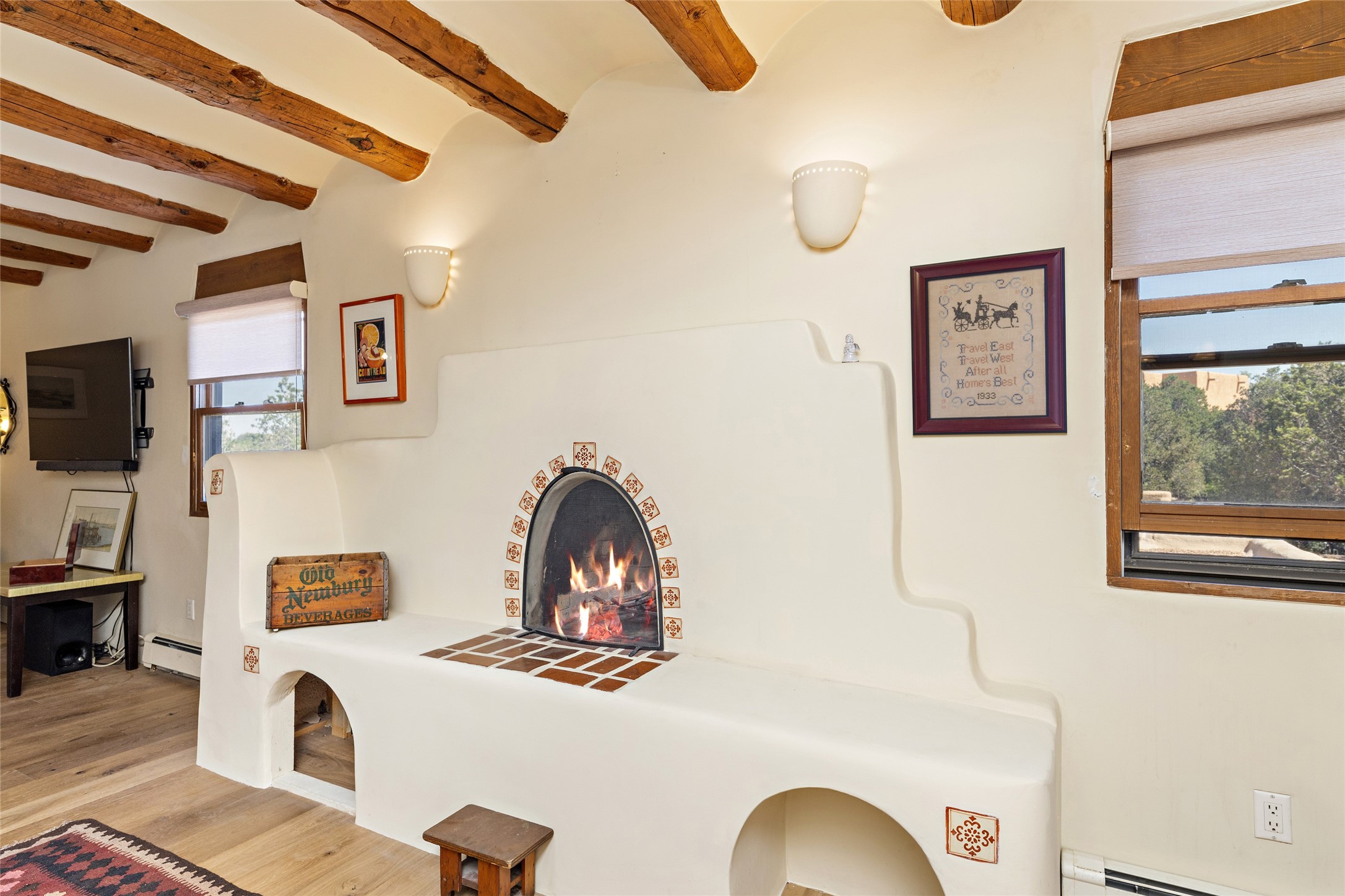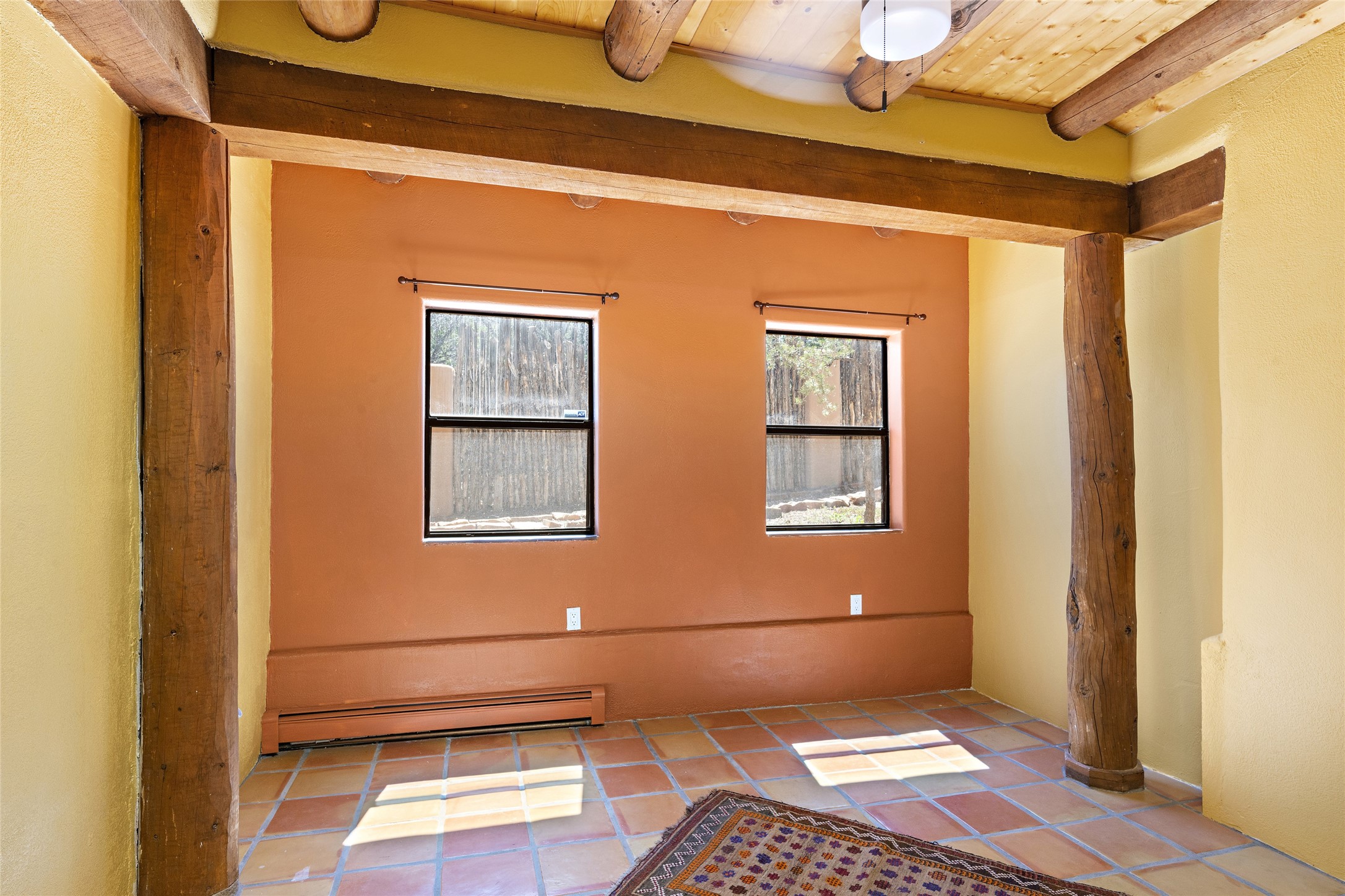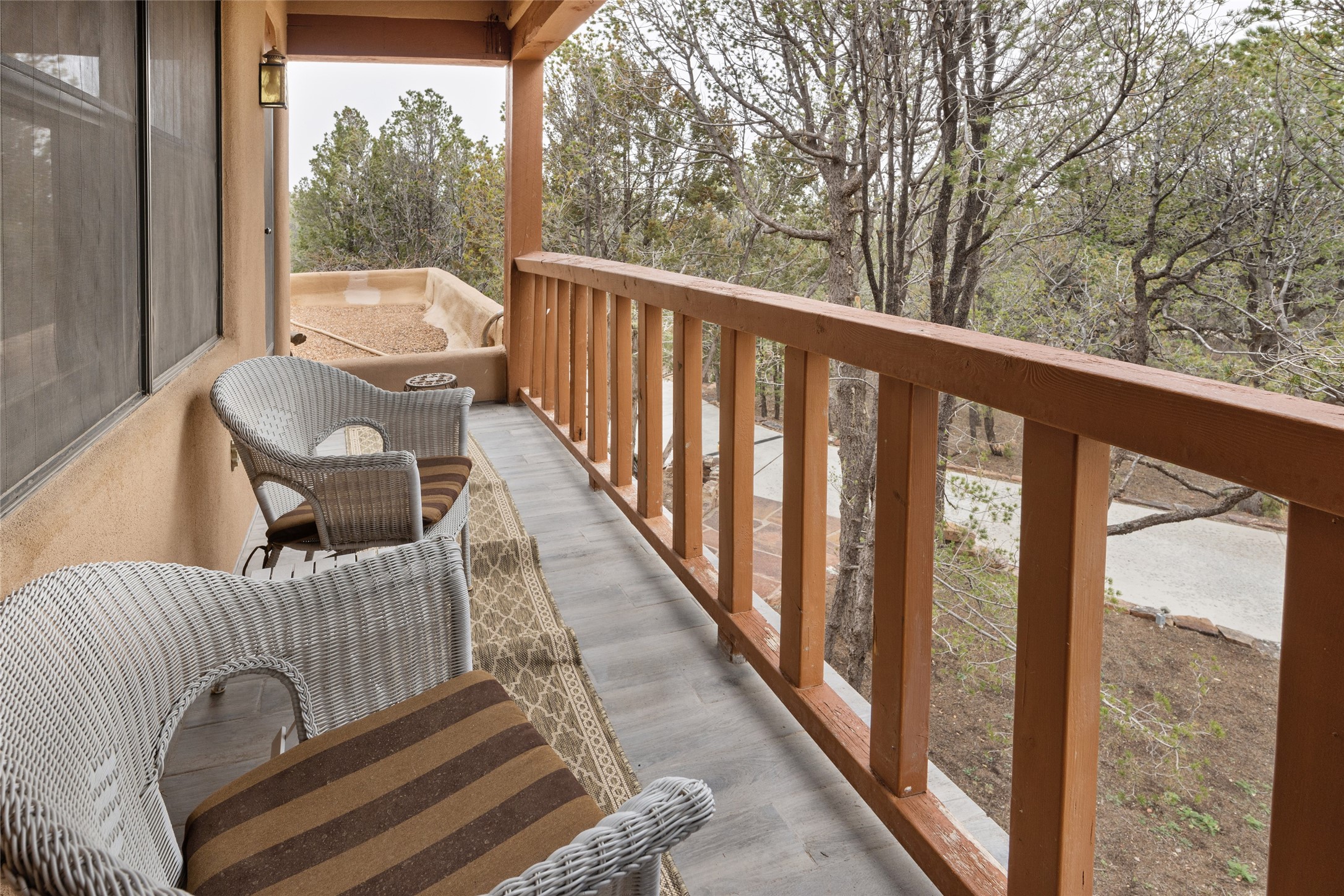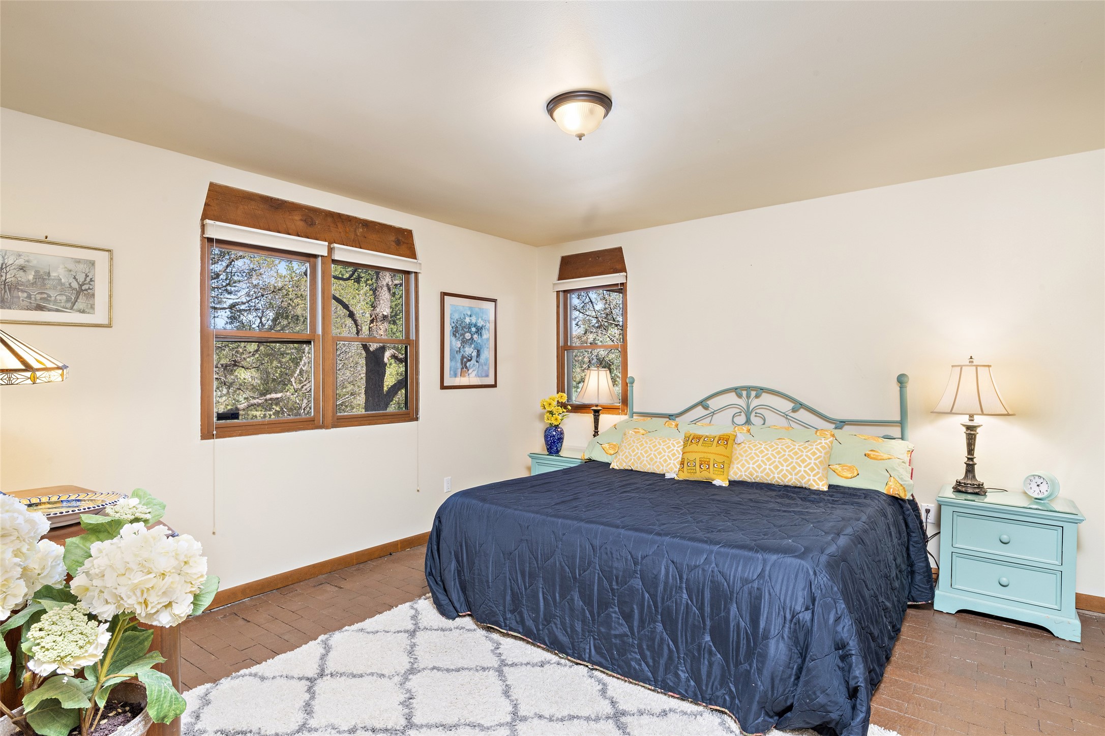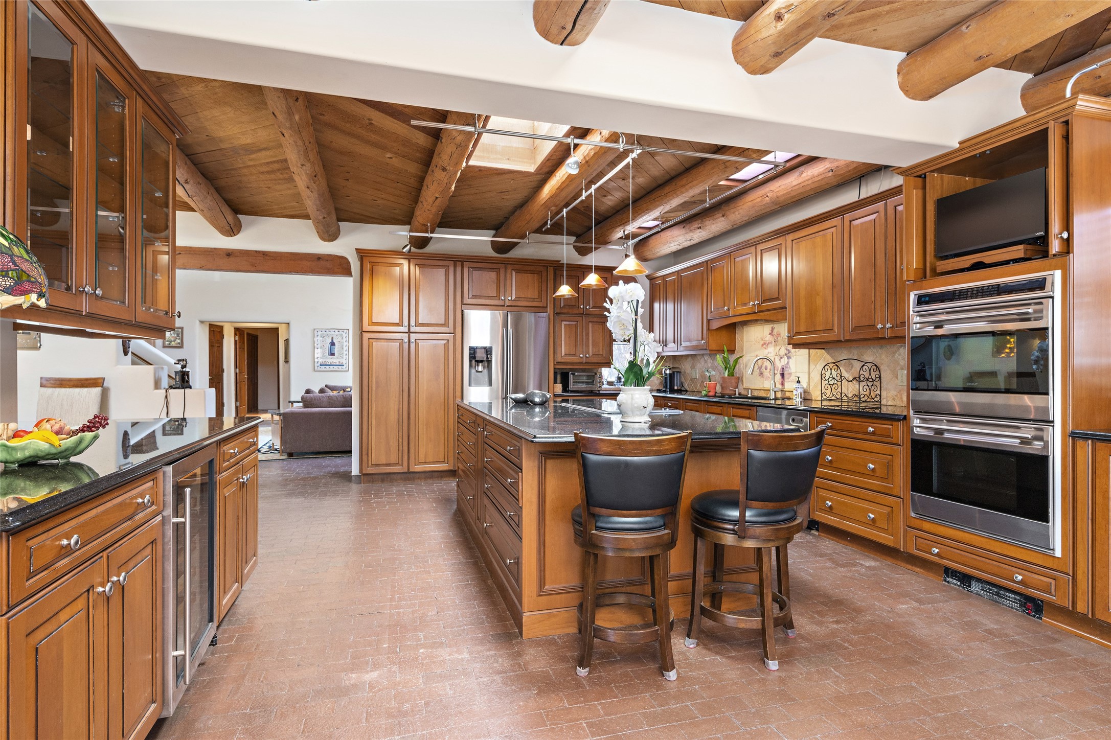 Just off the Old Santa Fe Trail, with the iconic Sun Mountain as the backdrop, this home is conveniently located close to Museum Hill and only 2.5 miles to the Plaza. There is ample space for flexibility in the residence with separate office, large den, storage rooms, and an oversized garage. The grand living room is graced by vaulted ceilings, spacious art walls, nichos and abundant natural light. The kitchen features granite countertops, Wolf cooktop and double-ovens, Subzero beverage cooler, and built-in buffet and china cabinet. The dining area has a kiva fireplace that is perfect for fireside meals. Set apart on the upper level is the gracious primary suite that features a balcony, coved viga ceiling, sitting area with fireplace, and a well-appointed closet with center island of drawers and a separate cedar-lined closet. On the main level is a guest bedroom with en suite bath. There is also a four-bedroom attached "live/work" space with two bathrooms and a large common area that provides privacy for guests or the flexibility for home offices. The outdoor entertainment spaces take full advantage of Santa Fe living: the expansive patio off the kitchen with a kiva fireplace, built-in grill, and a granite water feature by renowned sculptor Jesus Bautista Moroles, recipient of the 2008 Medal of Arts award. The garden beds are irrigated by an underground water catchment system. This is the perfect setting to entertain family and friends.
