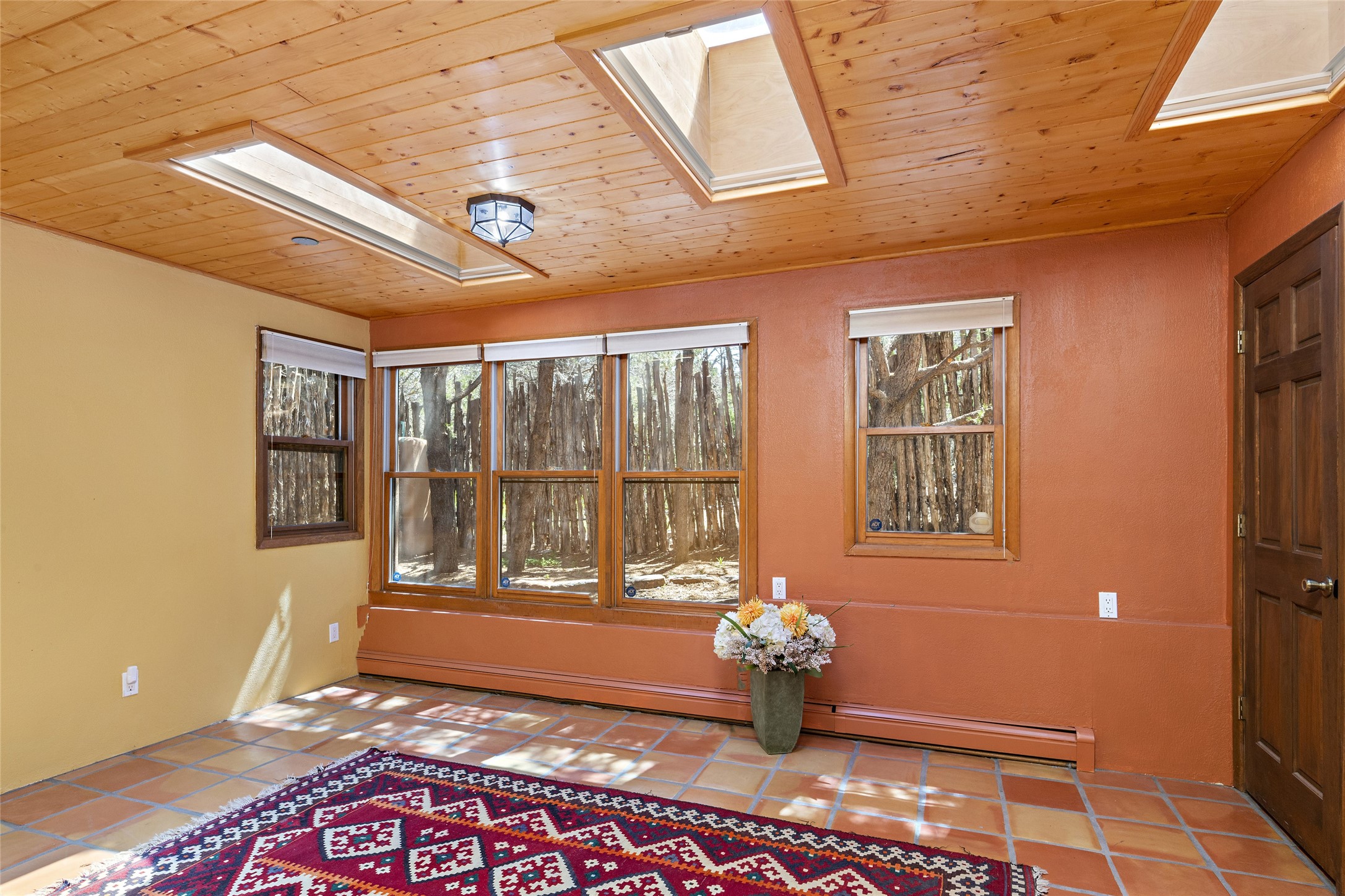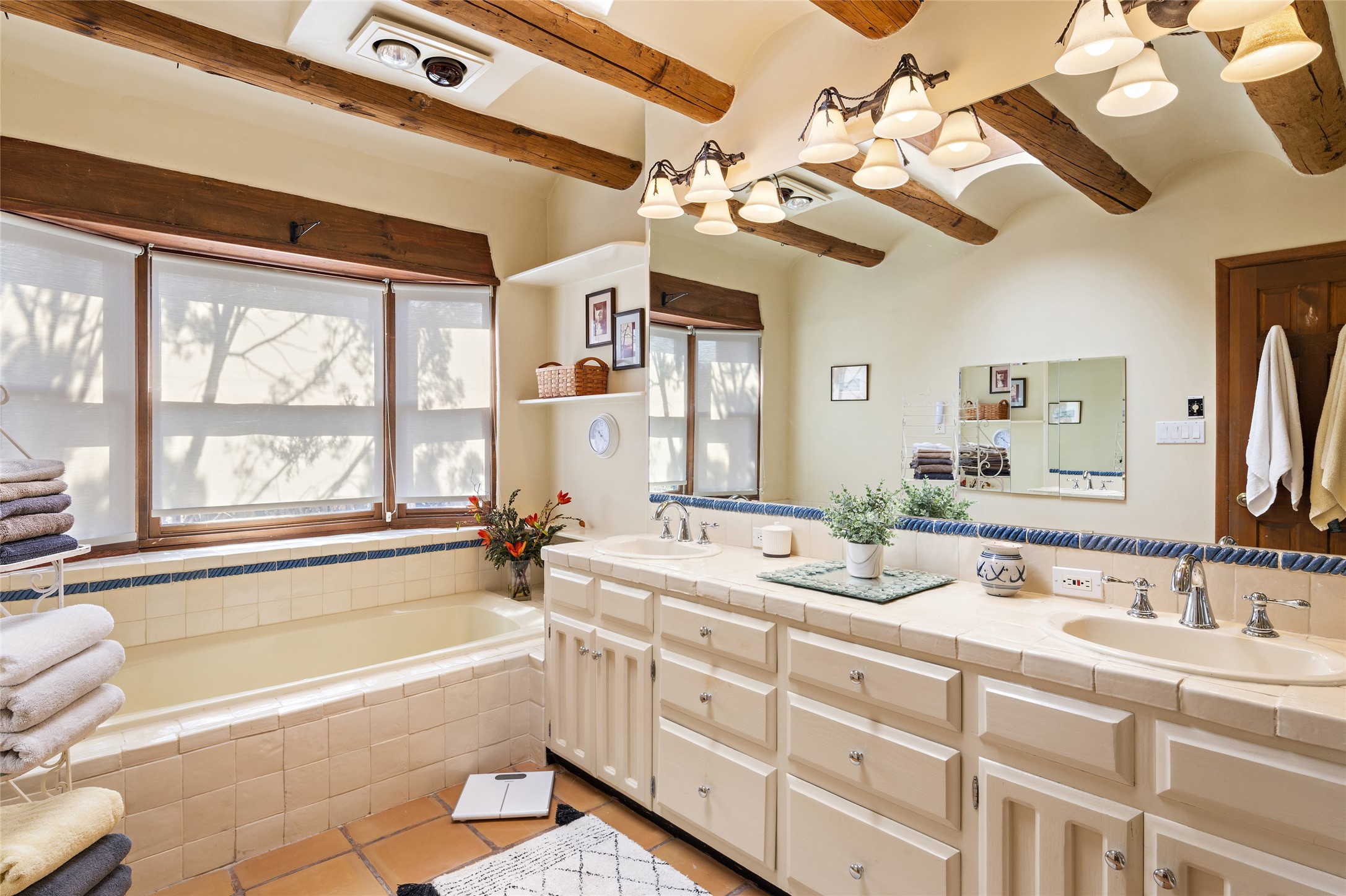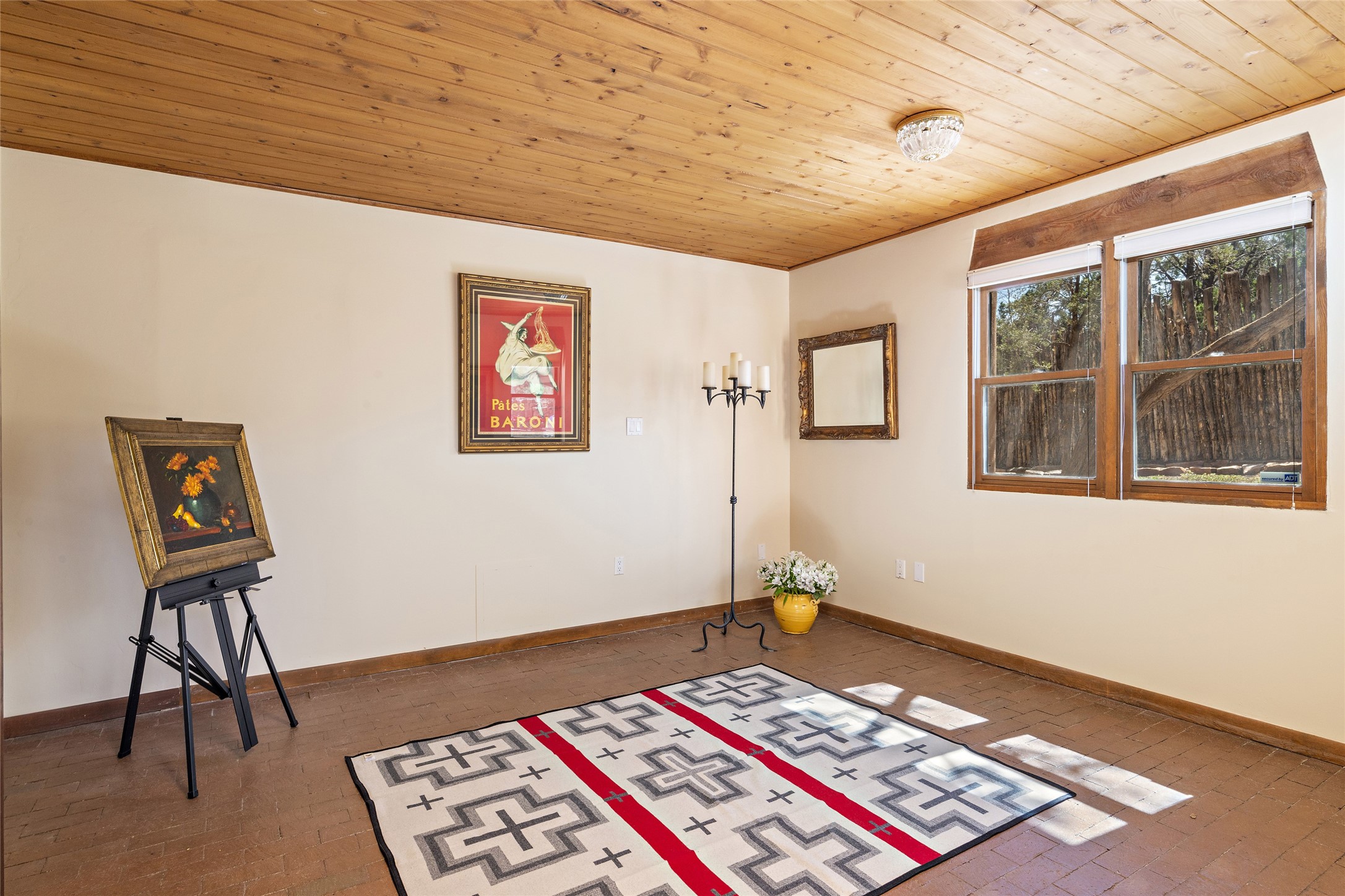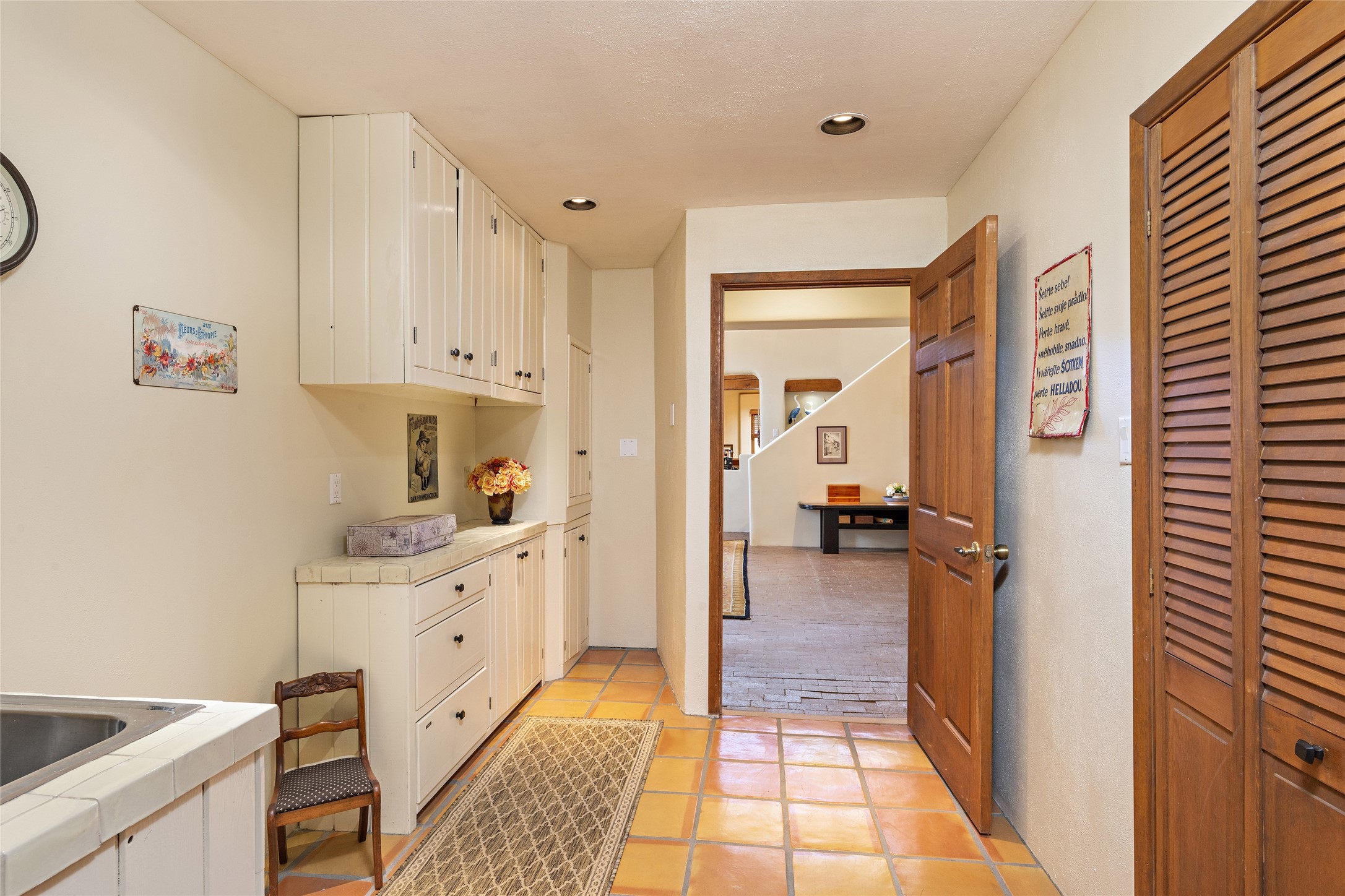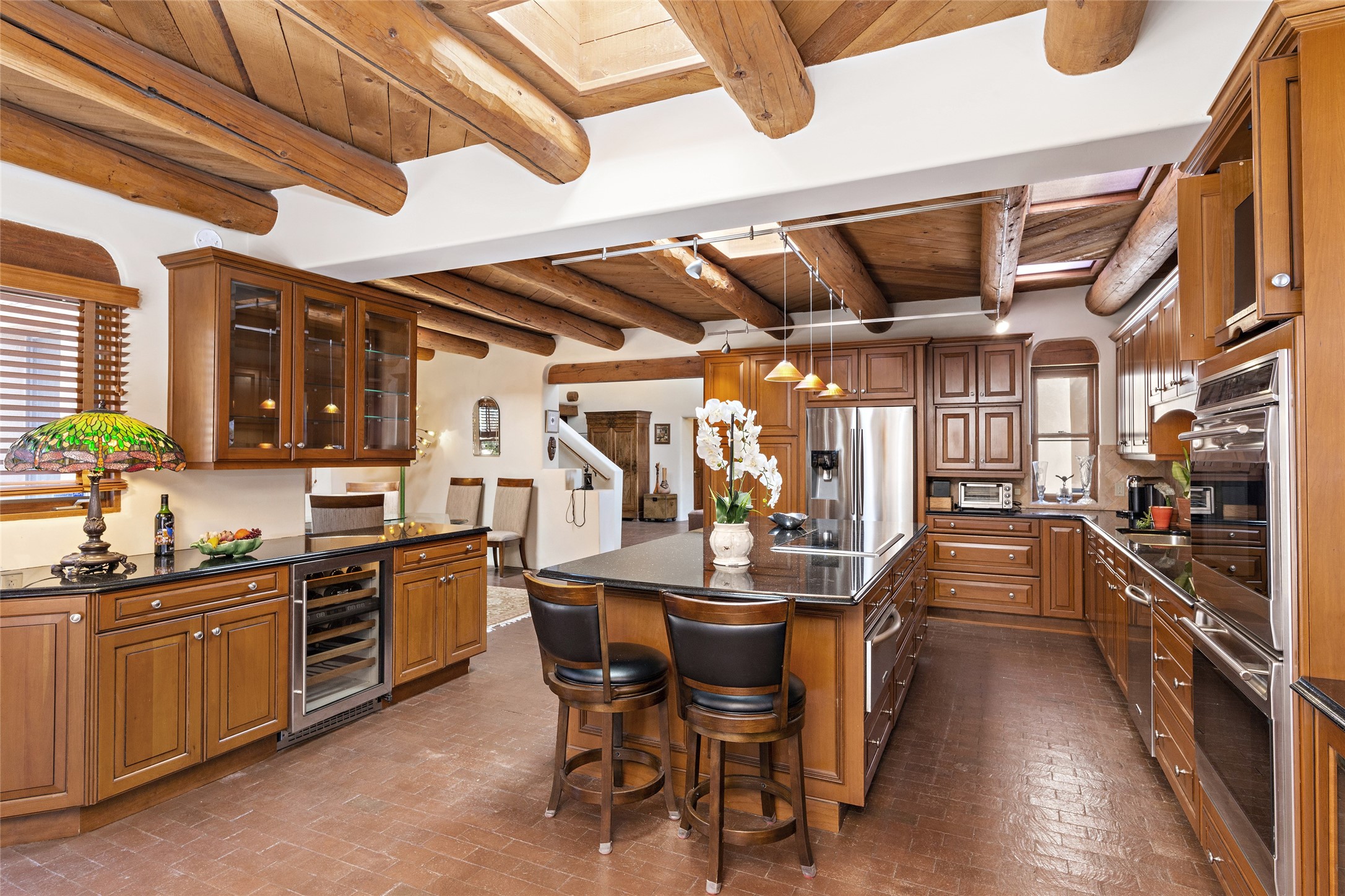 Just off the Old Santa Fe Trail, with the iconic Sun Mountain as the backdrop, this home is conveniently located close to Museum Hill and only 2.5 miles to the Plaza. There is ample space for flexibility in the residence with separate office, large den, storage rooms, and an oversized garage. The grand living room is graced by vaulted ceilings, spacious art walls, nichos and abundant natural light. The kitchen features granite countertops, Wolf cooktop and double-ovens, Subzero beverage cooler, and built-in buffet and china cabinet. The dining area has a kiva fireplace that is perfect for fireside meals. Set apart on the upper level is the gracious primary suite that features a balcony, coved viga ceiling, sitting area with fireplace, and a well-appointed closet with center island of drawers and a separate cedar-lined closet. On the main level is a guest bedroom with en suite bath. There is also a four-bedroom attached "live/work" space with two bathrooms and a large common area that provides privacy for guests or the flexibility for home offices. The outdoor entertainment spaces take full advantage of Santa Fe living: the expansive patio off the kitchen with a kiva fireplace, built-in grill, and a granite water feature by renowned sculptor Jesus Bautista Moroles, recipient of the 2008 Medal of Arts award. The garden beds are irrigated by an underground water catchment system. This is the perfect setting to entertain family and friends.